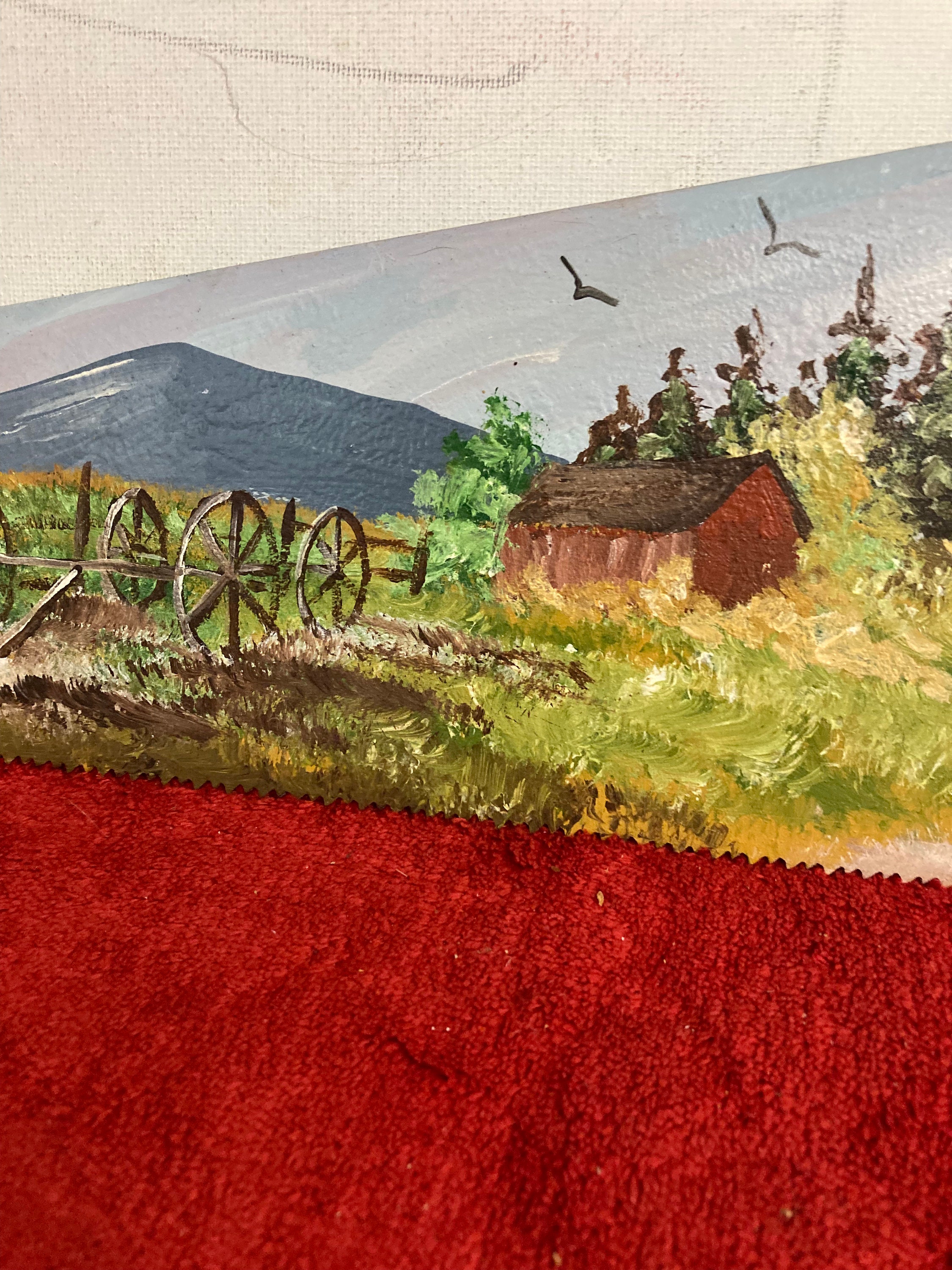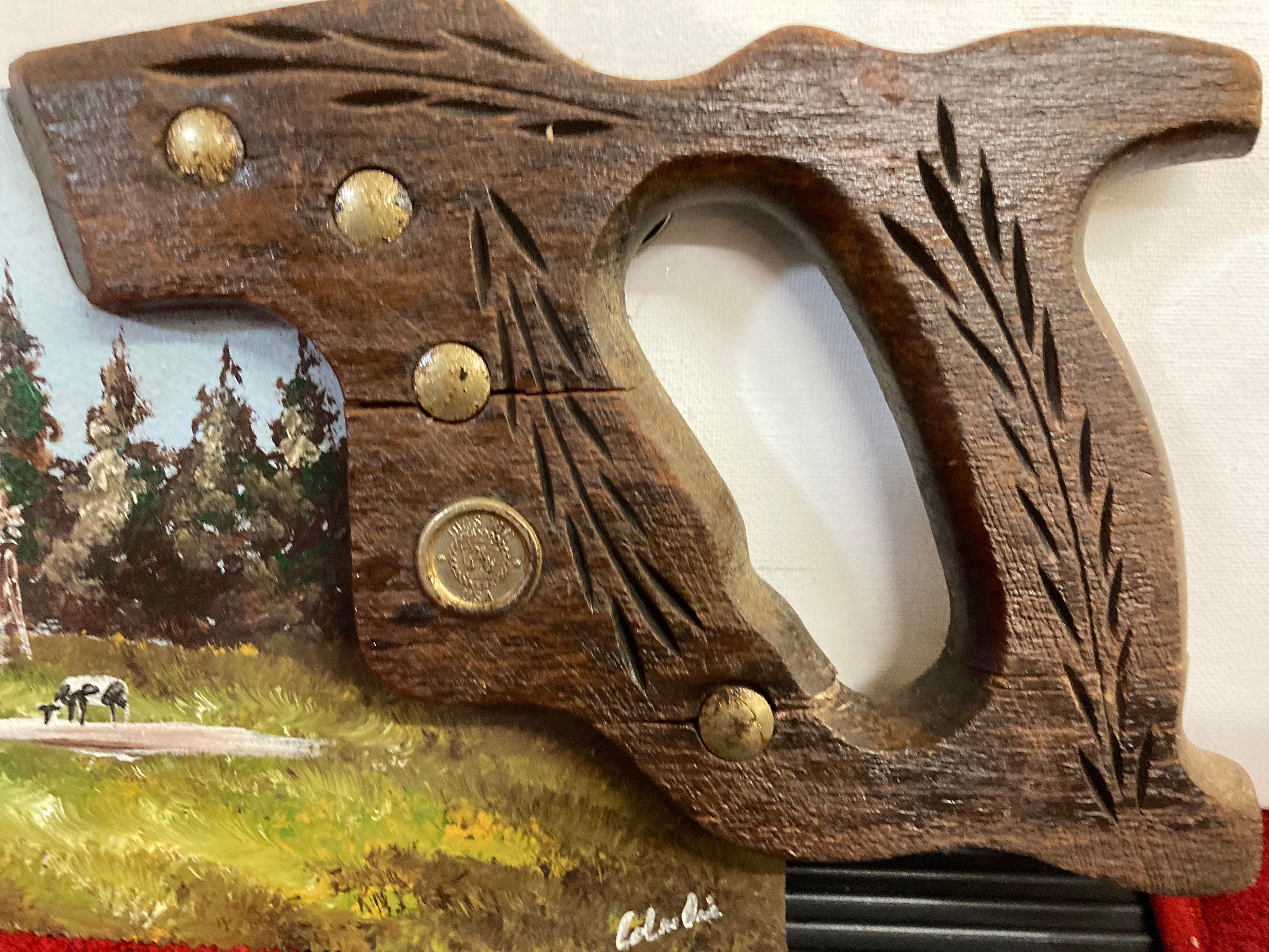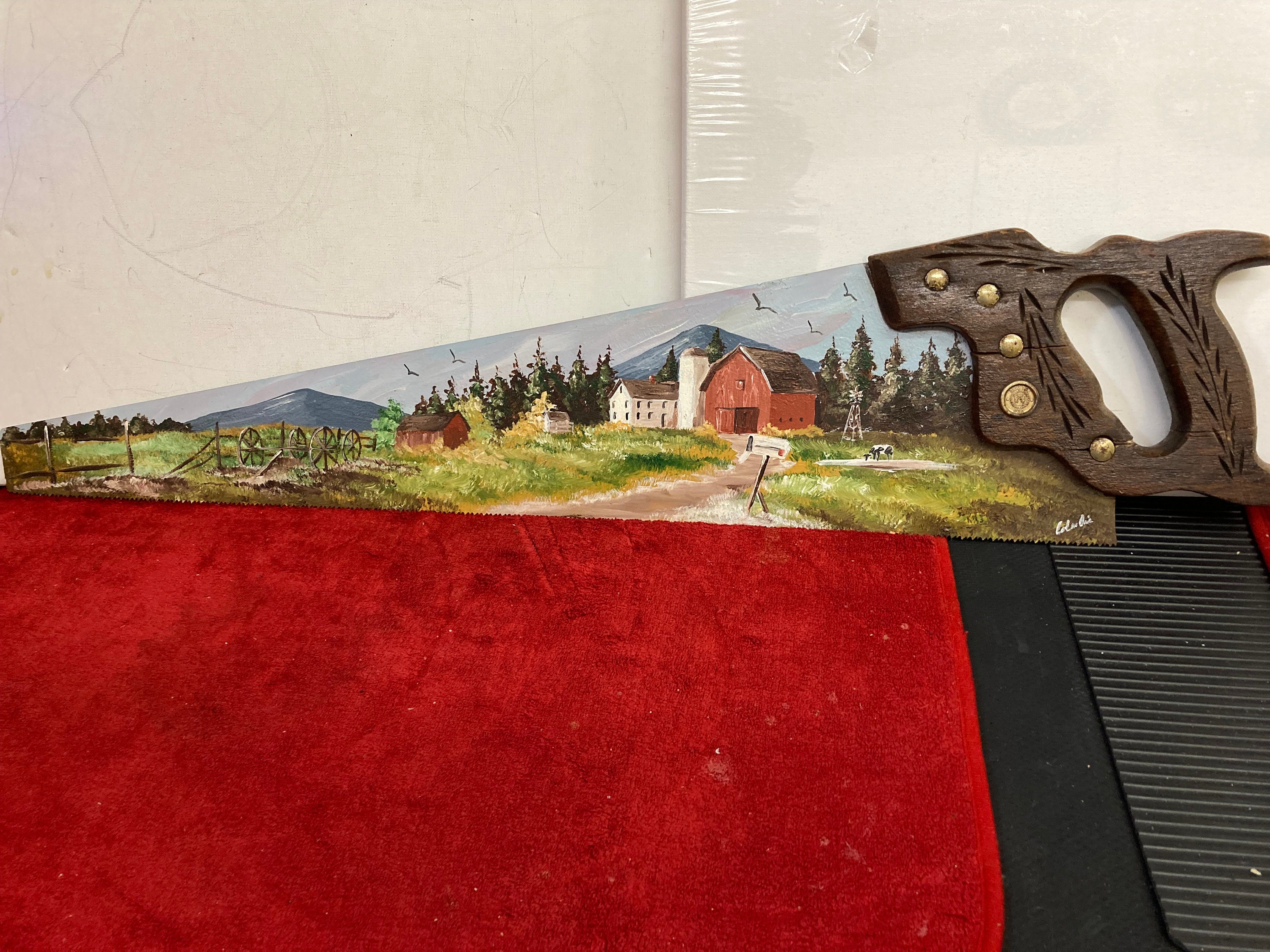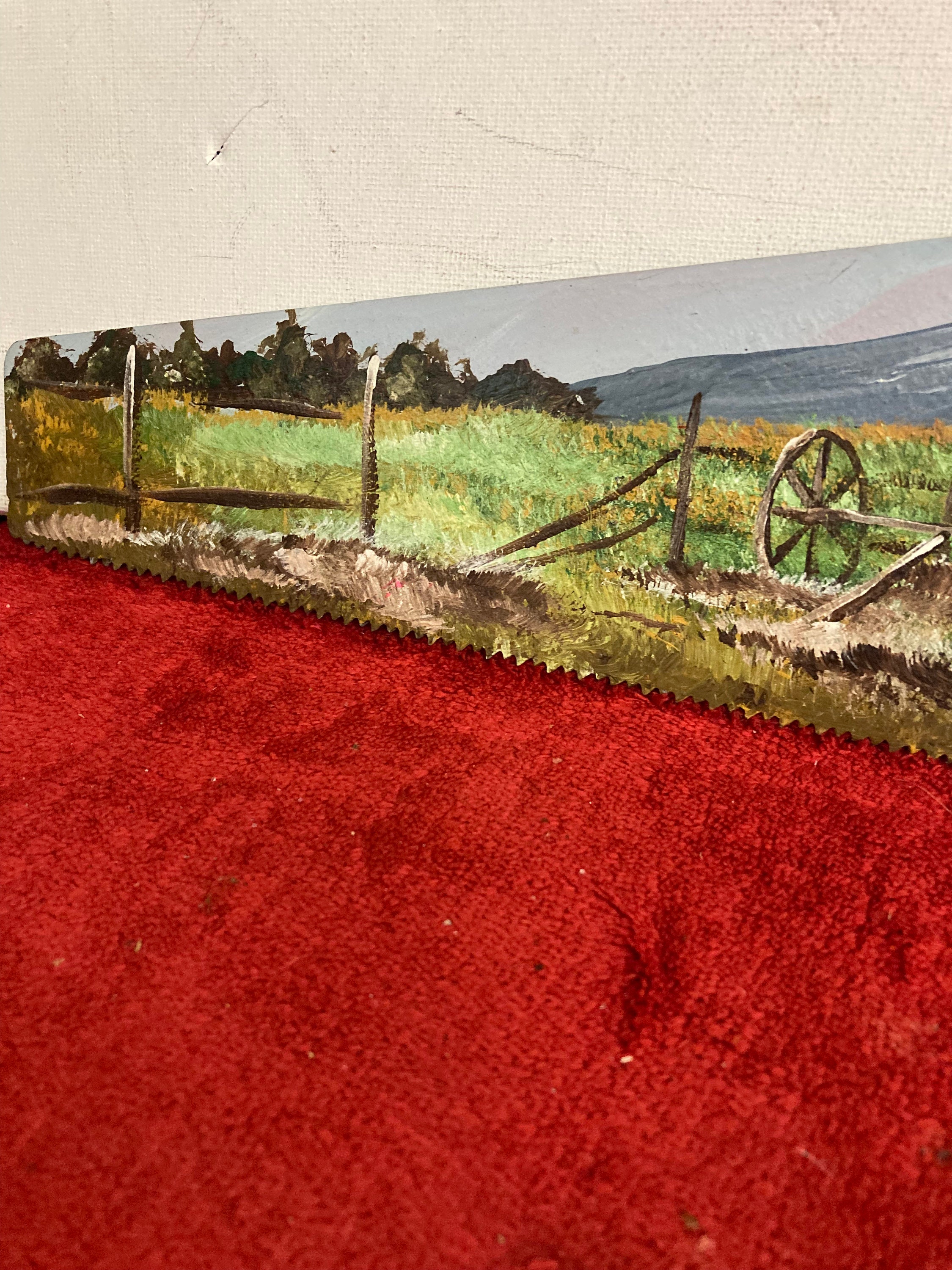 Vintage 29" Hand Saw With Oil Painted Scene-Signed29 " long x 7 " wide x 1 " deepSigned by ArtistFarmland in TexasBeautifully drawnExcellent ConditionNo damages