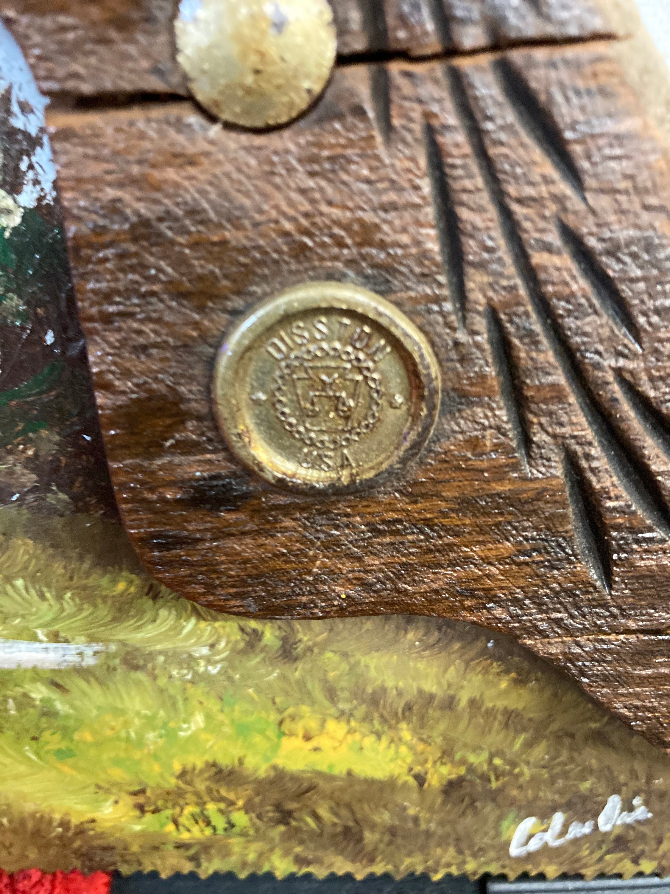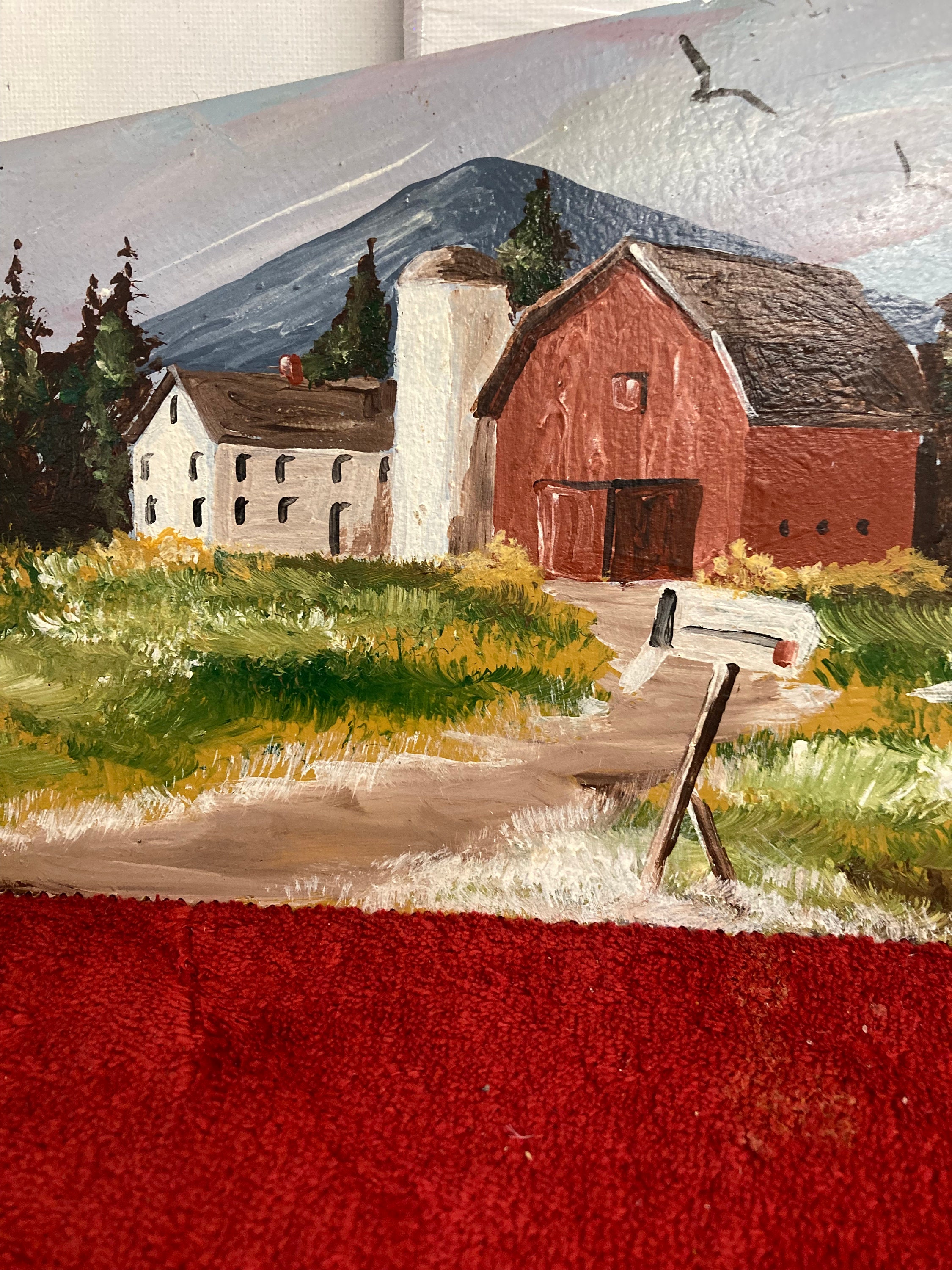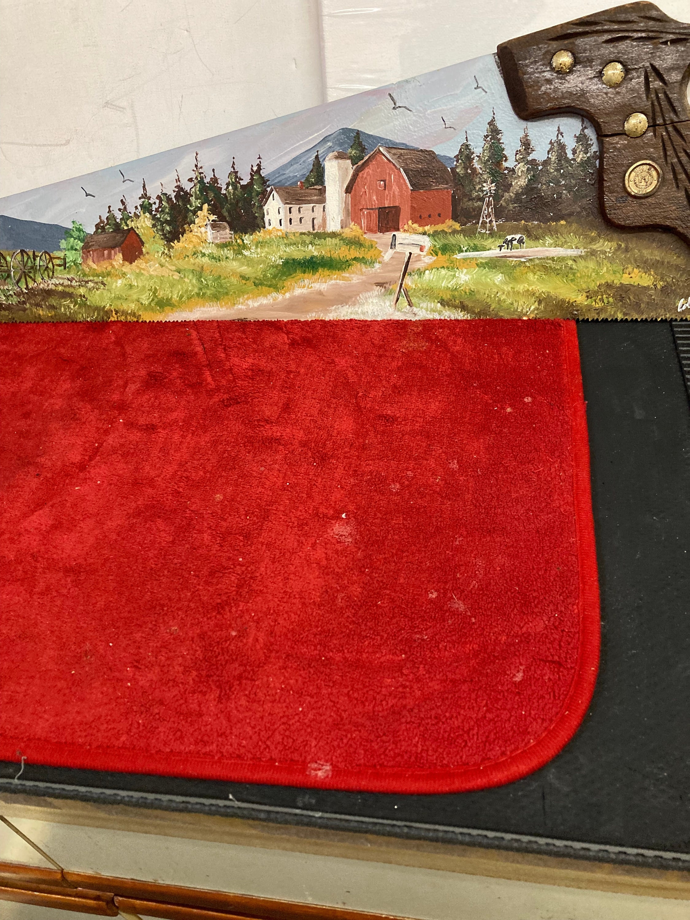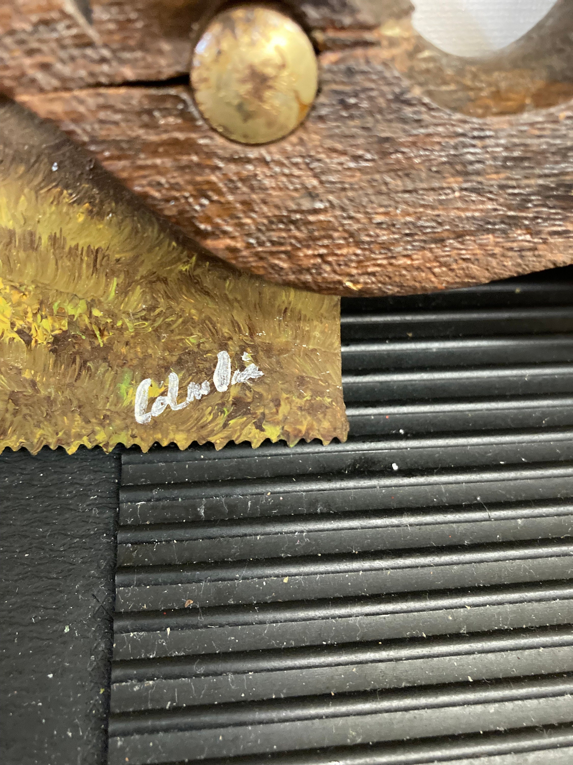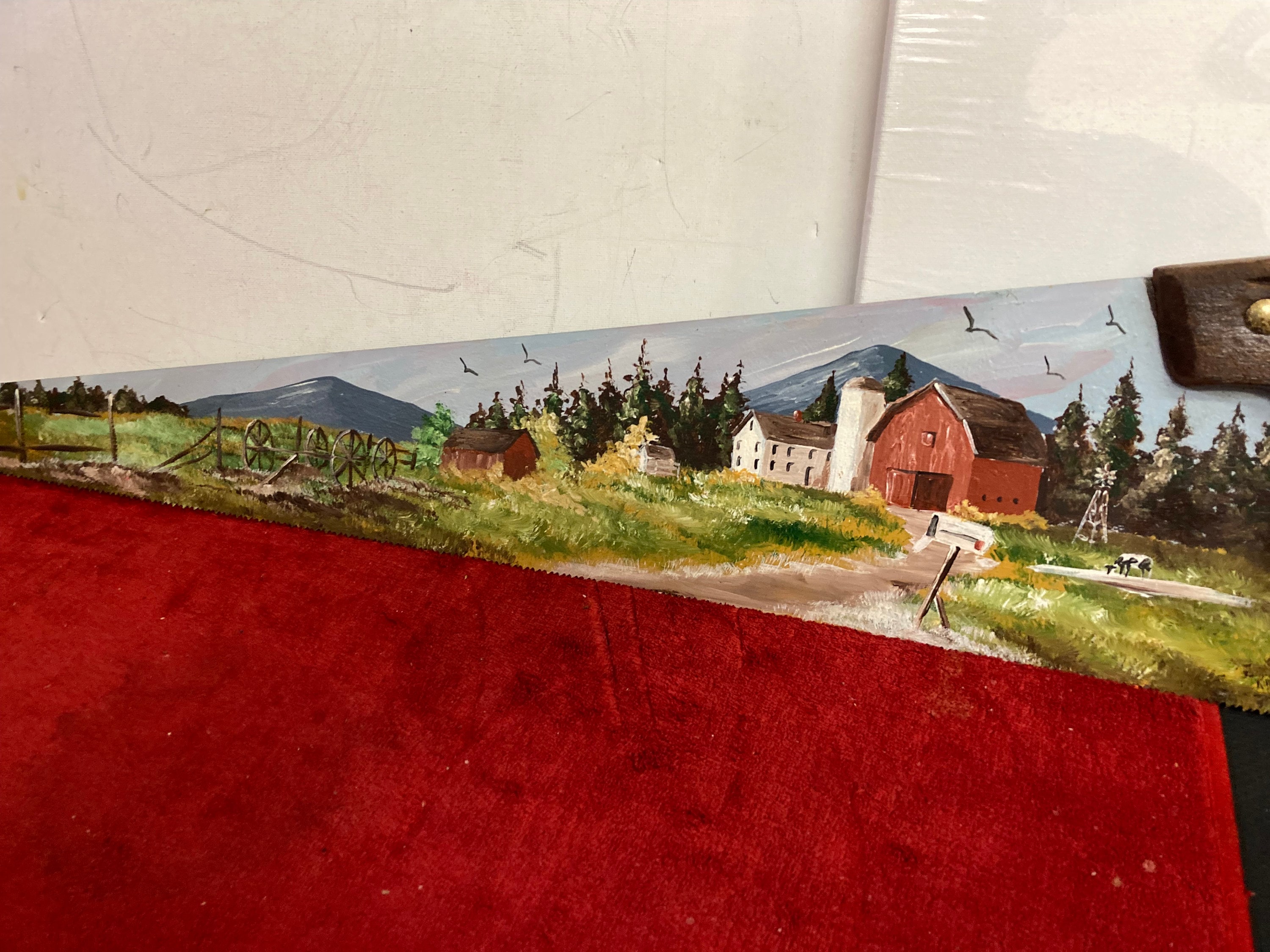 Vintage 29" Hand Saw With Oil Painted Scene-Signed29 " long x 7 " wide x 1 " deepSigned by ArtistFarmland in TexasBeautifully drawnExcellent ConditionNo damages
