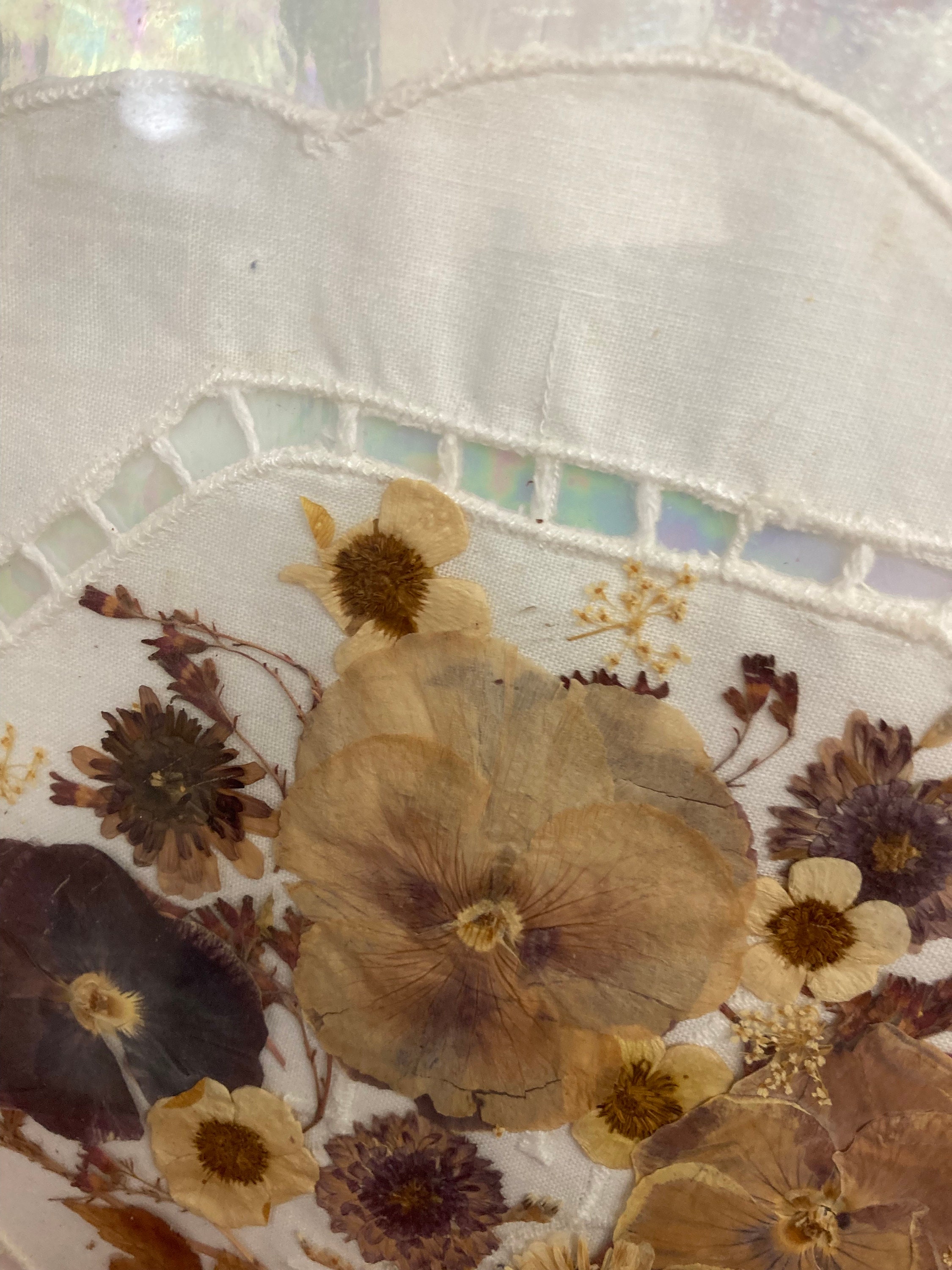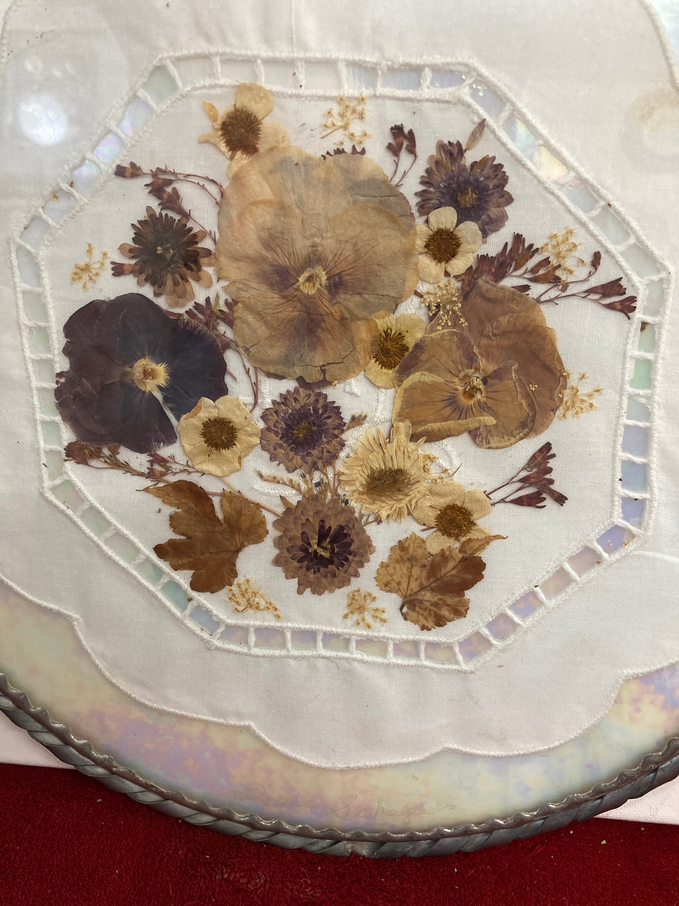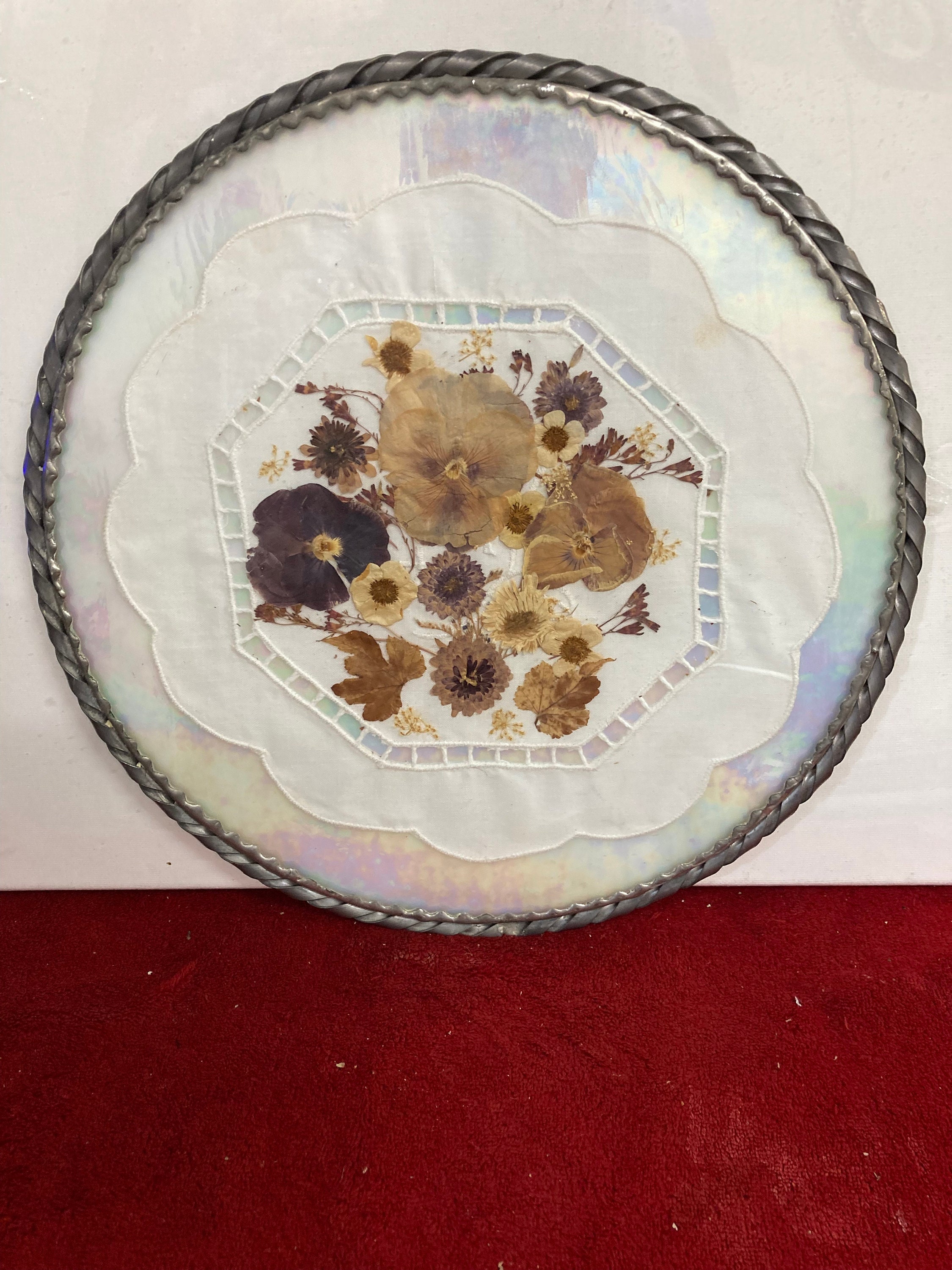 Dried and then pressed floral arrangement put between two round glass plates and framed in silver hardware.