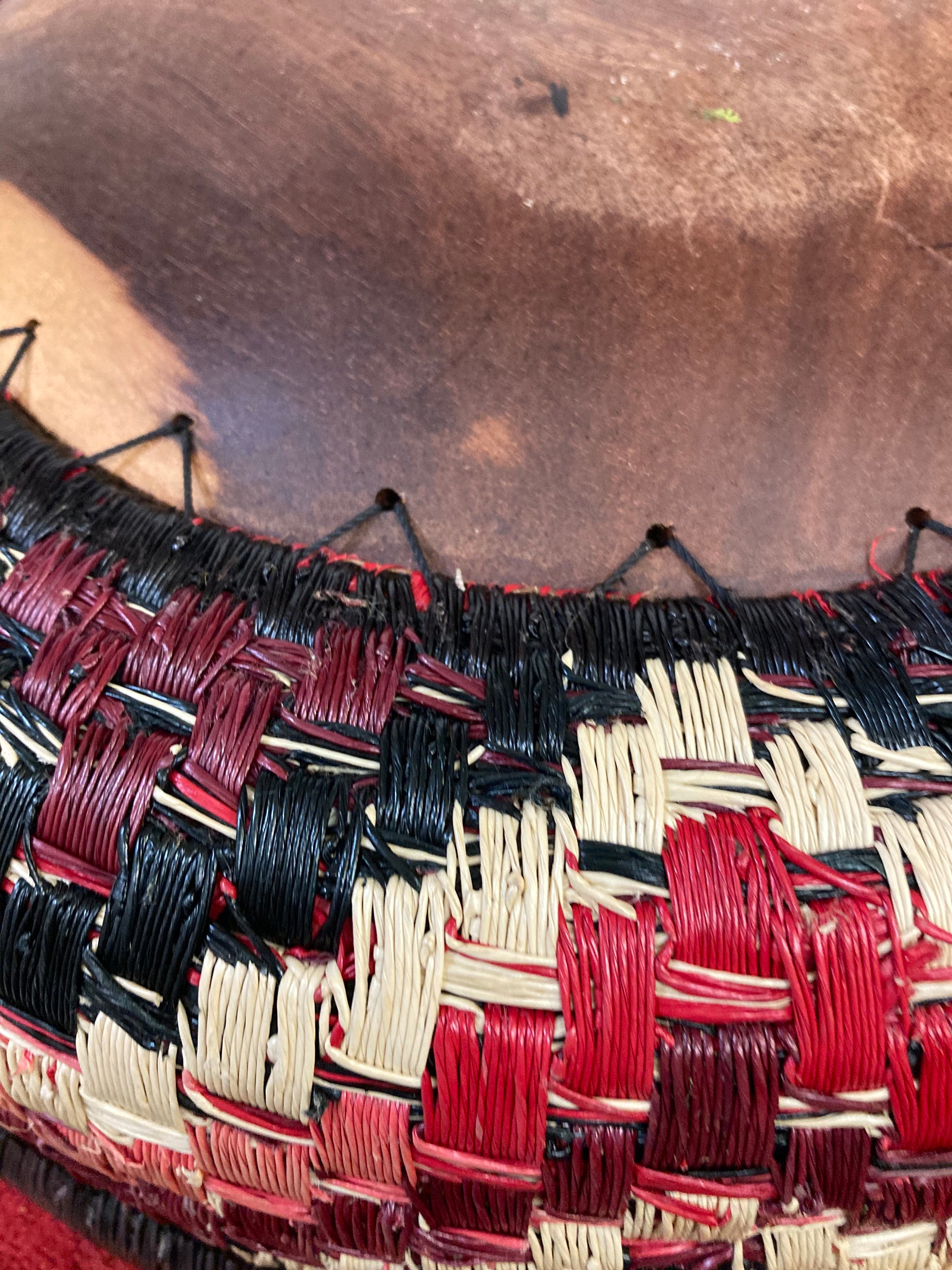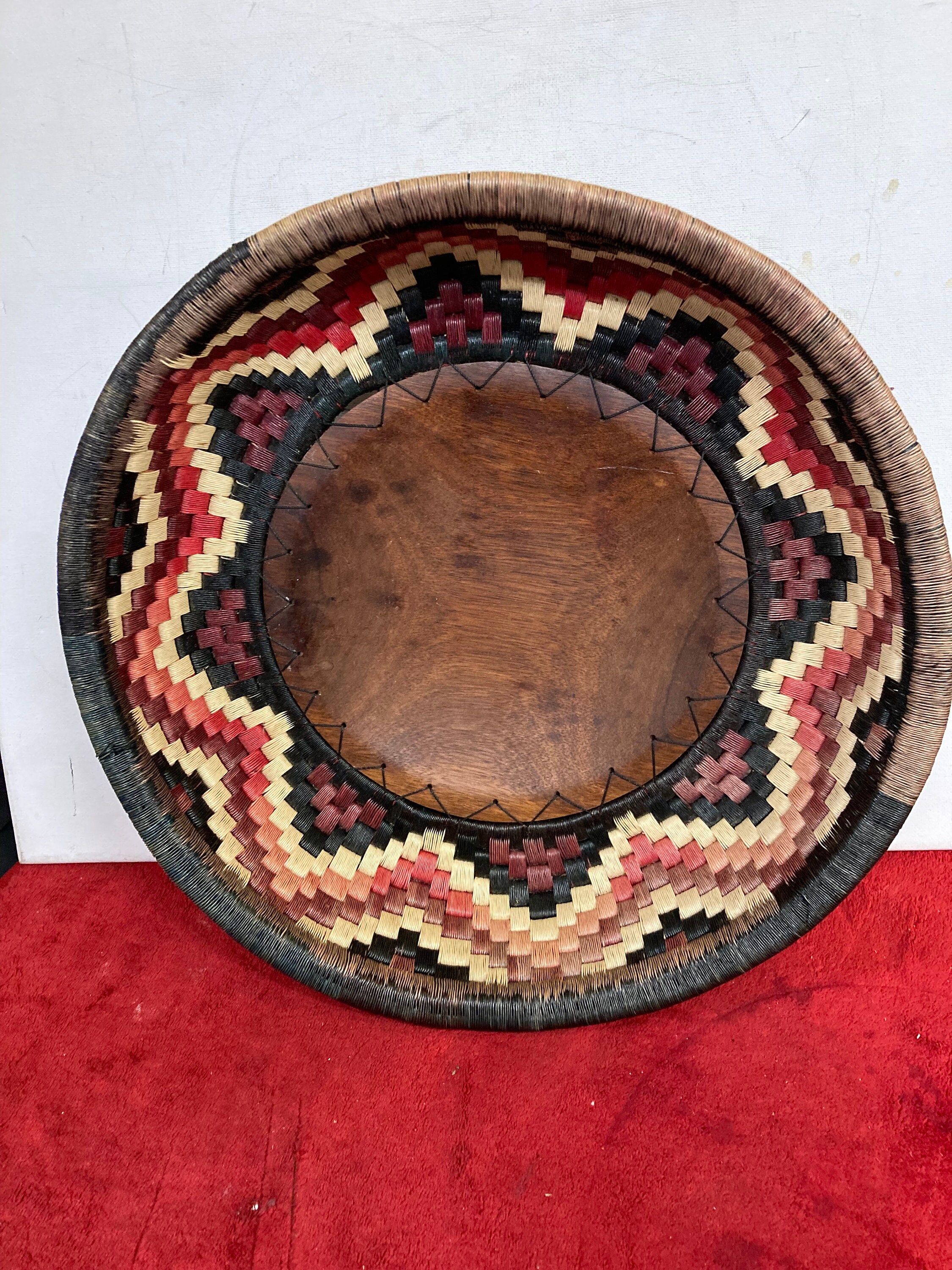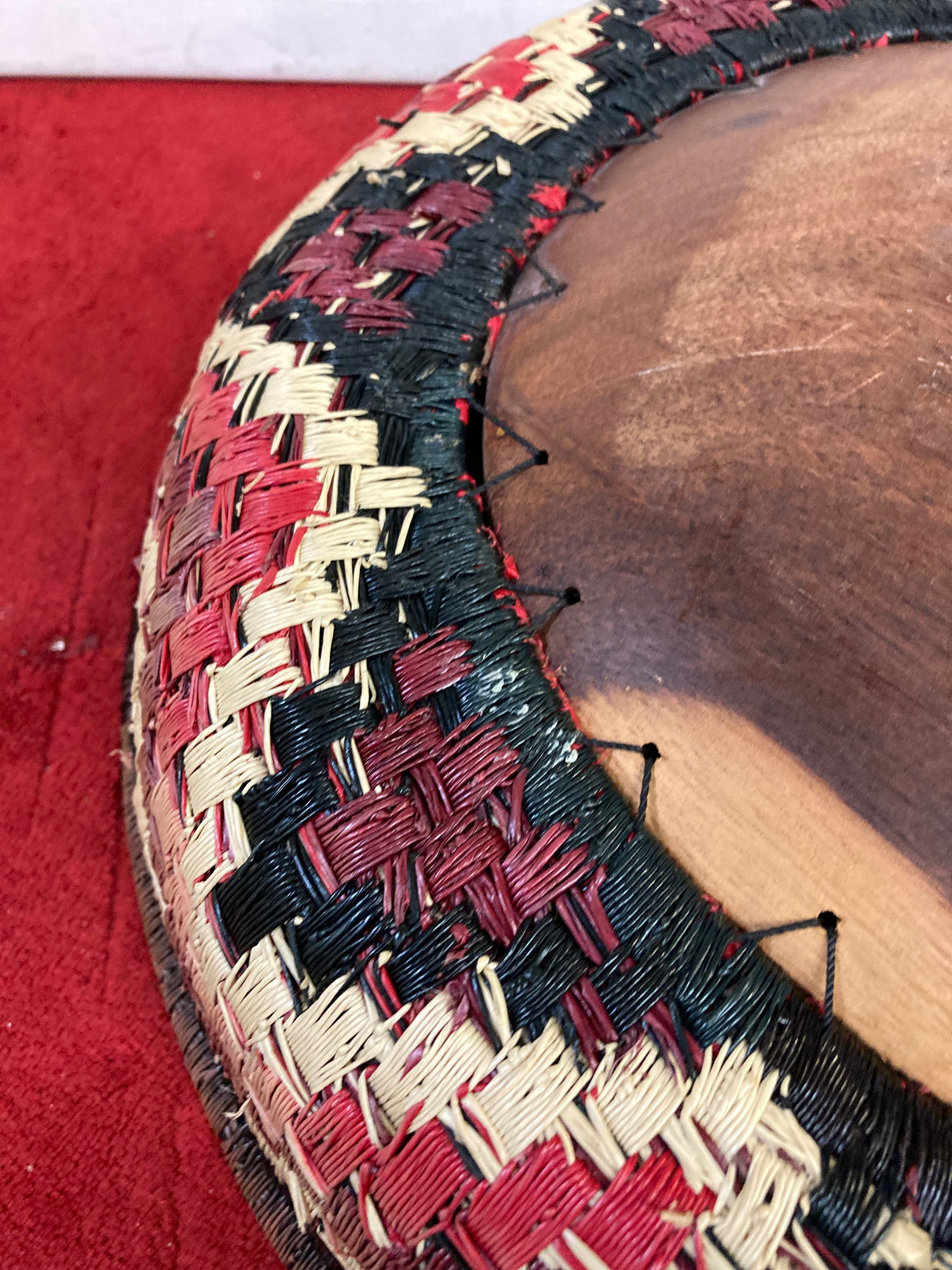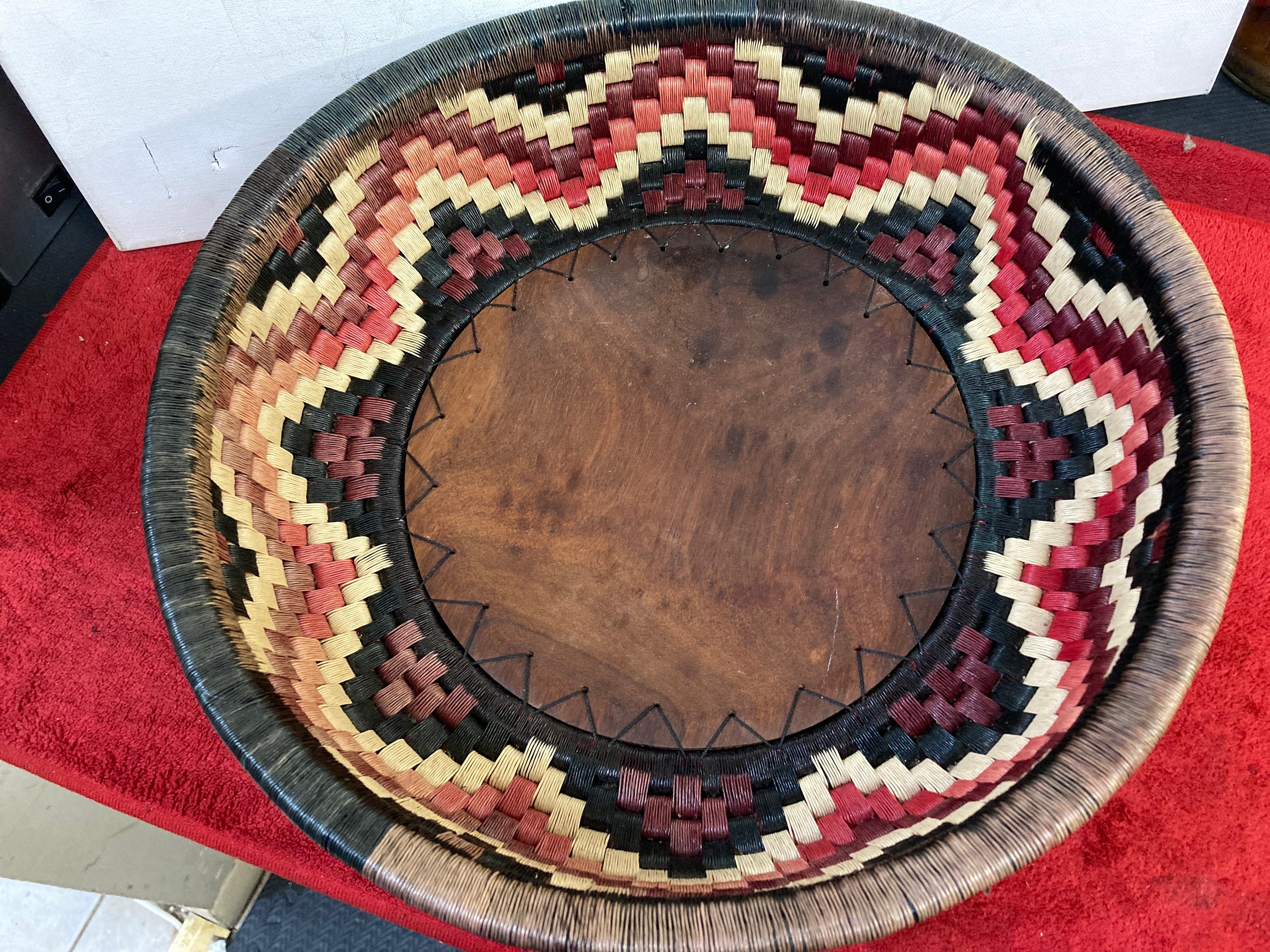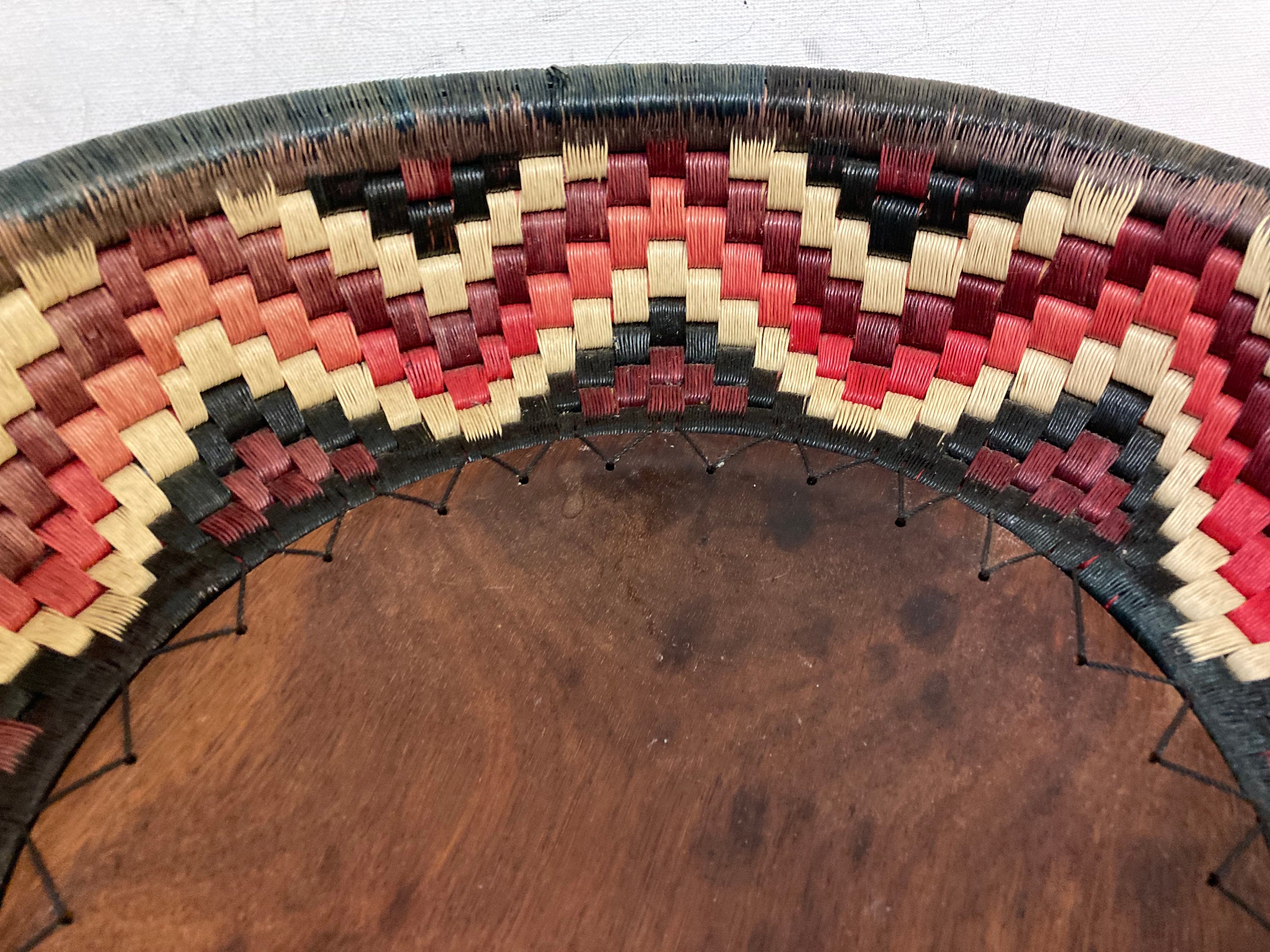 Ethnic, design carved into the wood base, thatched to a grass woven rim , in a palette of multi colors.