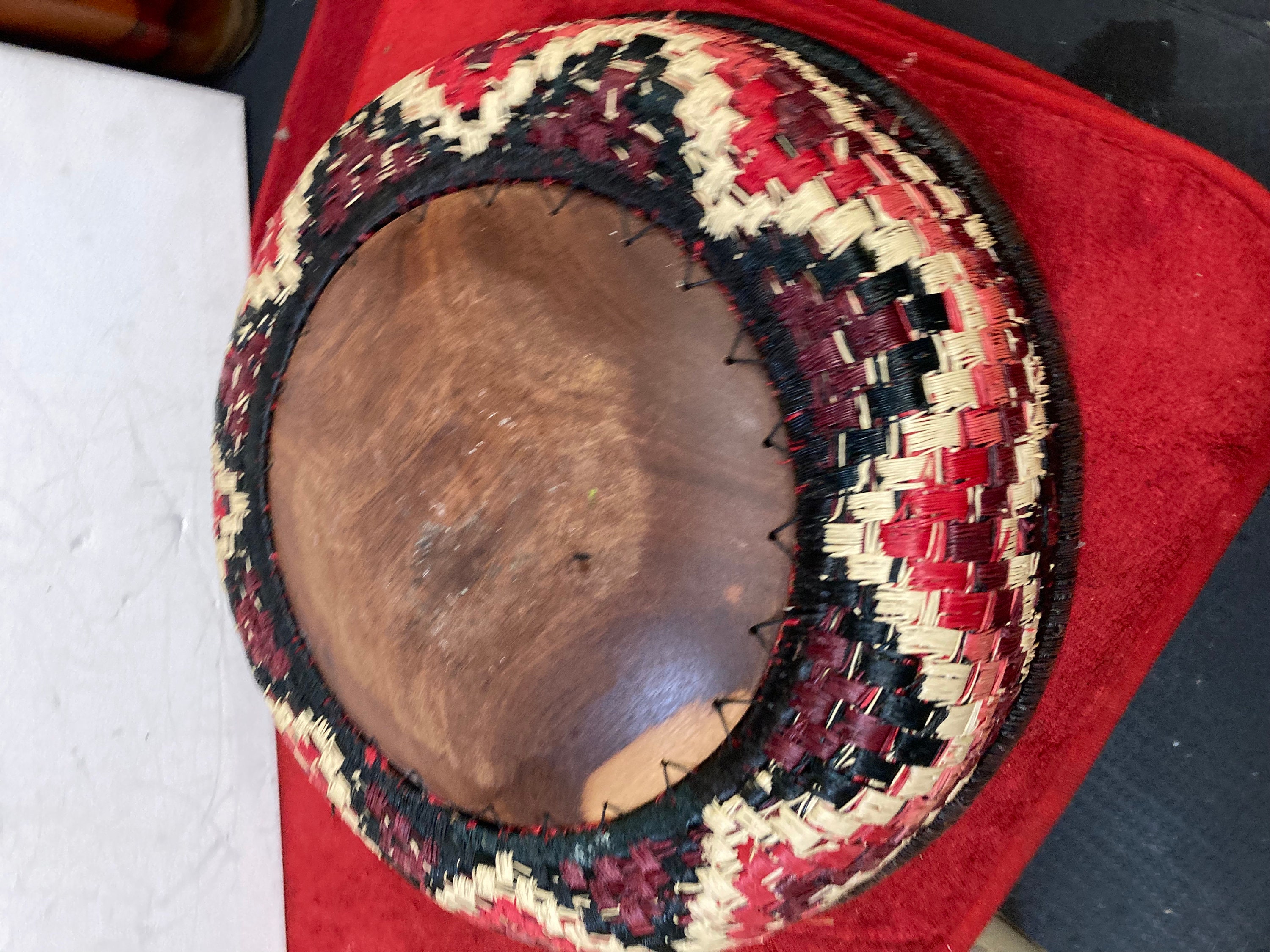 ETHNIC Carved Wood Bottom Grass Basket Bowl 13" Dia Indian Decor