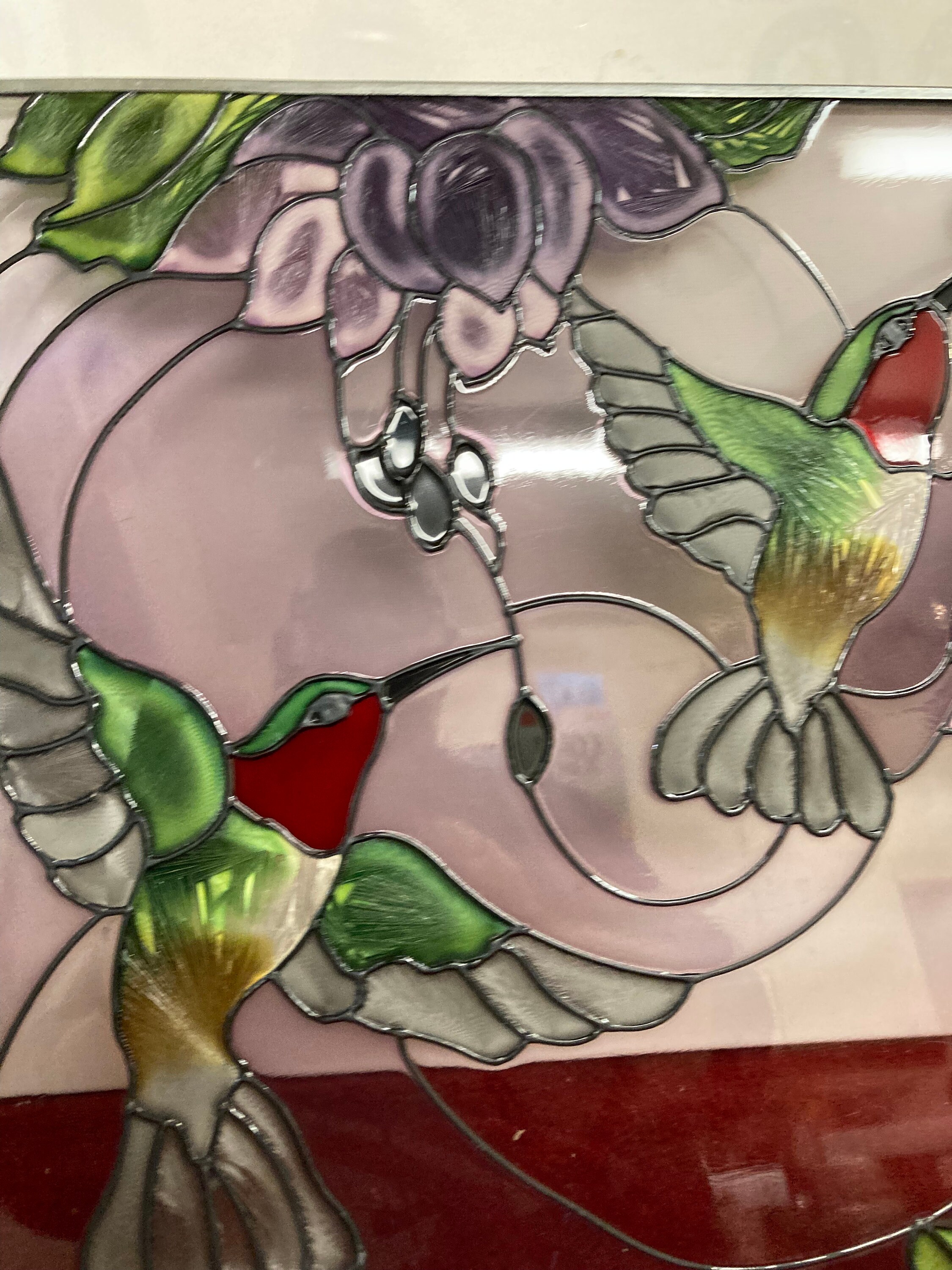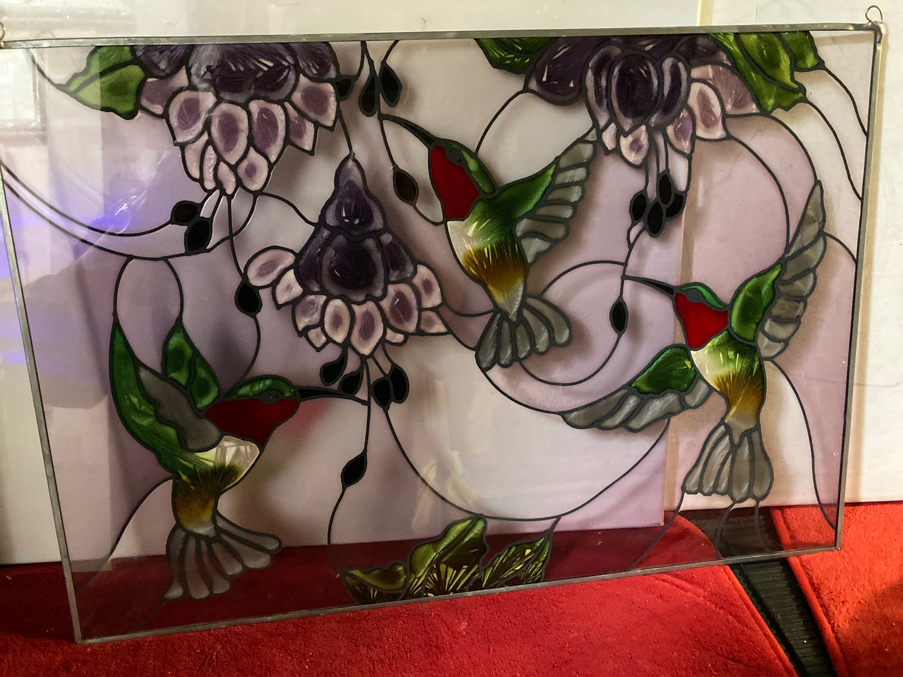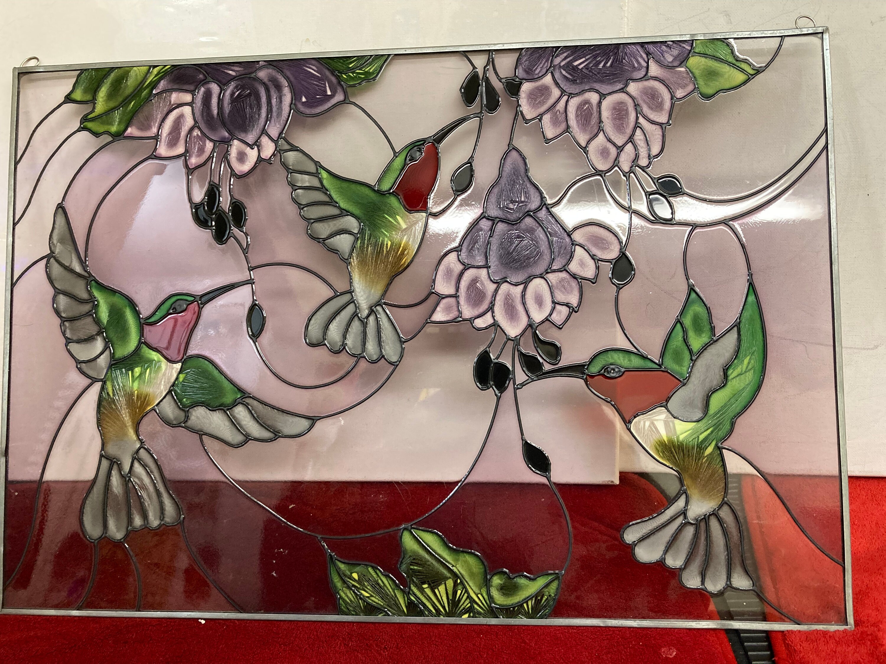 Hummingbirds and Fuchsia Stained Glass Style Art,Hand Painted Plastic Form20 1/2" wide x 14 " tall x 1/8" deepExcellent condition with no damagesHand painted,Material Metal and Plastic Panel
