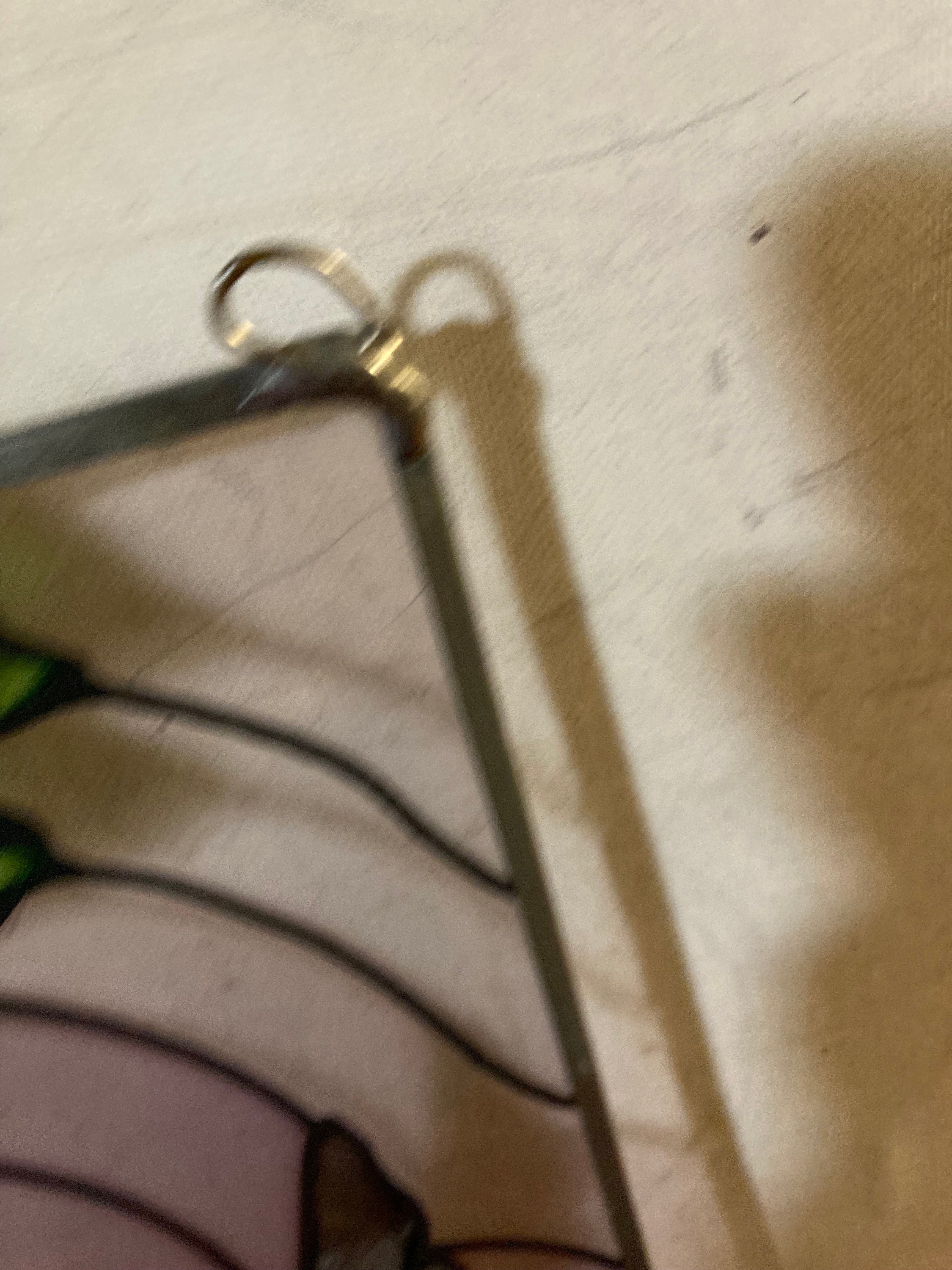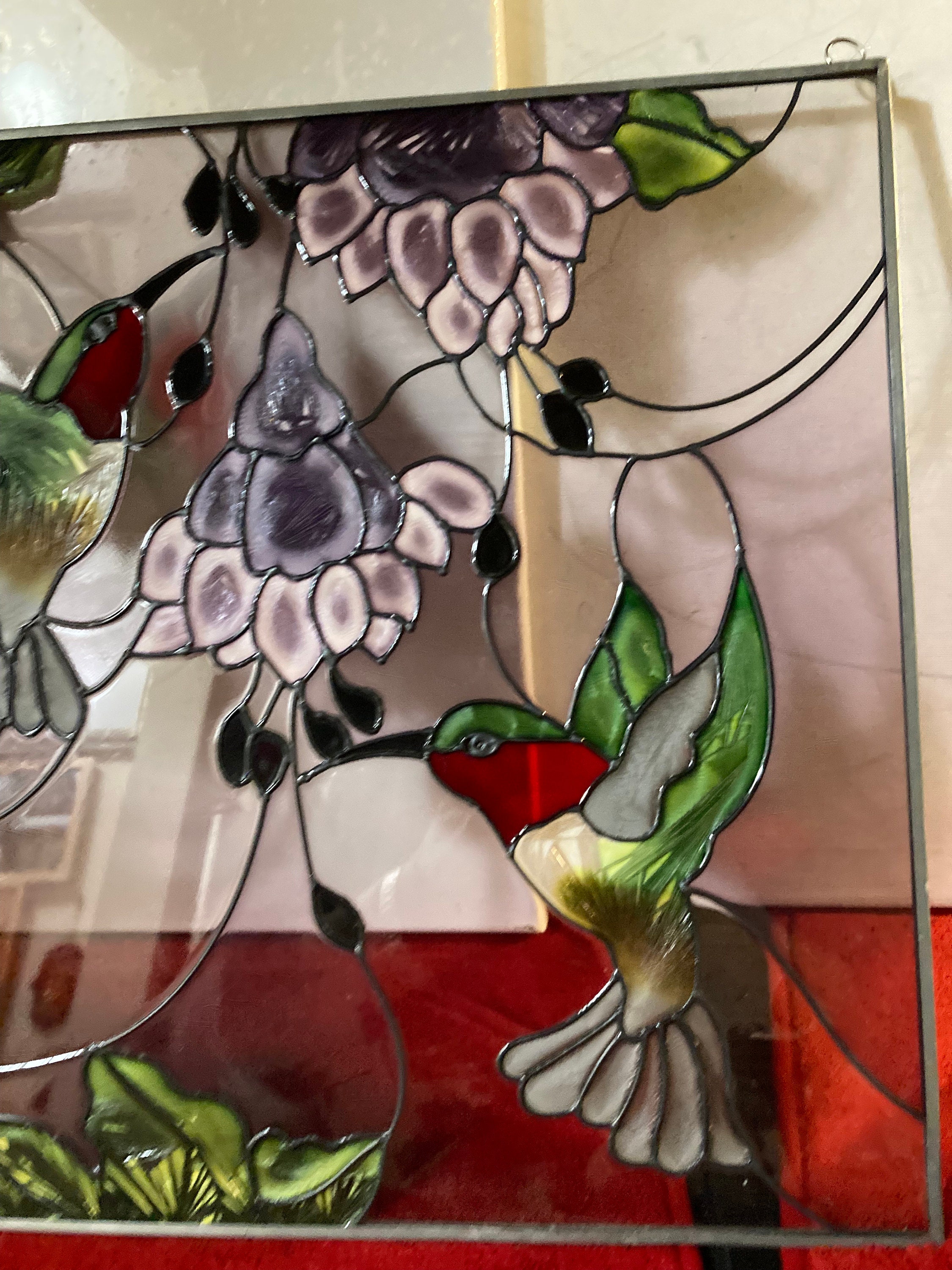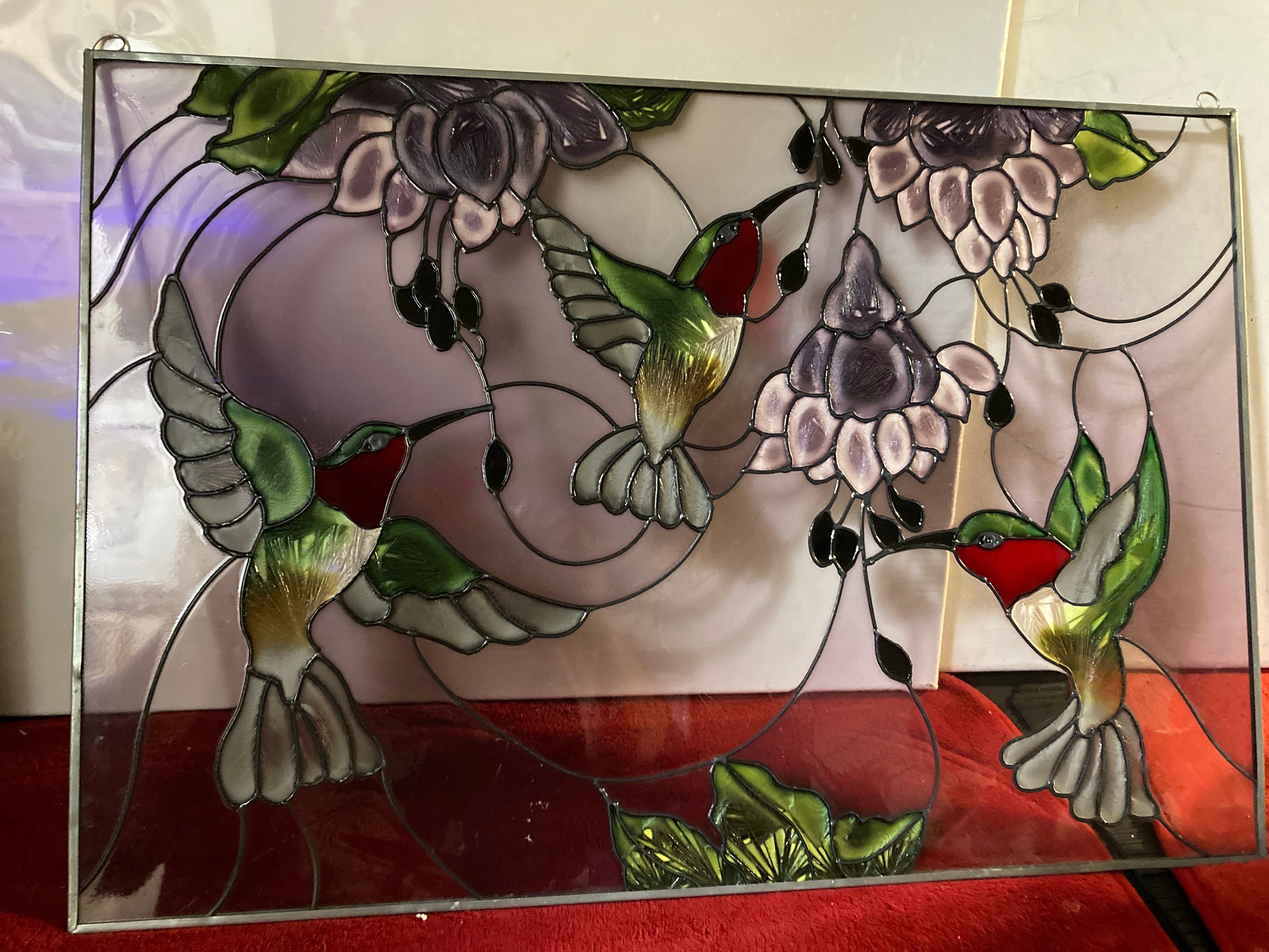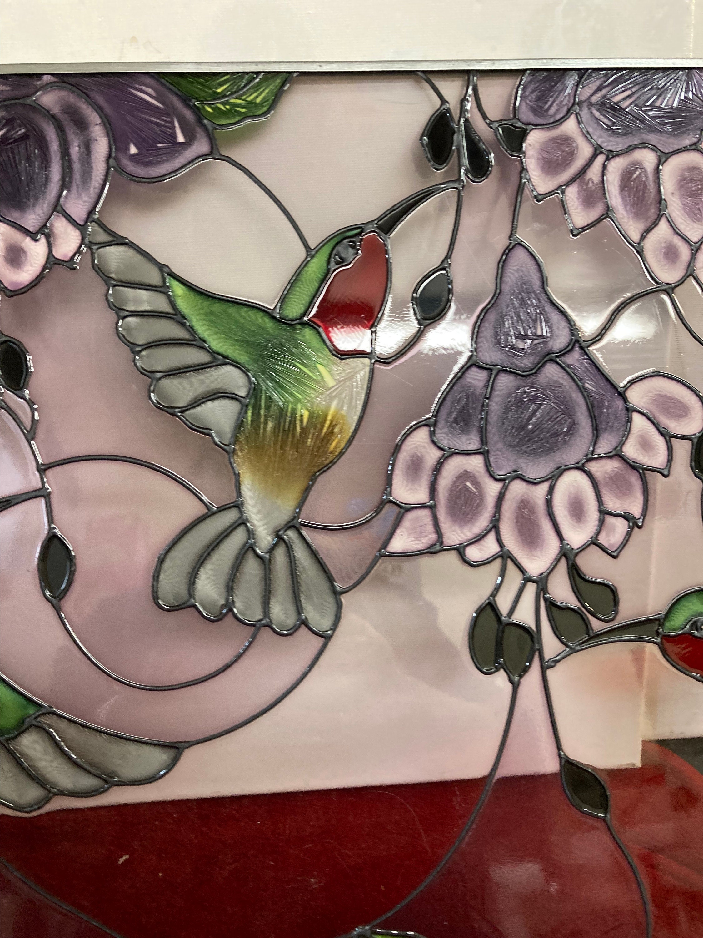 Hummingbirds and Fuchsia Stained Glass Style Art,Hand Painted Plastic Form20 1/2" wide x 14 " tall x 1/8" deepExcellent condition with no damagesHand painted,Material Metal and Plastic Panel