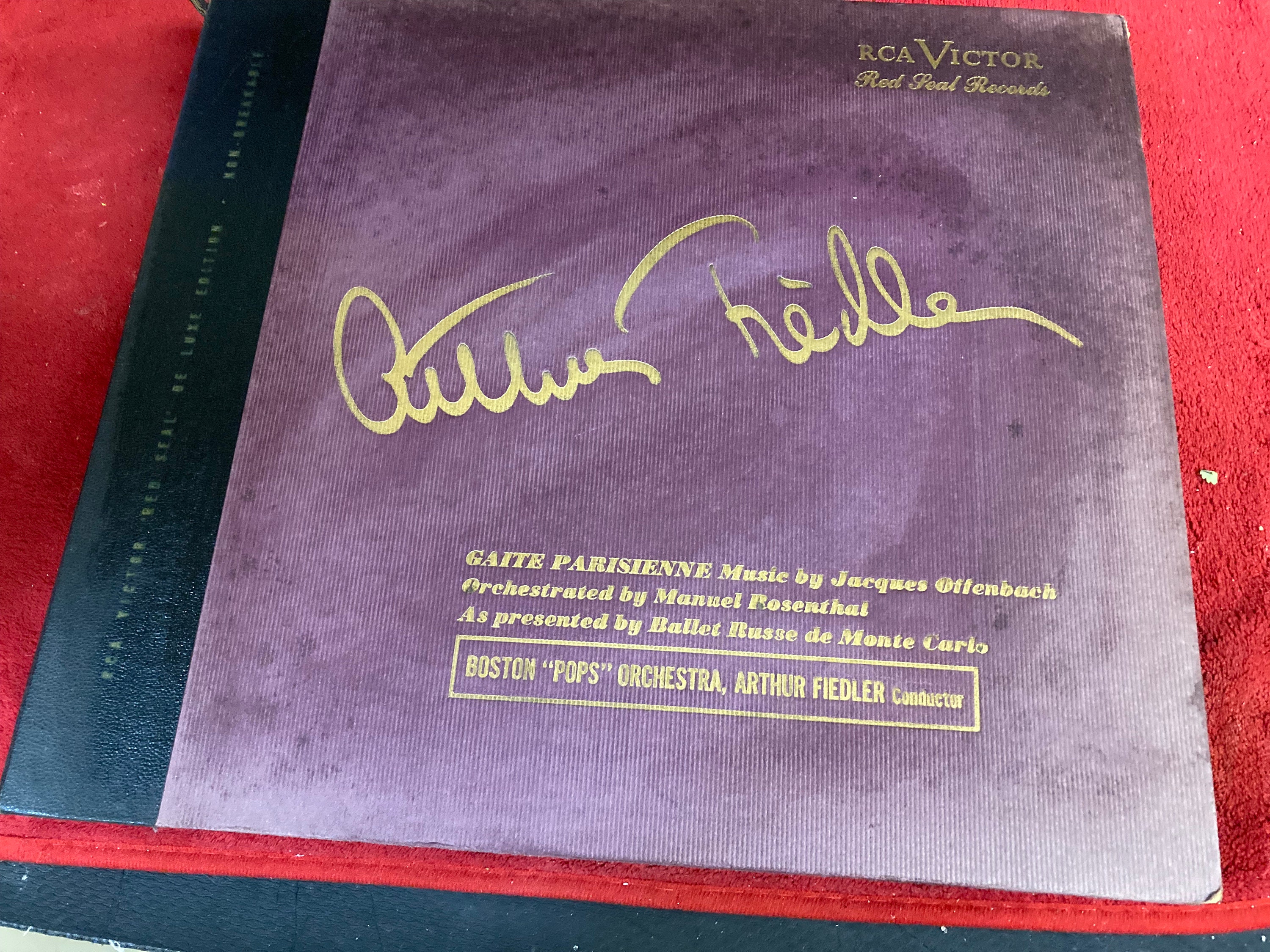 Gaîté Parisienne. The music of Jacques Offenbach (1819-1880) as orchestrated by Manuel Rosenthal (1904-2003) for ballet. Arthur Fiedler (1894-1979) conducting the Boston Pops Orchestra. In the mid 1940's RCA Victor began to experiment with using vinyl for some 78 rpm issues. The records were a translucent red vinyl and were issued with premium pricing. These issues were some of the best 78 rpm records ever made. This recording went on to become the first RCA Victor 33 1/3 rpm LP issue in 1948. Transfer from the original 1947 RCA Victor "Red Seal De Luxe" 78 set DV-9 by Bob Varney. 4 Records are in excellent condition in this rare Album