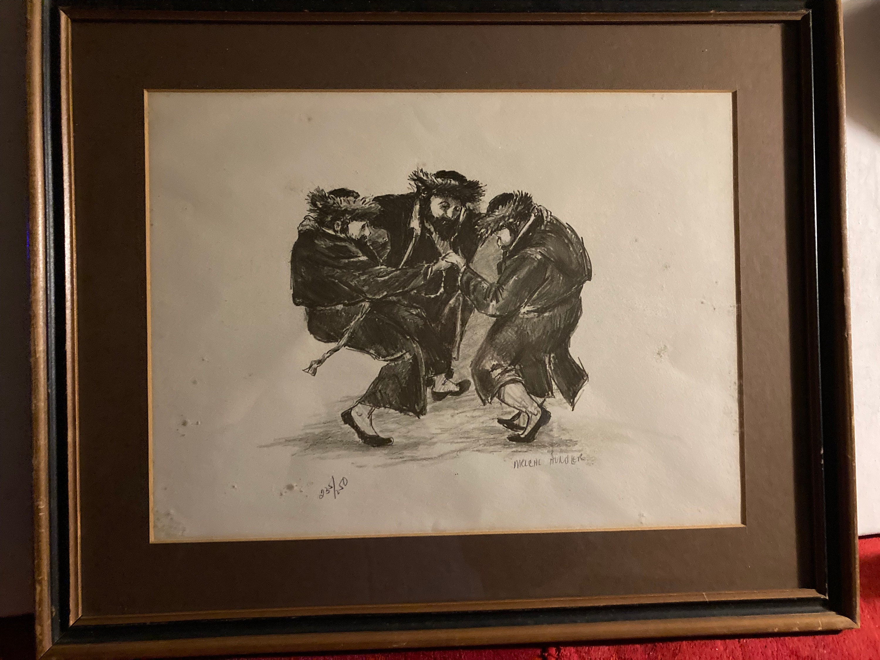 An original numbered and signed graphic by Melchl Hundler. The scene is of threeJewish men dancing.