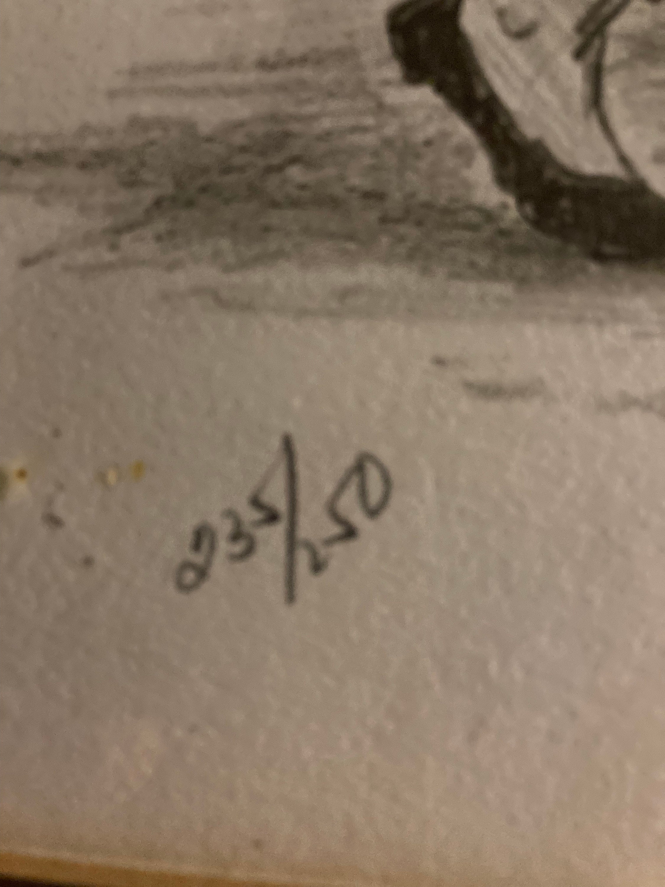 It is a lovely thought evoking scene. The piece is signed by the artist and is 235 of 250. Other pieces in this series indicate that 250 to 300 are the total number of prints. The print has been professionally rematted with a double mat in acid free museum quality materials and an acid free backing has been added. It is framed in a 21.5" x 17.5". There is a very pleasing discoloration of the paper that the image was printed on (See Photos) This feature only enhances the pieces appeal. The dimensions are as follows: