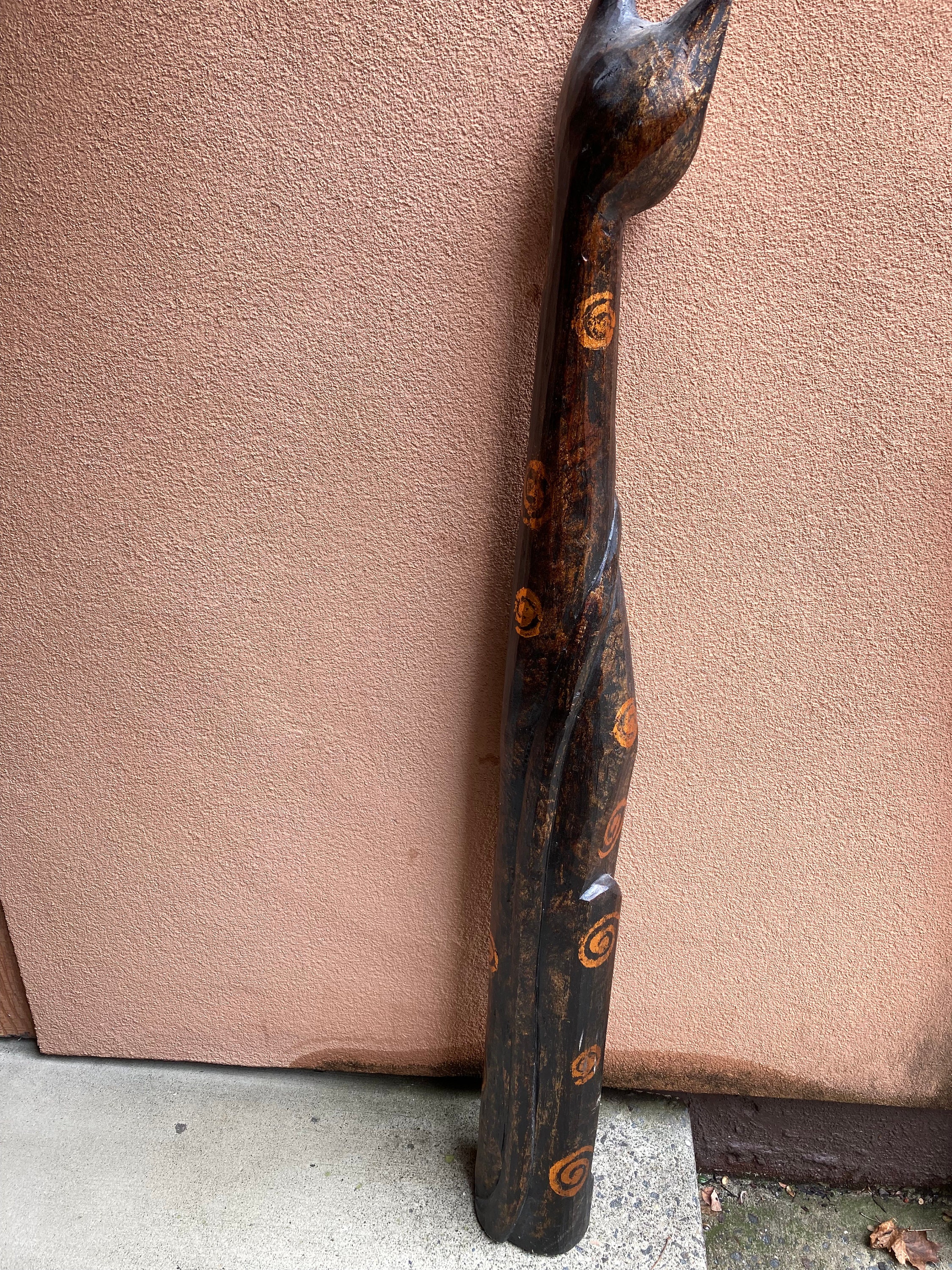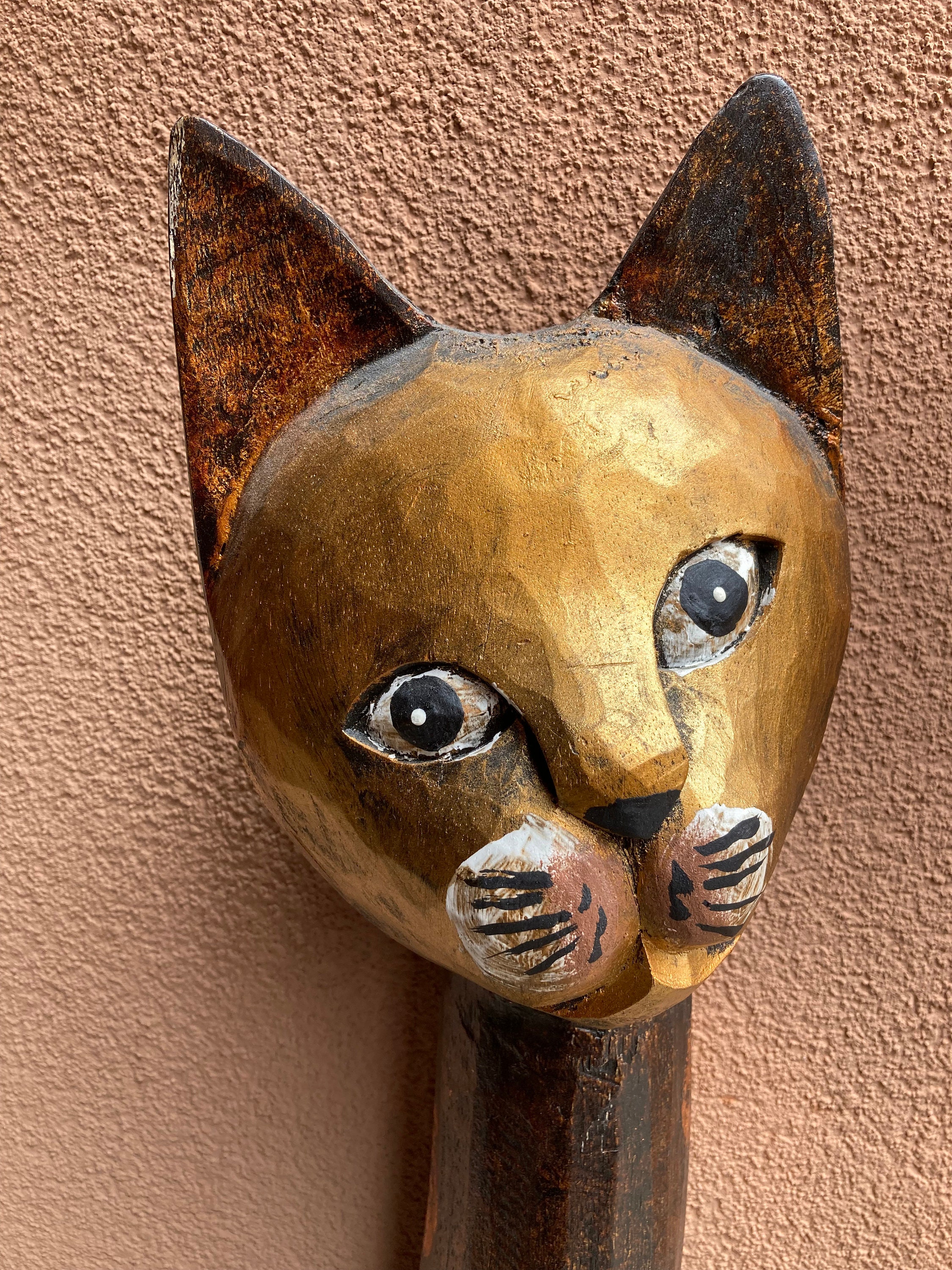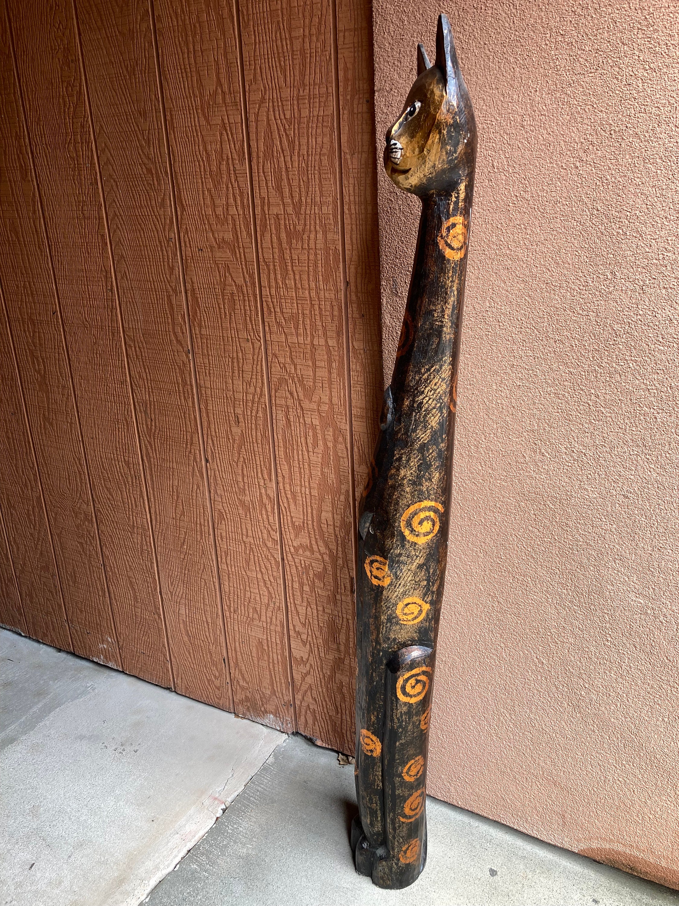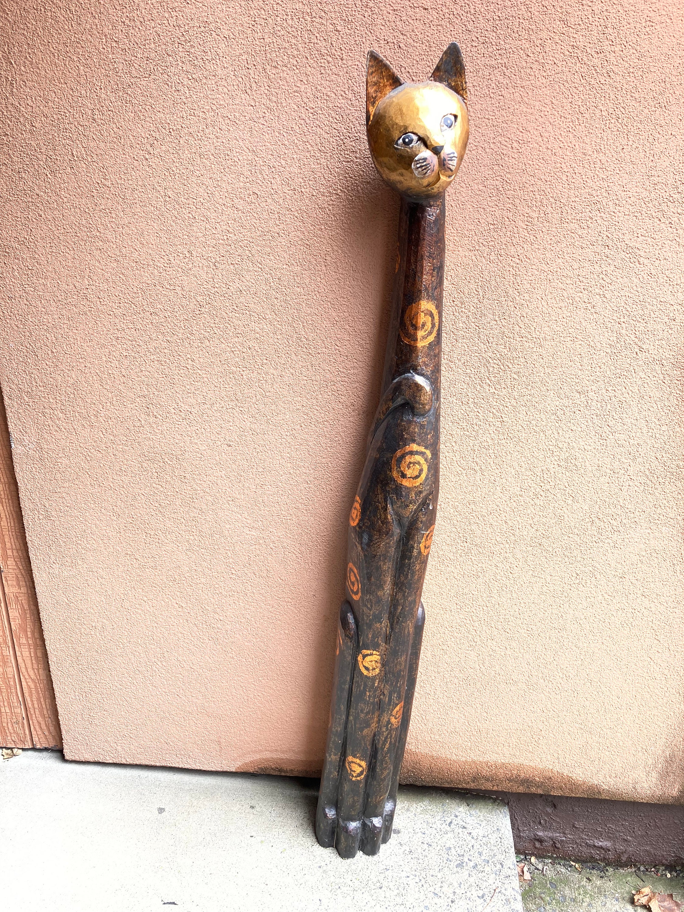 Vintage Folk Art Hand Carved Wood Cat Statue (ca. 1960).
