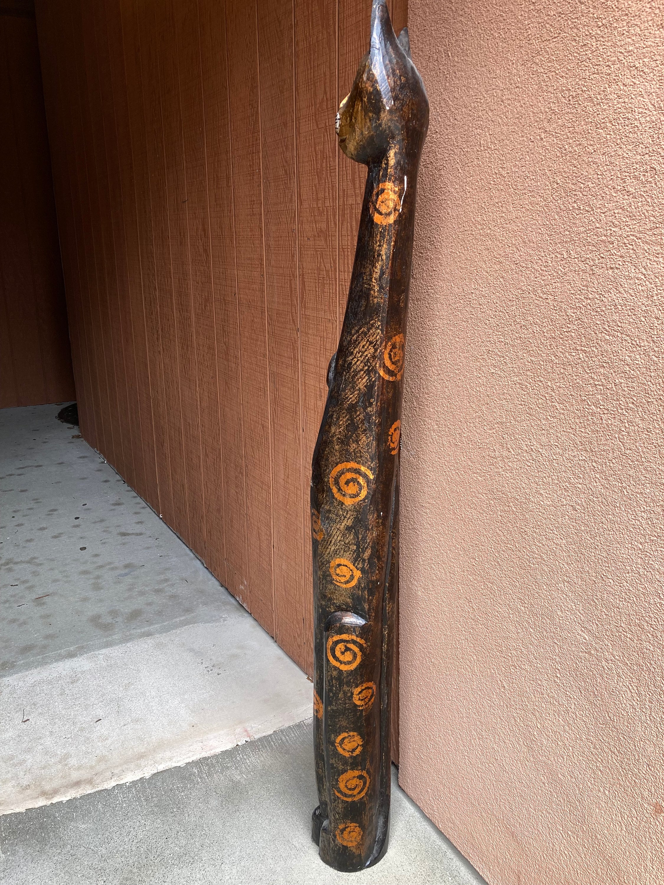 Large hand painted and carved wood statue of a cat with brown and gold circles.