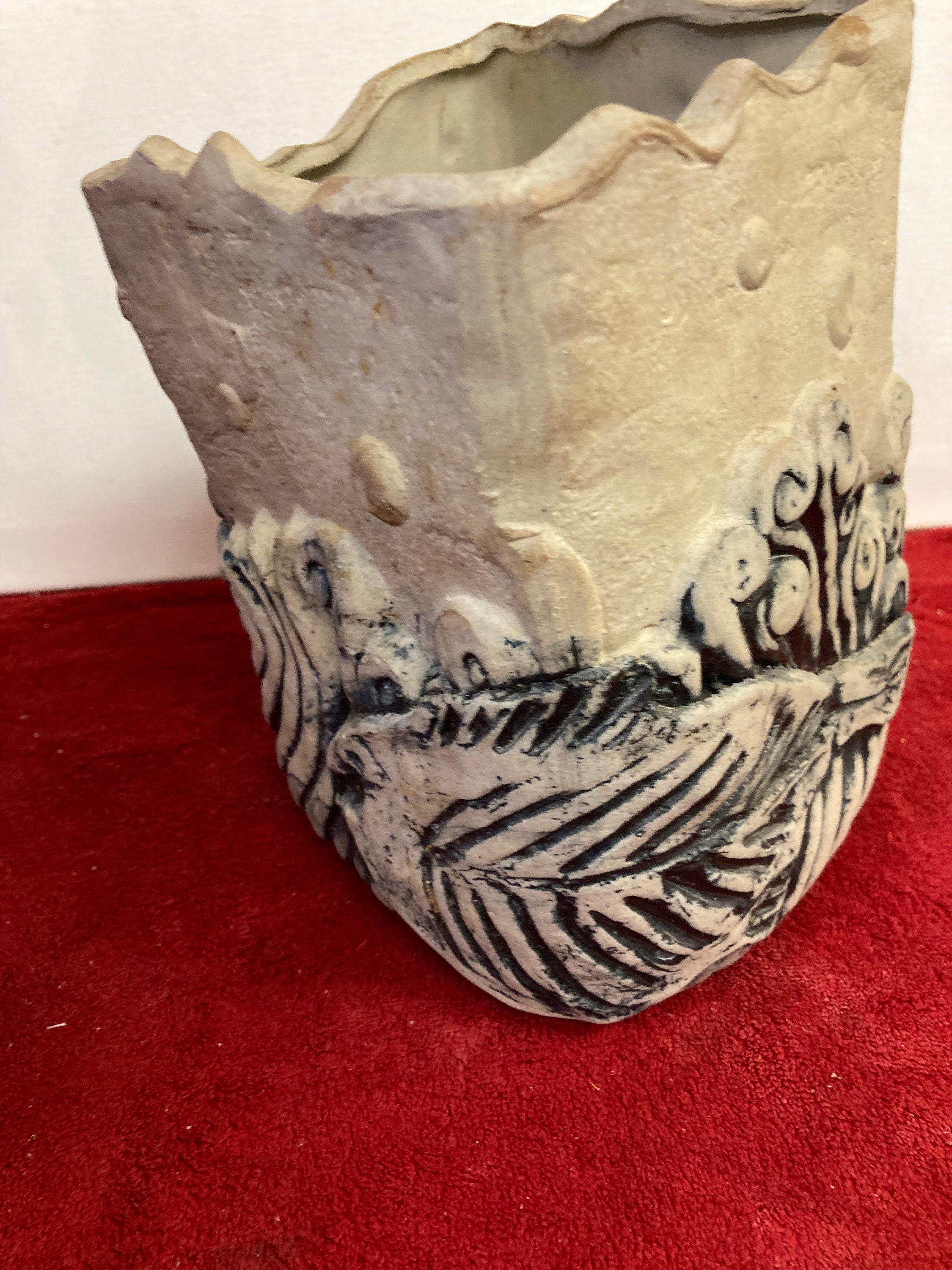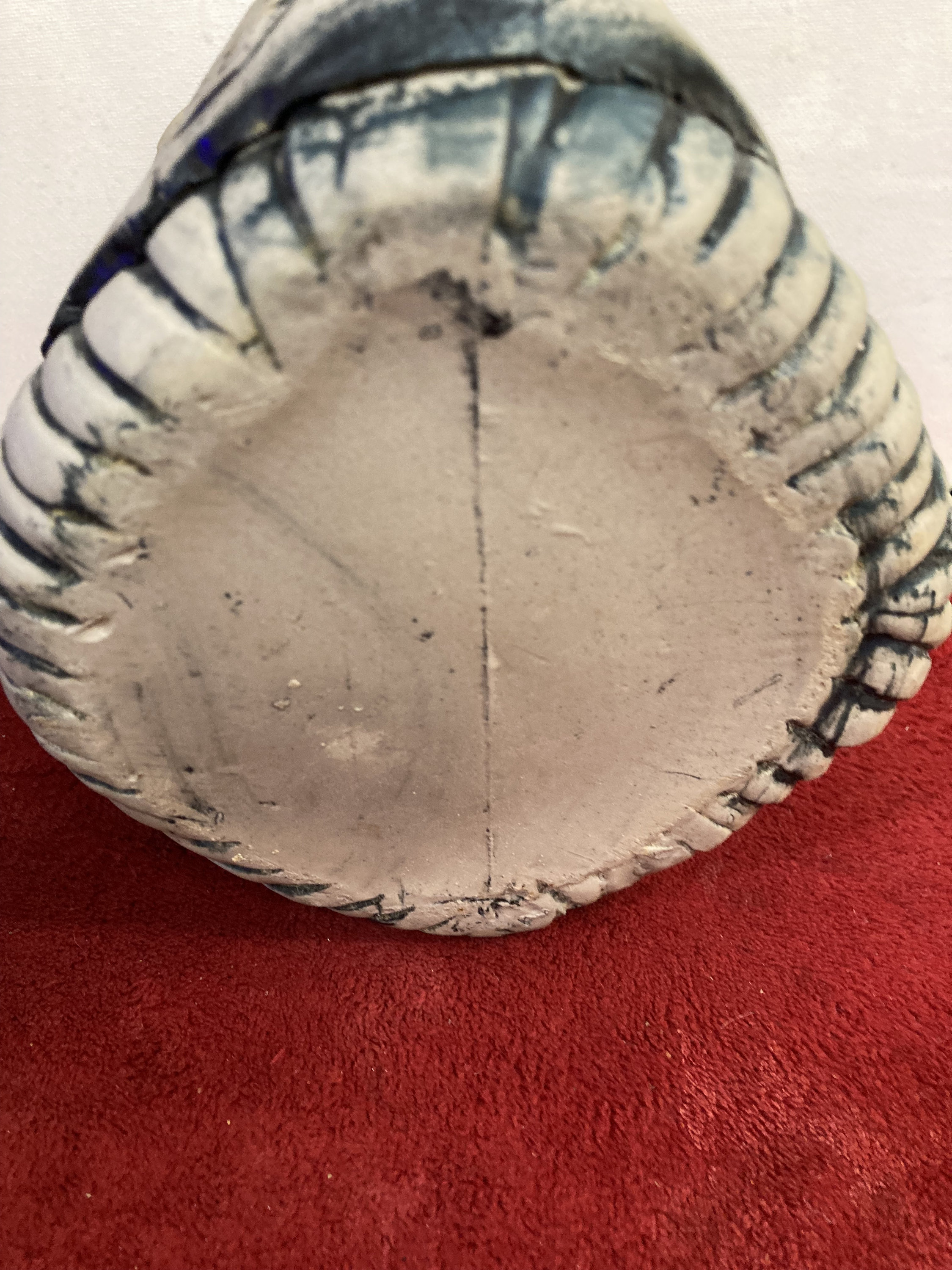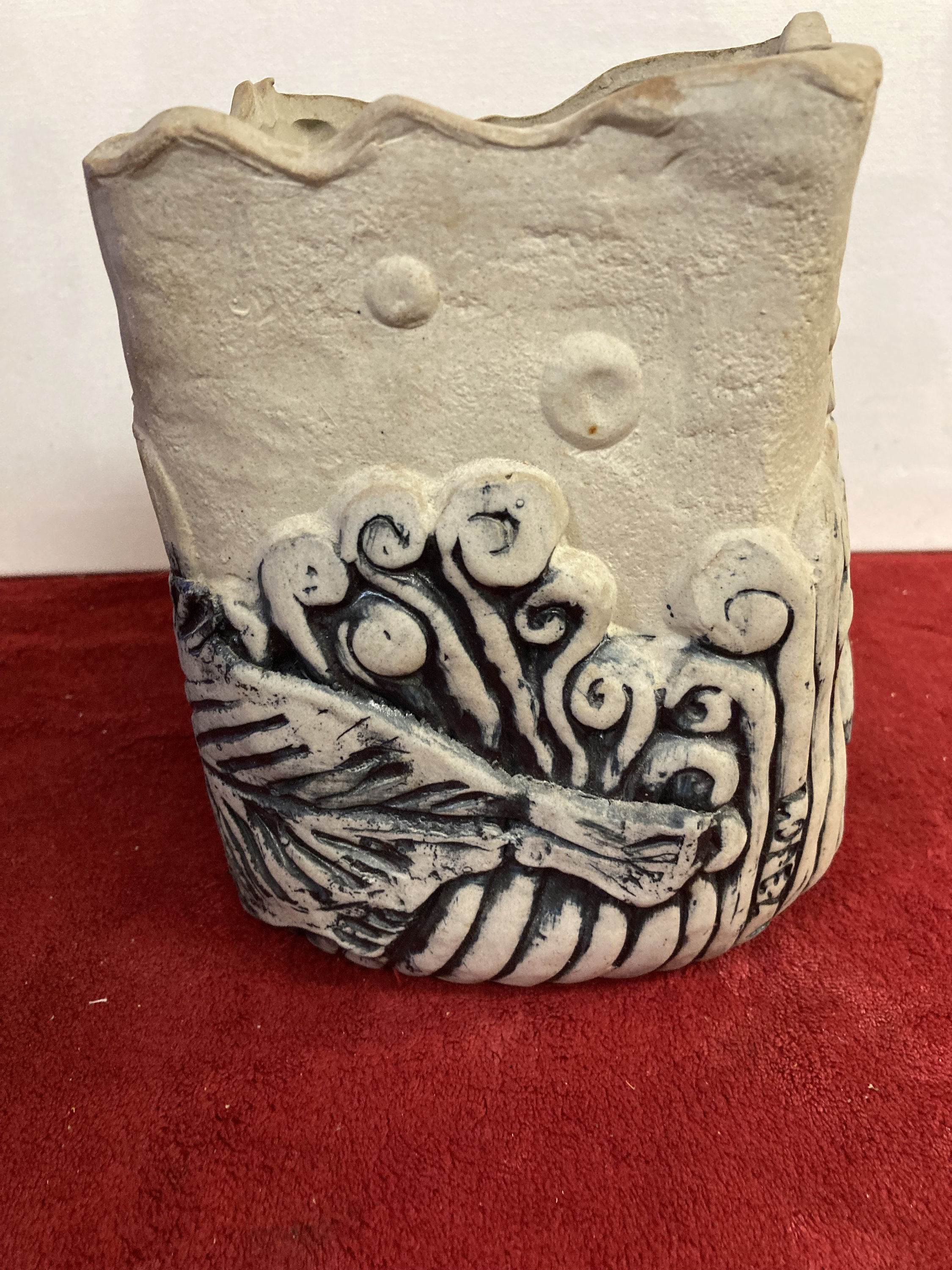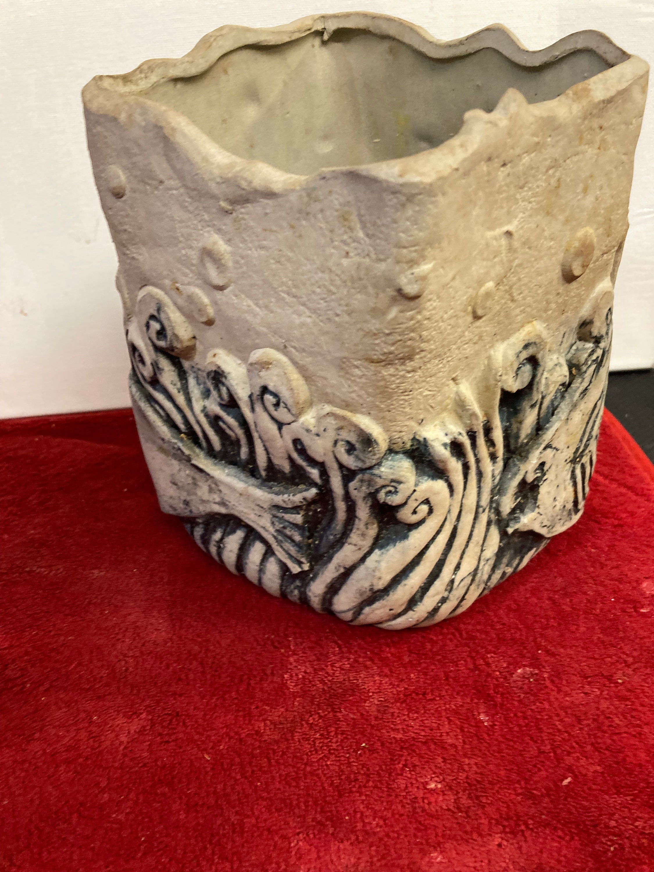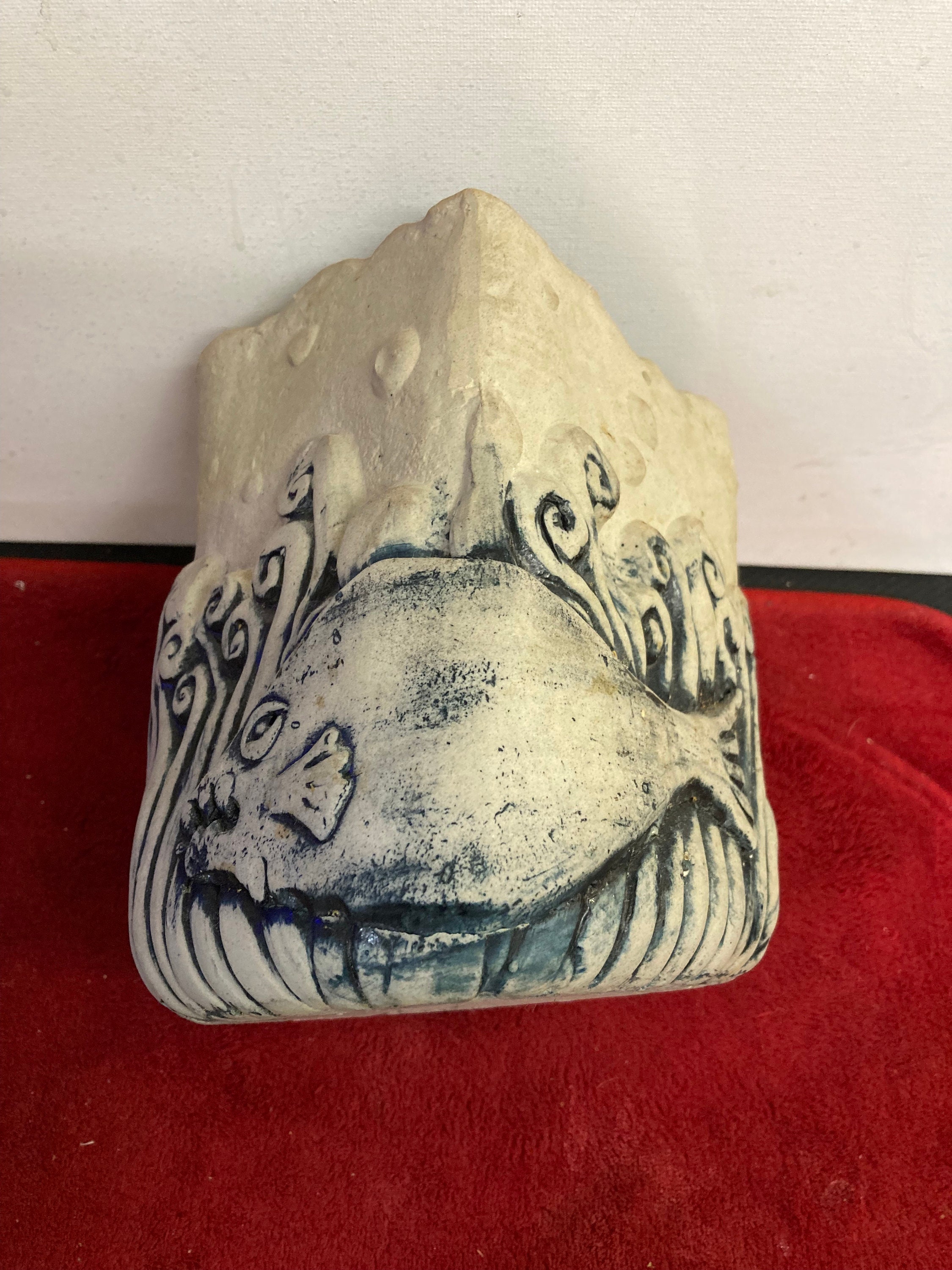 over A square Vase that looks like Ocean wave with 2 hand carved fish around it