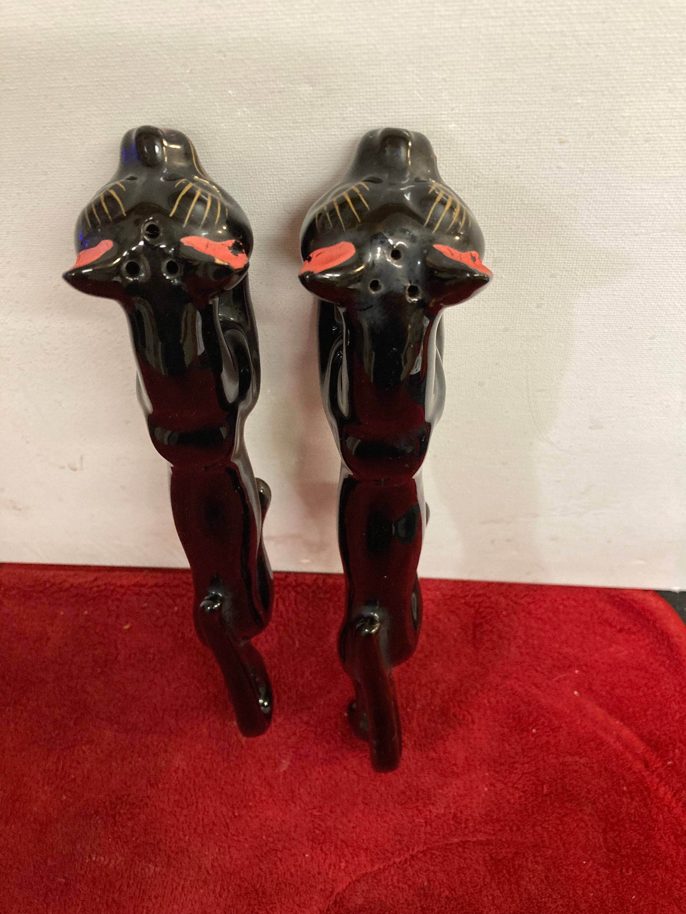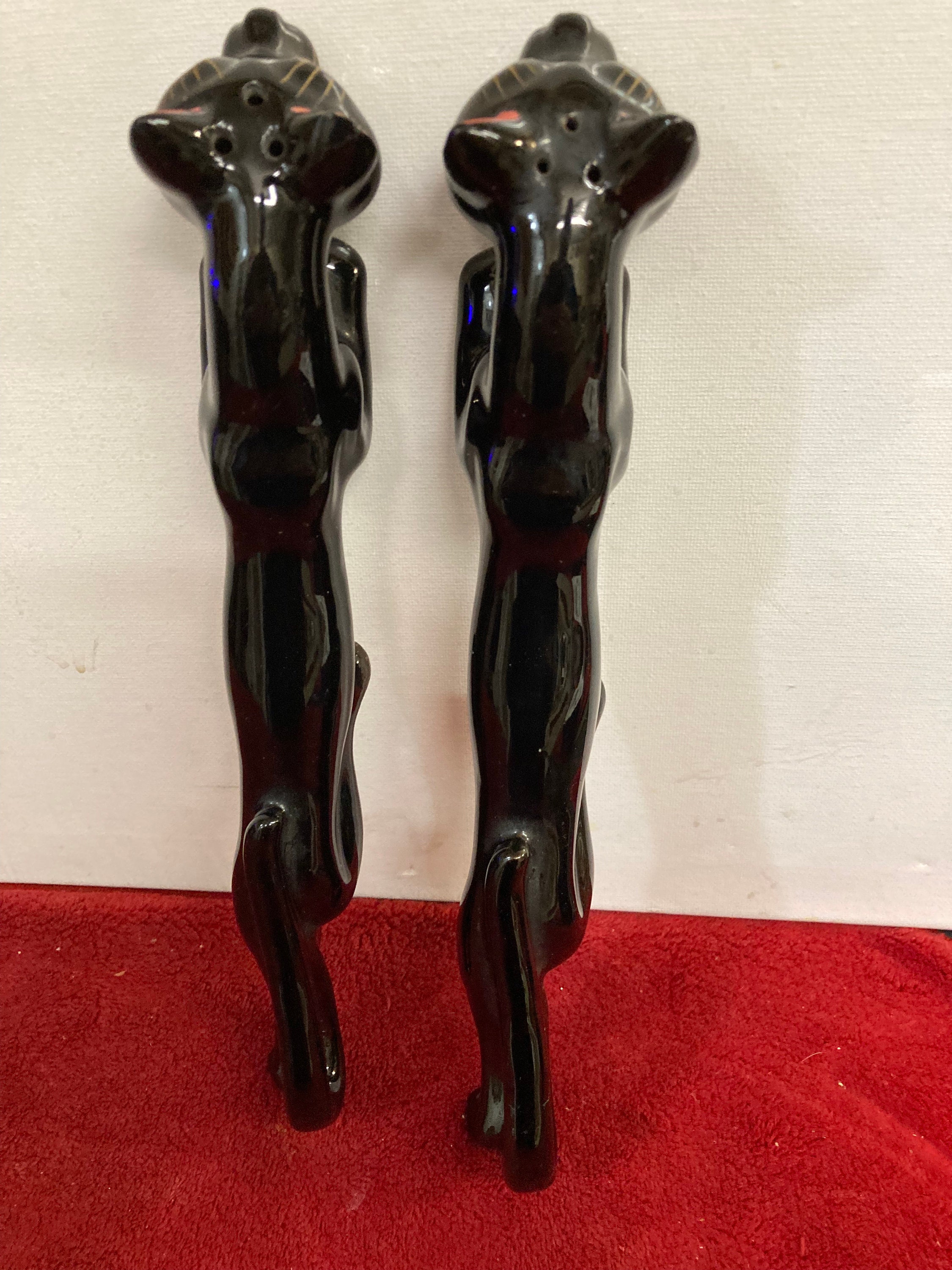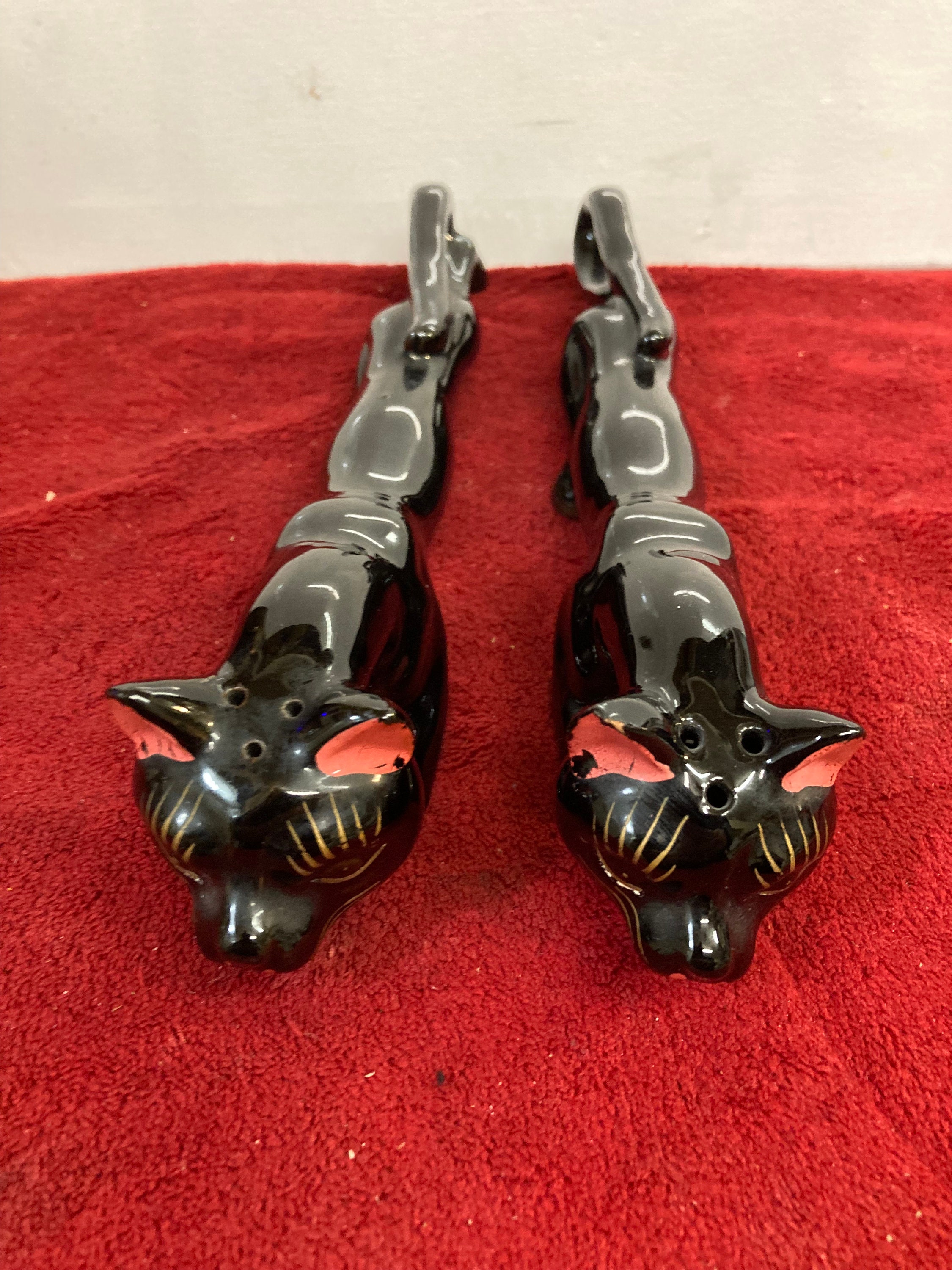 Vintage Pair of Enesco Long Black Cat Salt/Pepper Shakers, Japan Mid Century Retro Kitsch Figurine10 1/2" long x 1 1/2" wide x 2" deep Made in JapanGood Vintage ConditionNo Damages ,Scratches or Chips
