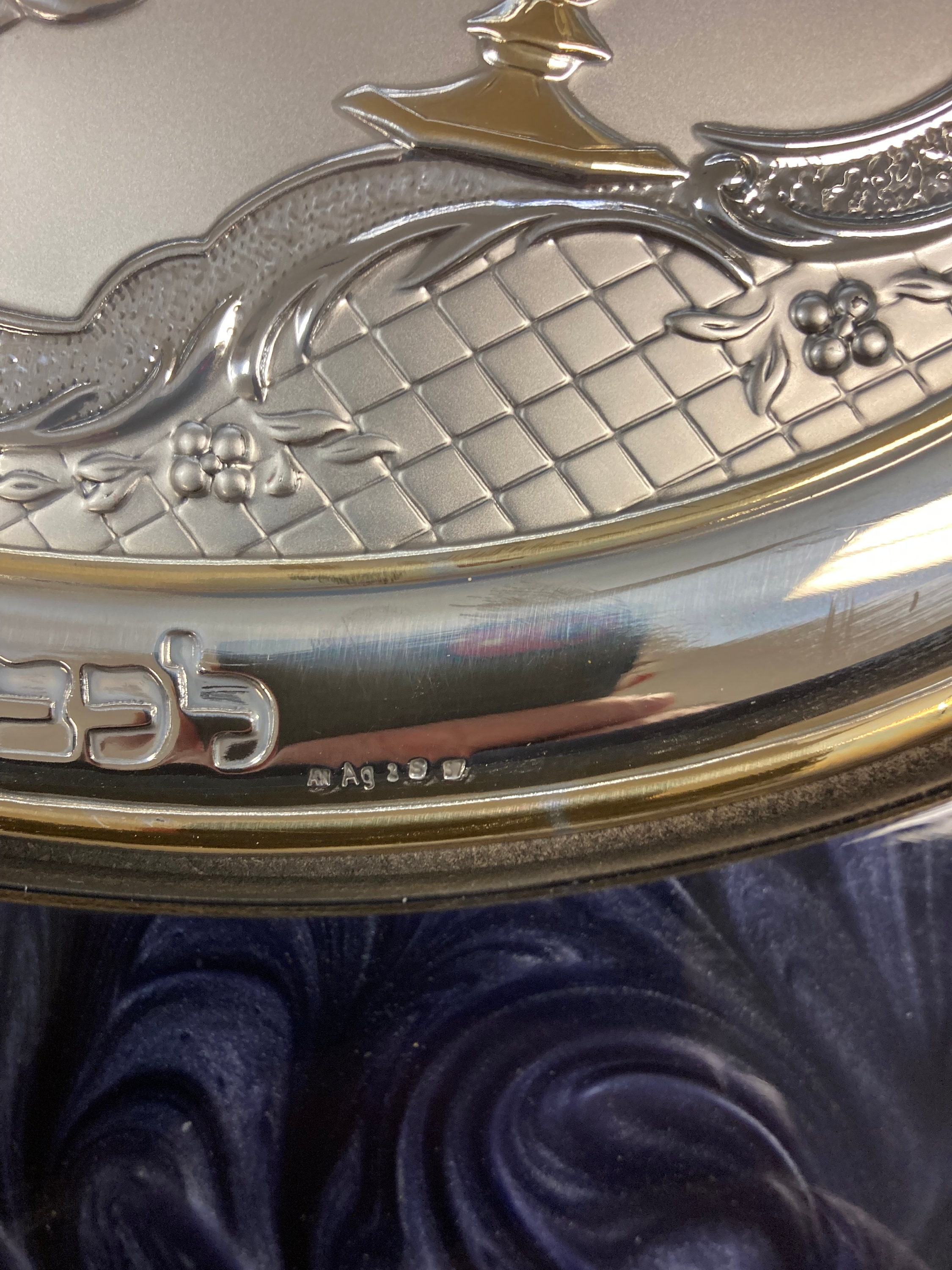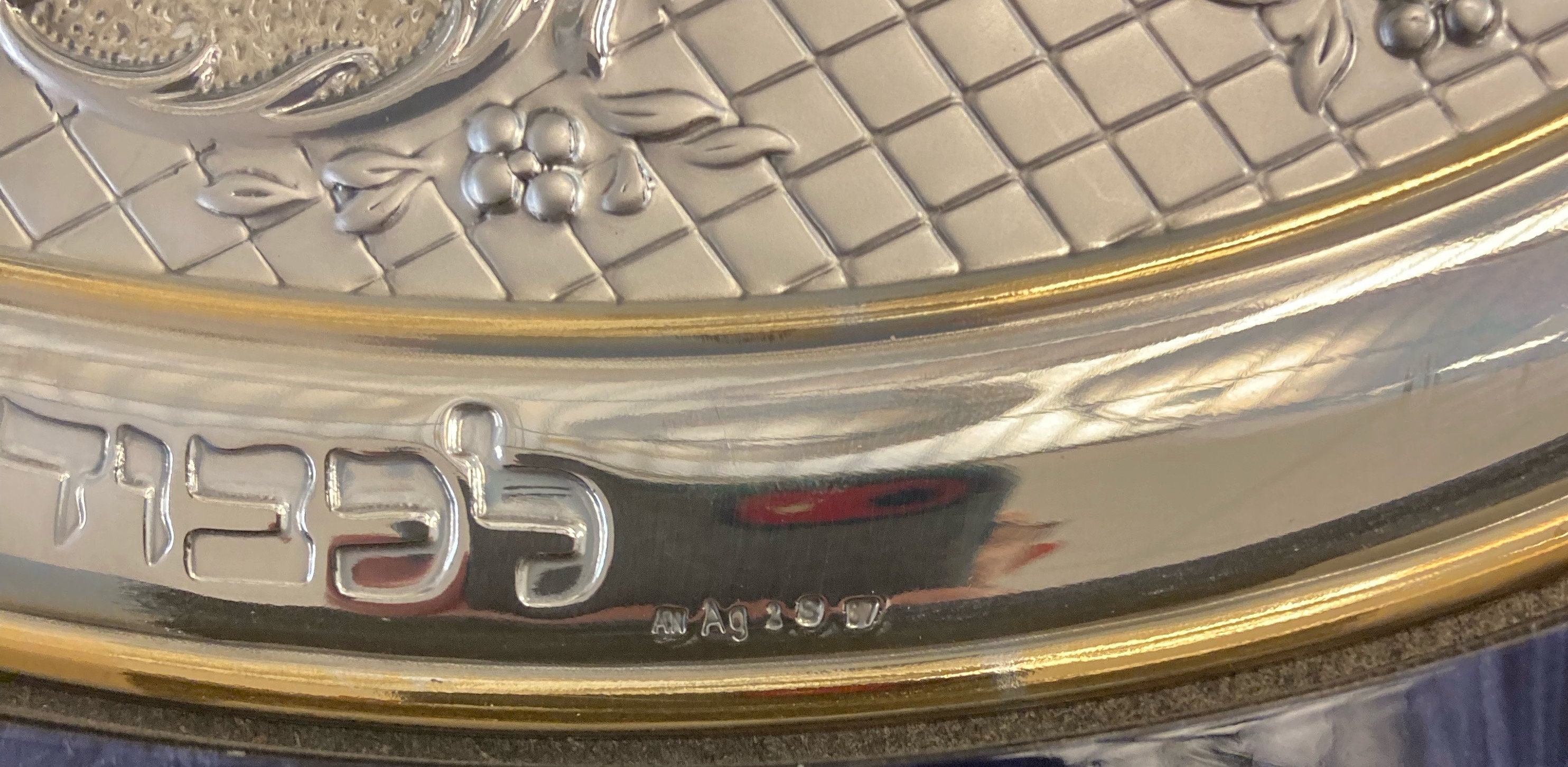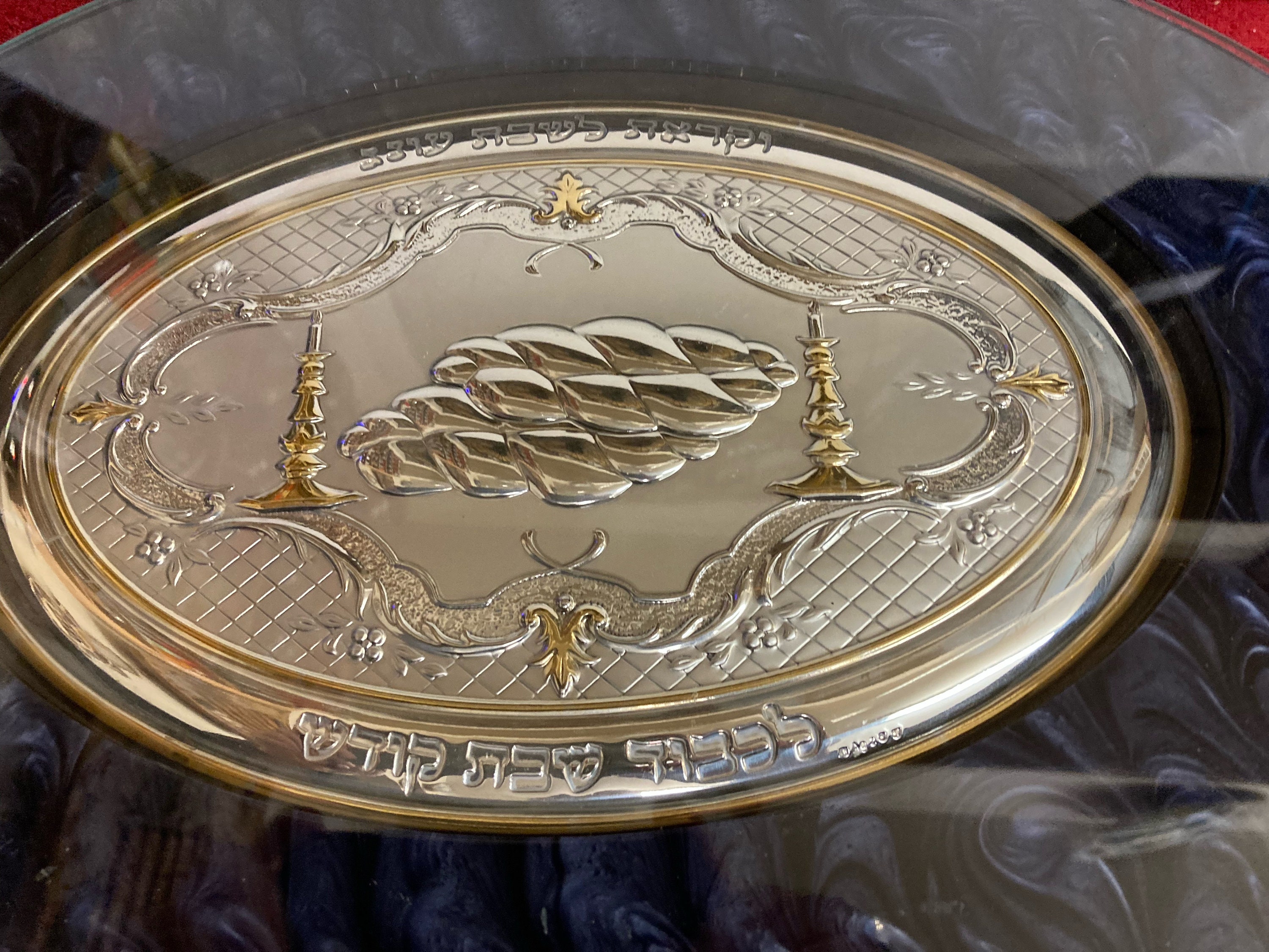 This beautiful challah board will make a wonderful impression, proudly displayed on your table on the Sabbath and on the mantel the rest of the week! It features a silver plaque ( marked :AX A 925 g7)lower right side and in the center showing a Sabbath table scene in the center surrounded by Hebrew text of the end of the blessing over bread