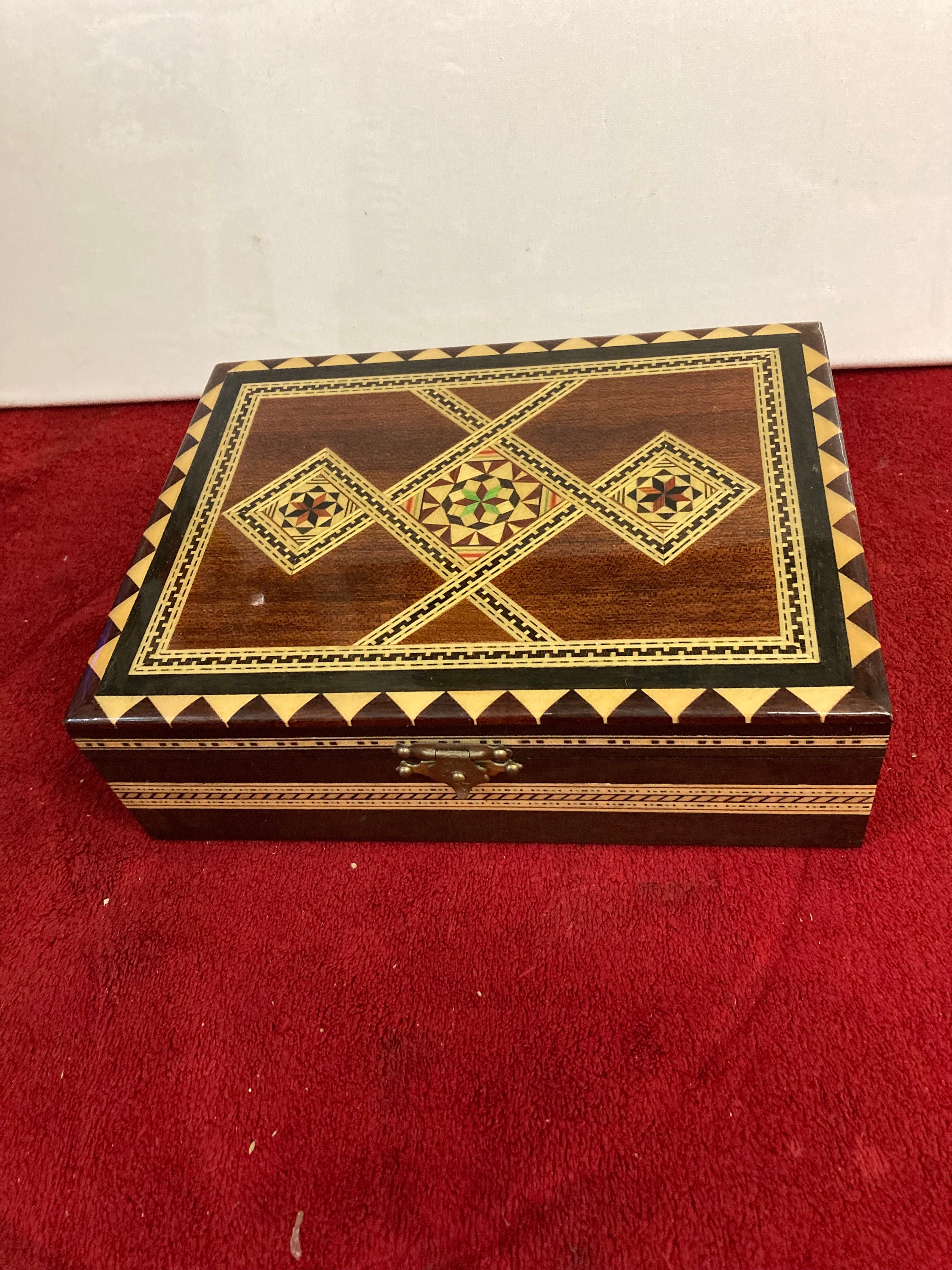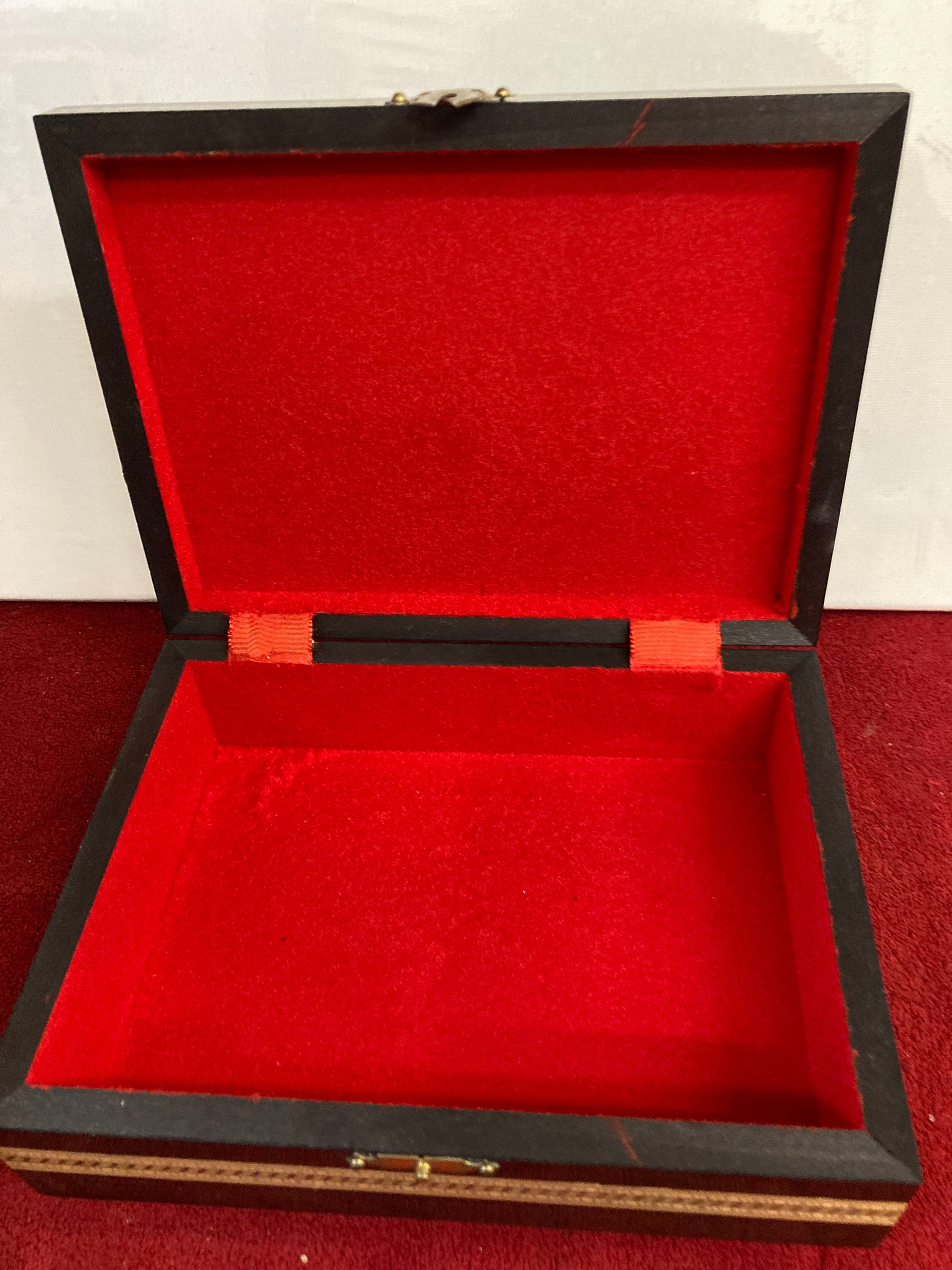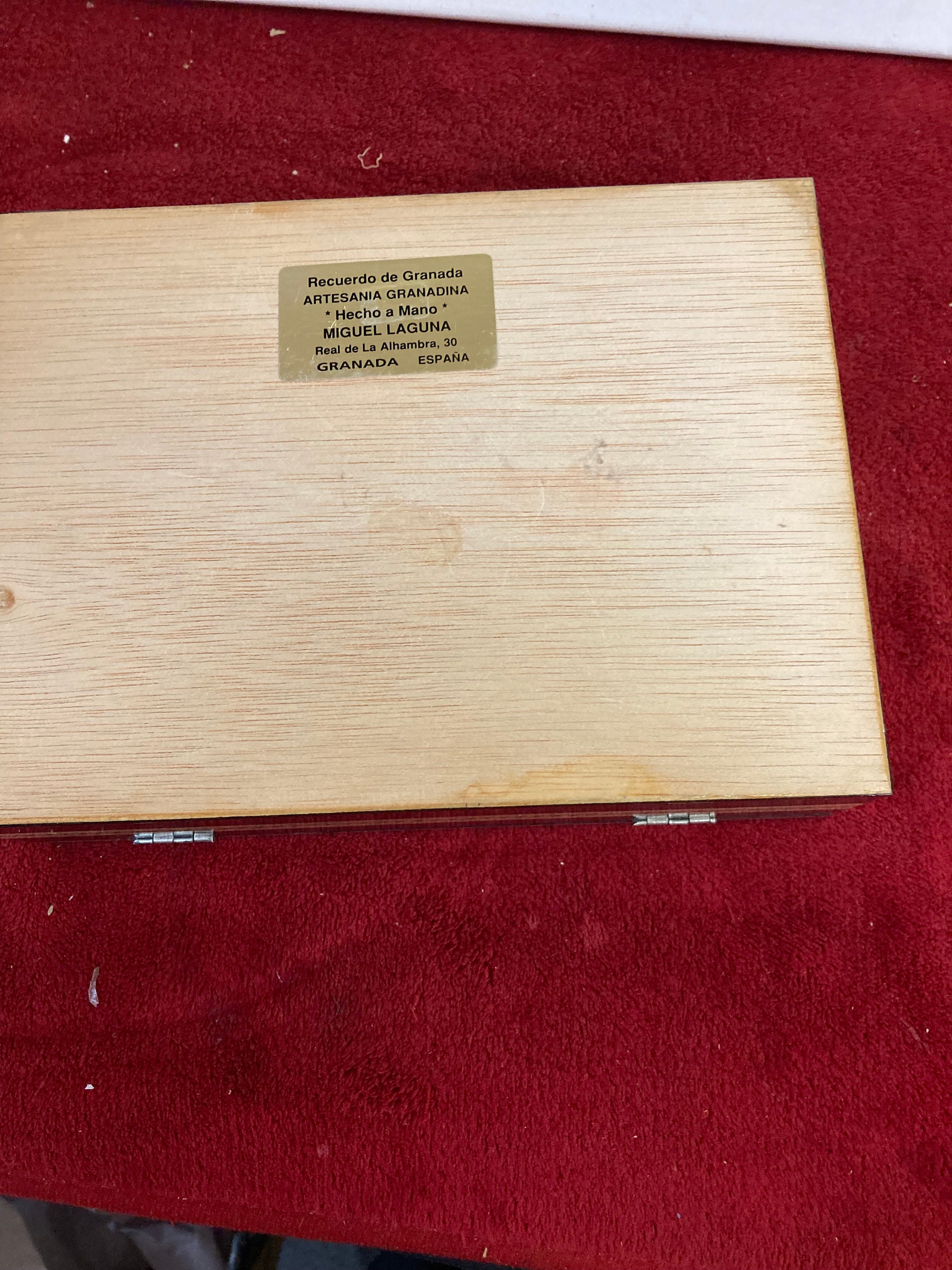 Beautifully crafted box made of lacquered wood with red velvet lining perfect for jewelry or other treasures.7 3/4" wide x 5 3/4" tall x 2 1/2" deepWeight : 3/4 lbPerfect Condition with no dsamagesMade In Spain