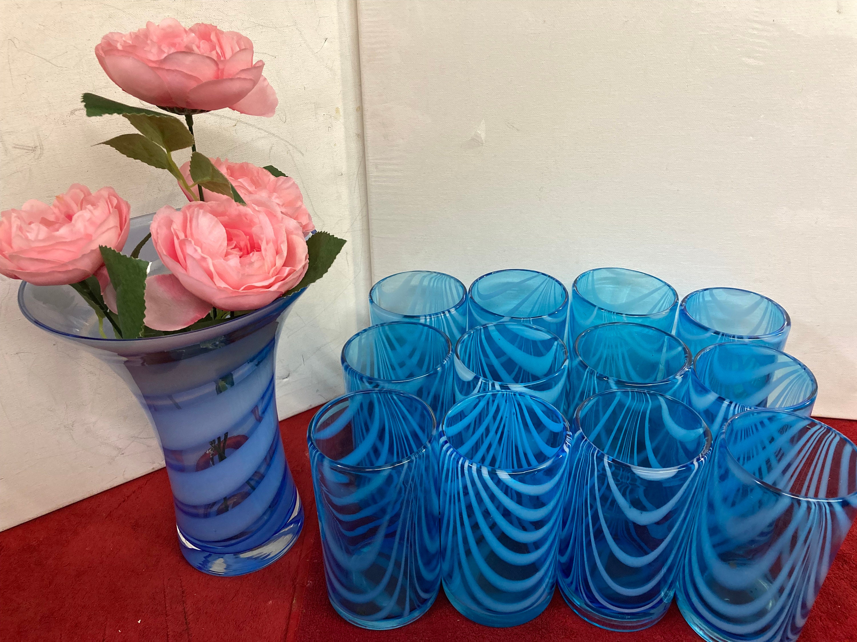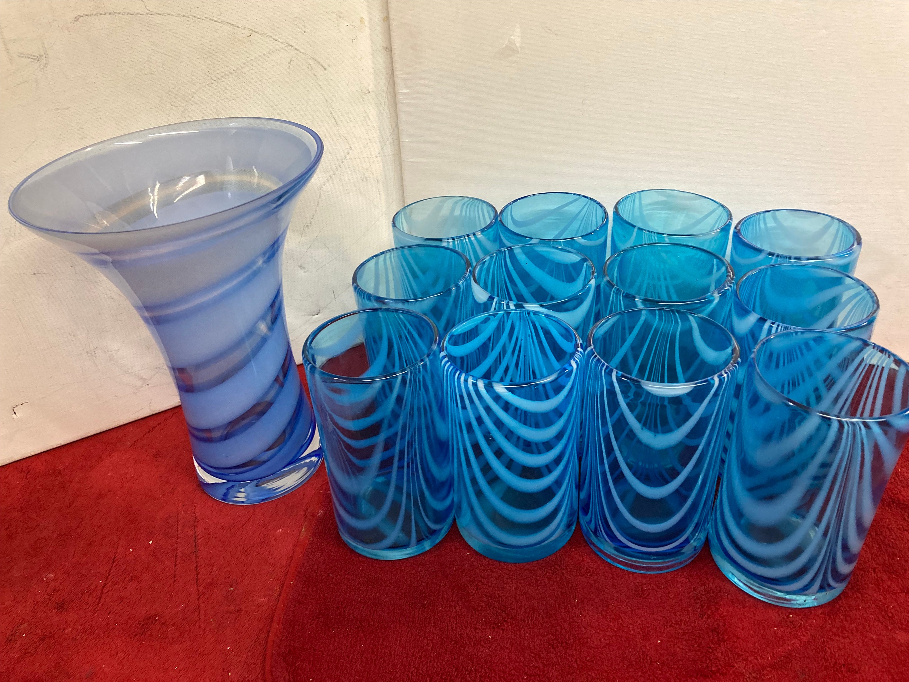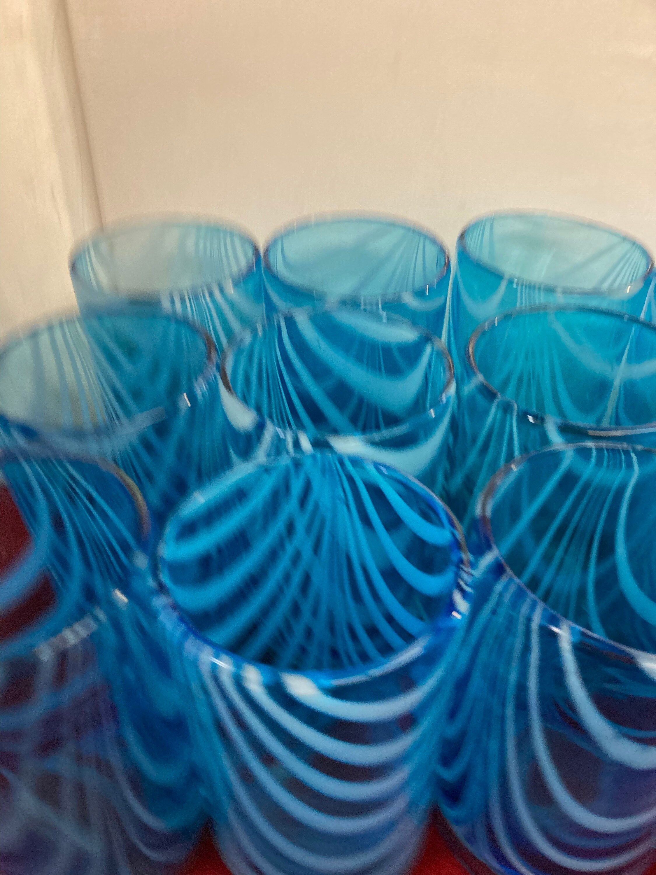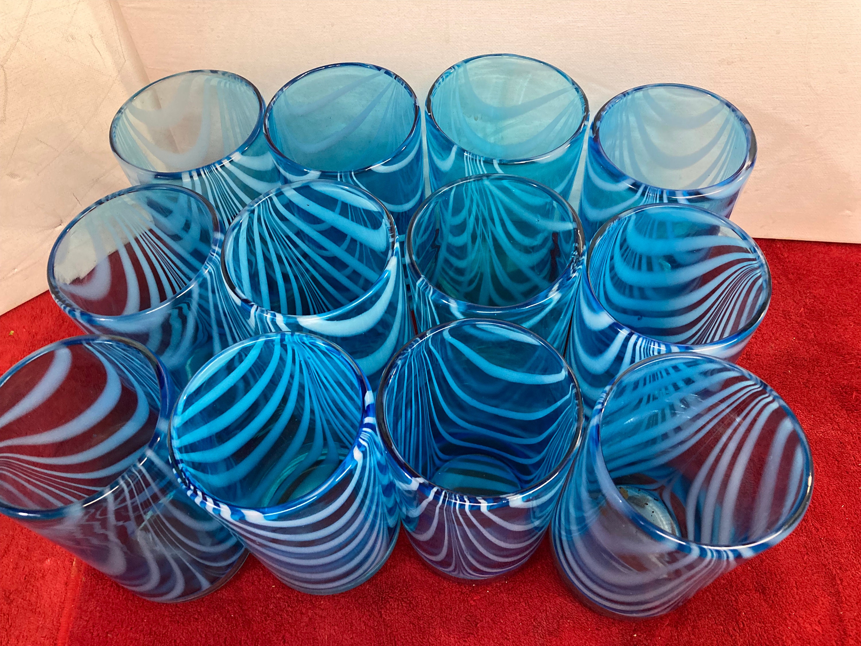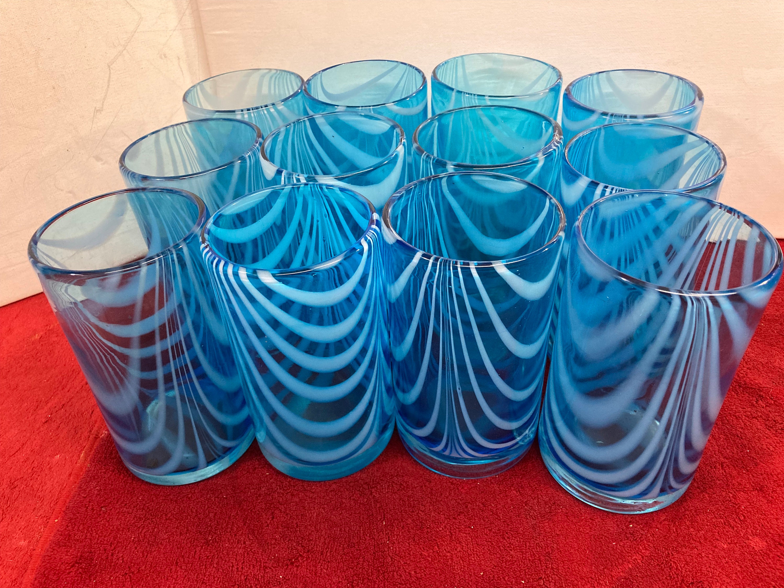 12 Handmade Light Aqua Blue Glasses with White Swags Trailings Plus