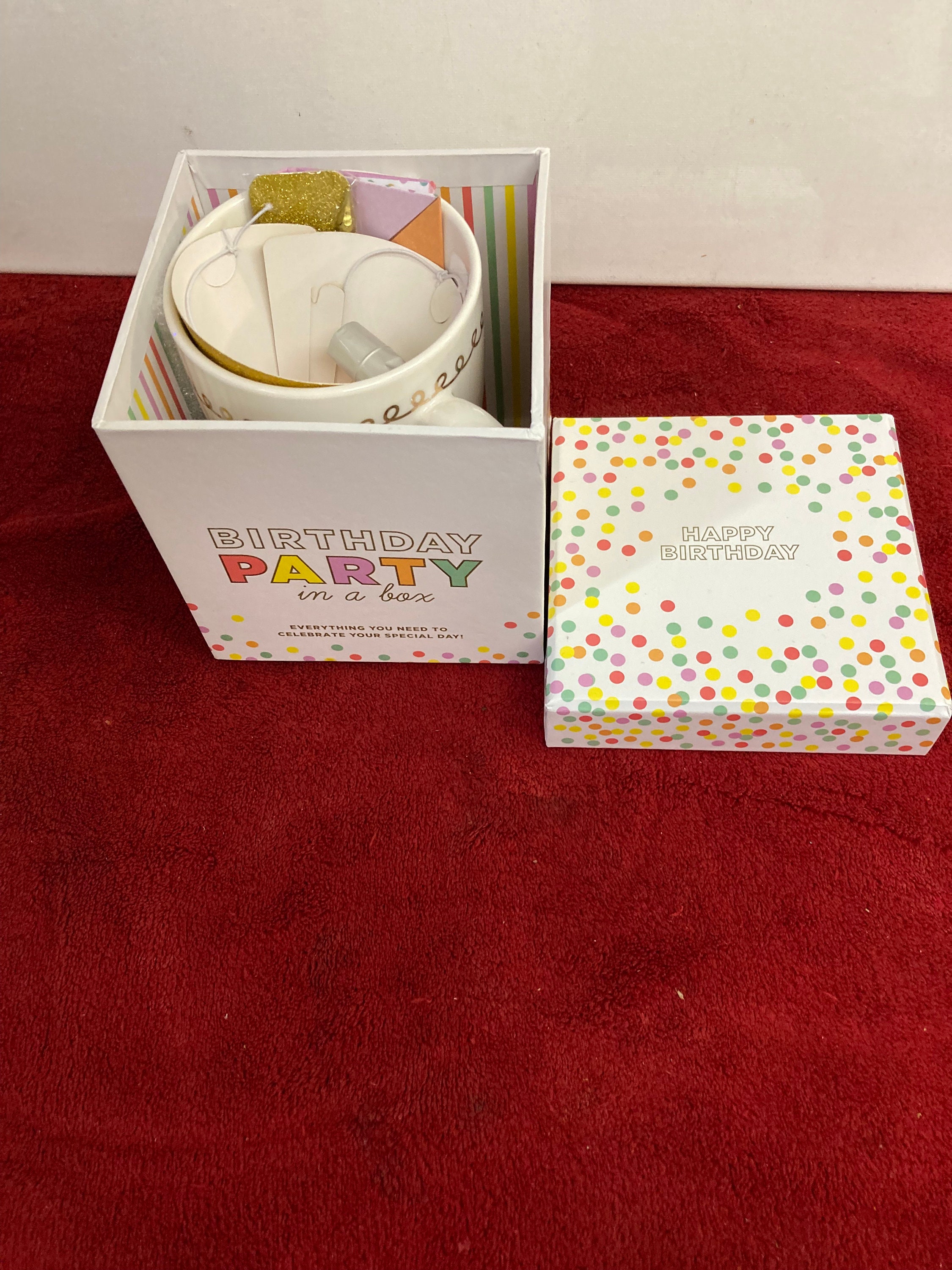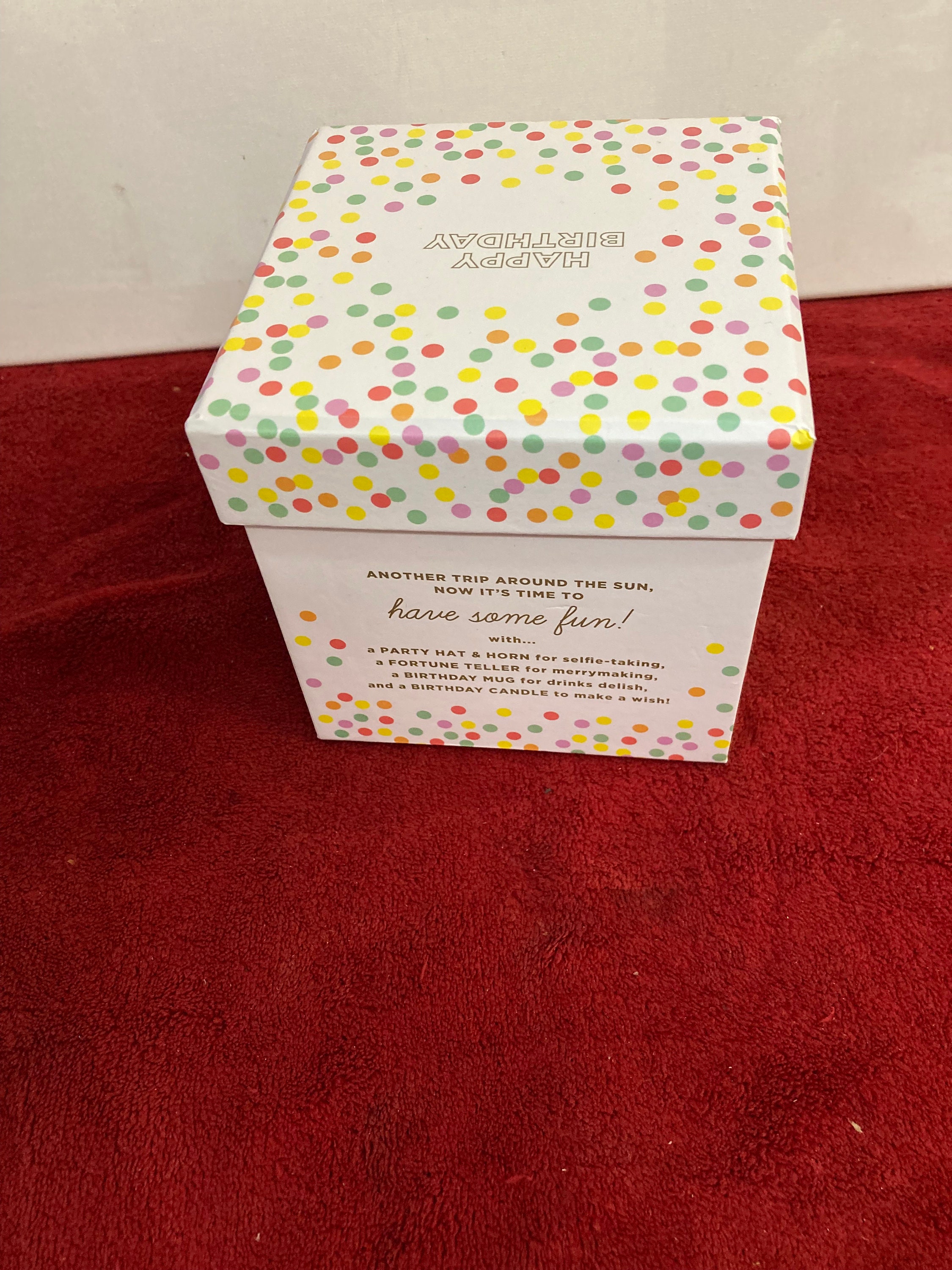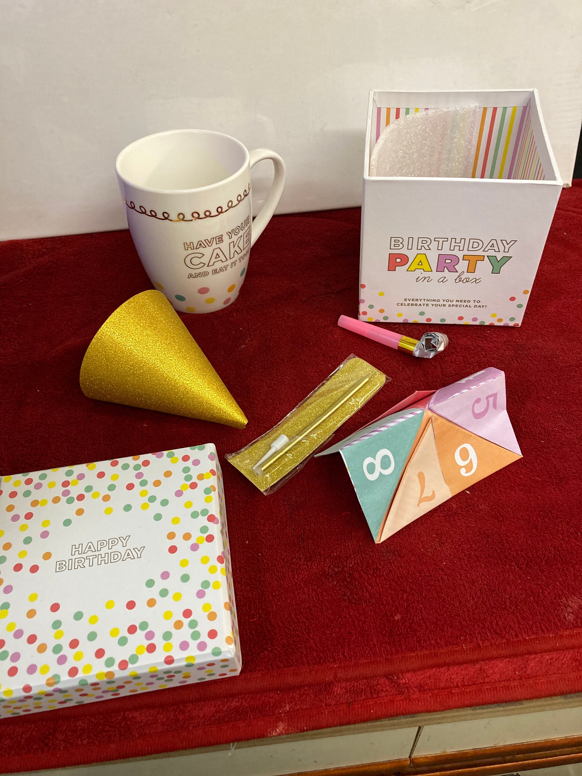 Includes porcelain mug, fortune teller, noise maker, birthday candle, and party hat