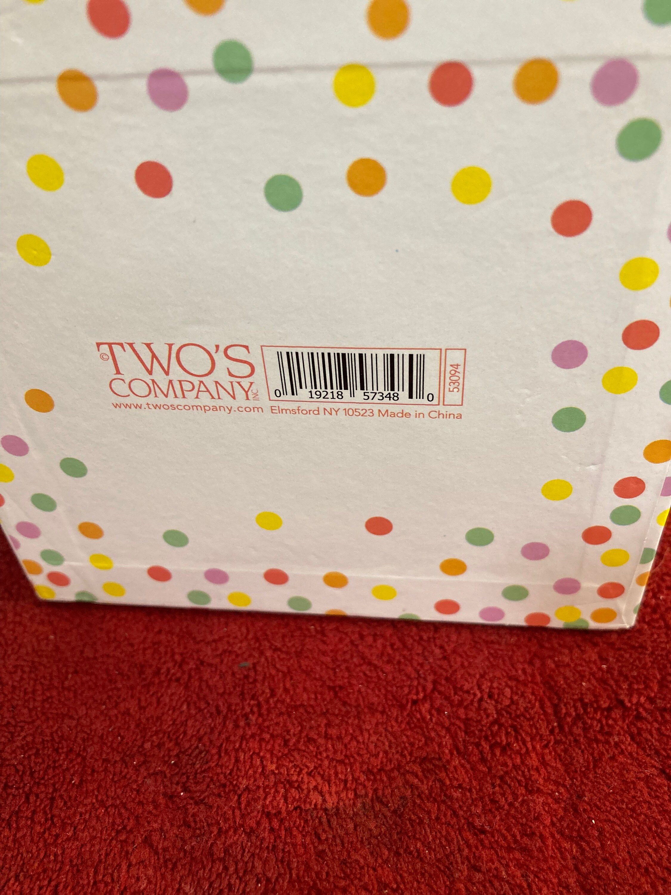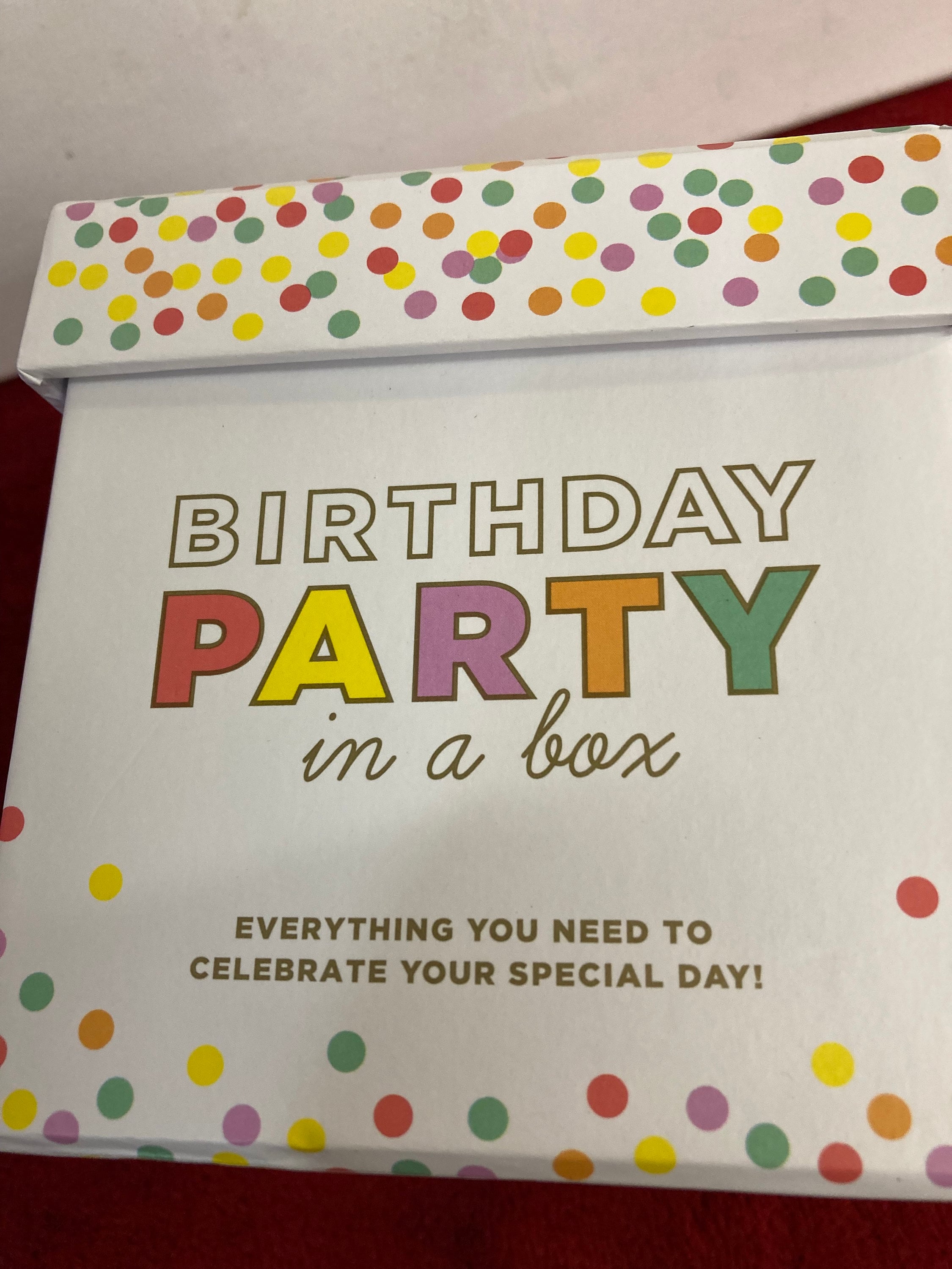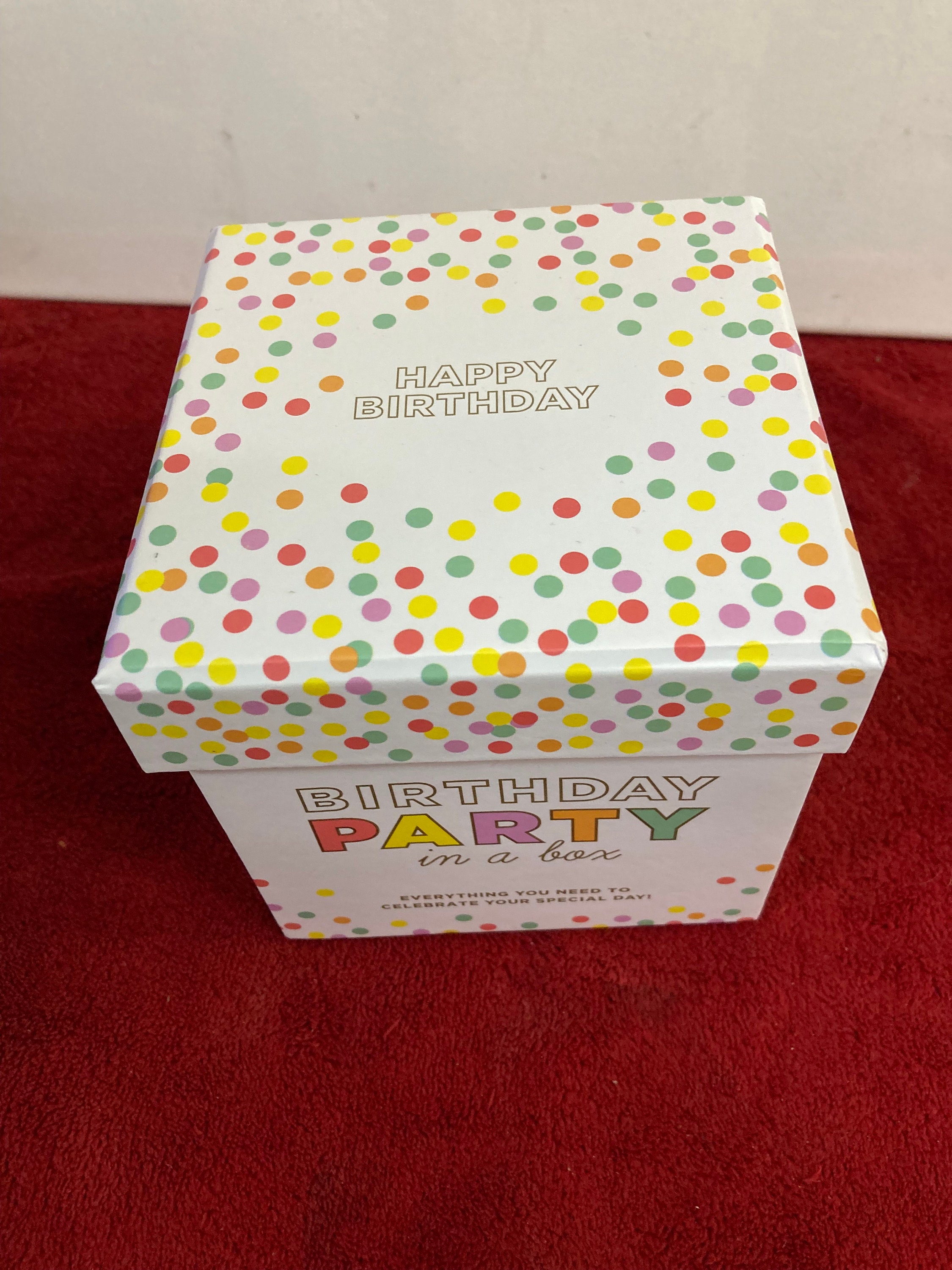 Includes porcelain mug, fortune teller, noise maker, birthday candle, and party hat
