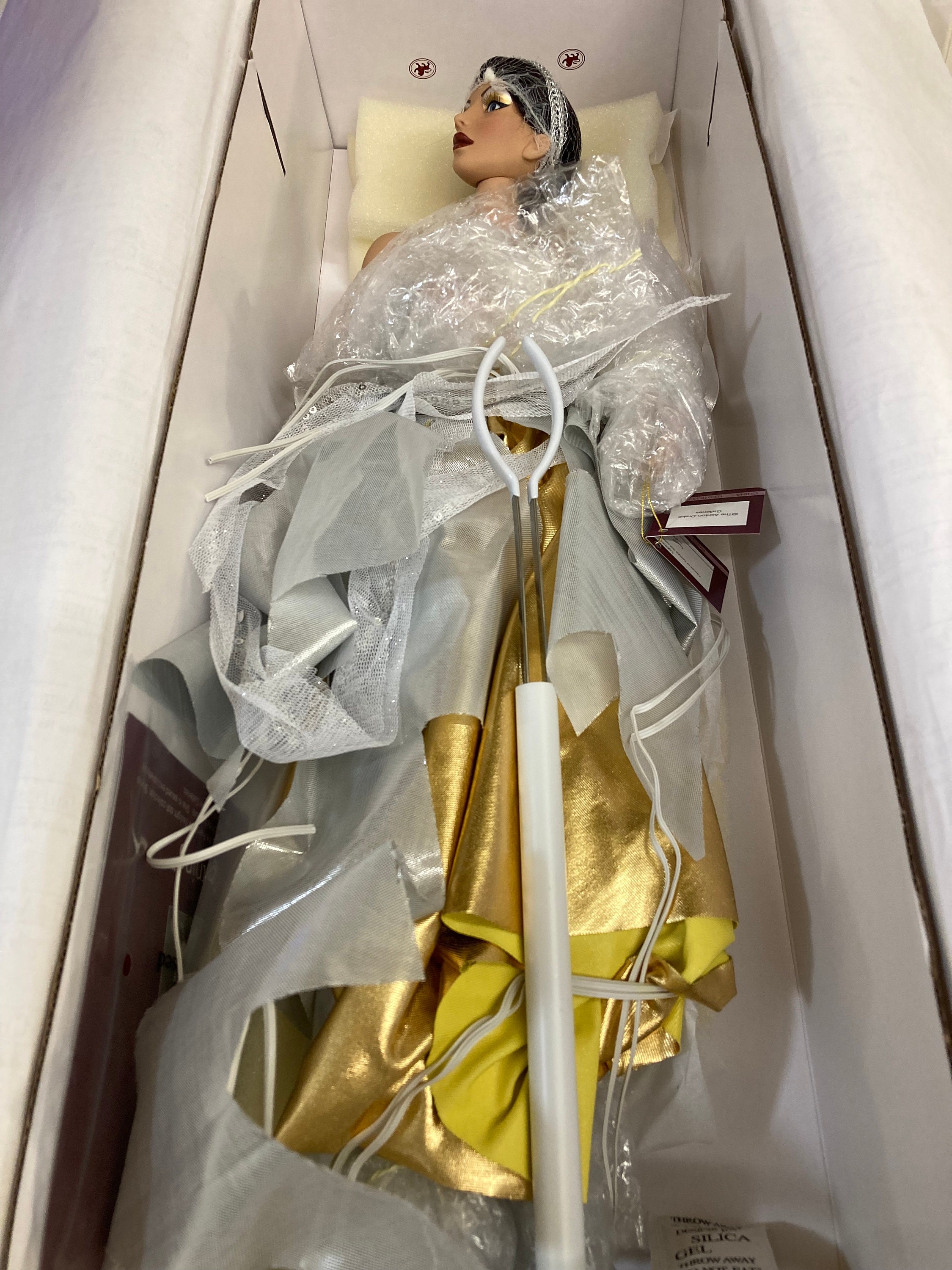 She is a Angel that has a Silver Wing Earrings, shoes, dress, and the certificate of authenticity. Because she was never taken her out