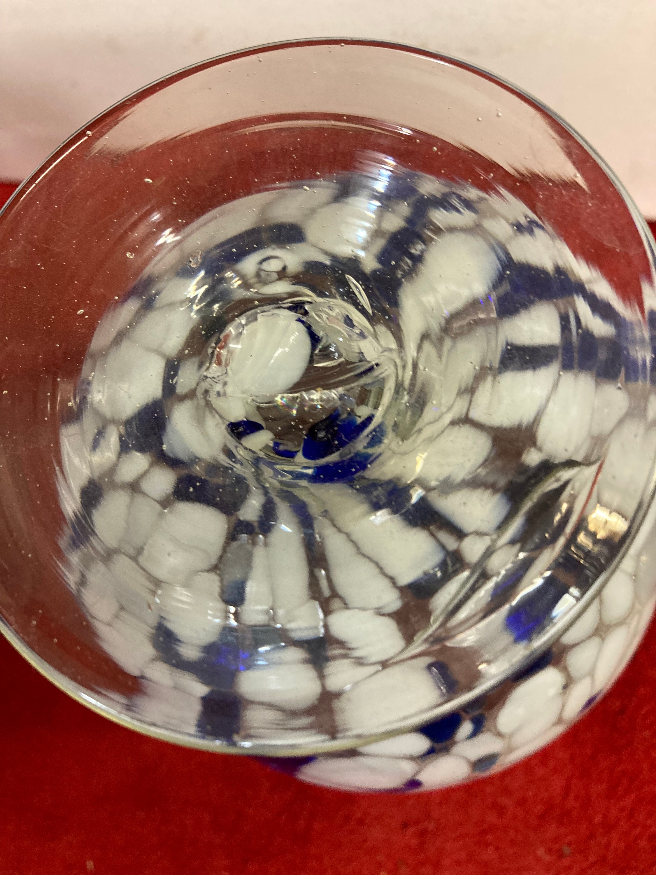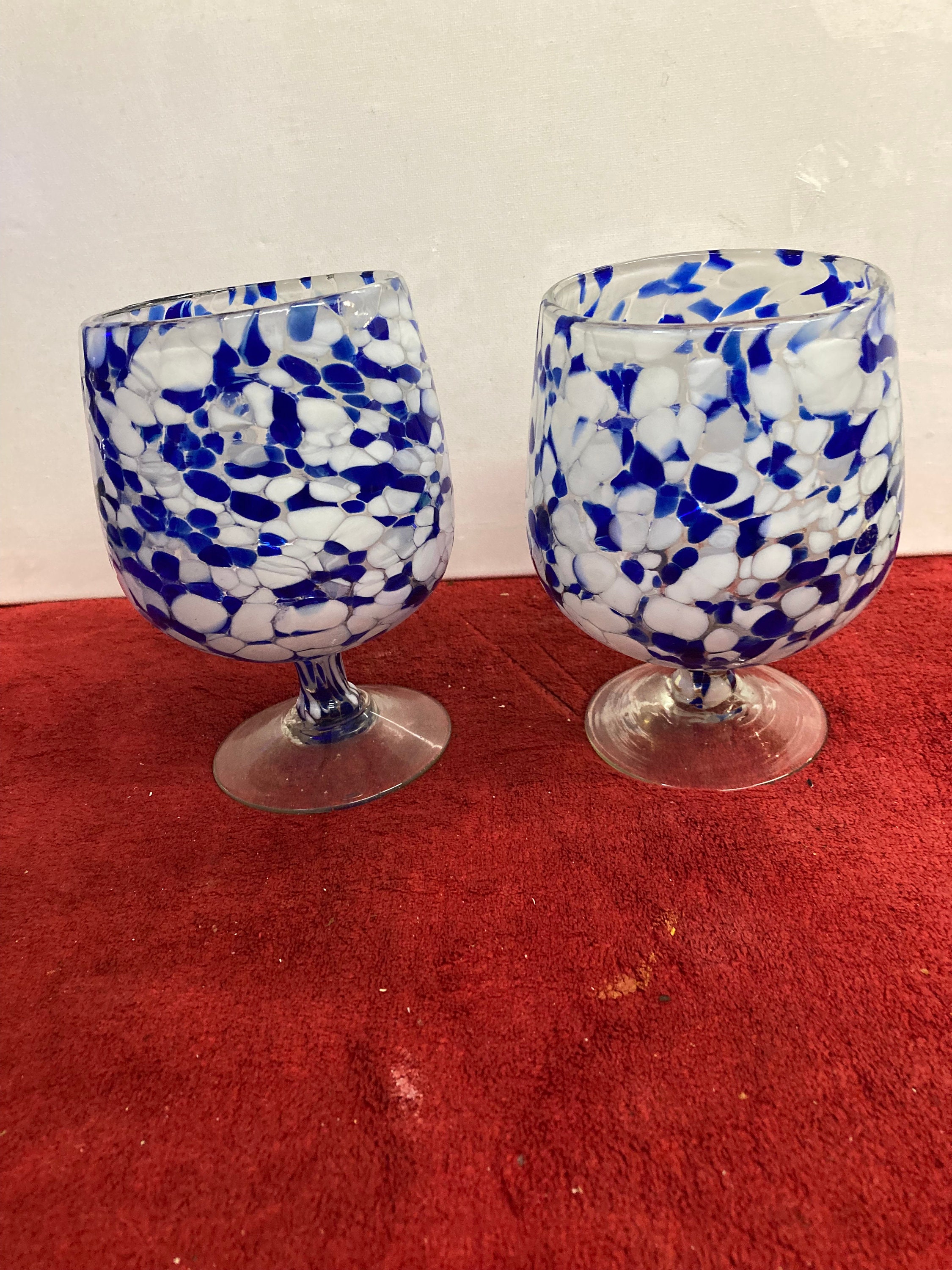 Two Hand Blown Cobalt Blue and White Confetti Goblets 6" tall x 3 3/4" at top x 4" in diameter x 3 1/4 " baseEach weight about 1 1/2 lbsExcellent Conditiopn without any damage