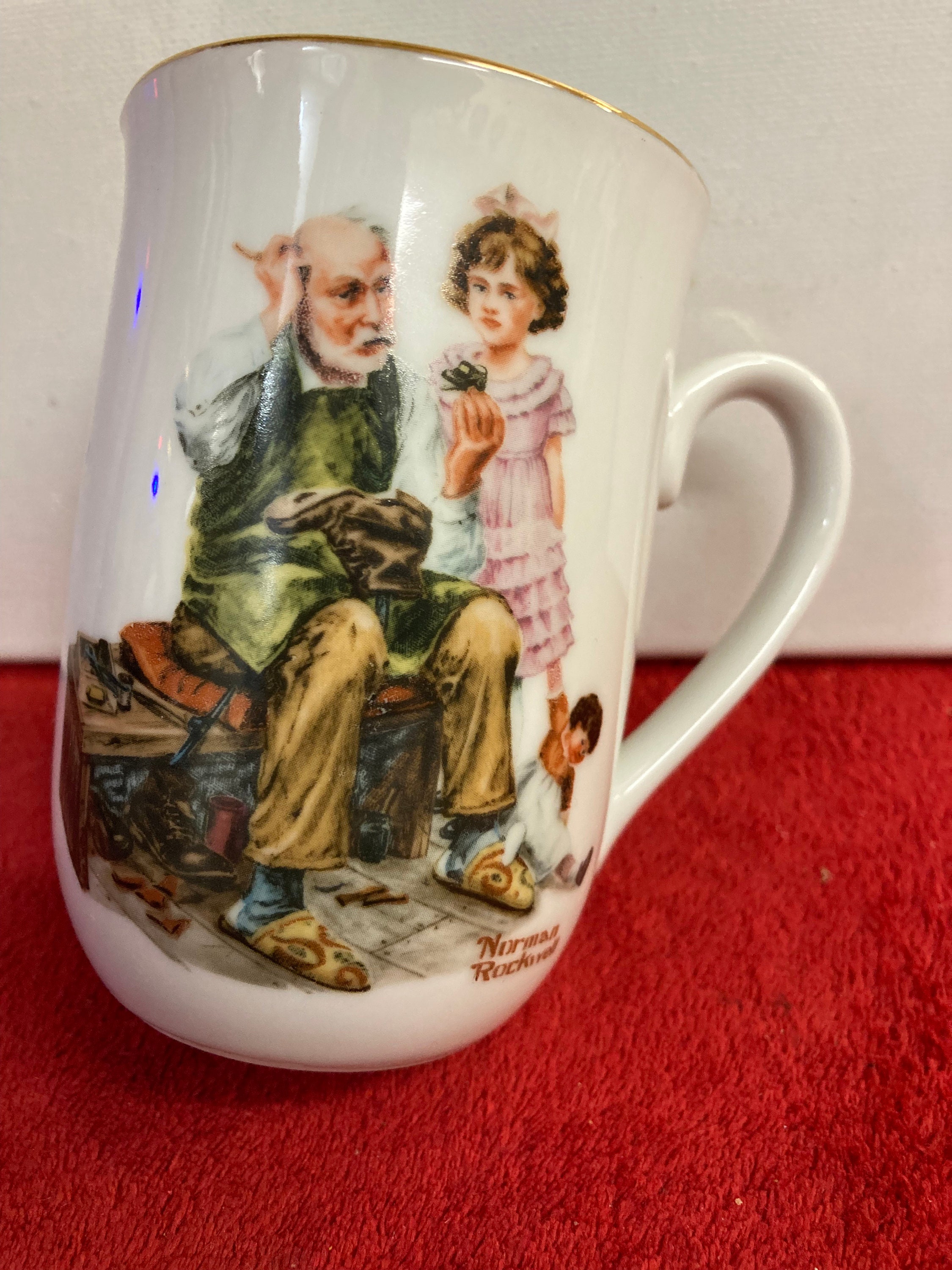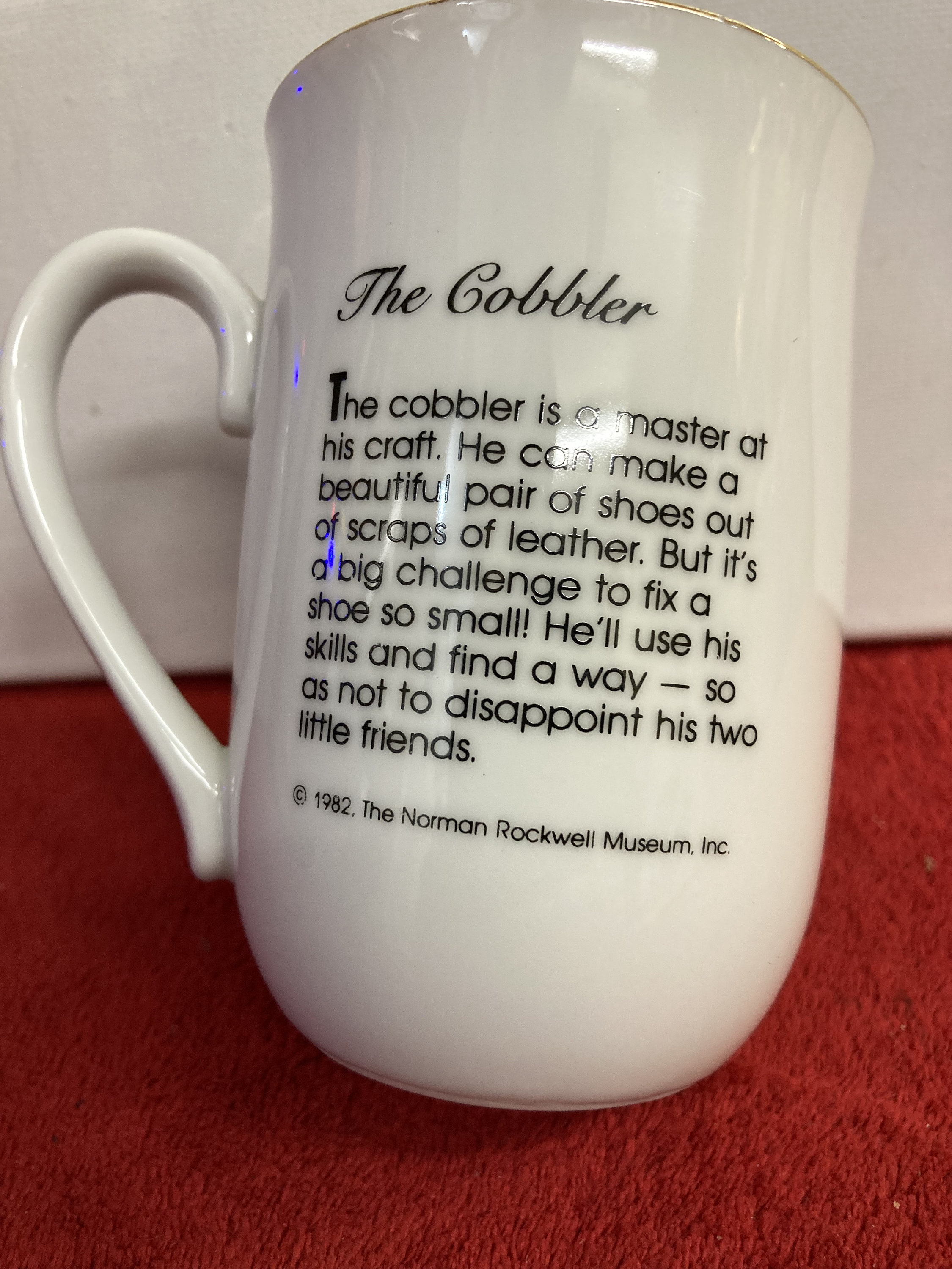 3-Norman Rockwell Museum Coffee Mug The Cobbler Tea Cup 4" Gold Trim 1982 Vintage