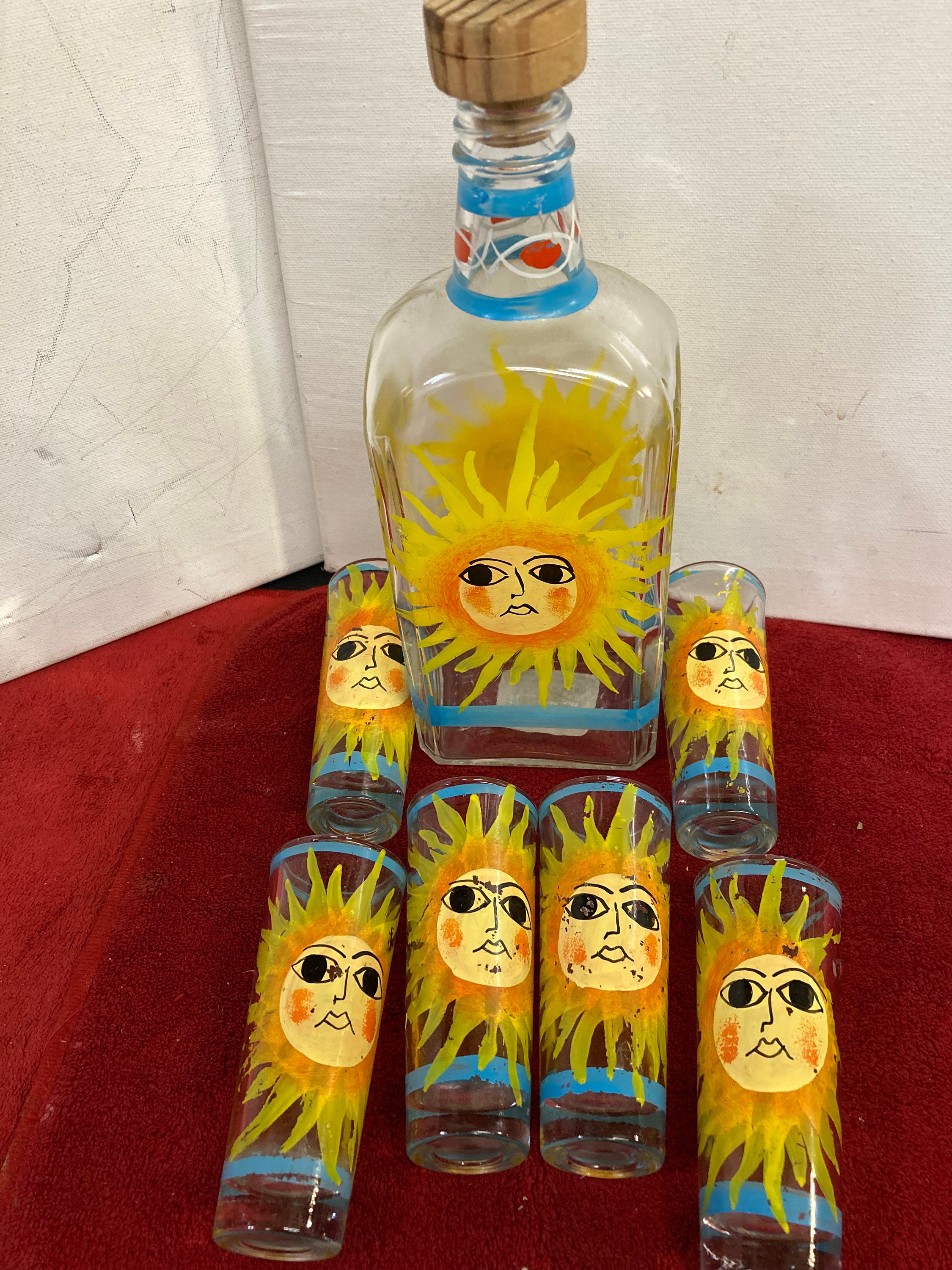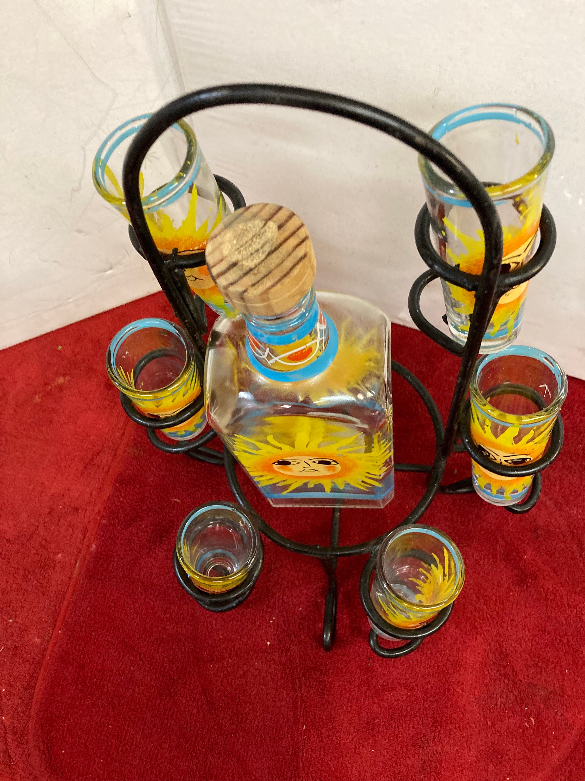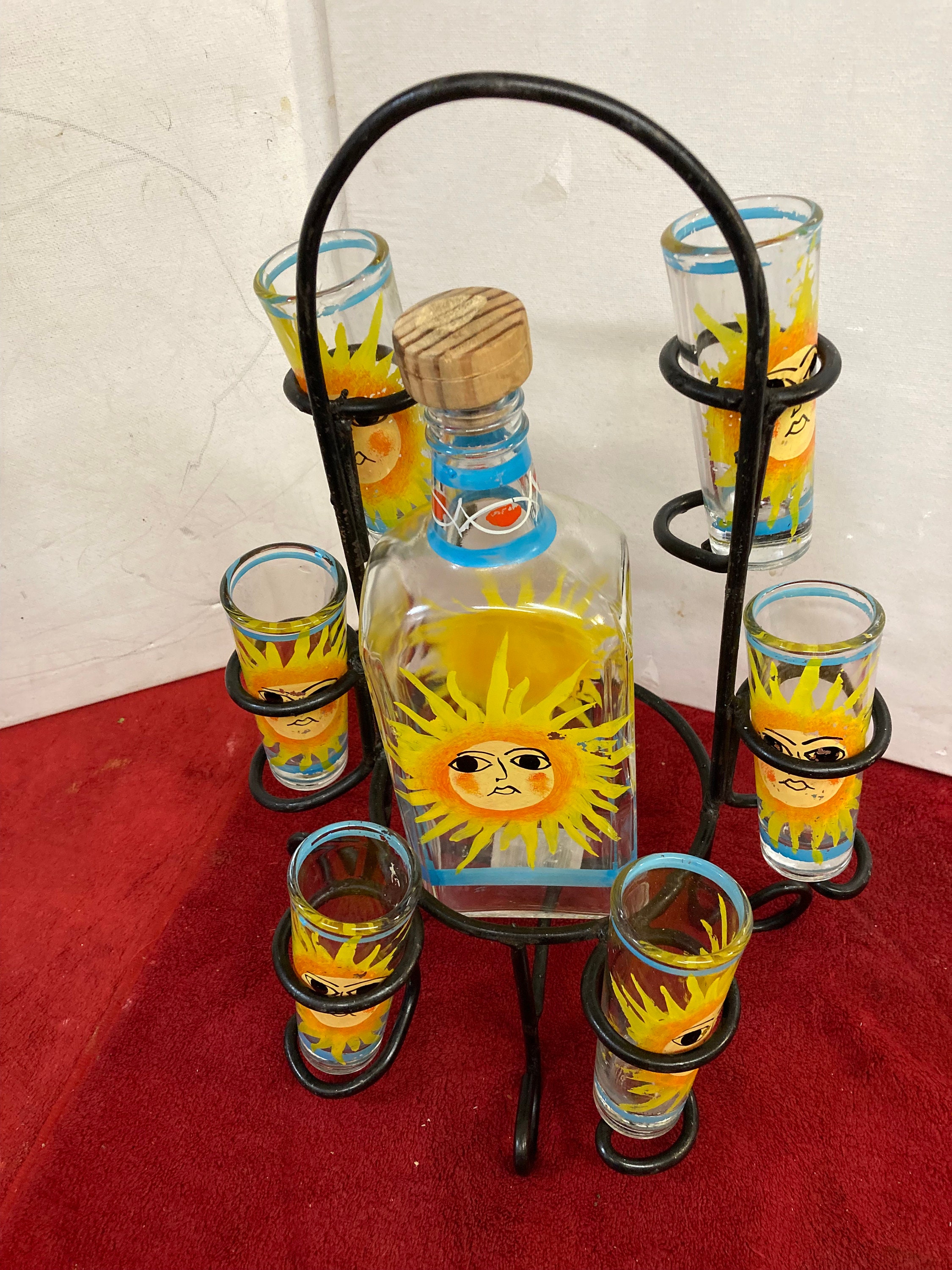 Sun and Ocean hand painted on Clear background. Liquor bottle and six glasses for limoncello, Tequila, or other liquor comes with an iron rack for display and easy carry. All of the sets of shot glasses are hand painted in the area around Tlaquepaque near Guadalajara, Mexico by individual Mexican artists, using hand made paint brushes and techniques perfected over generations.