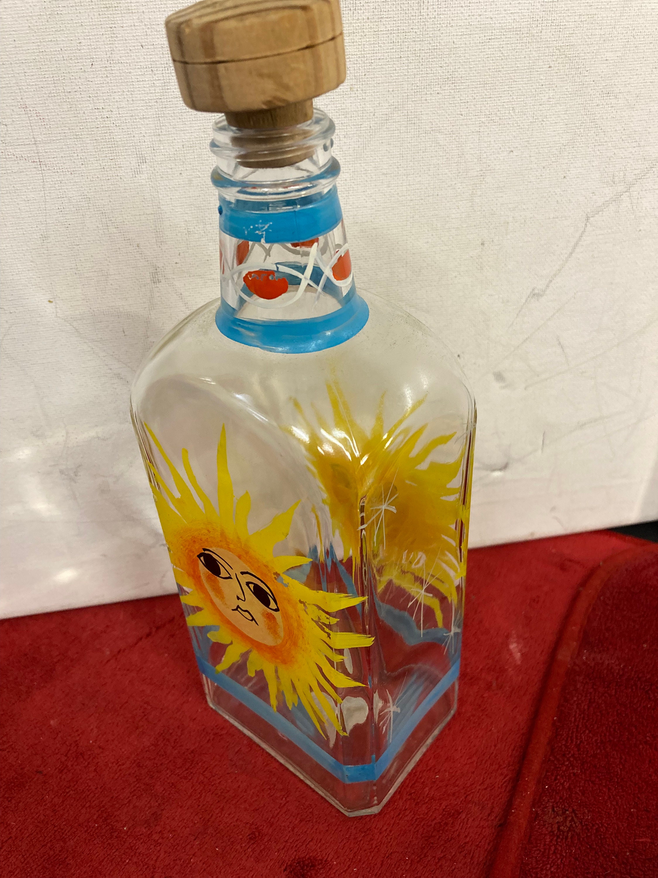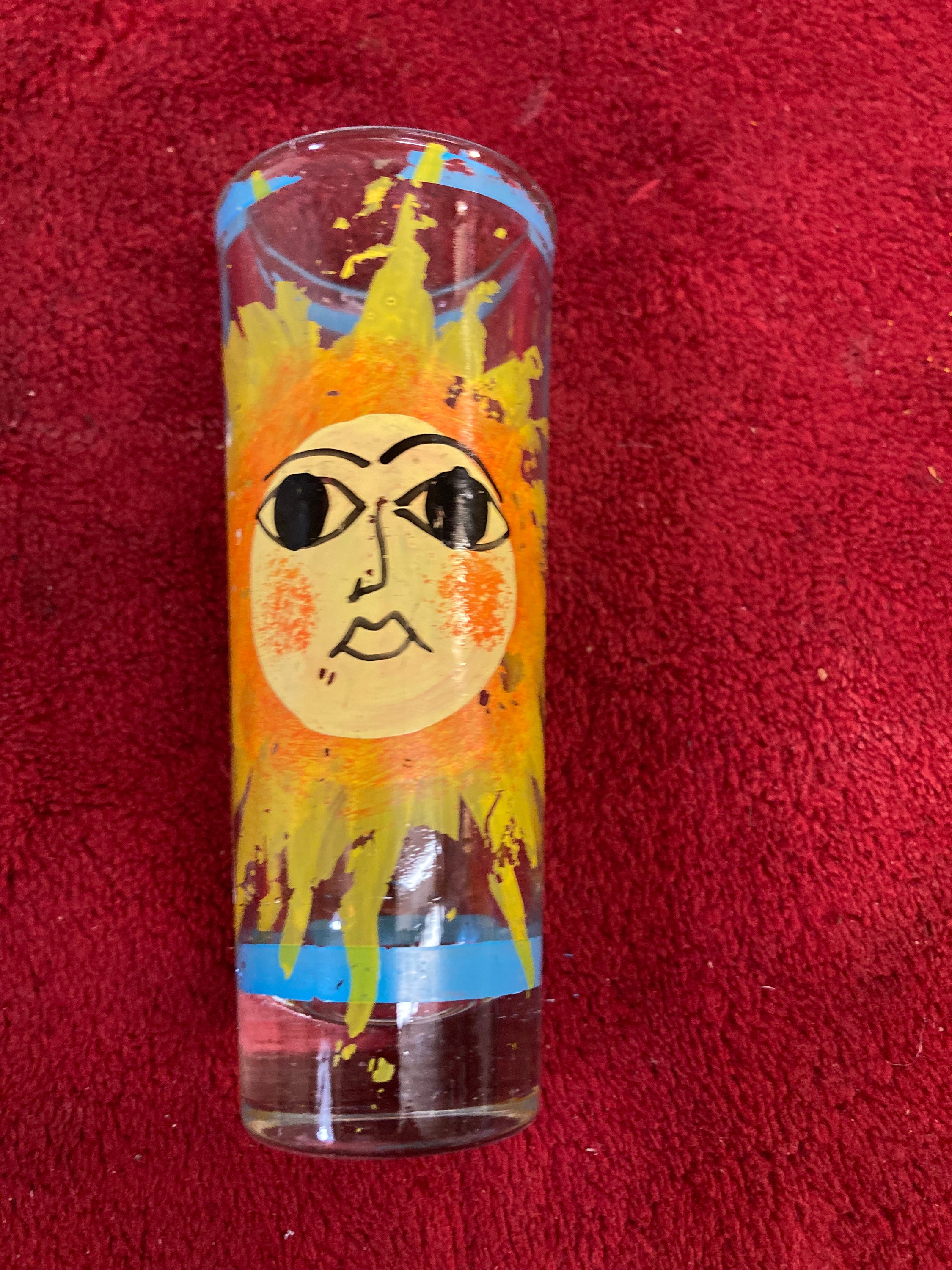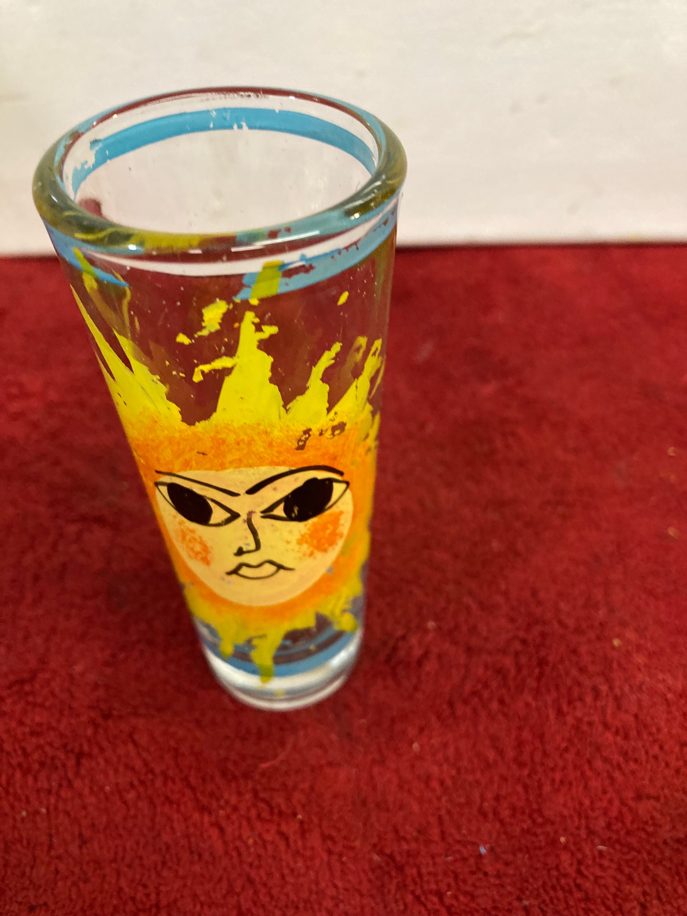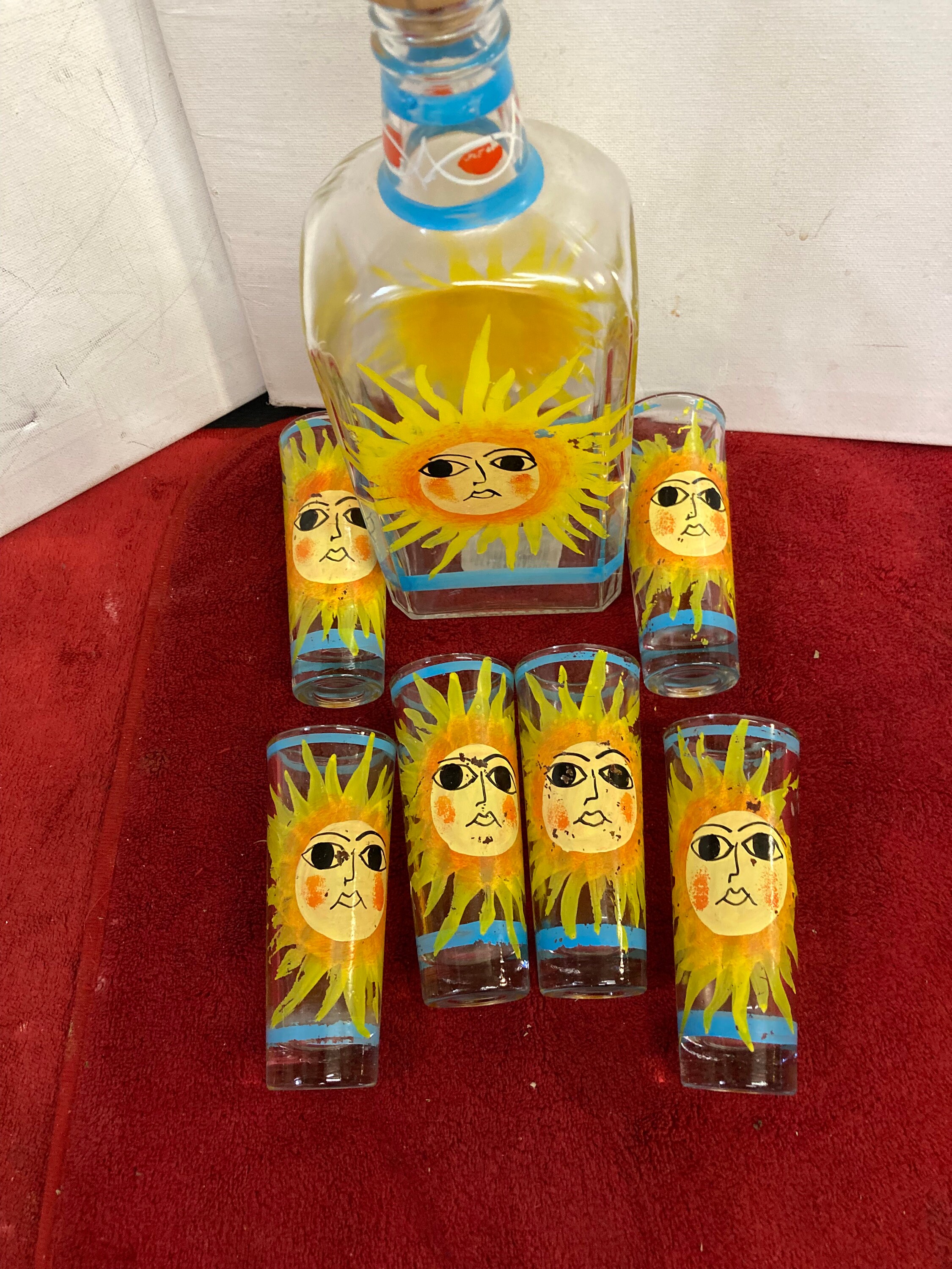 Sun and Ocean hand painted on Clear background. Liquor bottle and six glasses for limoncello, Tequila, or other liquor comes with an iron rack for display and easy carry. All of the sets of shot glasses are hand painted in the area around Tlaquepaque near Guadalajara, Mexico by individual Mexican artists, using hand made paint brushes and techniques perfected over generations.