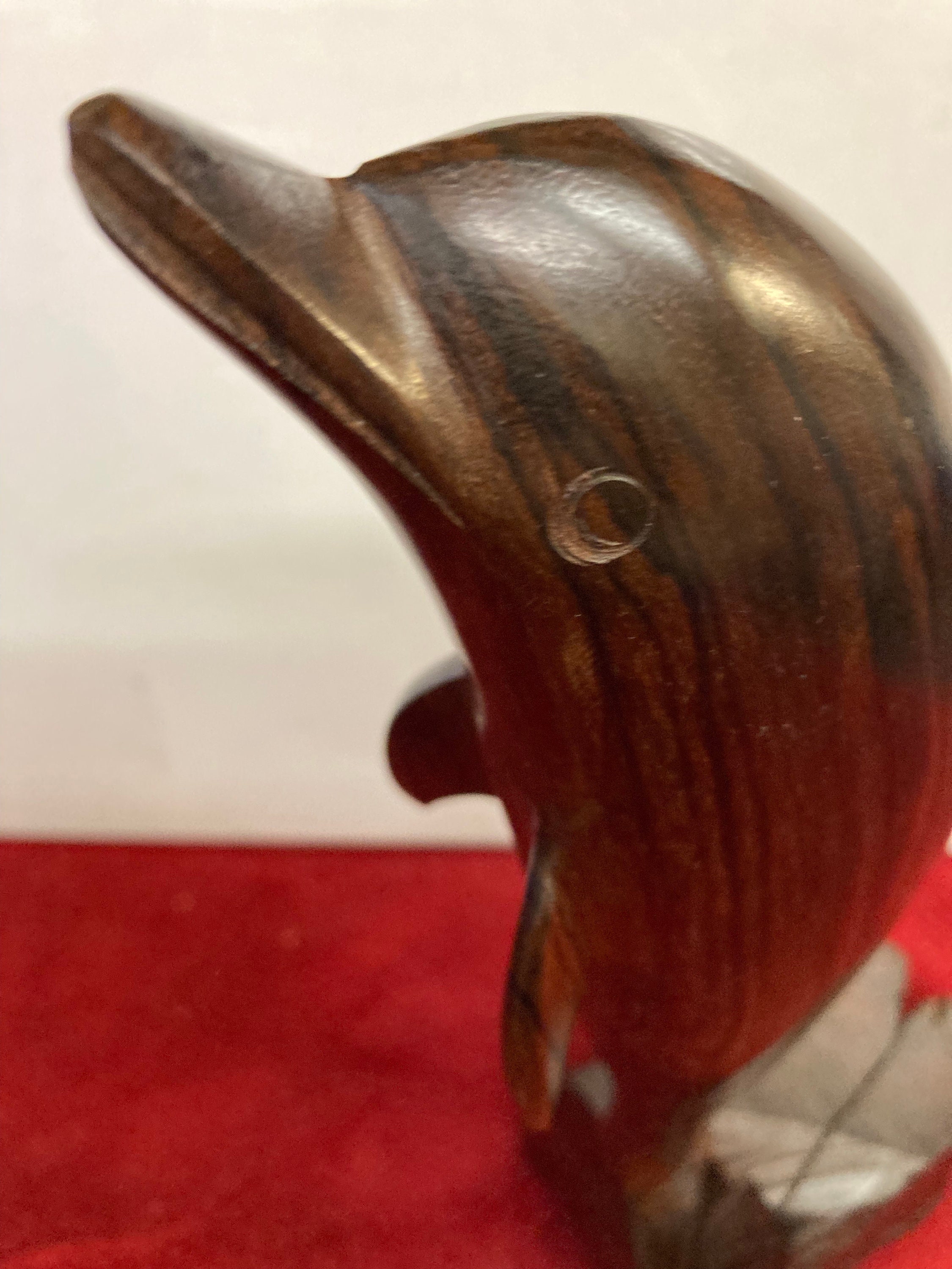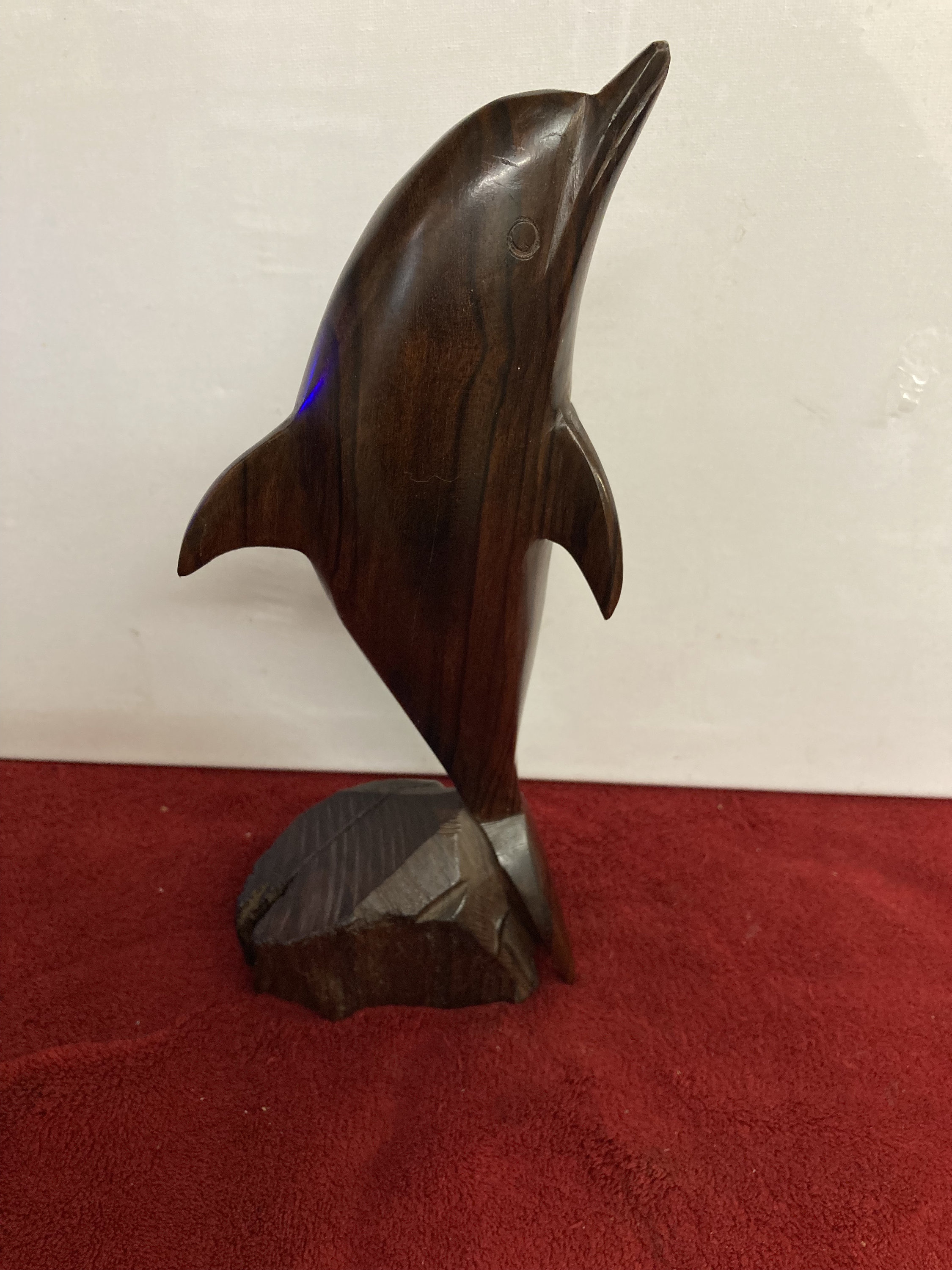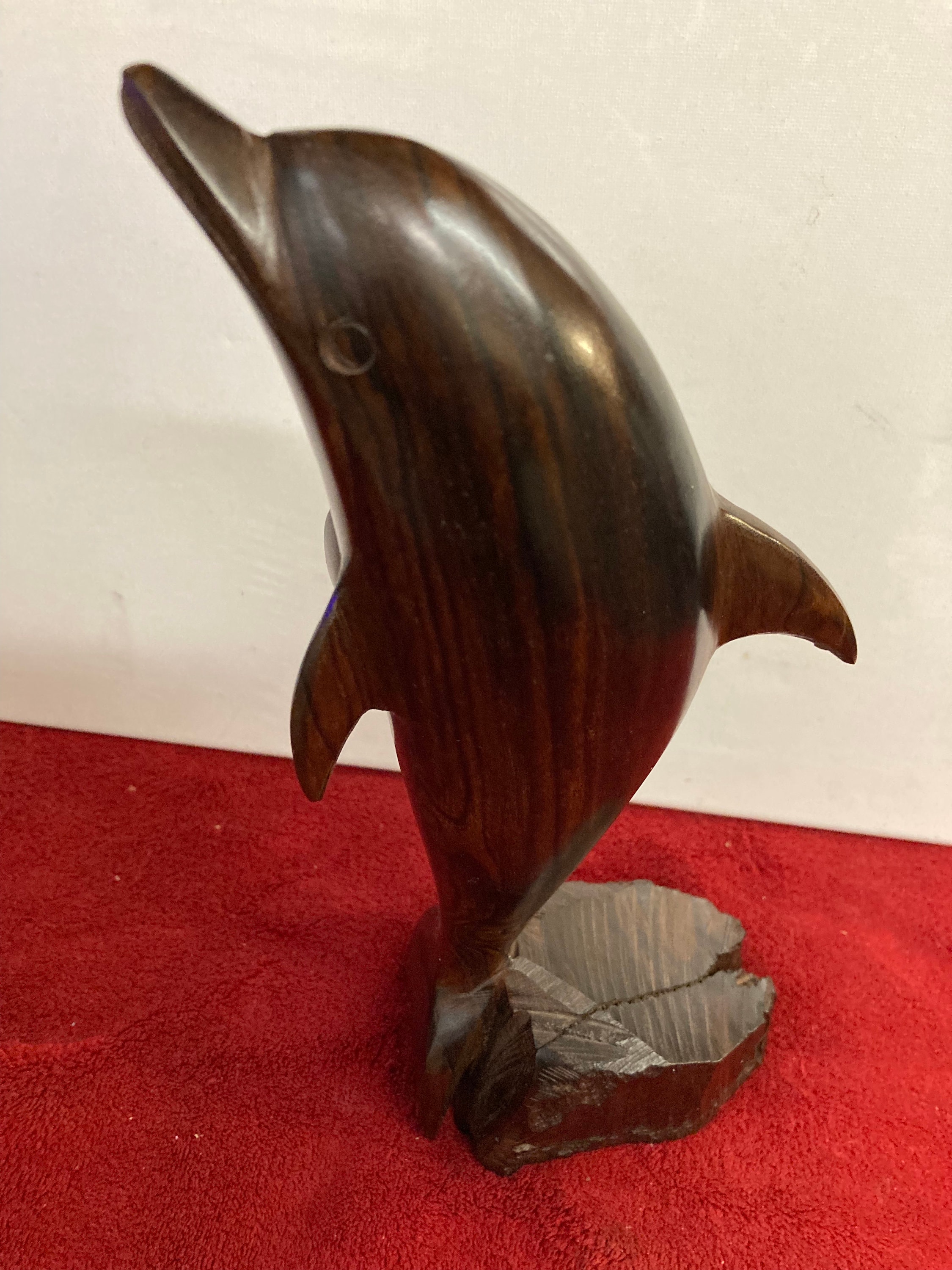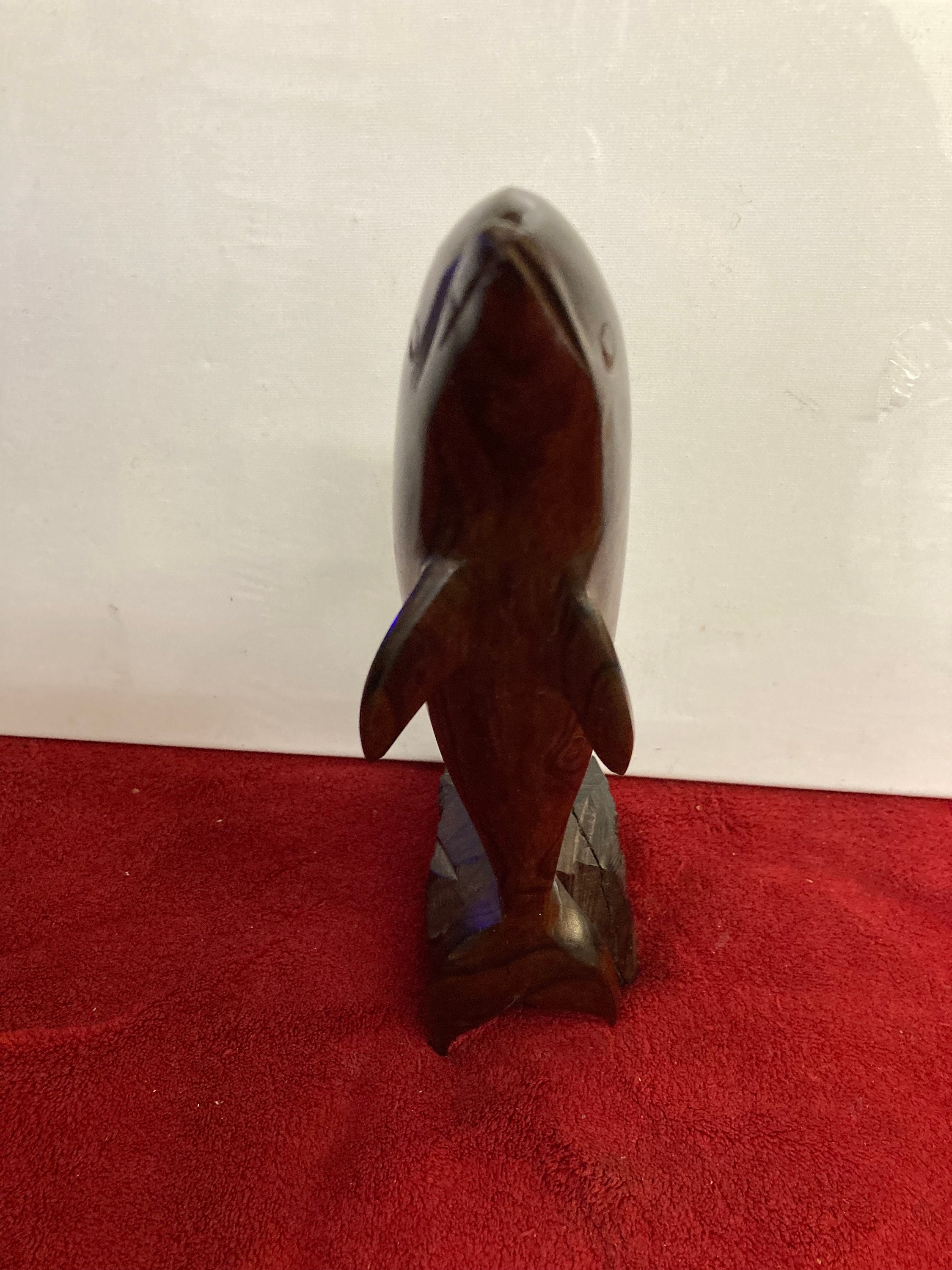 This is a sleek and graceful hand carved wooden dolphin figure.