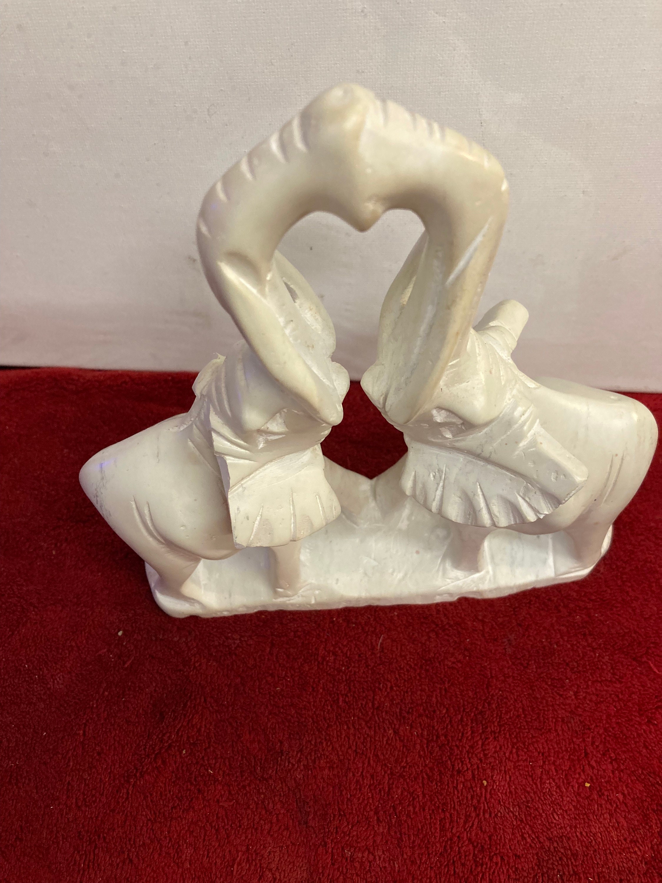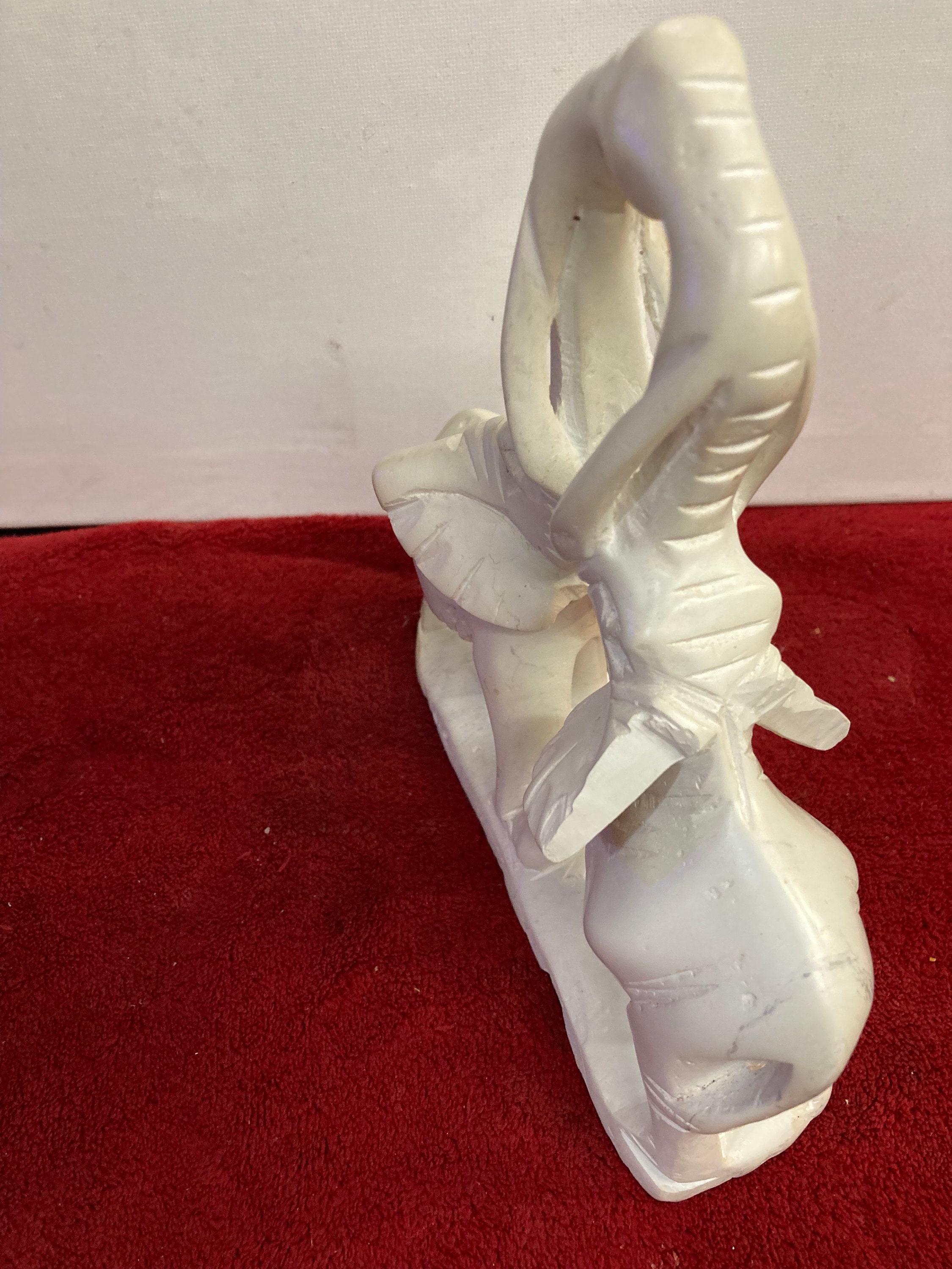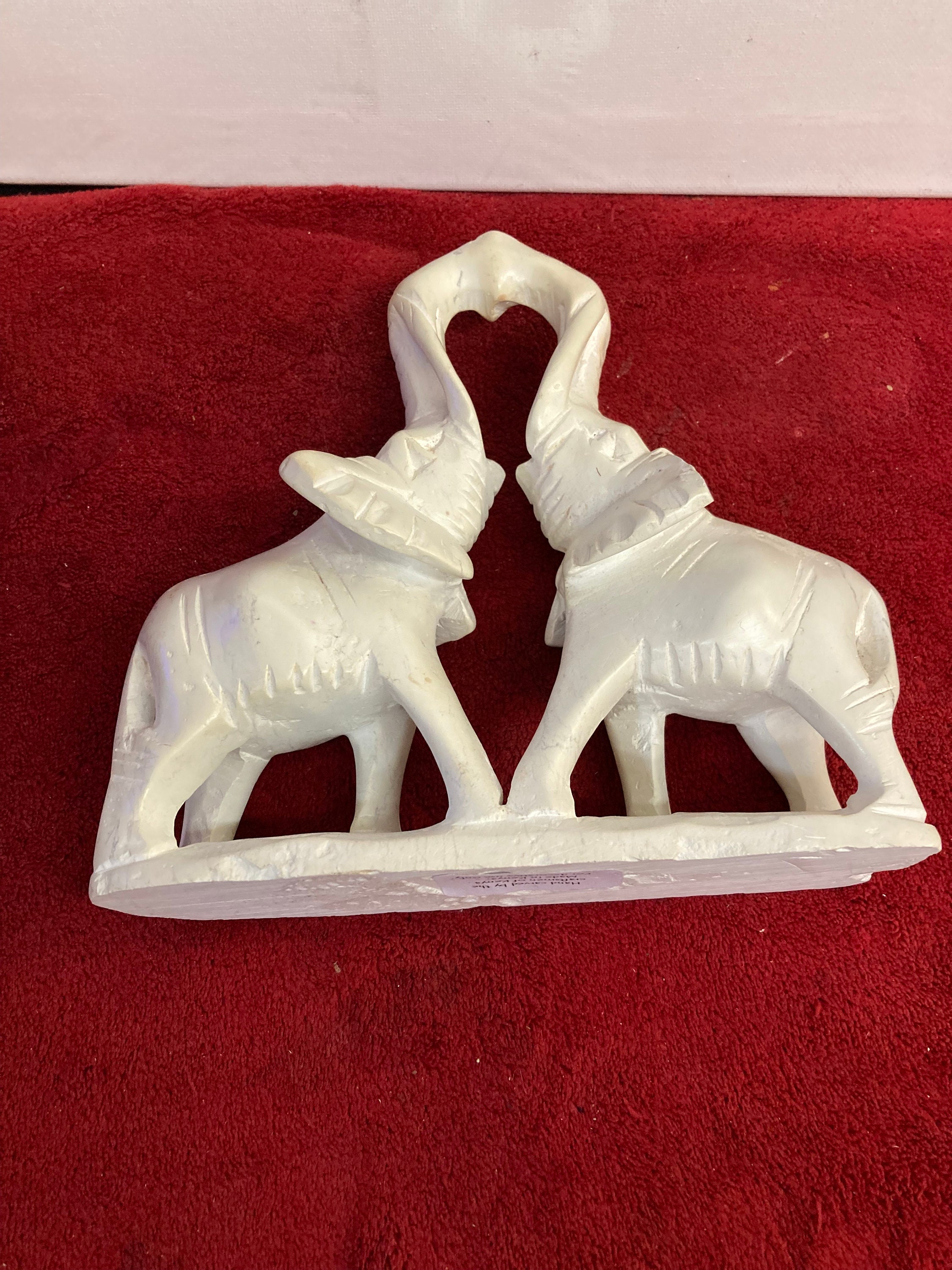 This kissing elephants figurine was brought to life by artisans in Kenya, using only basic hand tools. To begin, Kisii stone is found in local quarries, cut to size, carefully hand-shaped into these kissing elephants, then polished to a smooth finish. Due to the handcrafted nature of this piece, no two will be exactly alike. Each figurine is7 1/4 inches tall, 6 1/2 inches wide and 2 inches deep Weight is 2 and 5/8 lbs. Handcrafted for Uno Alla Volta from the hearts and hands of the artisans.