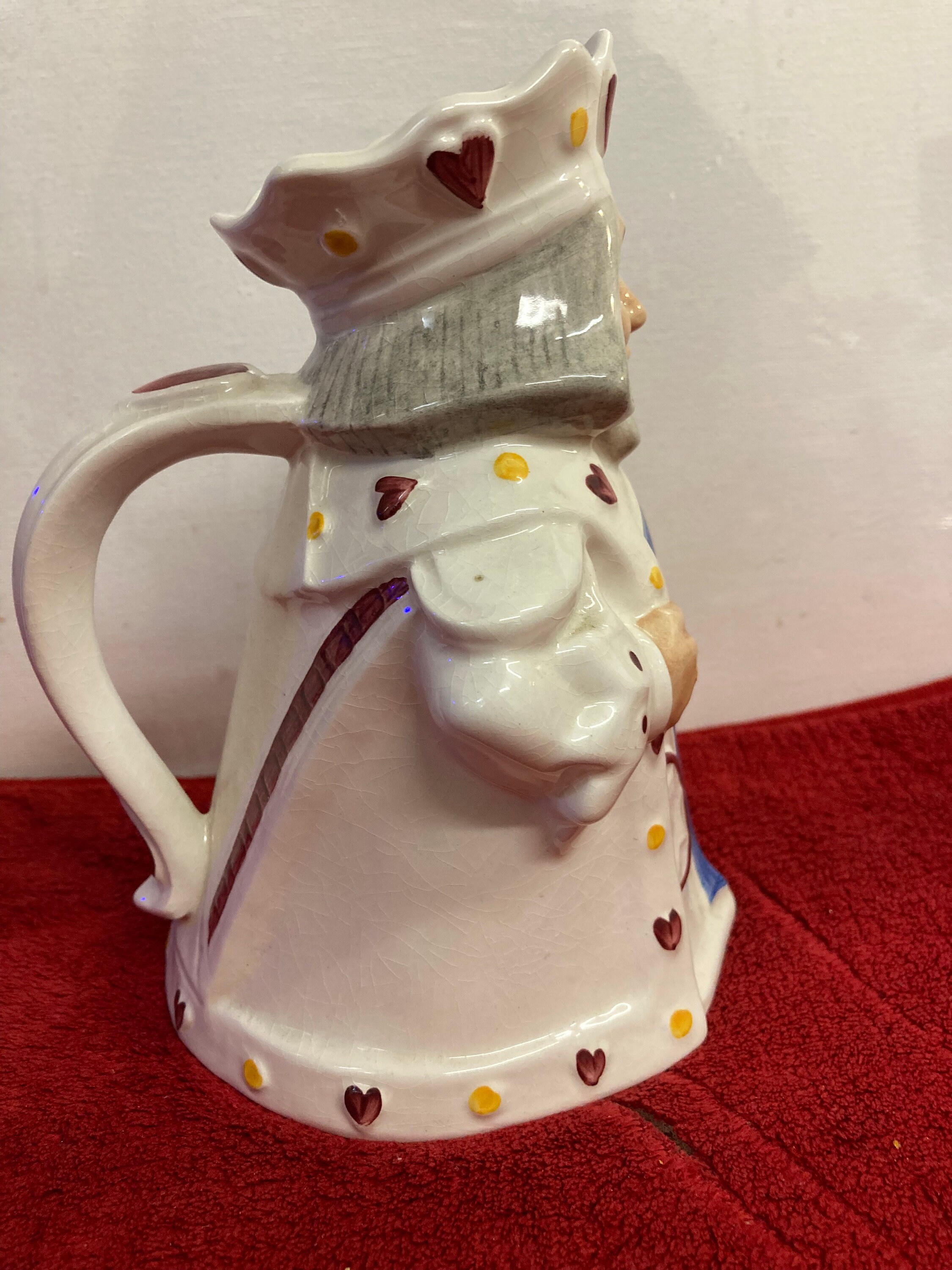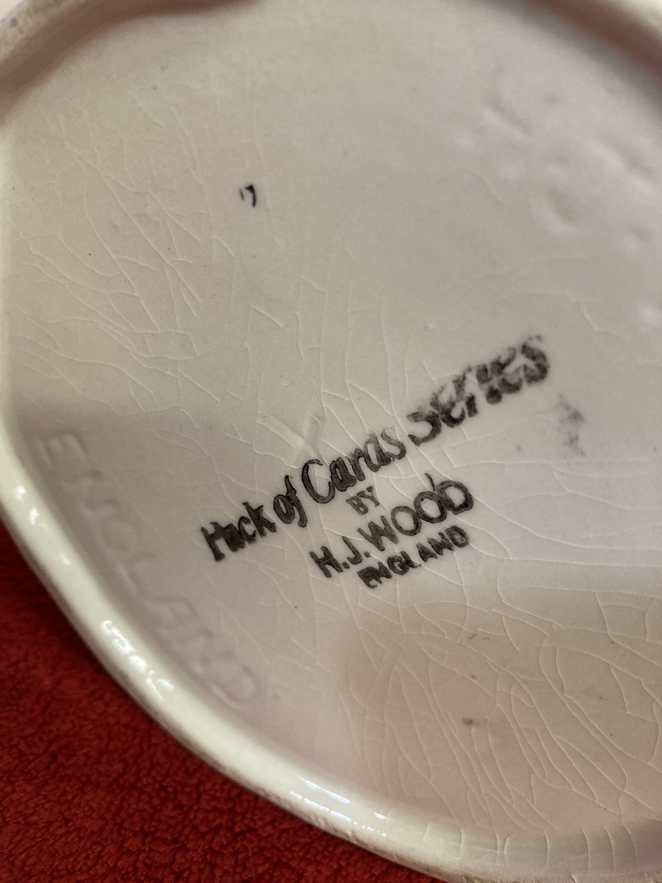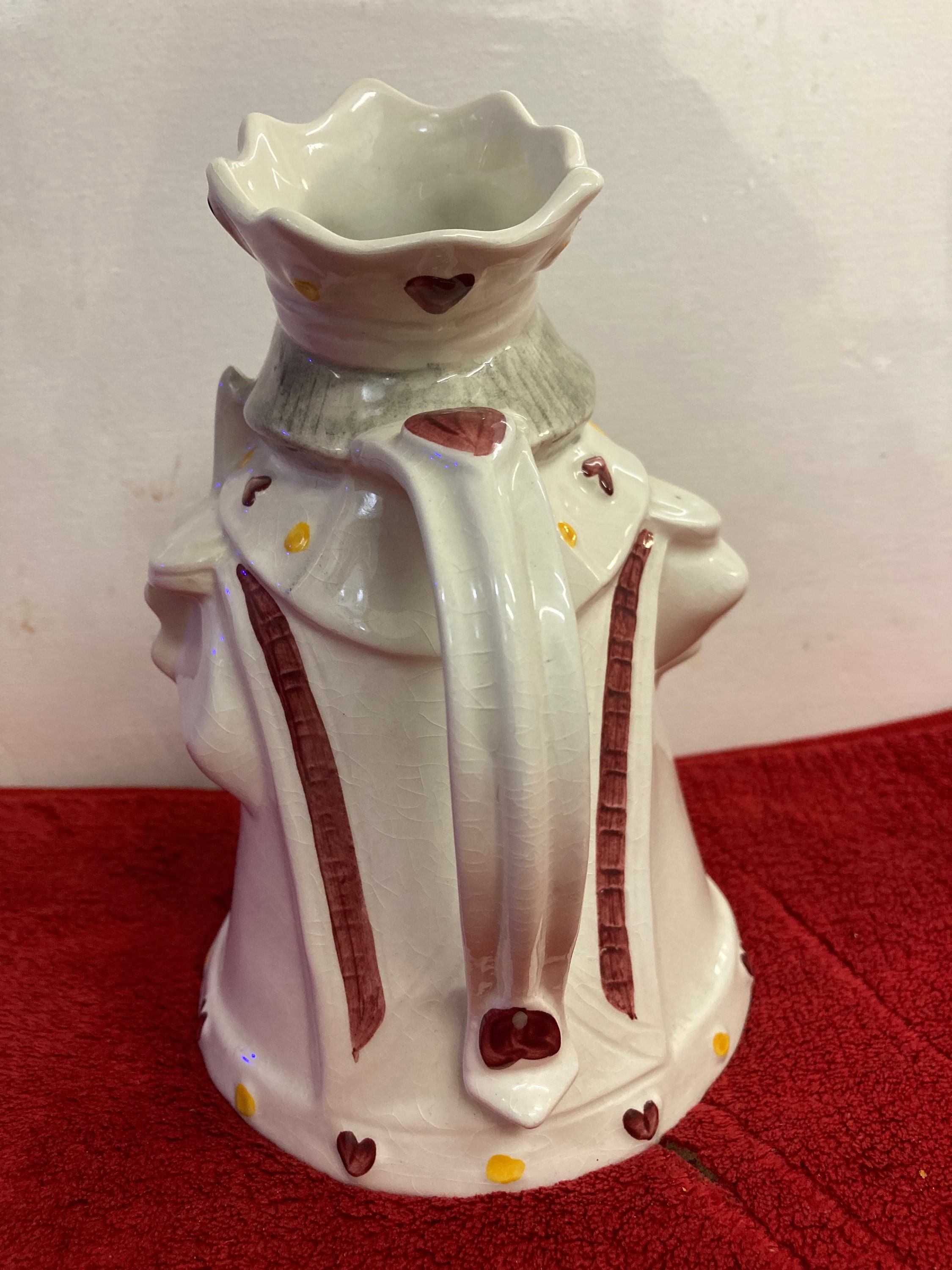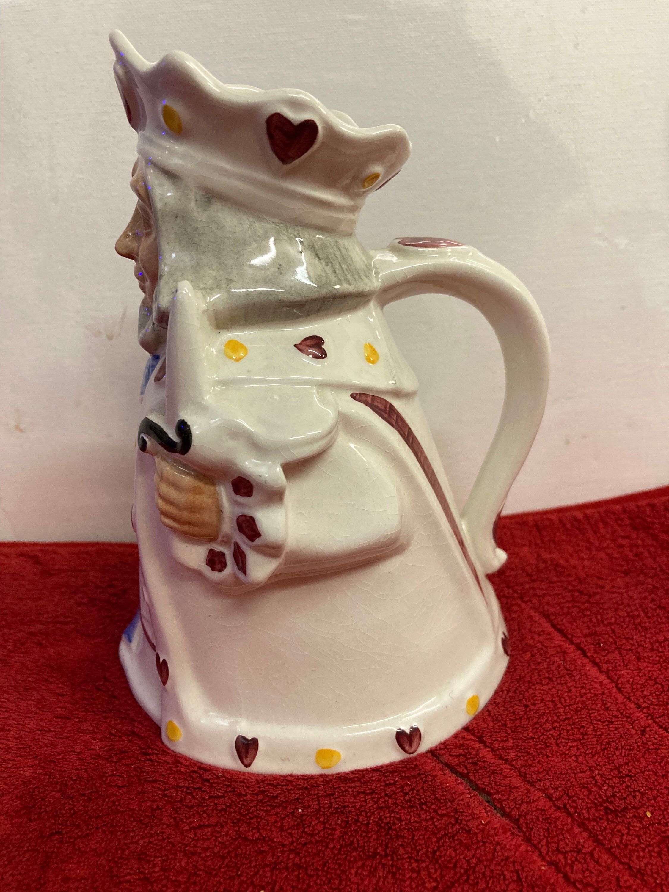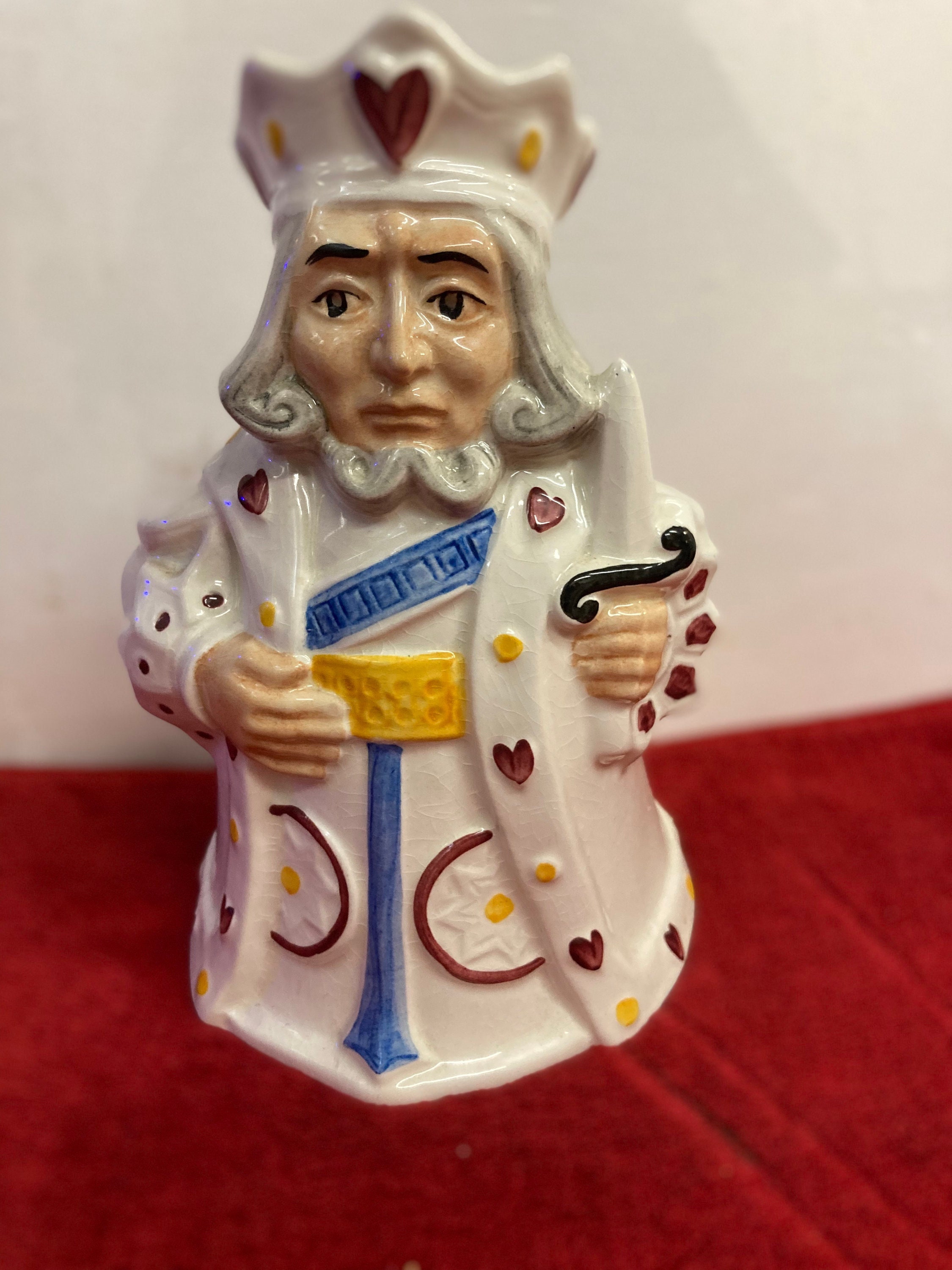 This is a VINTAGE H.J. WOOD (Burslem, Stoke-on-Trent, England) KING OF HEARTS CHARACTER JUGS, part of the PACK OF CARDS SERIES. Made of glazed ceramic (earthenware), each is APPROXIMATELY 7.0” HIGH.