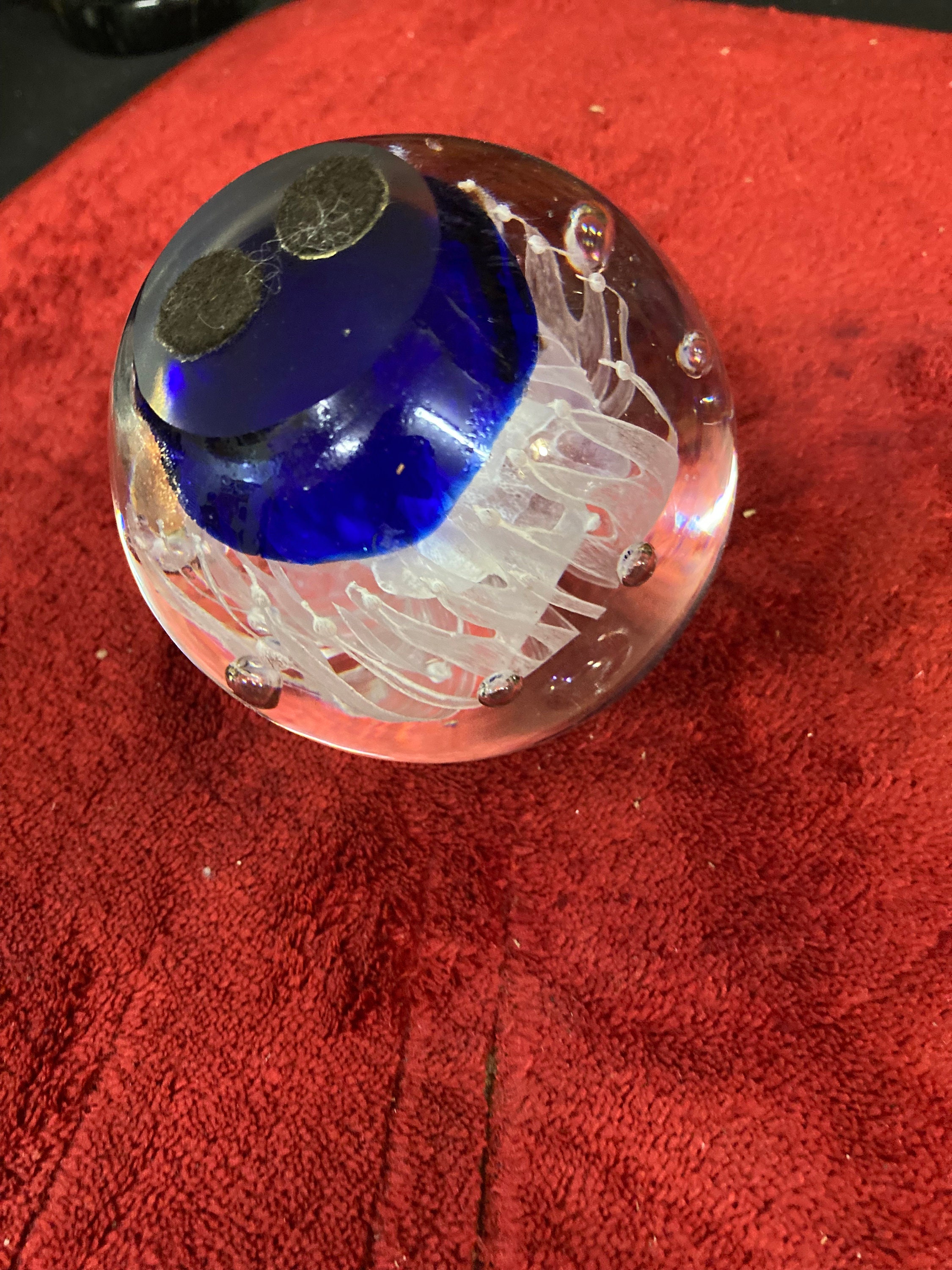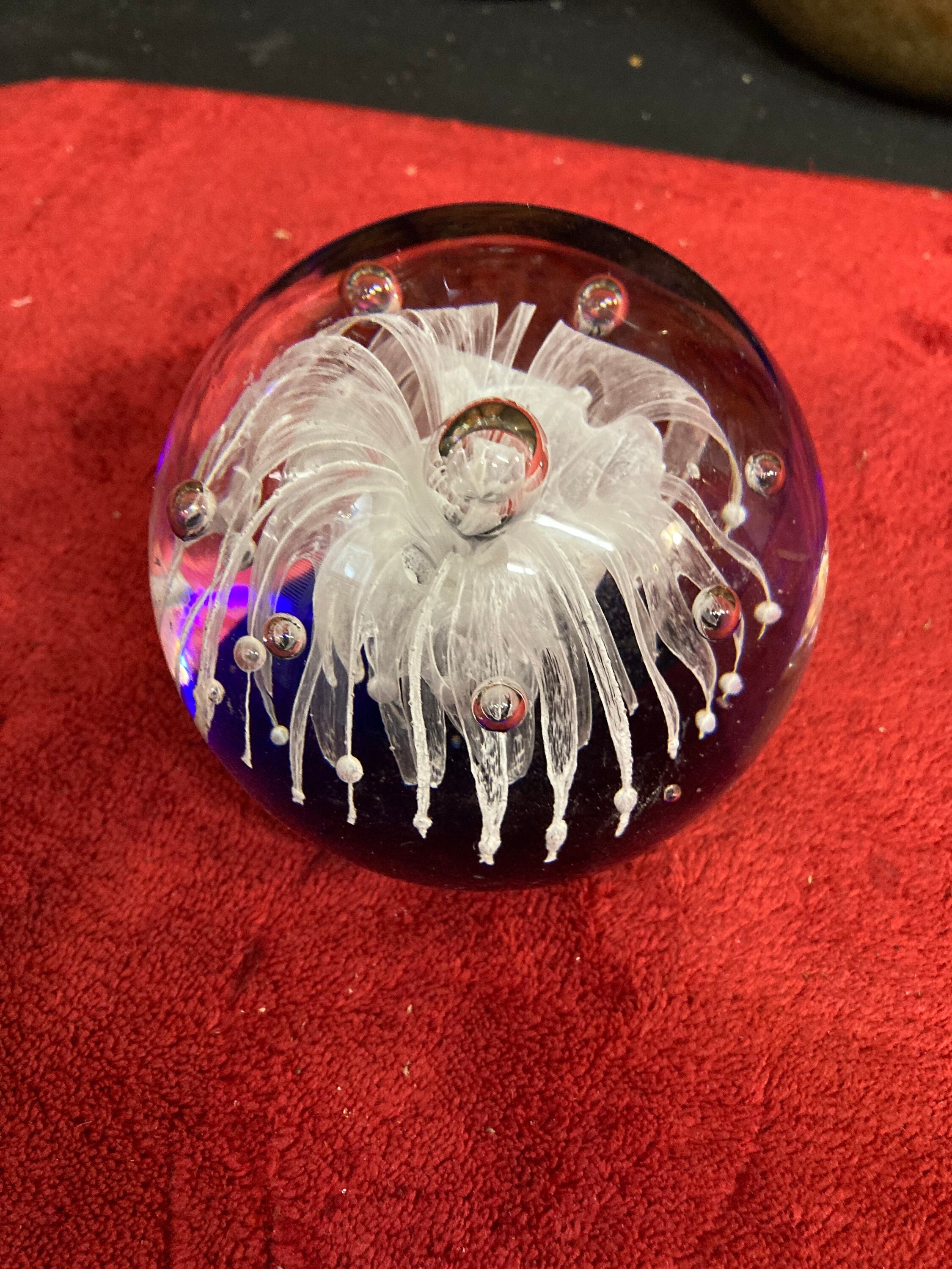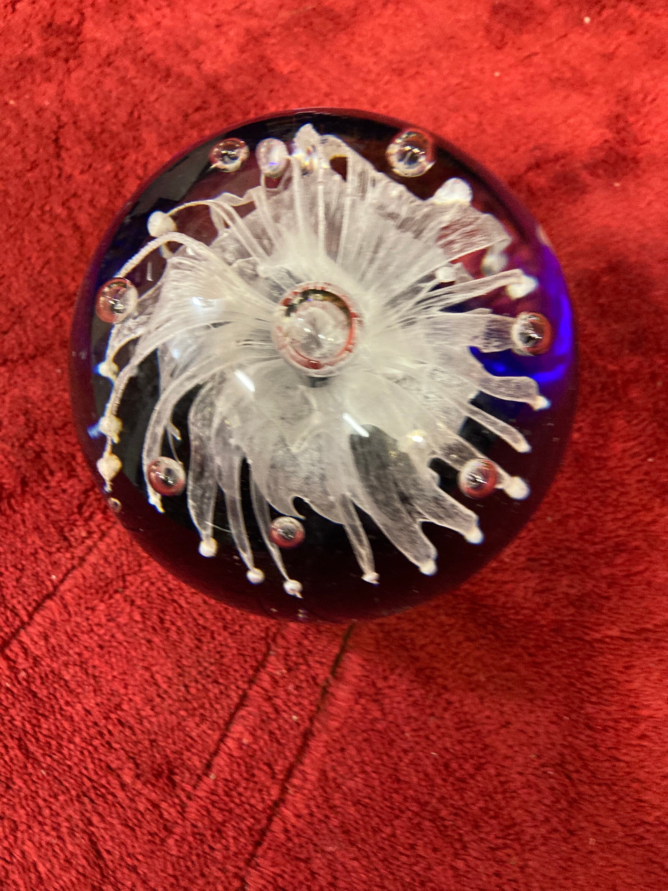 COBALT BLUE White Single Flower Sphere Glass Paperweight