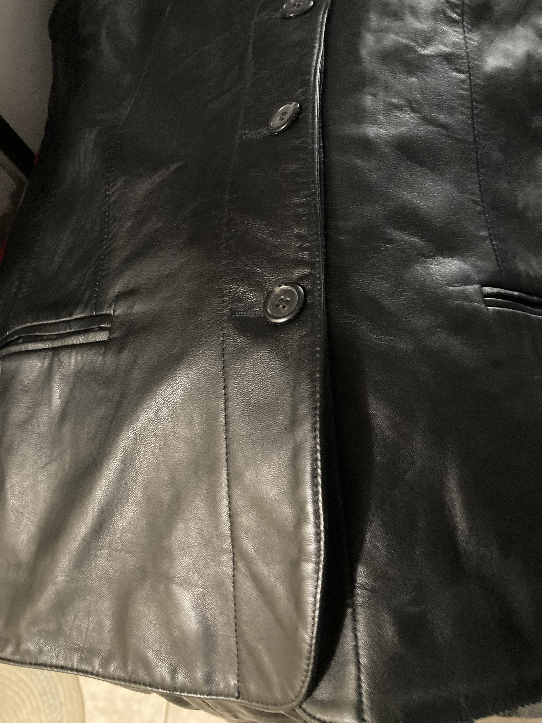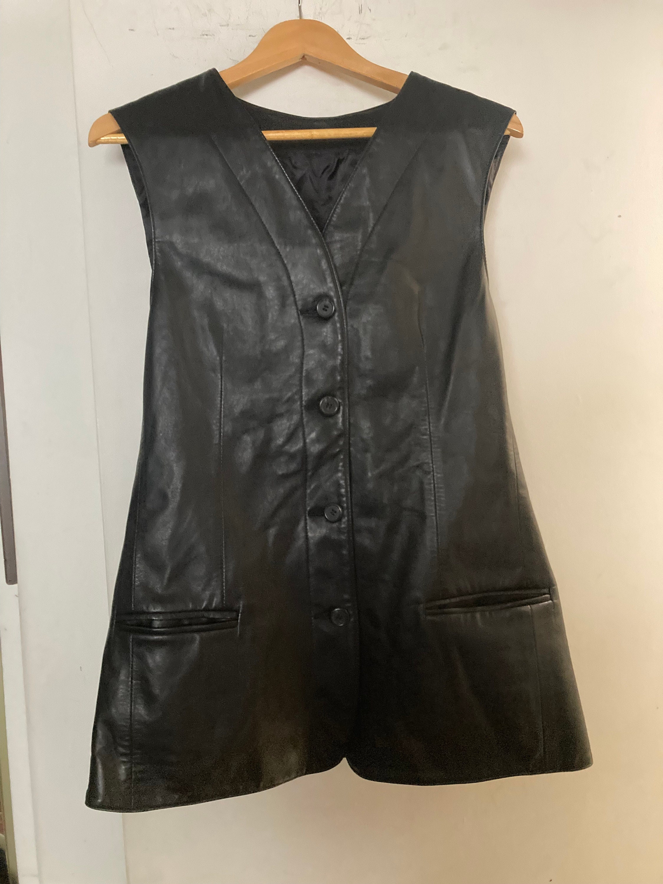 3/4 Lenght Ladies Leather Vest28" long ,2 pockets front, 4 Bottons Nicely made of soft Lamb LeatherSatin LiningNo Label or size Looks like size M or 8 Ladies Size