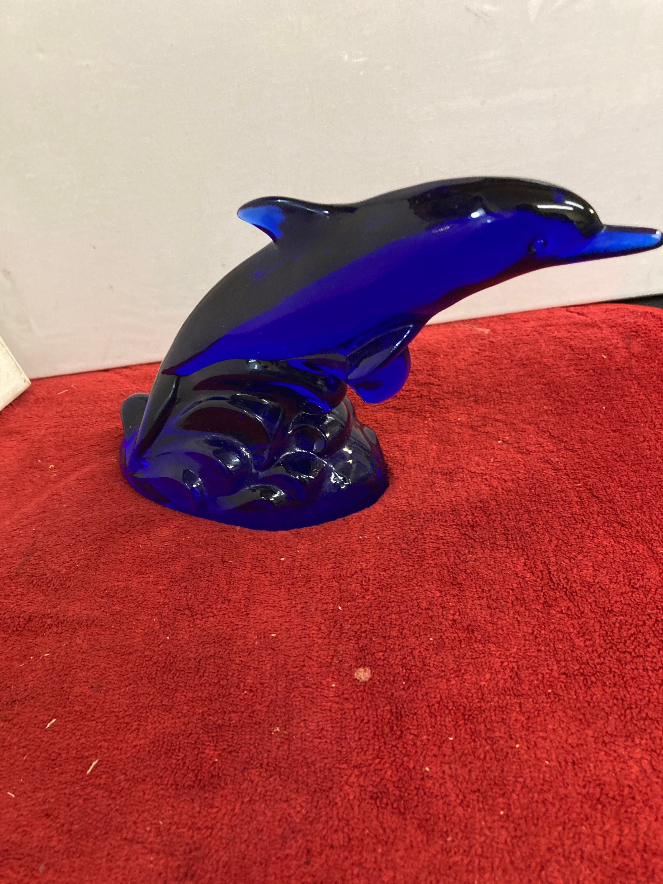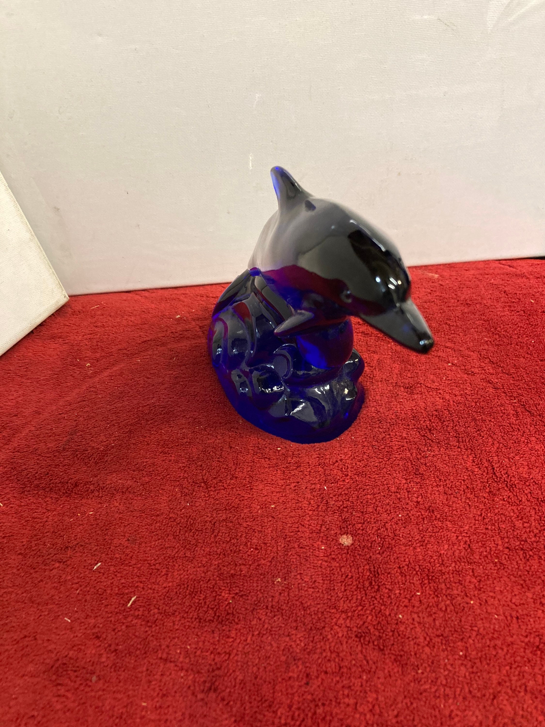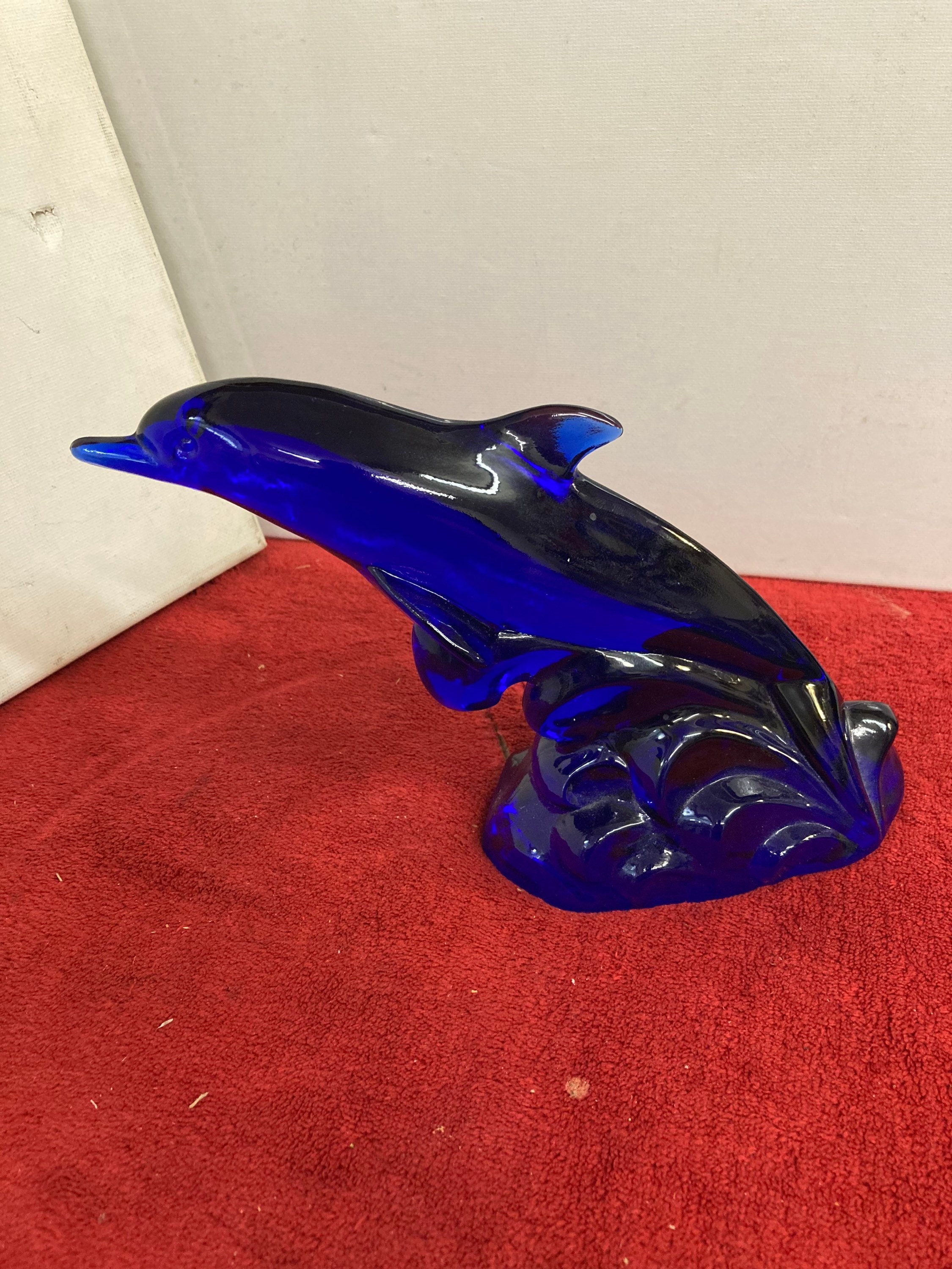 Features a dolphin cresting a wave cast in heavy (2 lbs.) Cobalt Blue glass