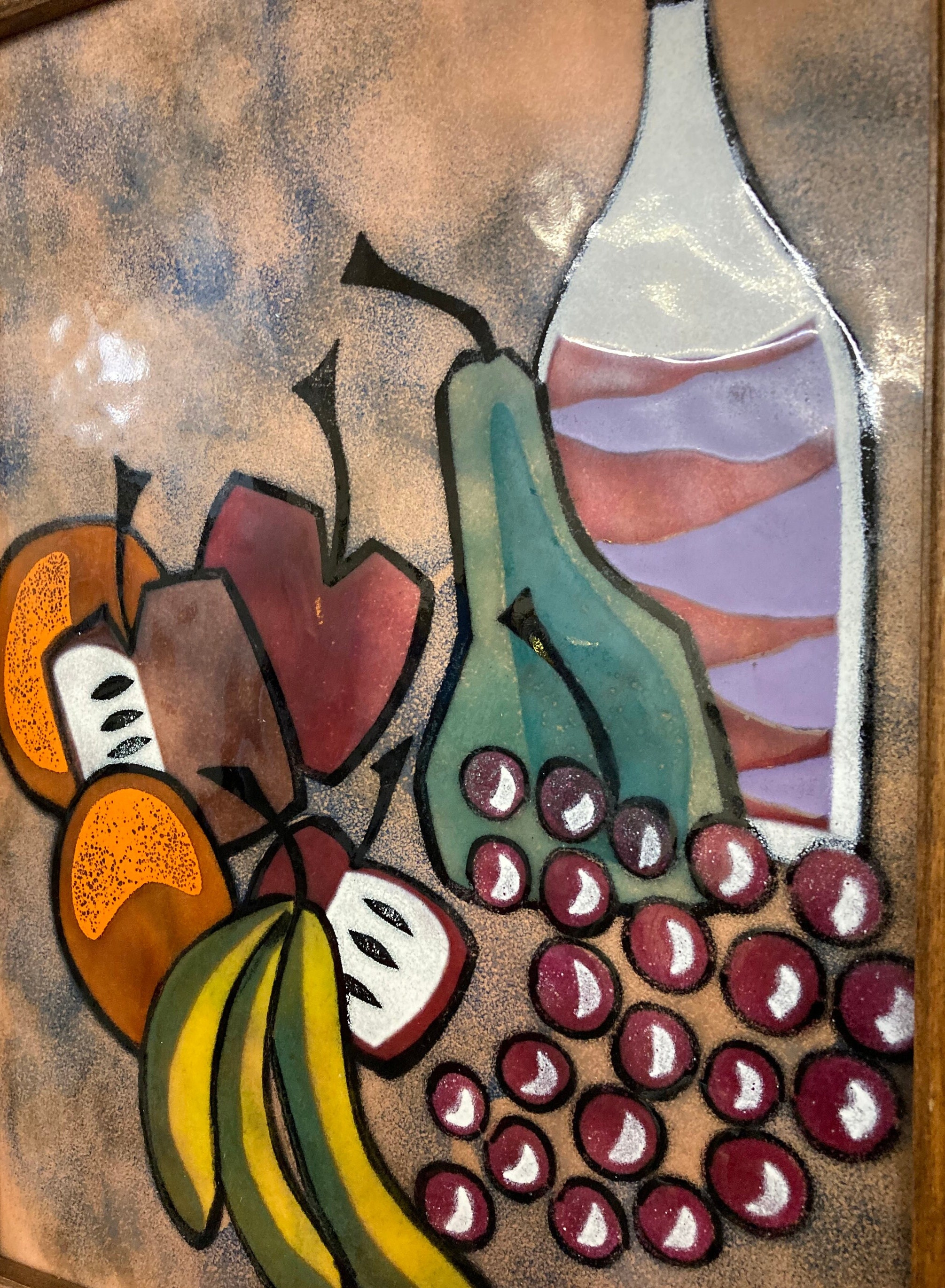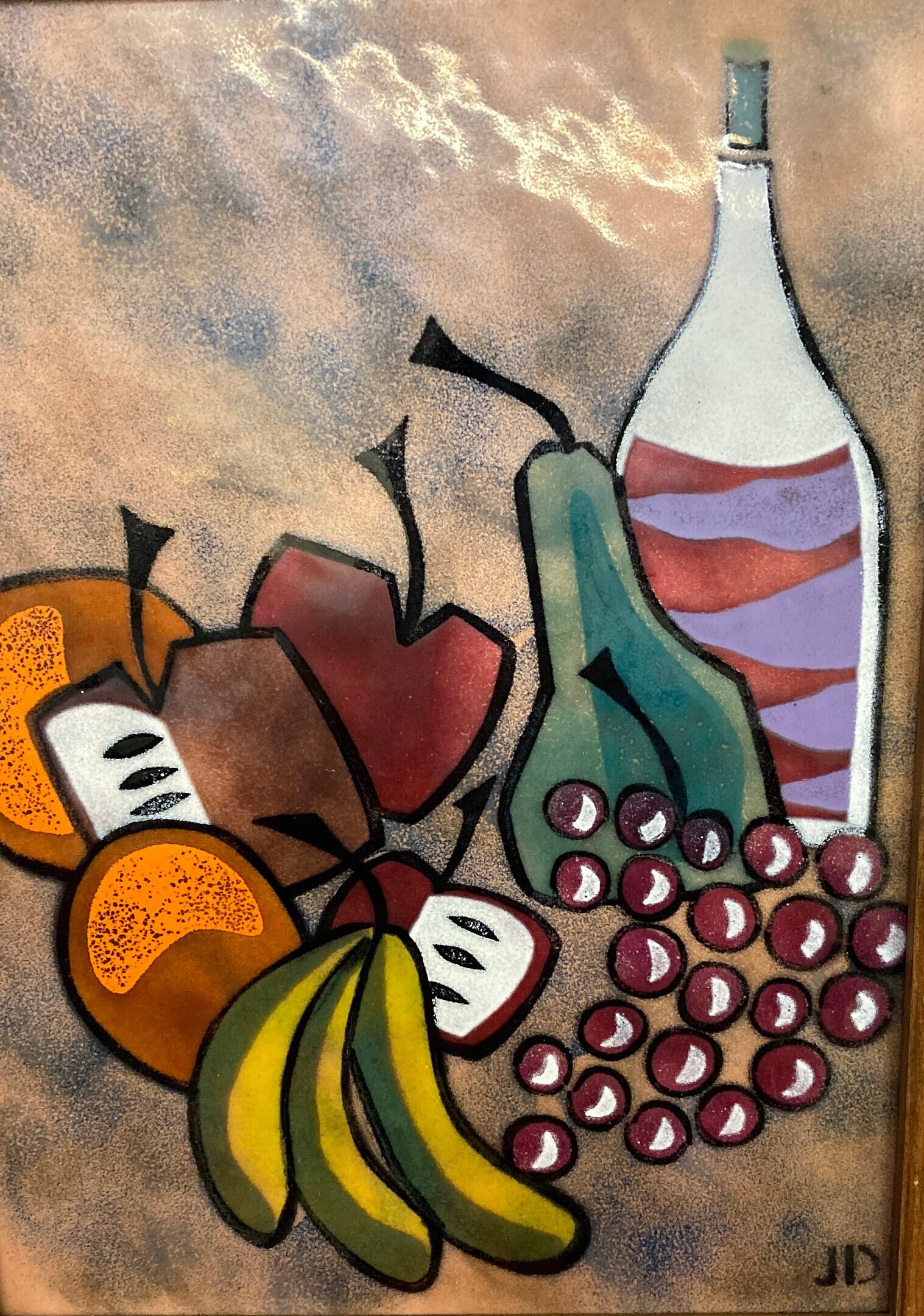 Abstract Metal Painting, Wine Bottle & FruitsAbstract Metal Painted of Wine Bottle and Fruits ,Signed by Artist : JDMeasurement:Not Framed : 13.5" H x 11.5" WIn Excellent Condition