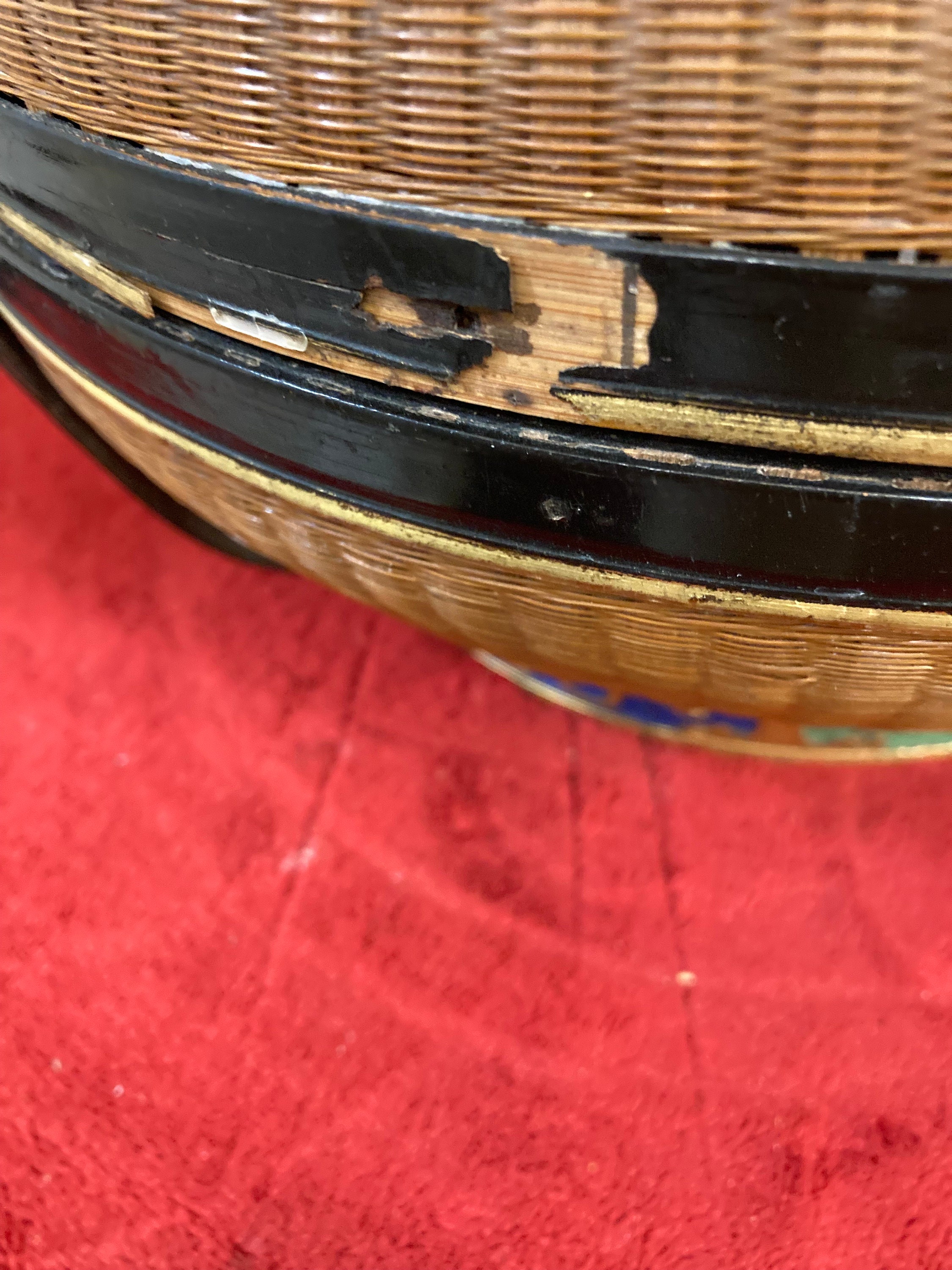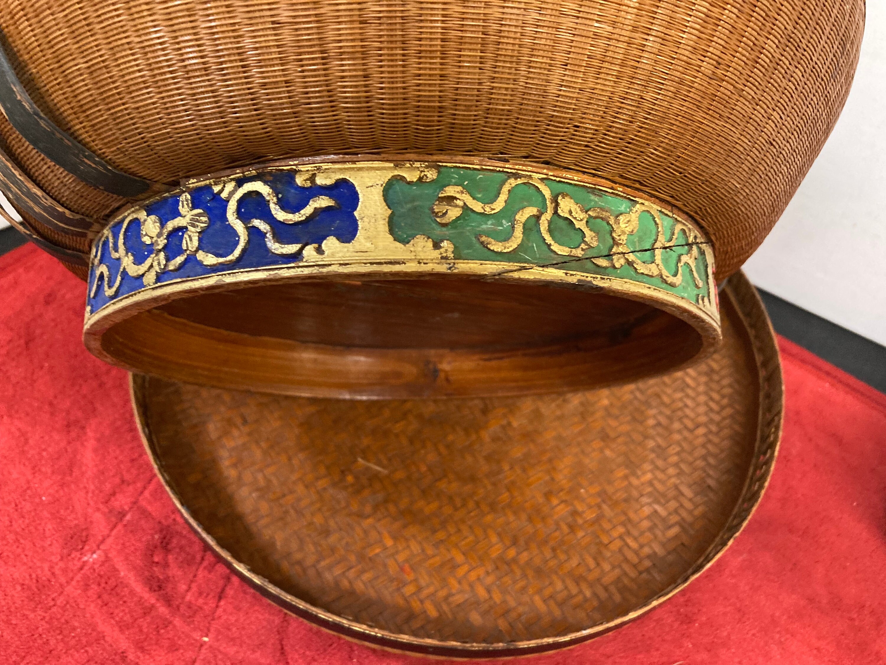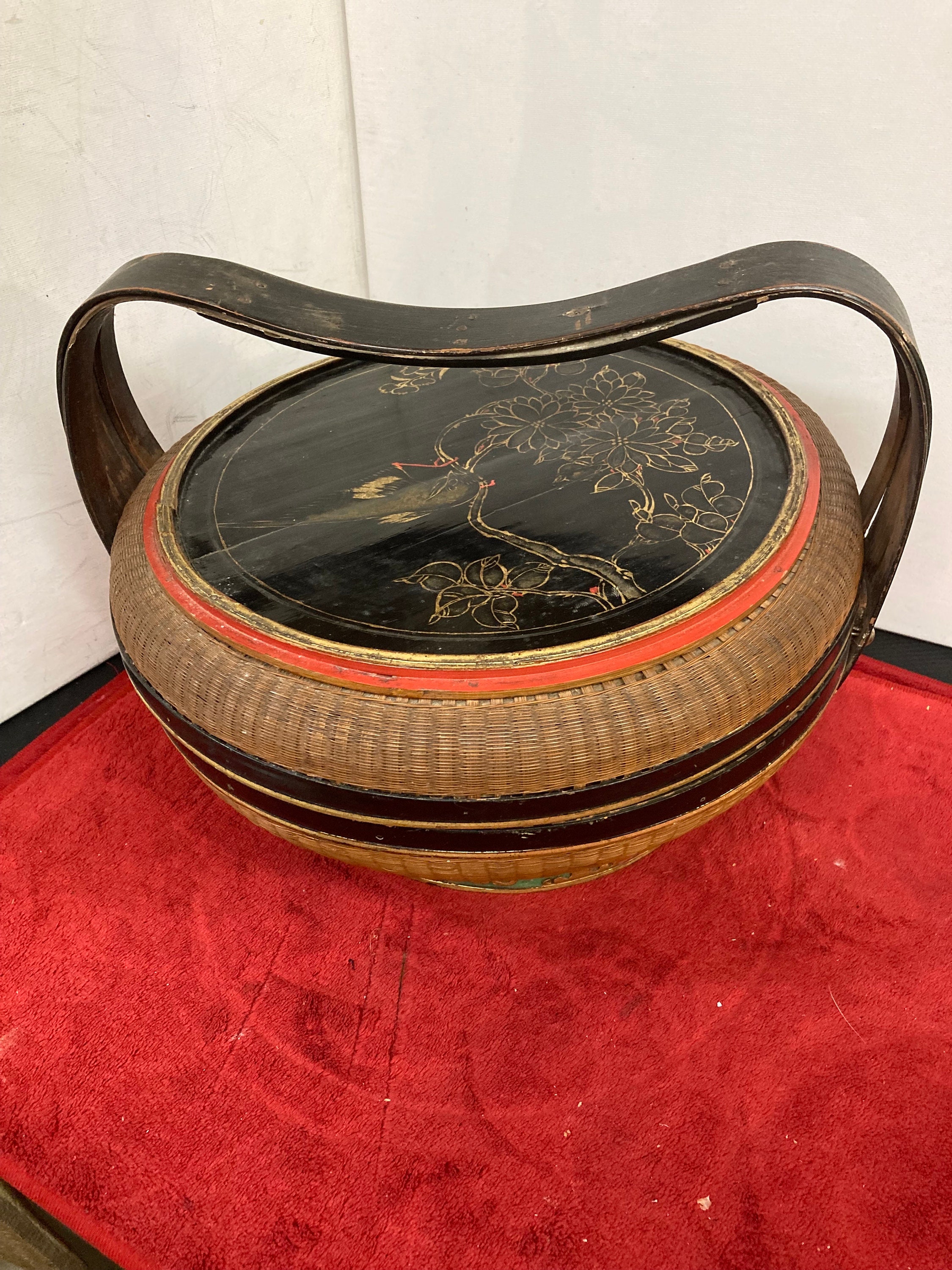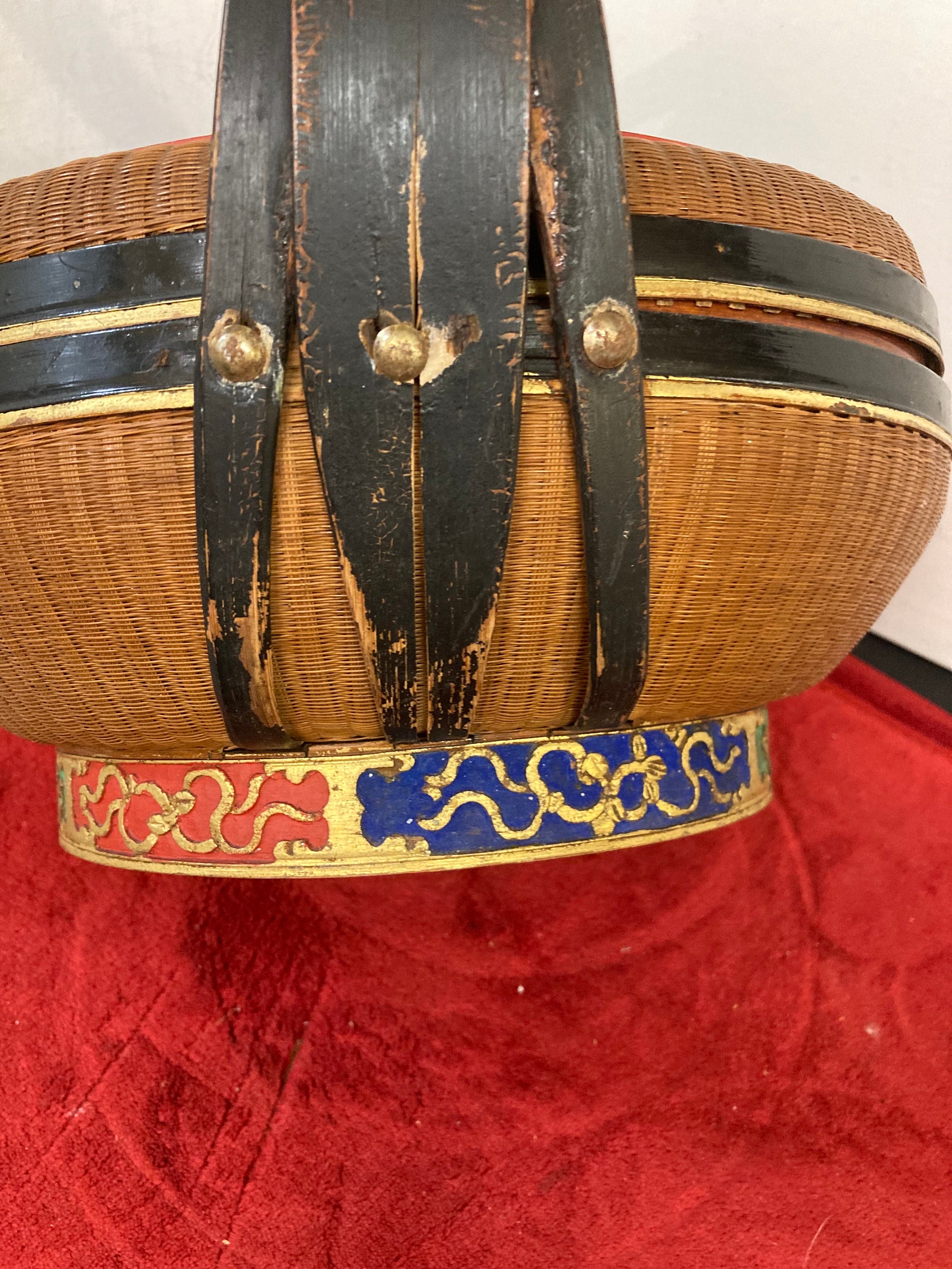 Antique Chinese wedding basket of woven rattan and bamboo.