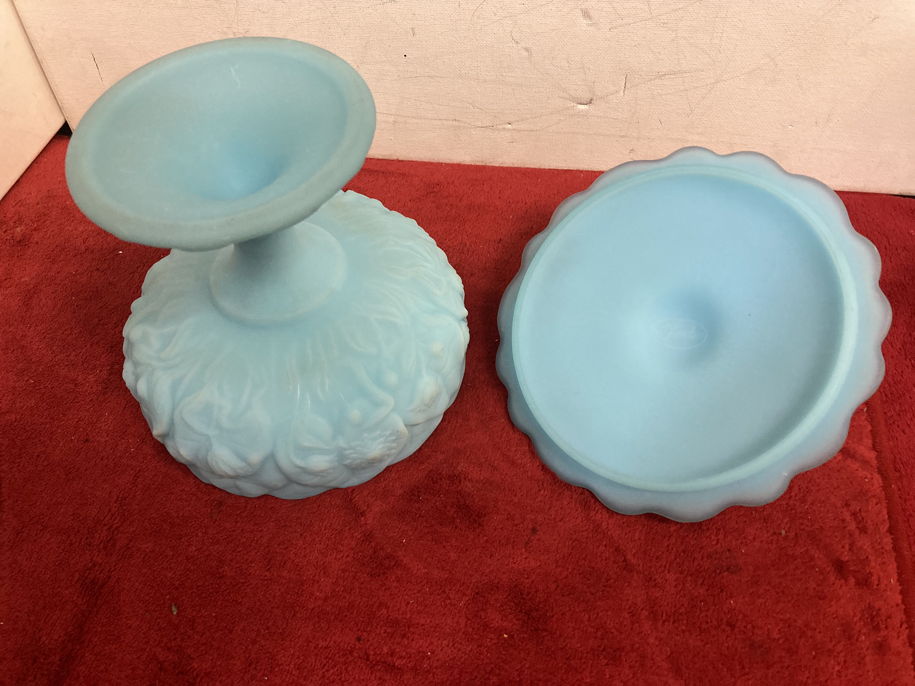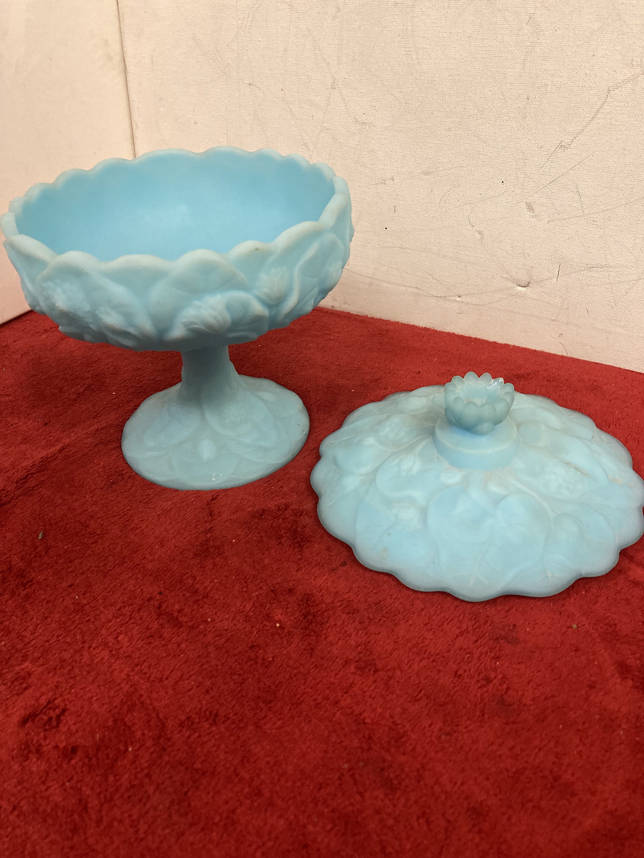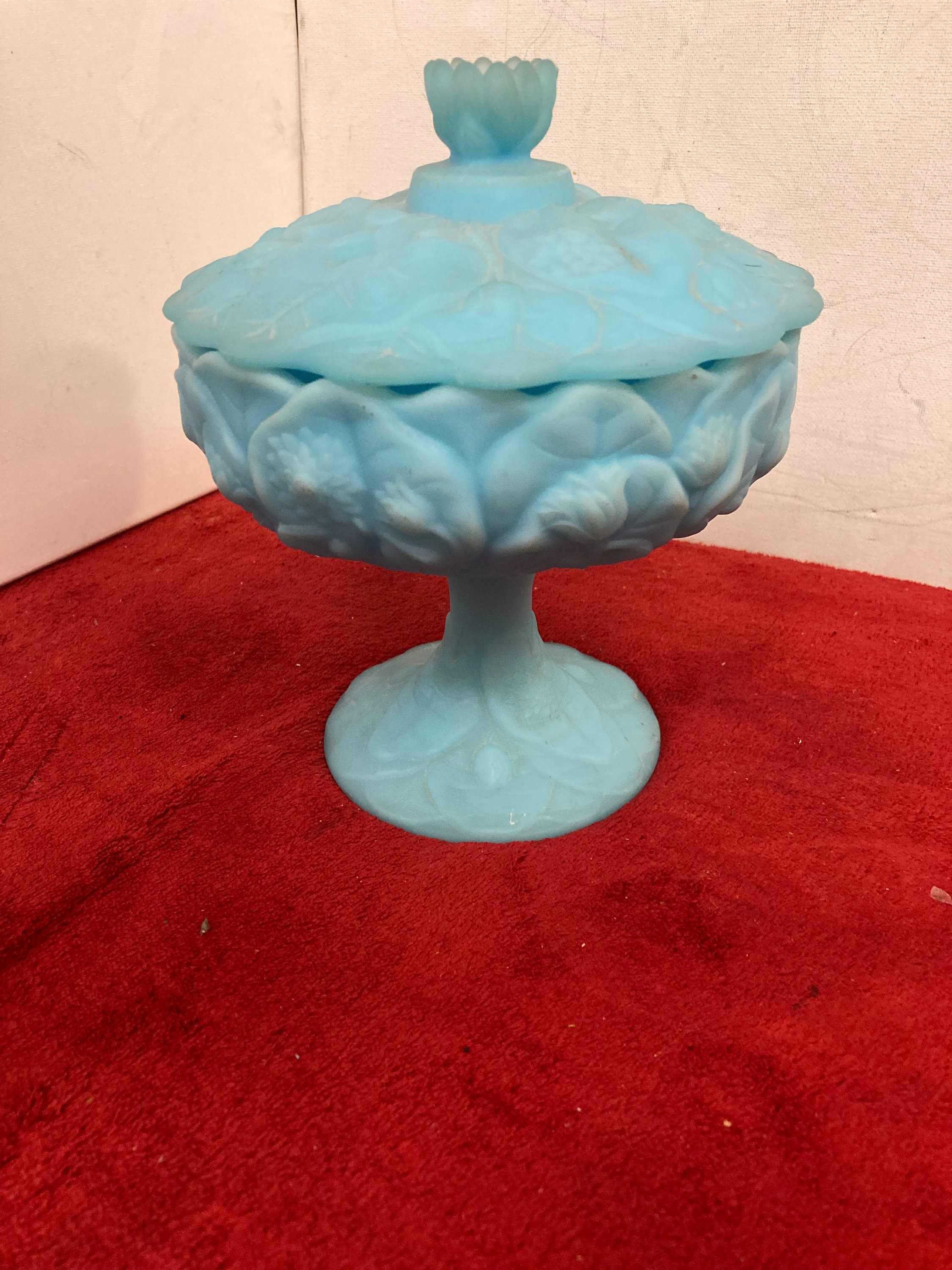 Vintage Fenton Water Lily Pedestal Covered Candy Dish Blue Rare