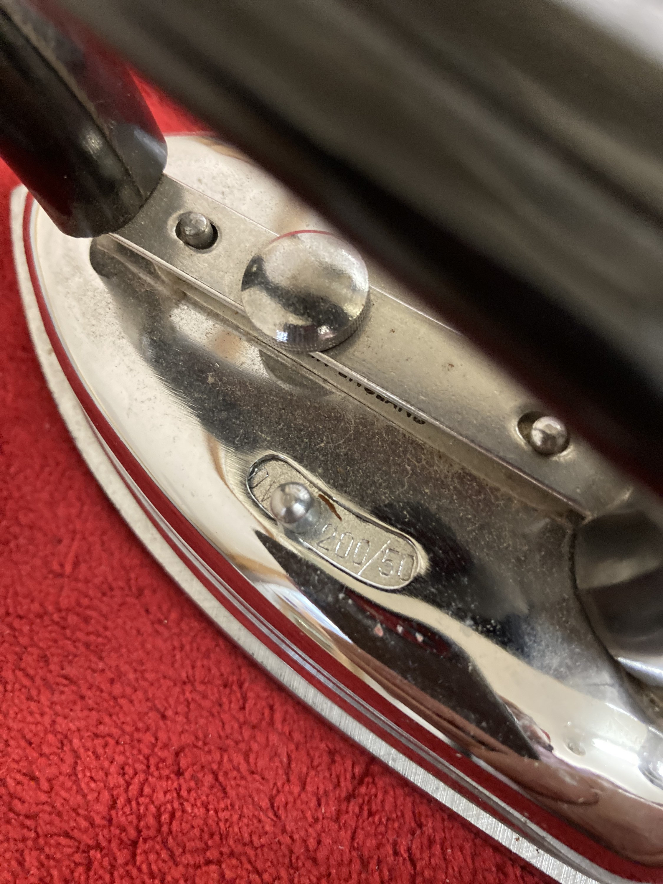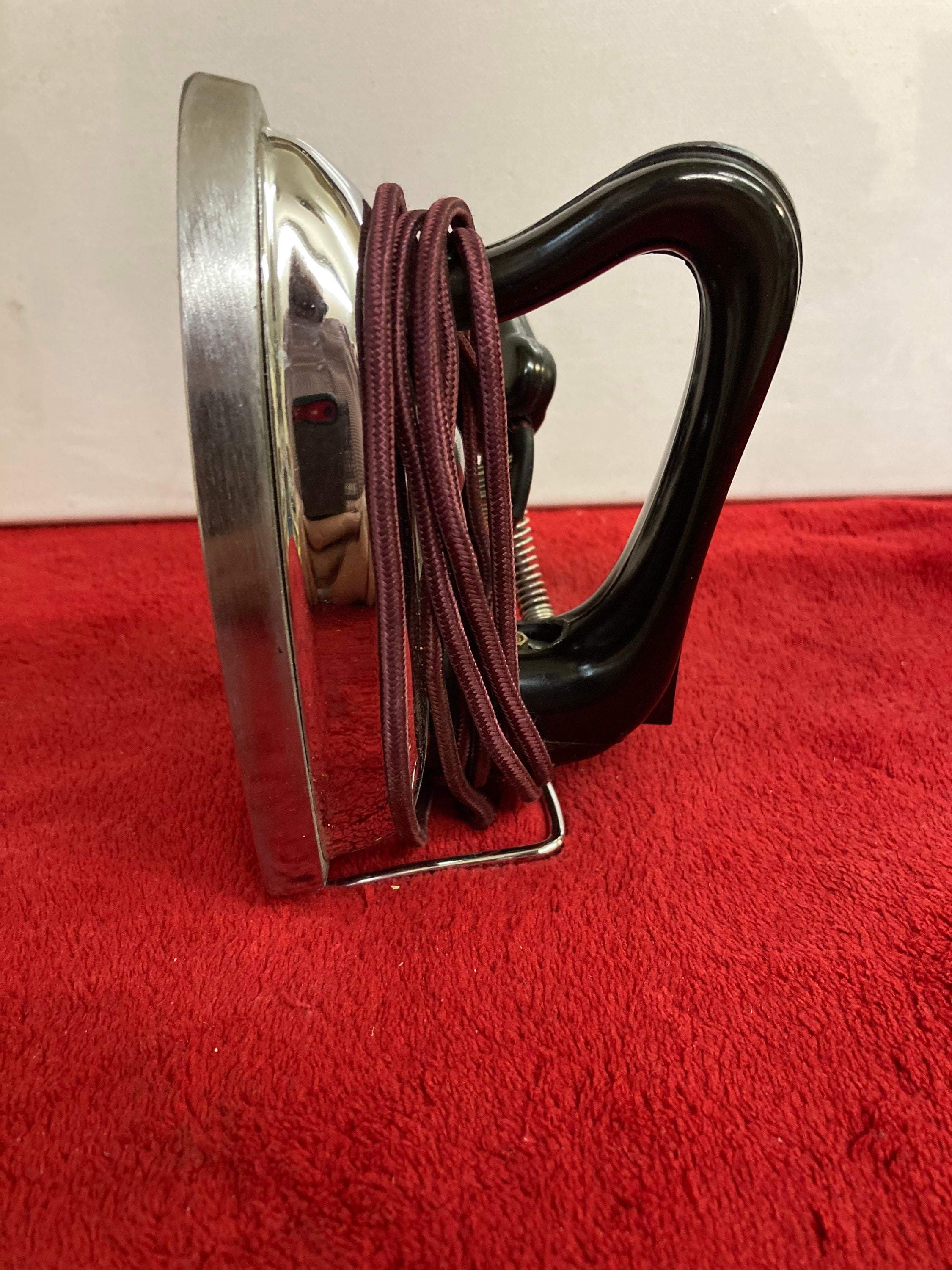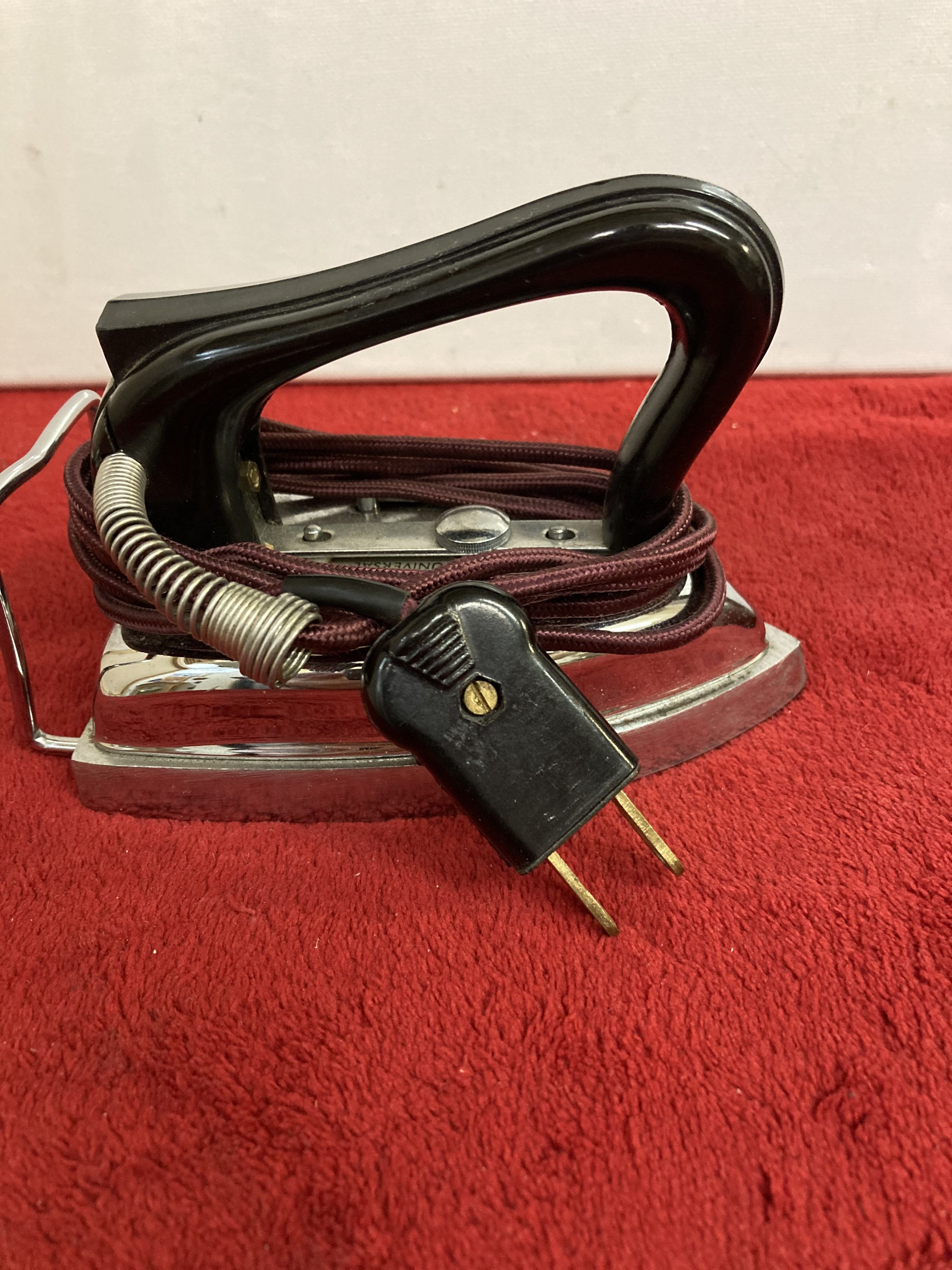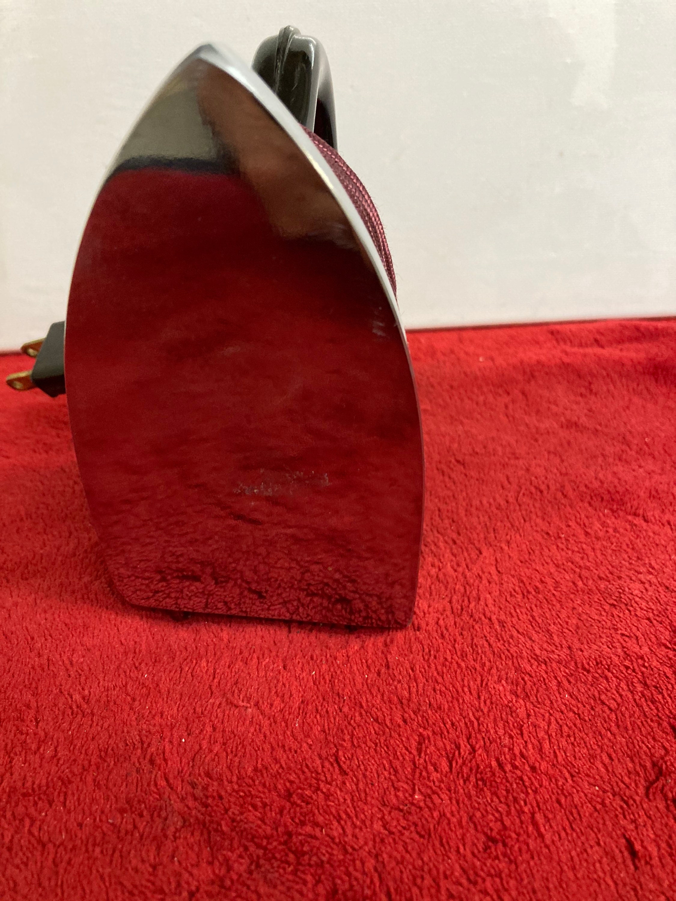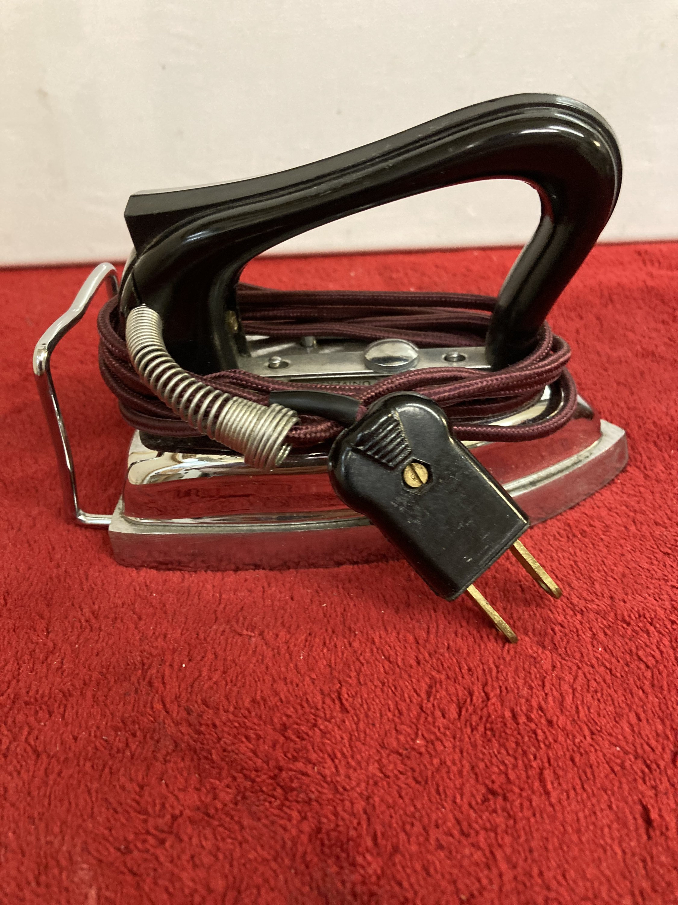 Bakelite Handle SEE PHOTOS Heats up when plugged in. Has cloth cord, that looks Great. This is made of Chrome. It's heavy for children iron. It's in excellent condition. Has a switch of some kind on side of iron. It's 5" long, 3.5" tall 3" wide. Made in England. Bakelite plug.