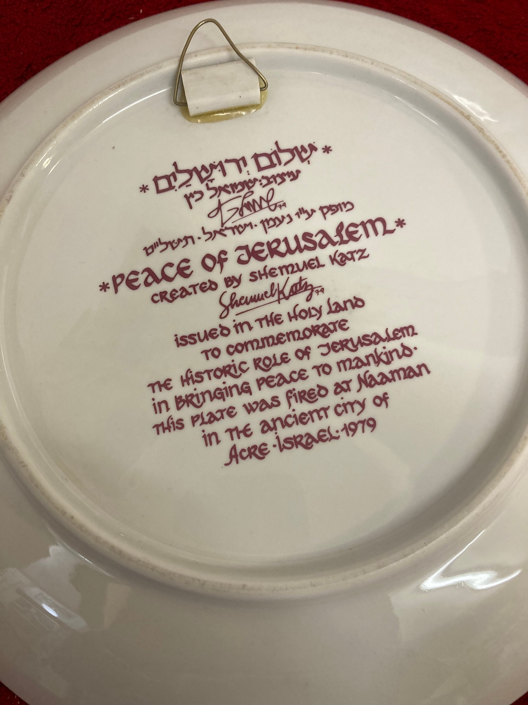 Created by Shemuel Katz issued in the Holy Land to commemorate the historic role of Jerusalem in bringing peace to mankind. This plate was fired at Naaman in the ancient city of Acre-Israel - 1979.