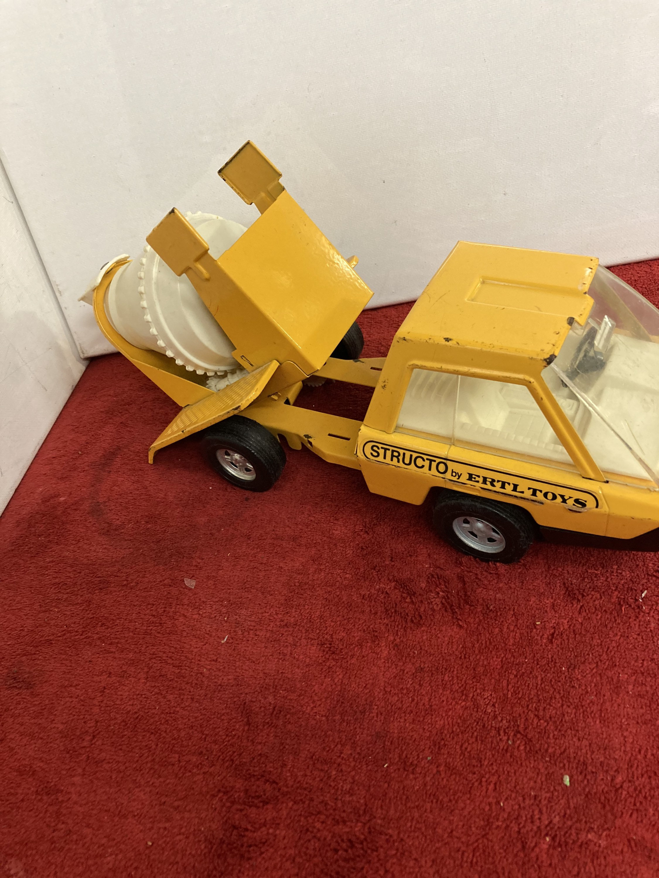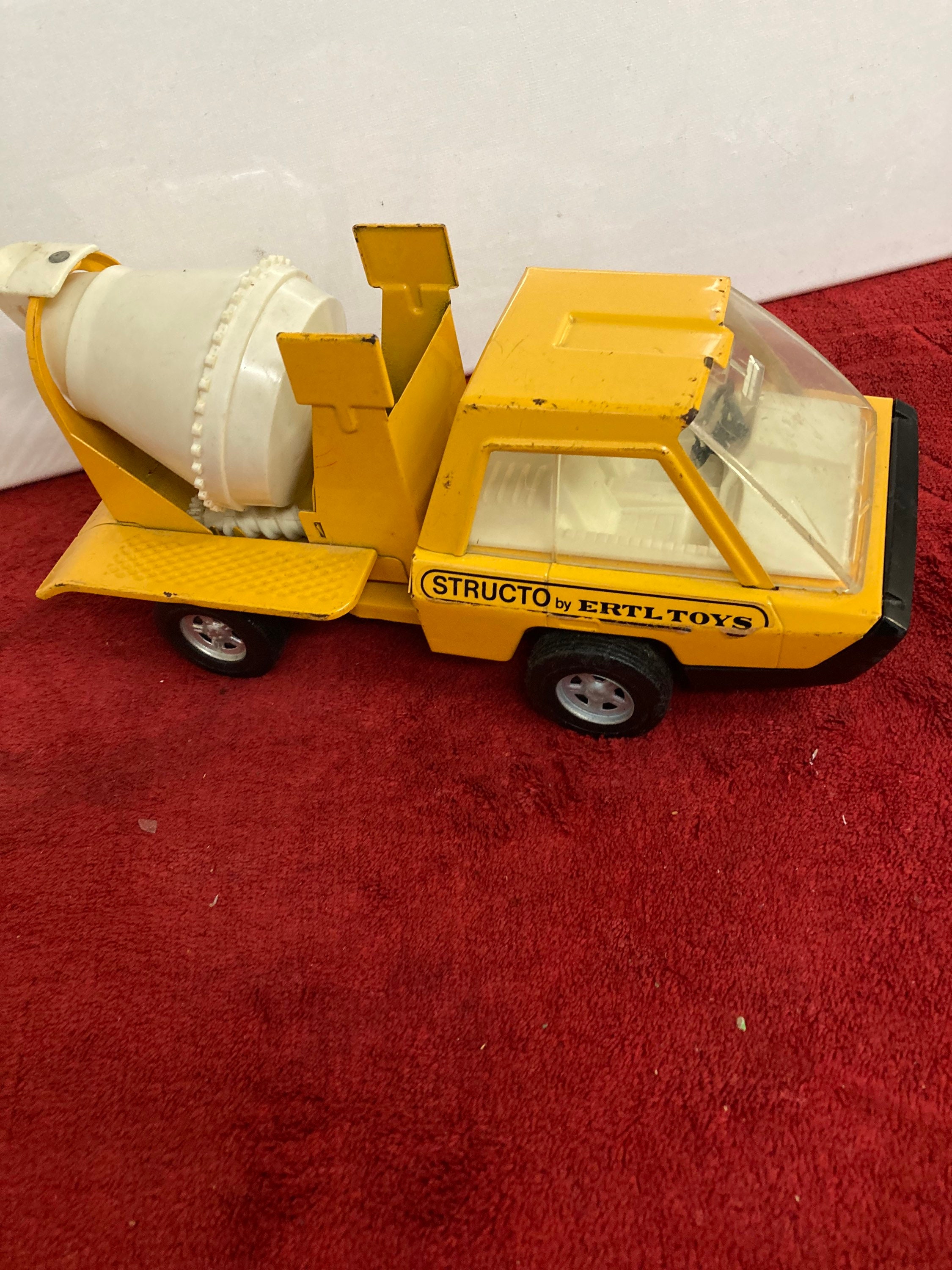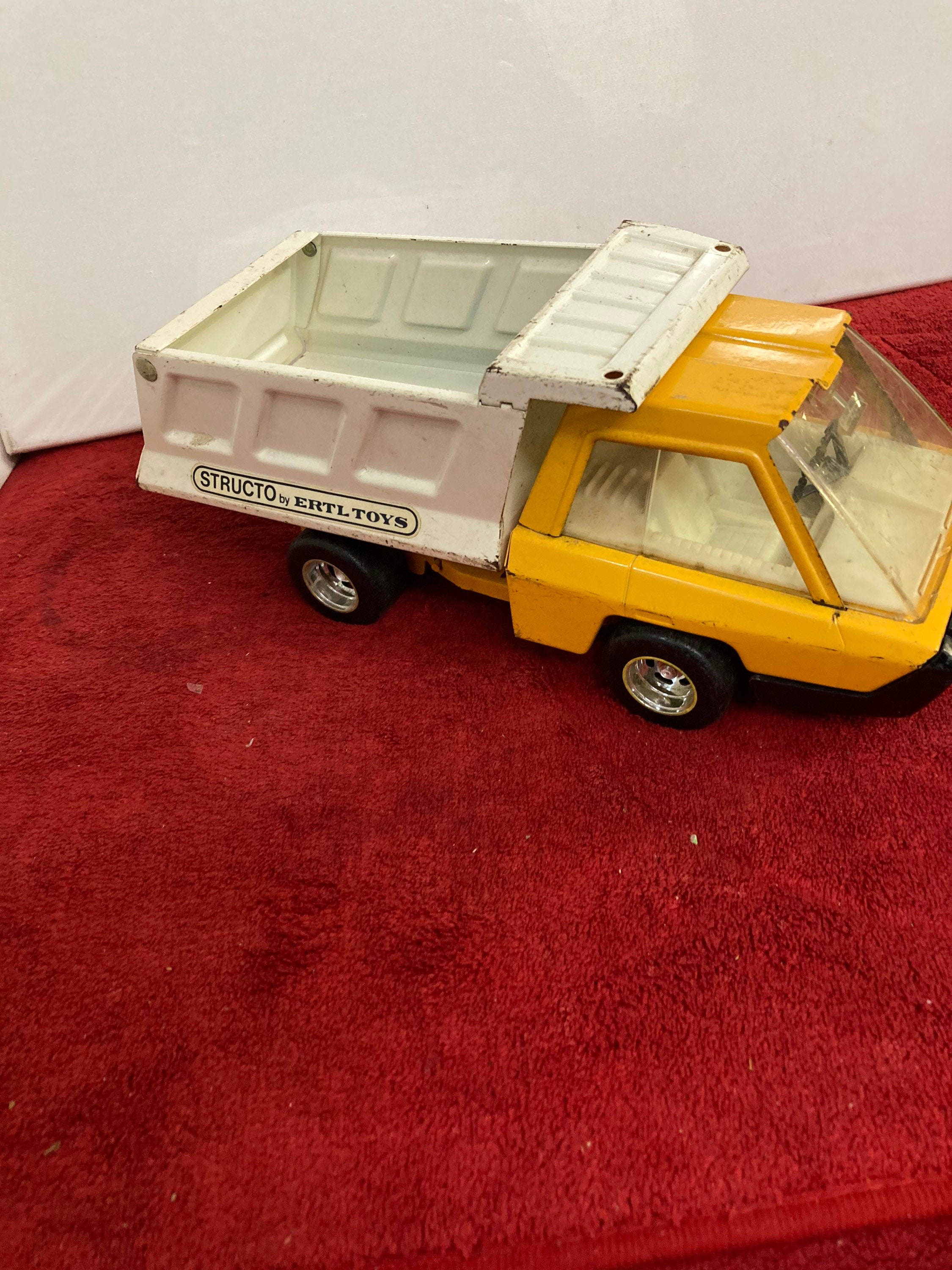Used/vintage yellow and white Structo by Ertl Toys pressed steel dump truck that comes as you see pictured in the listing and noted above.