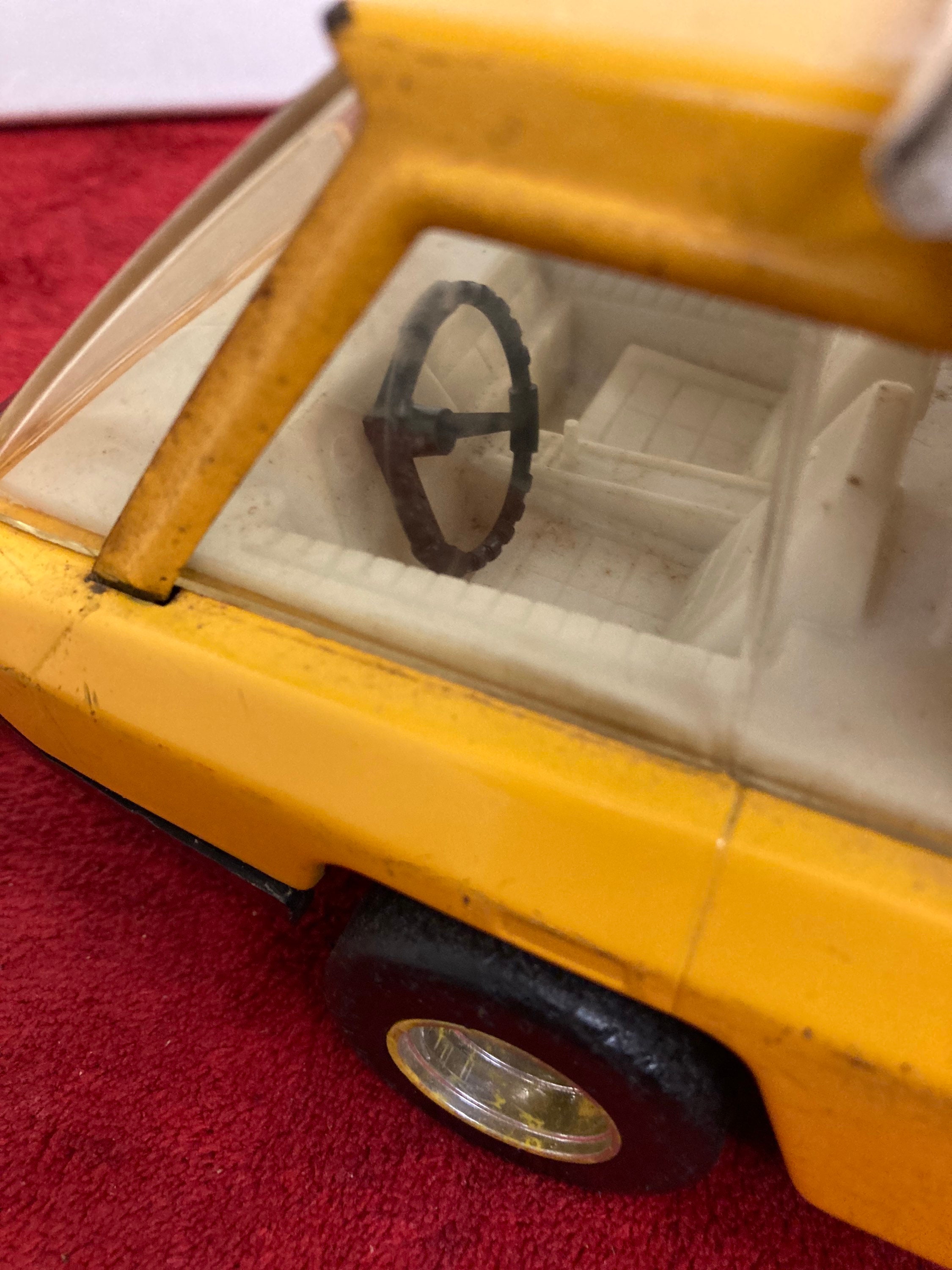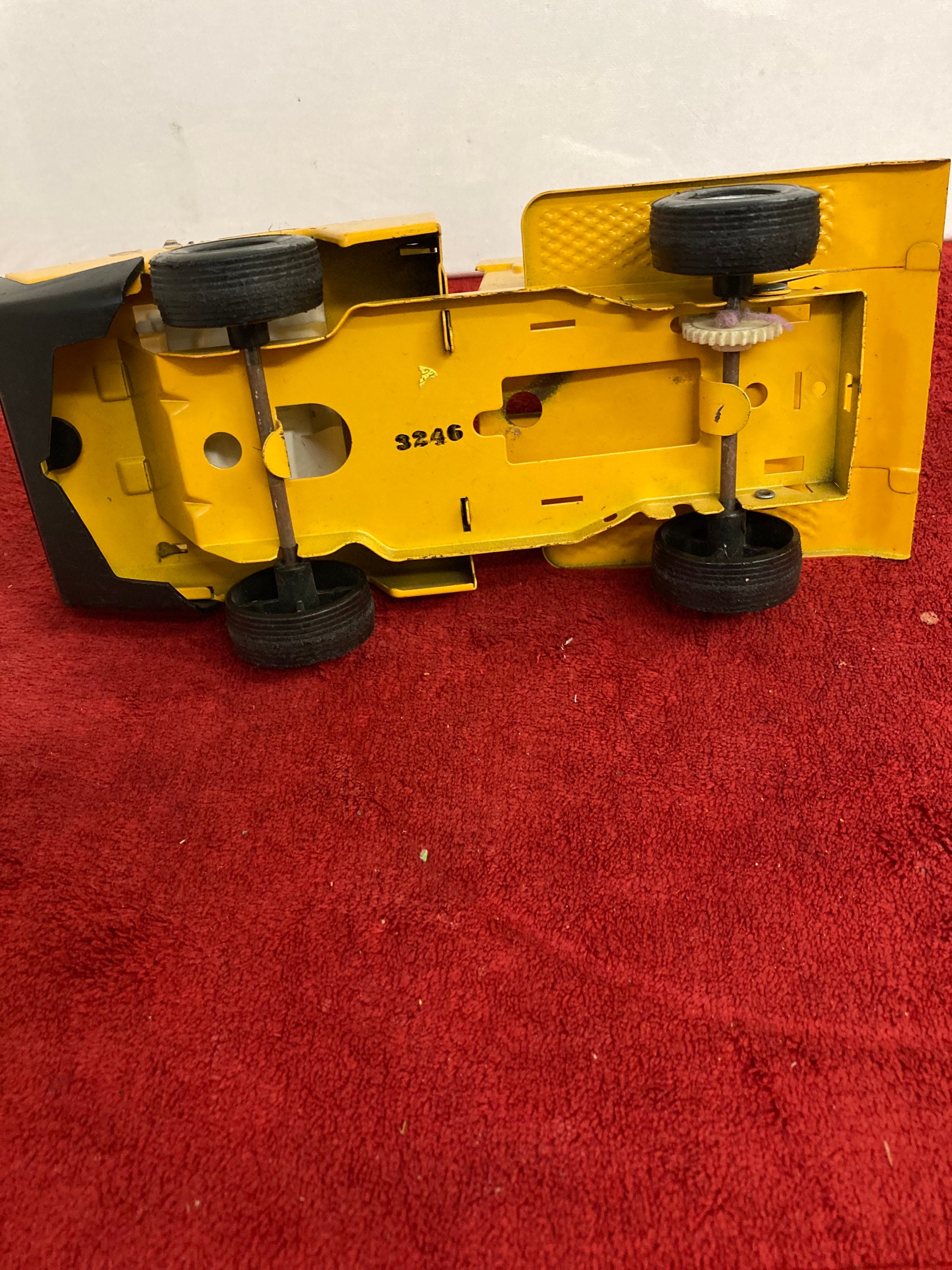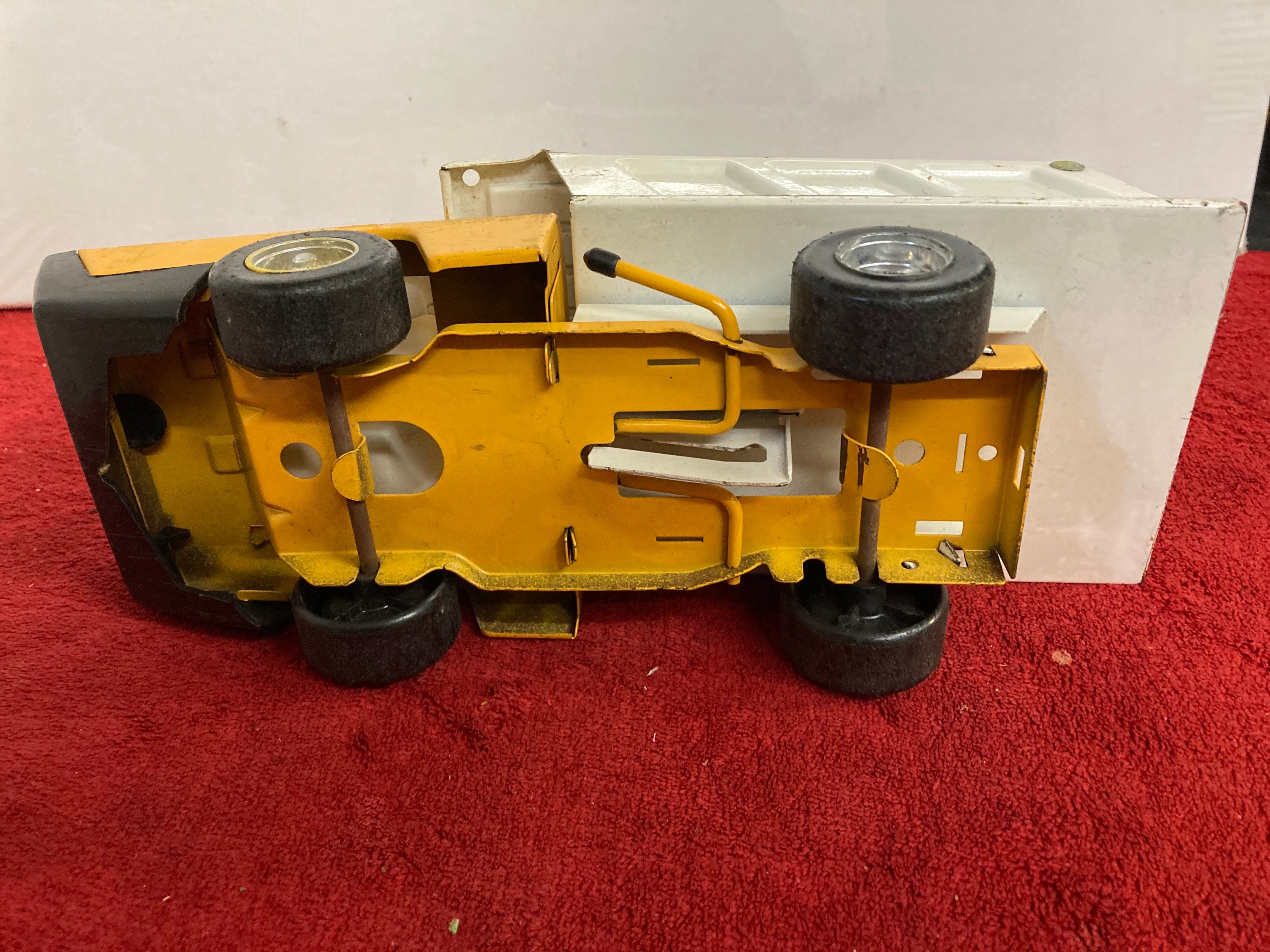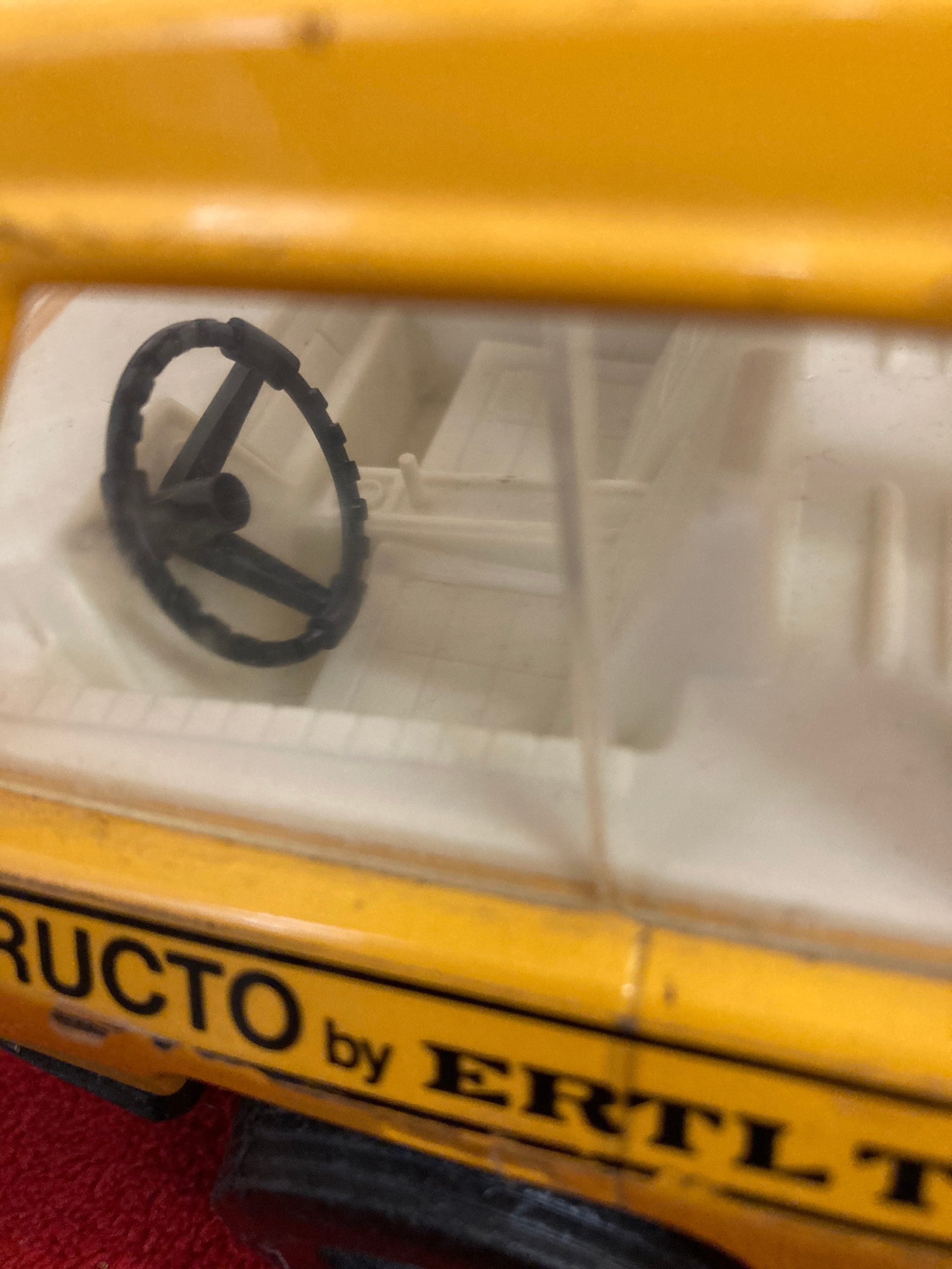 Used/vintage yellow and white Structo by Ertl Toys pressed steel dump truck that comes as you see pictured in the listing and noted above.