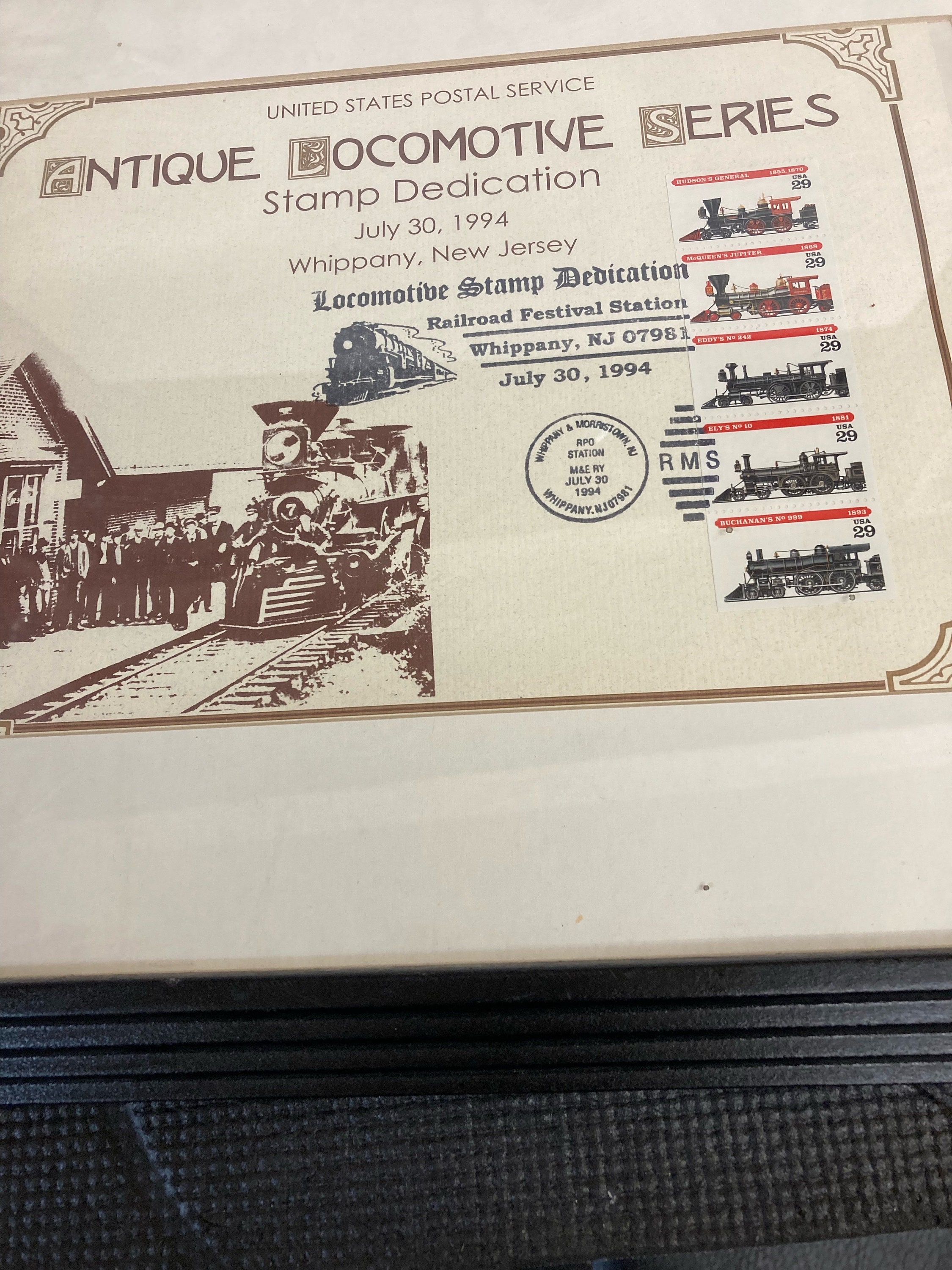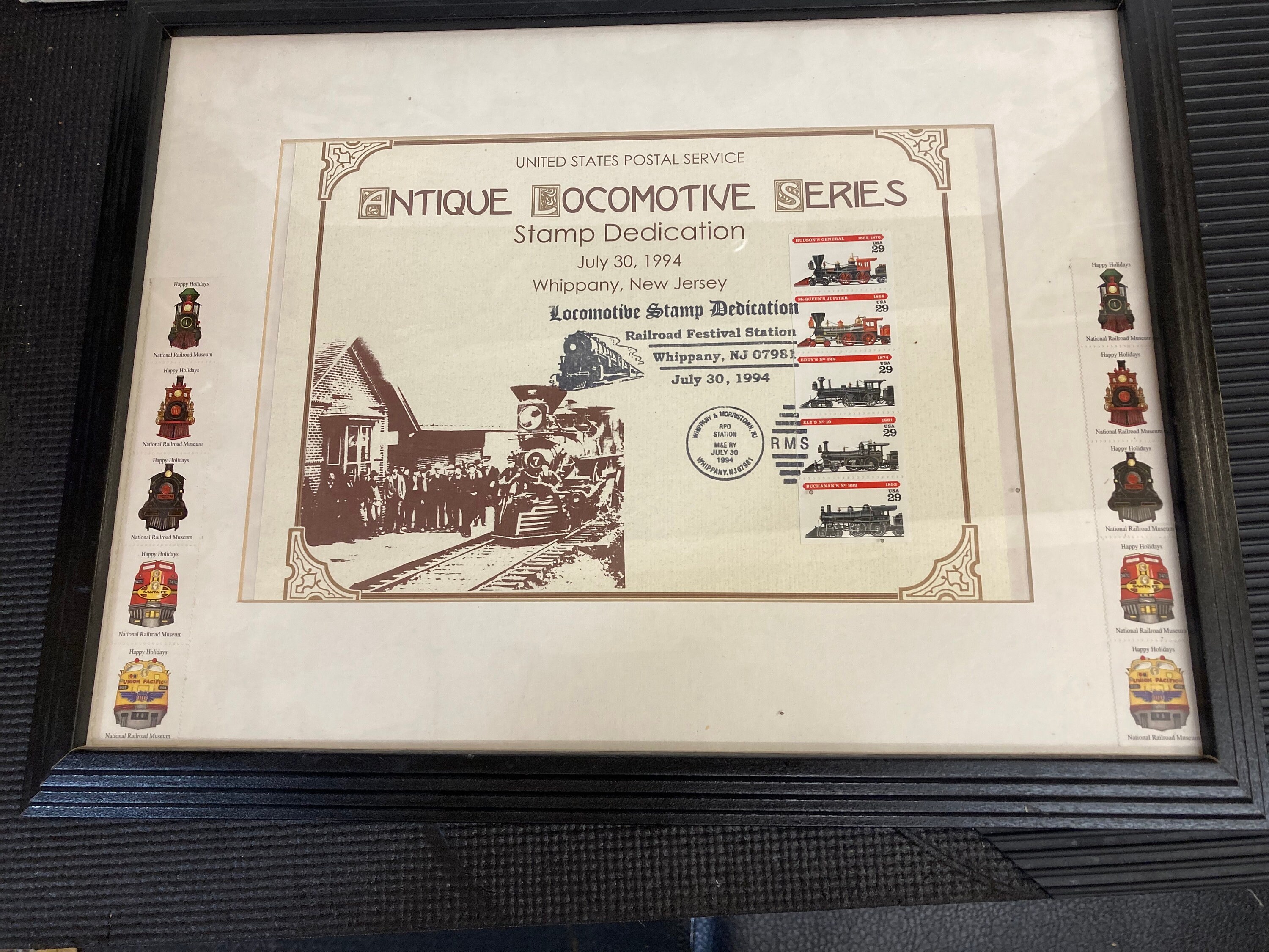 Here is a near mint Framed United States Postal Service Antique Locomotive Series Stamp Dedication, with "5" antique 29 cent stamps. It was issued as per the Railroad Festival Station in Whippany, NJ. 07981 on July 30, 1994. Wood frame is very nice
