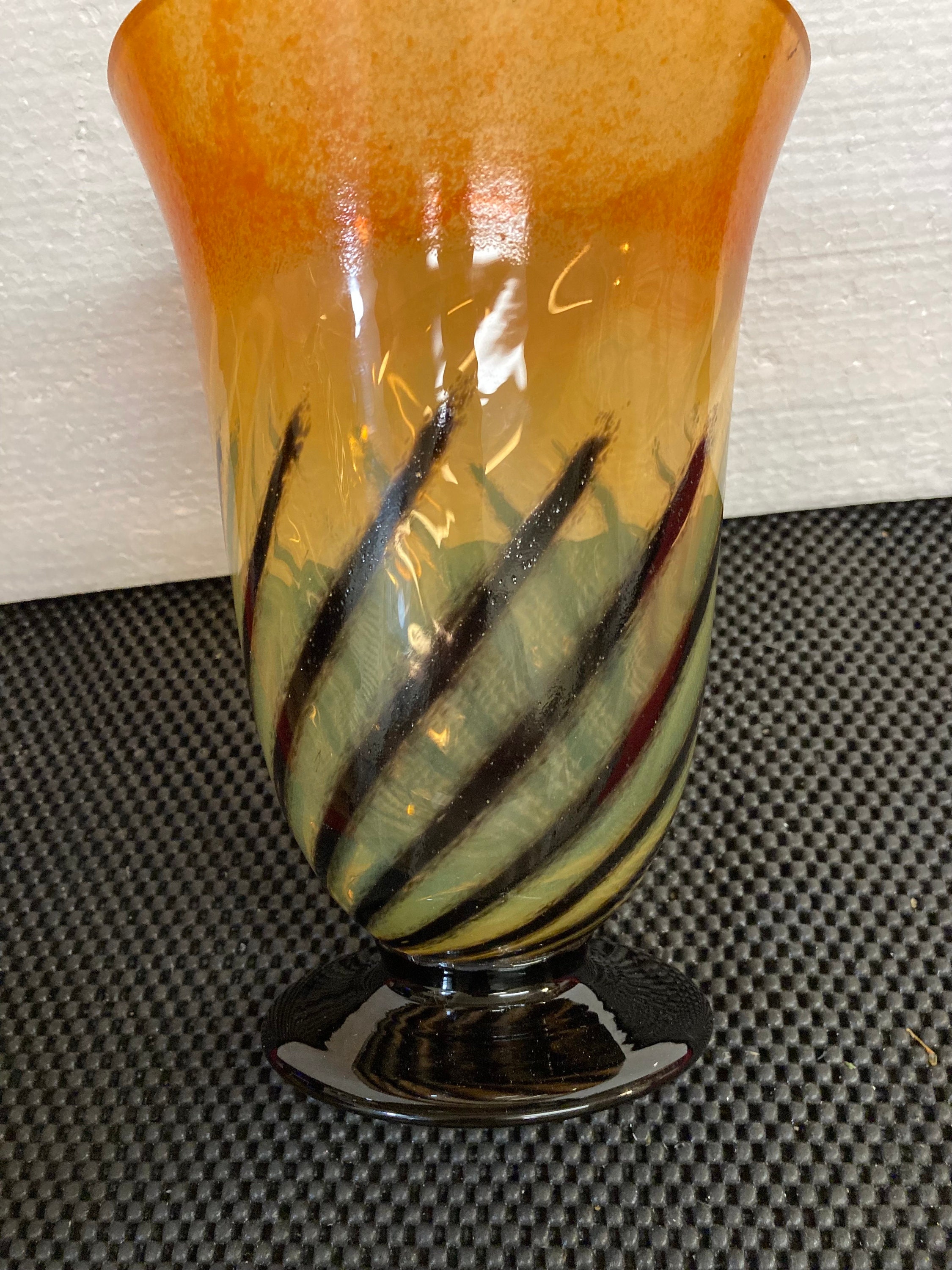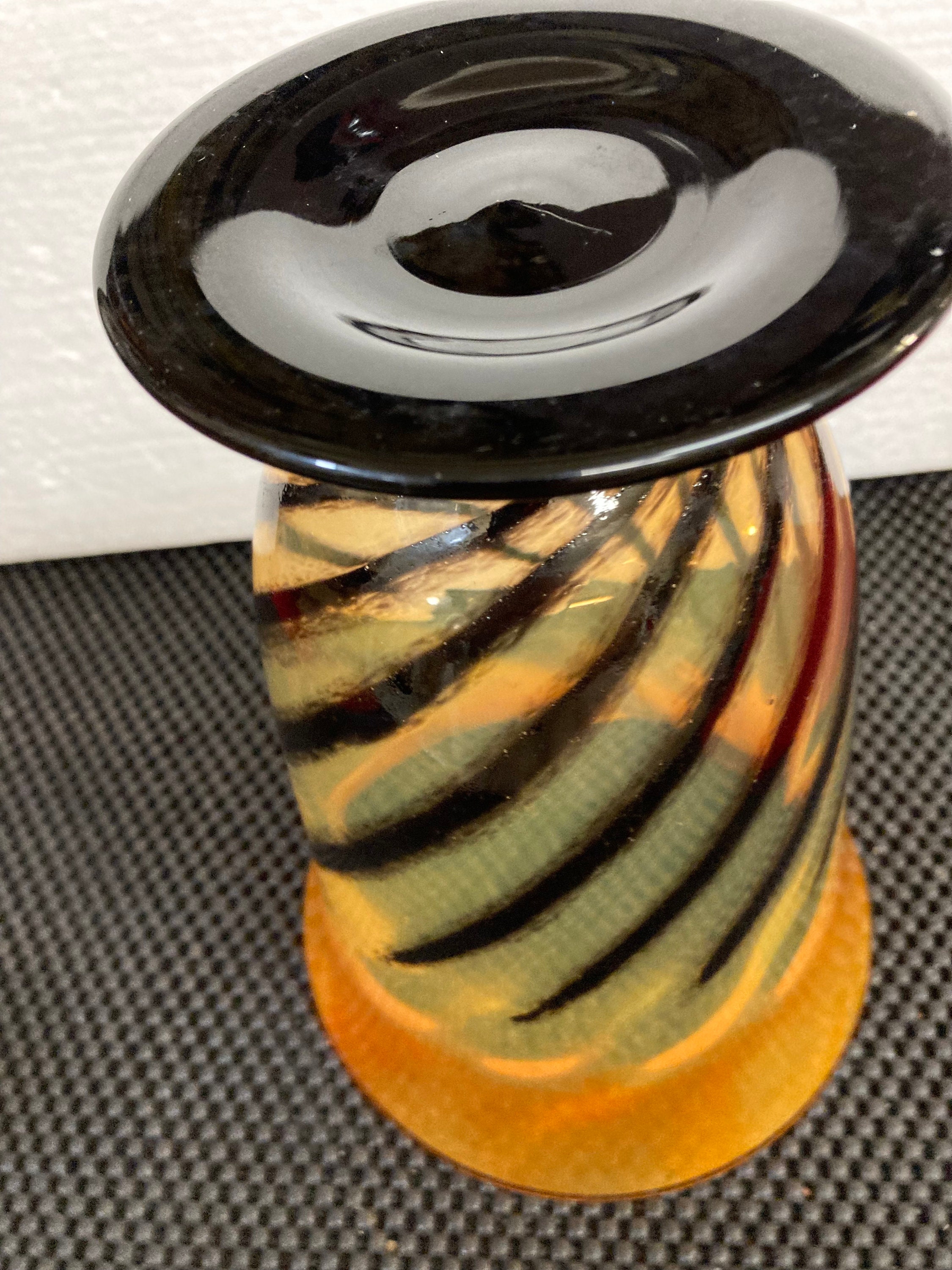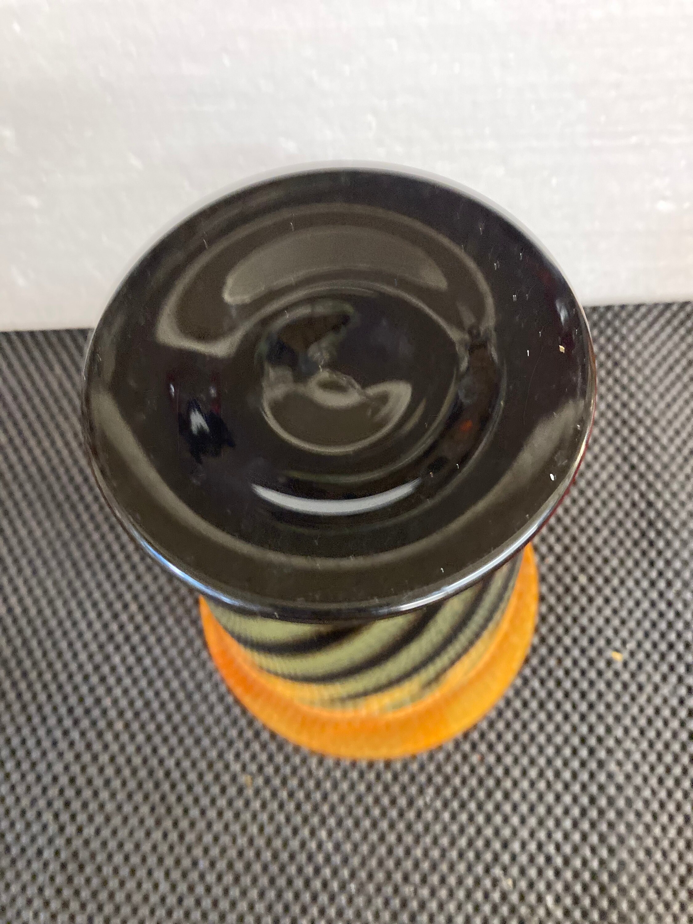 Vase from Rosenthal studio-line, design of the Finnish designer Nanny Still, * 1926 Helsinki - 2009 Brussels. Colorless glass, powder enamels in black and orange, stripe decor, foot in opaque black.