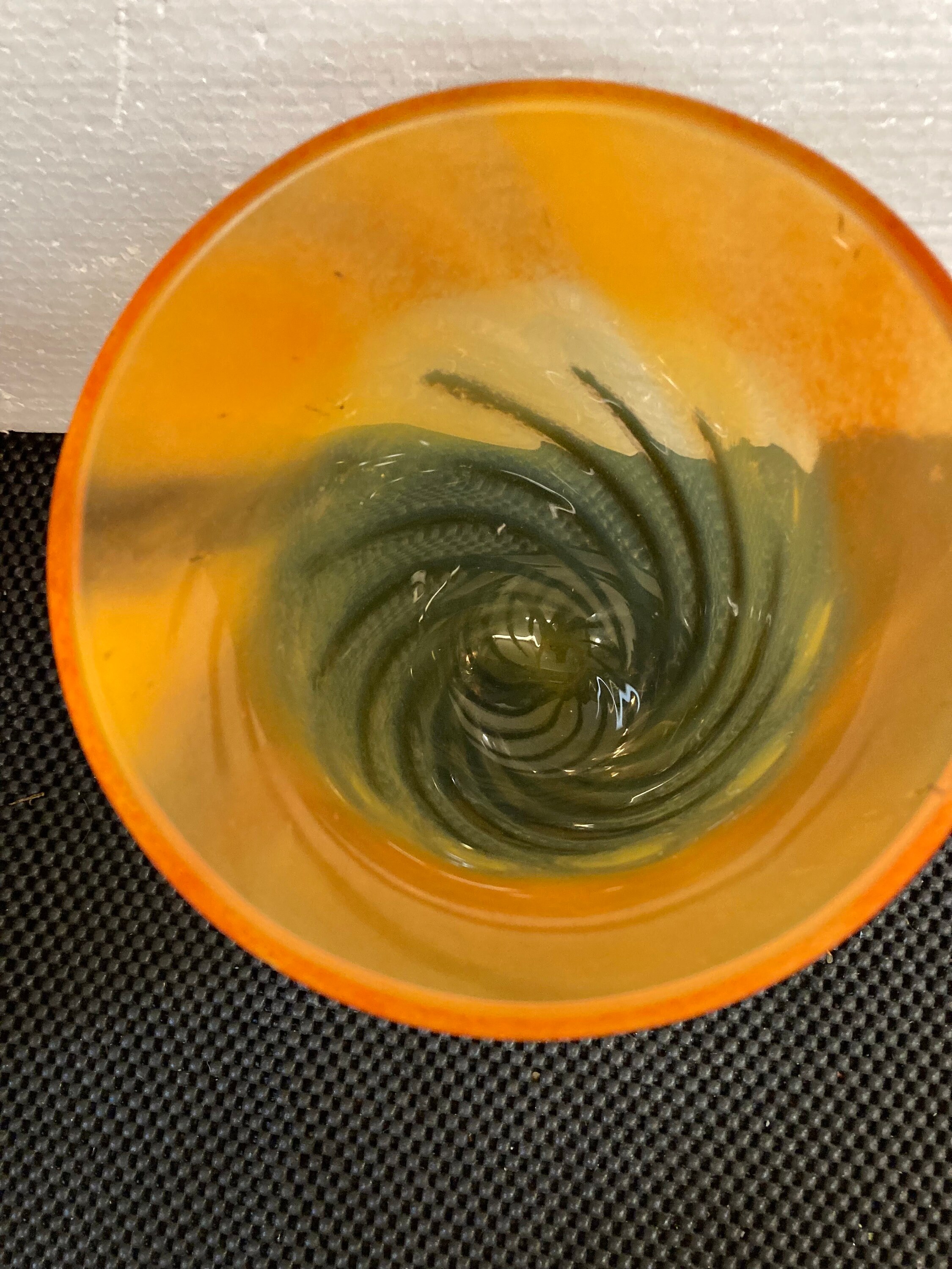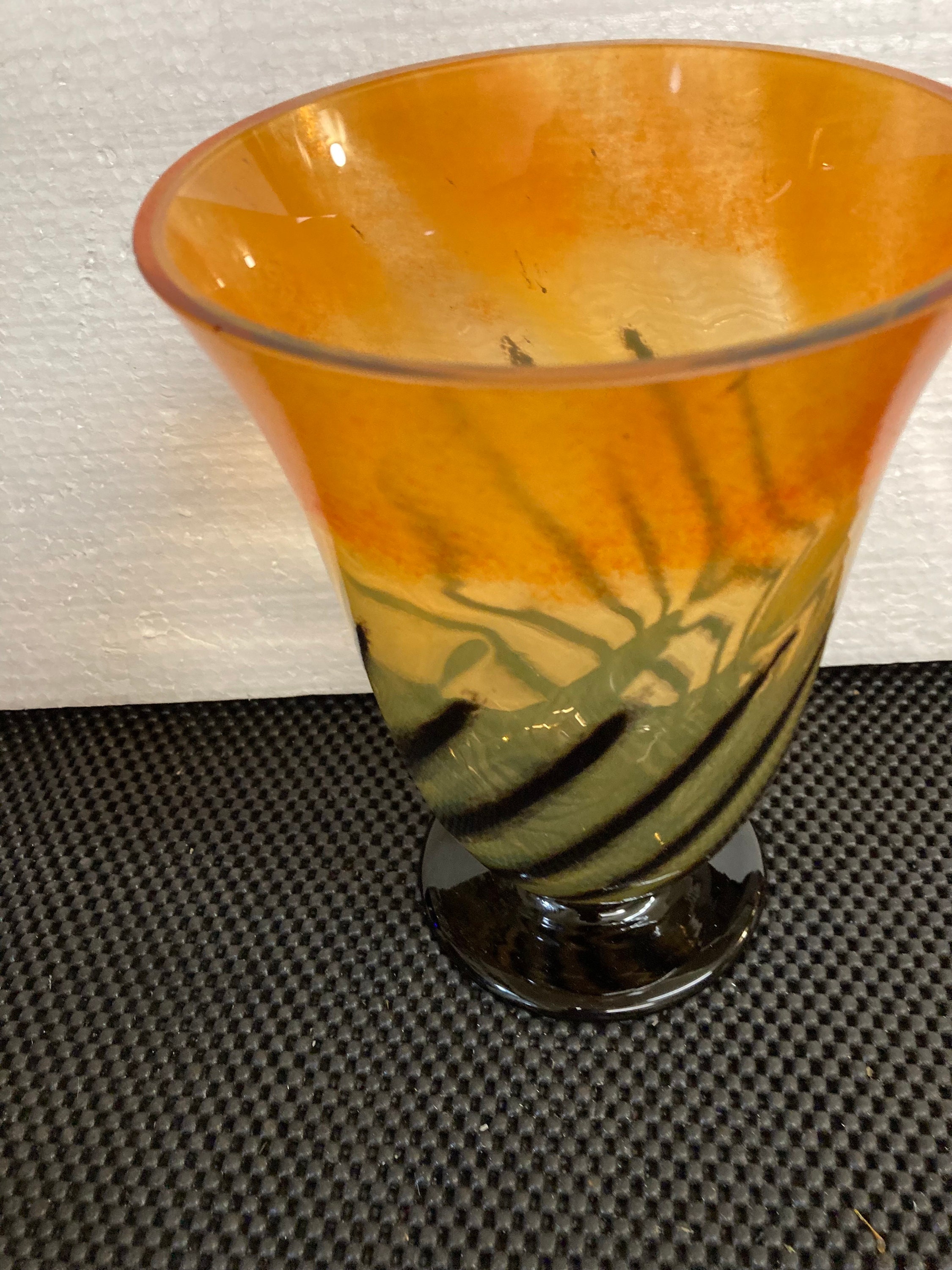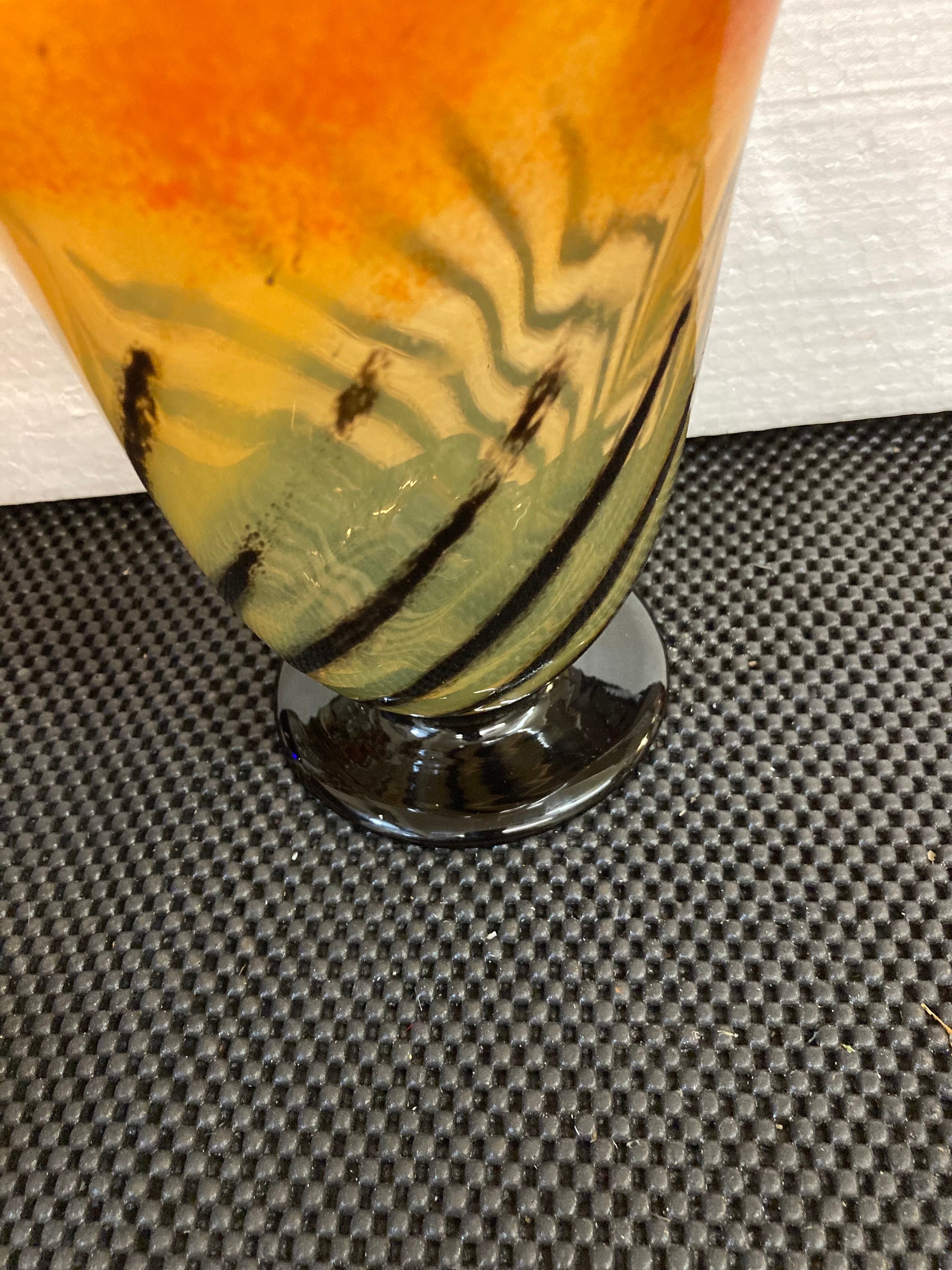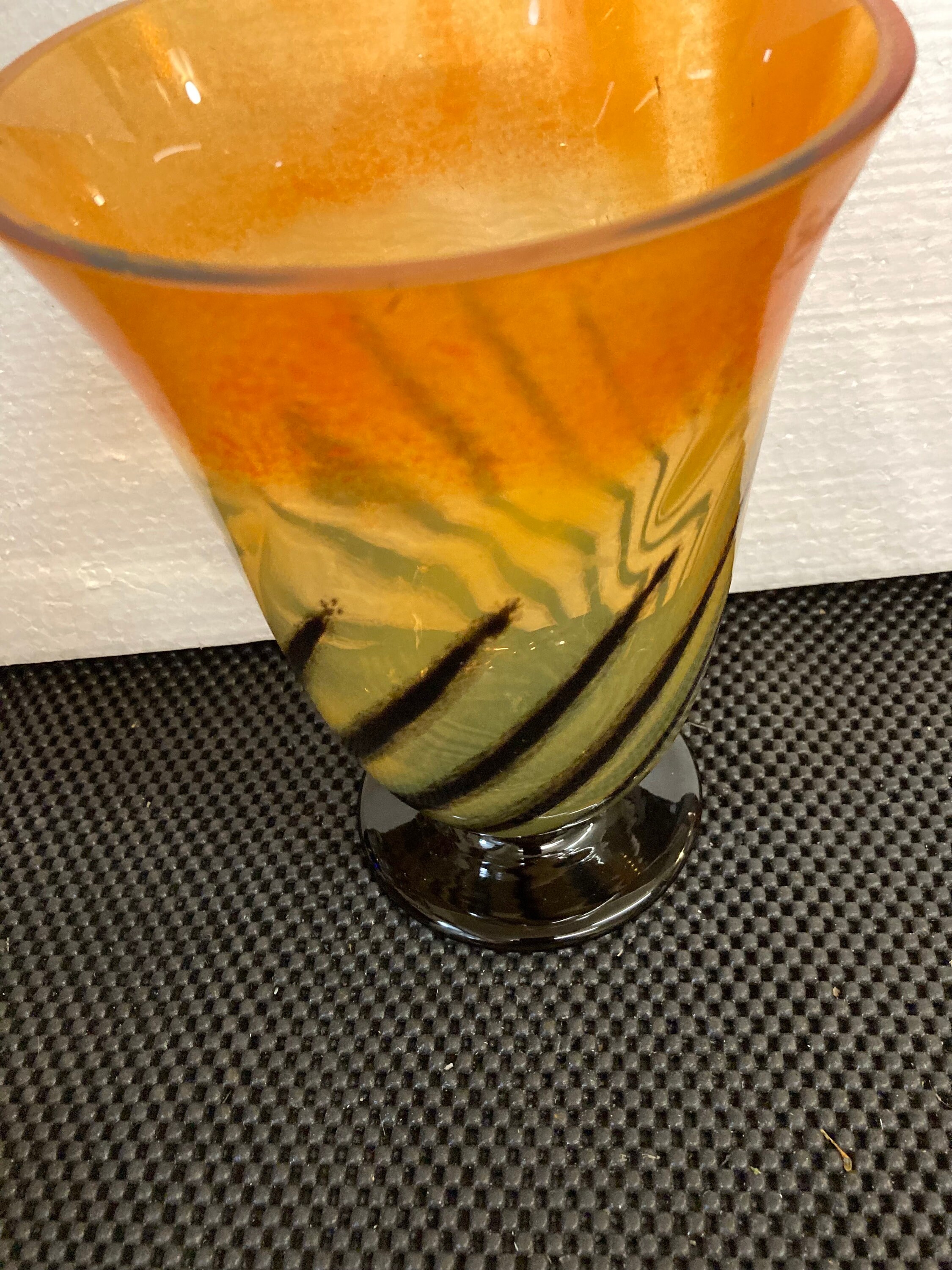 Vase from Rosenthal studio-line, design of the Finnish designer Nanny Still, * 1926 Helsinki - 2009 Brussels. Colorless glass, powder enamels in black and orange, stripe decor, foot in opaque black.