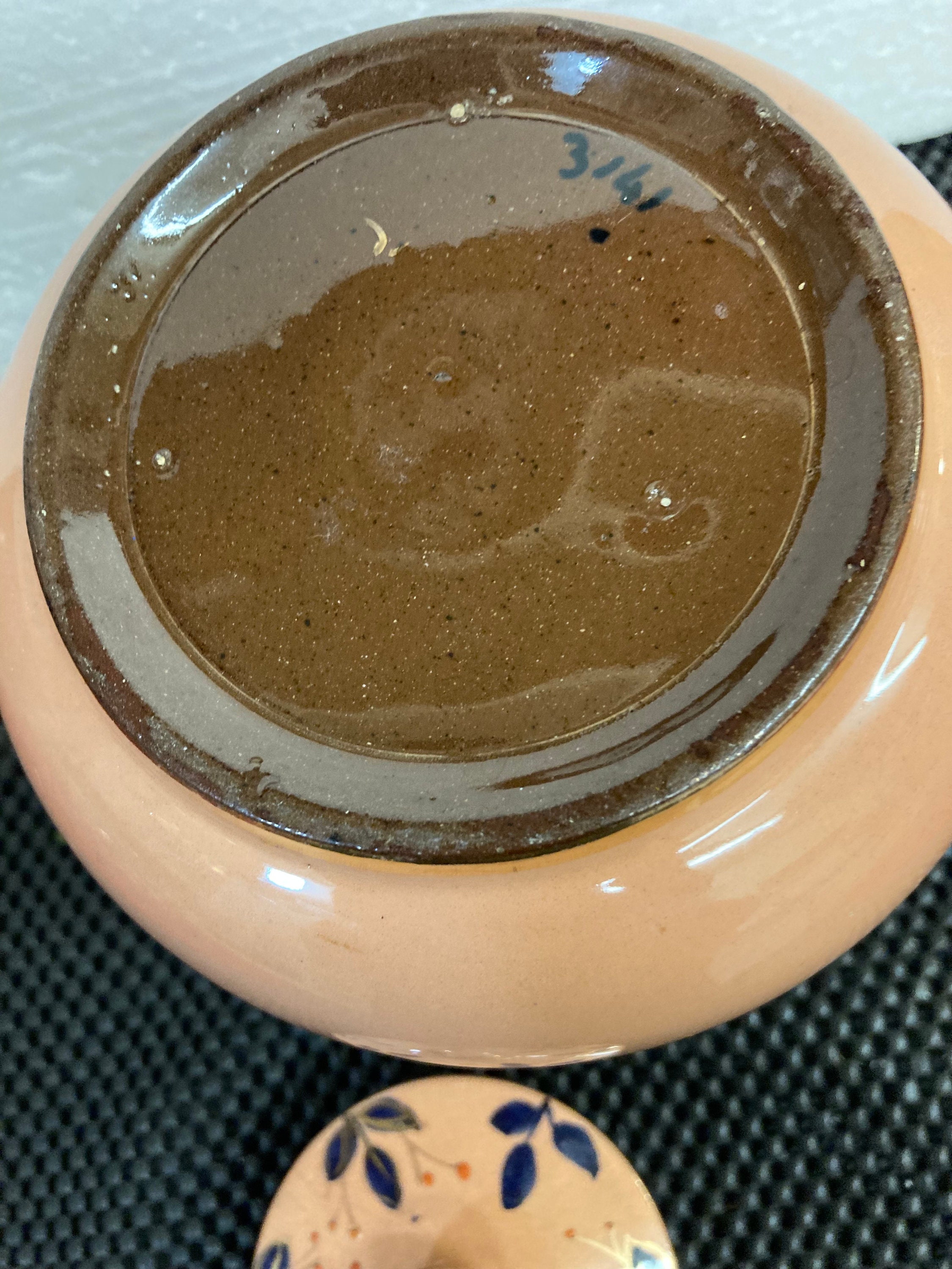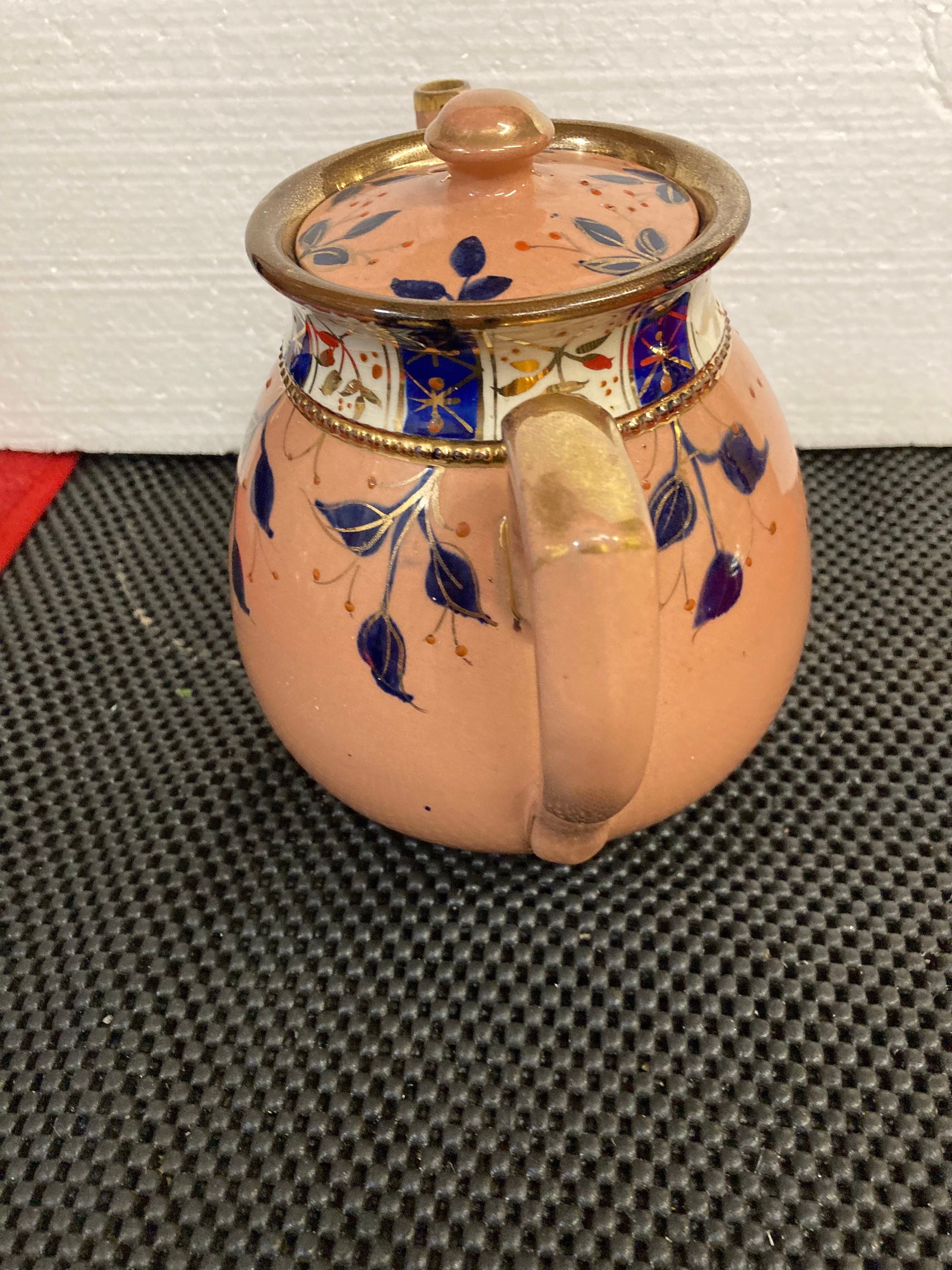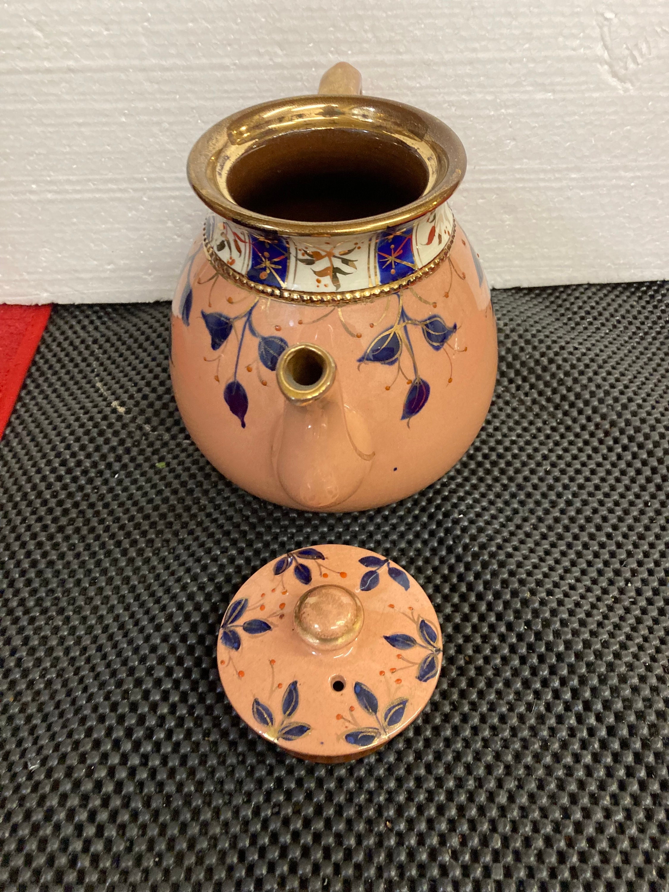 Brown pottery body glazed with a Salmon Pink & a cream band around the top. Hand painted pattern in Cobalt Blue, tiny touches of Red.Finished with shiny gilt highlights
