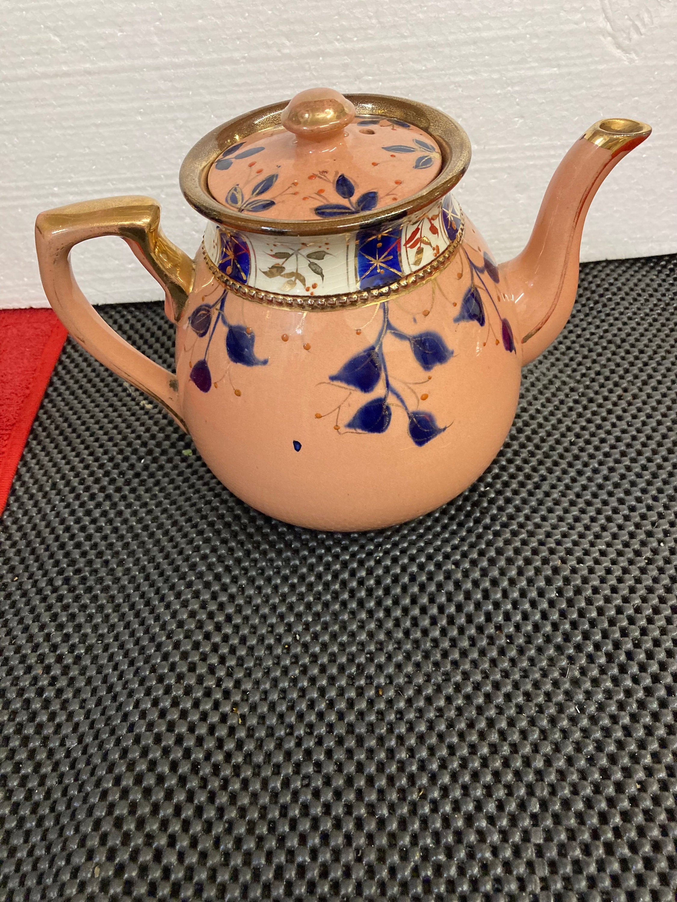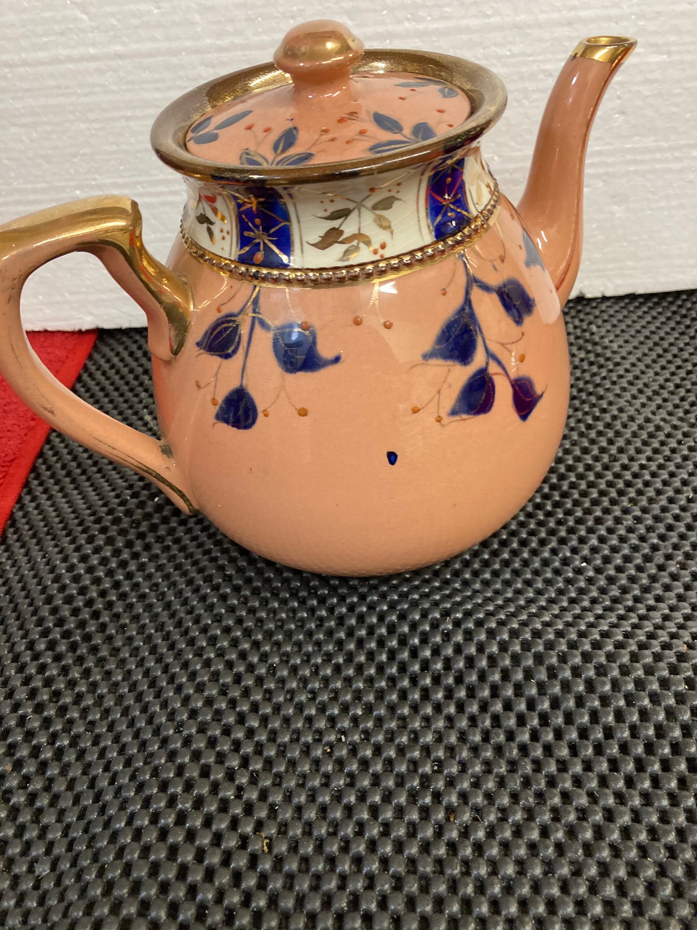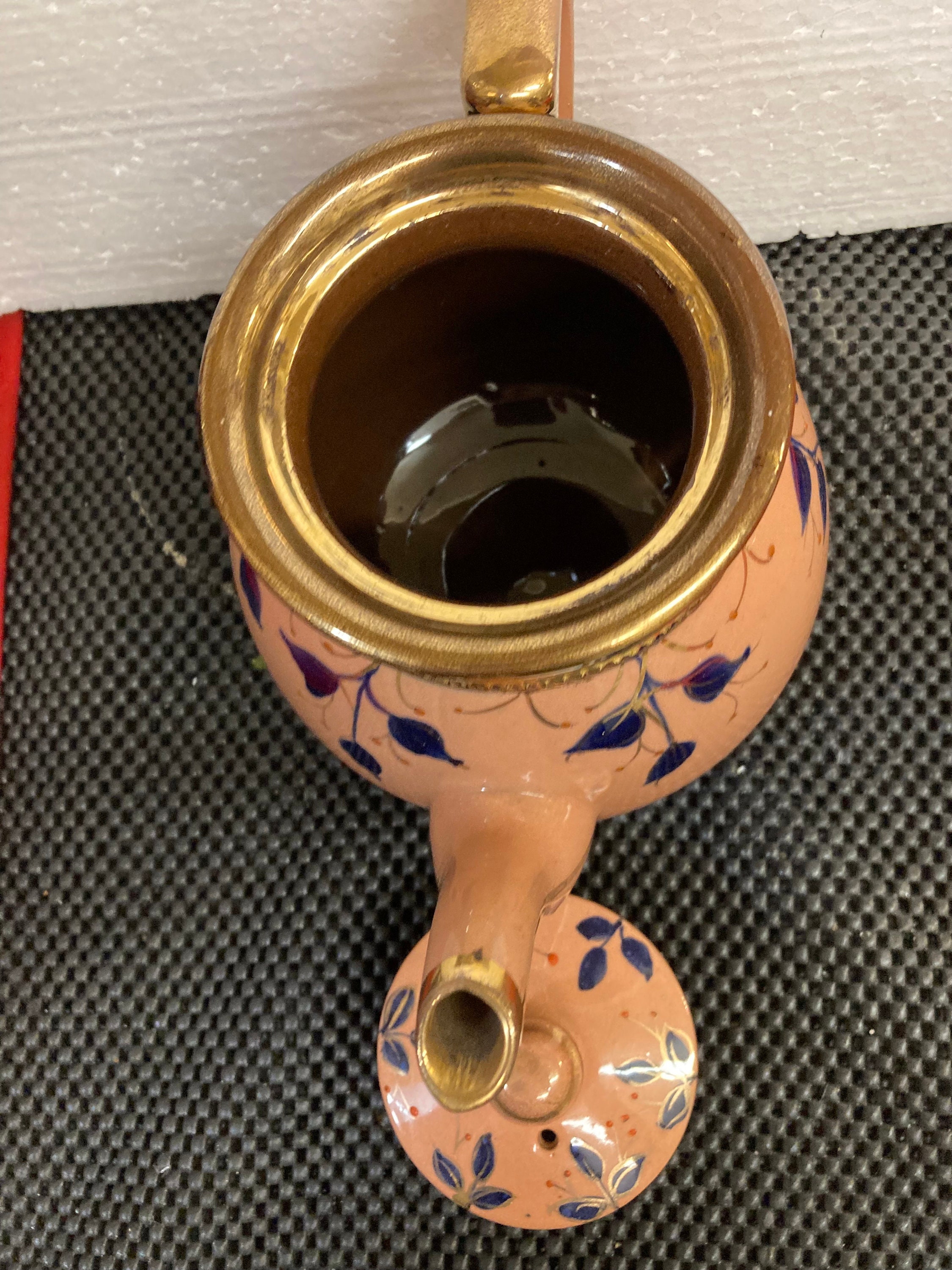 Brown pottery body glazed with a Salmon Pink & a cream band around the top. Hand painted pattern in Cobalt Blue, tiny touches of Red.Finished with shiny gilt highlights