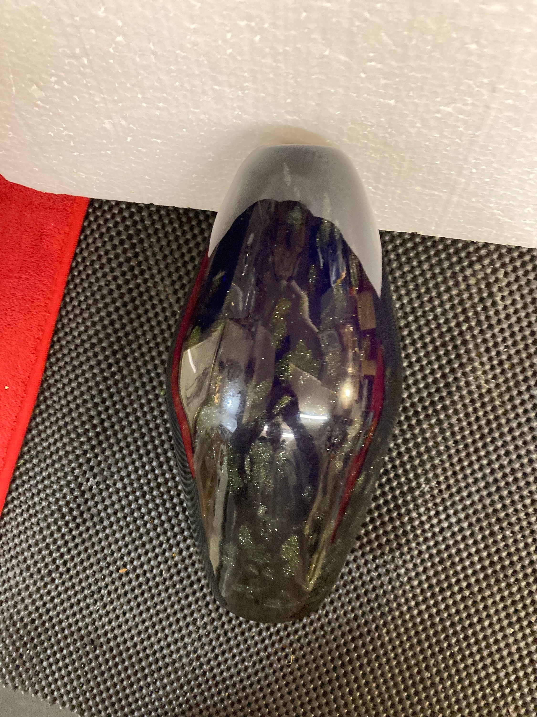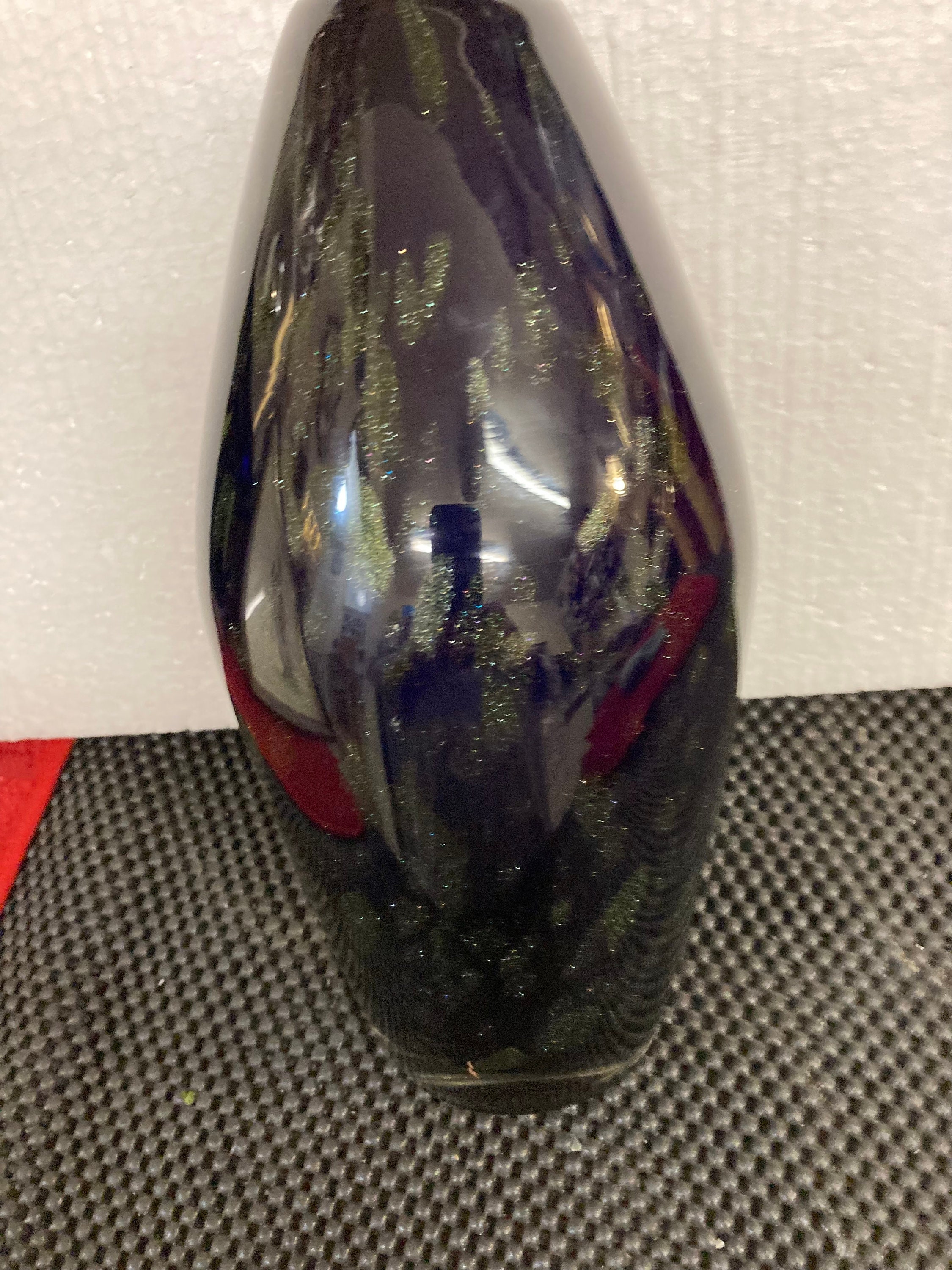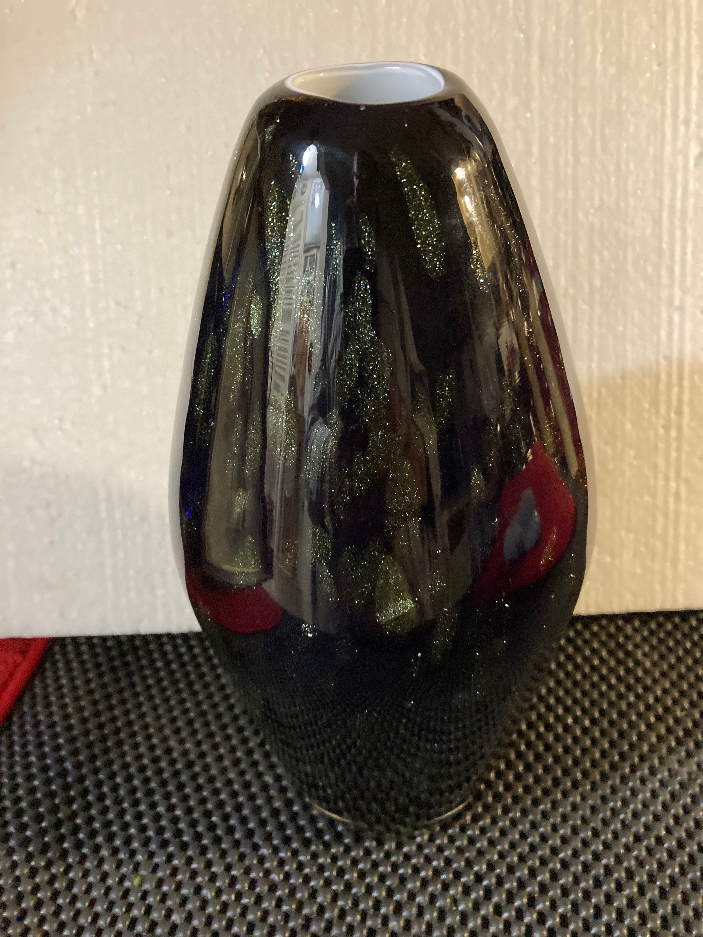 Glass Art Vase in Black with Streaks of SIlver Within/ White Coating insideStunning Artwork Find at Estate Sale9.5" tall x 5"wide x 5 " deepExcellent ConditionNo damages anywhere