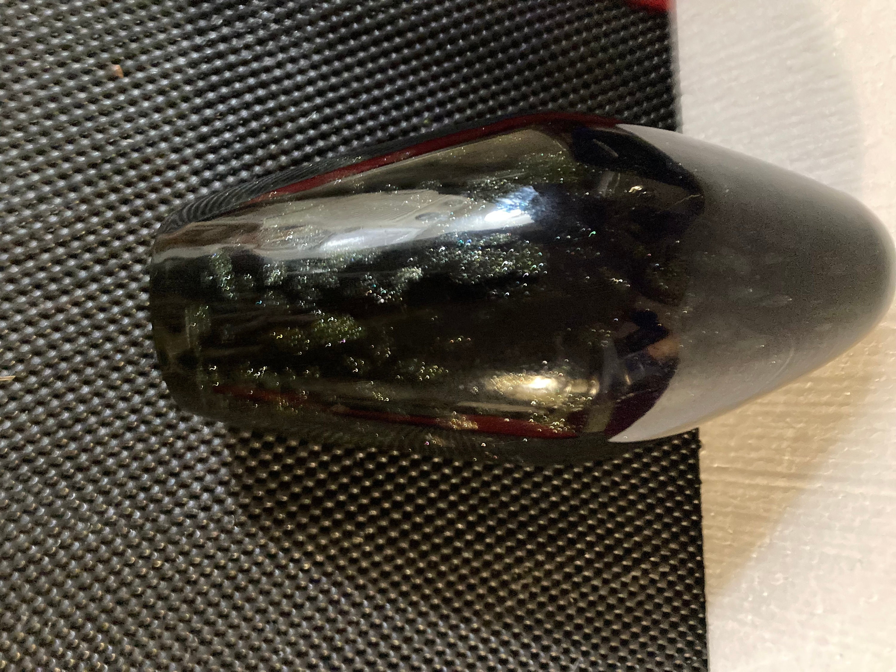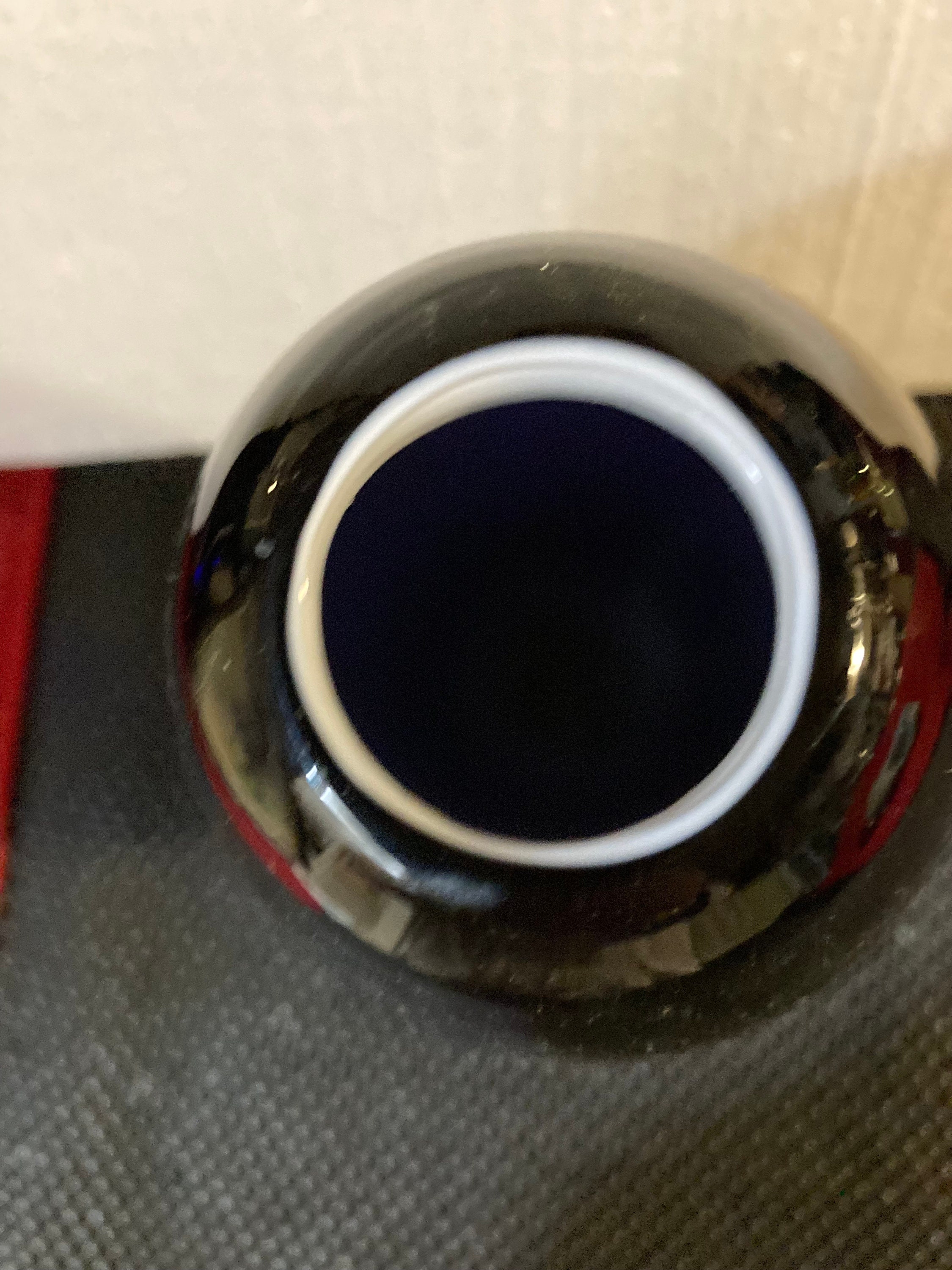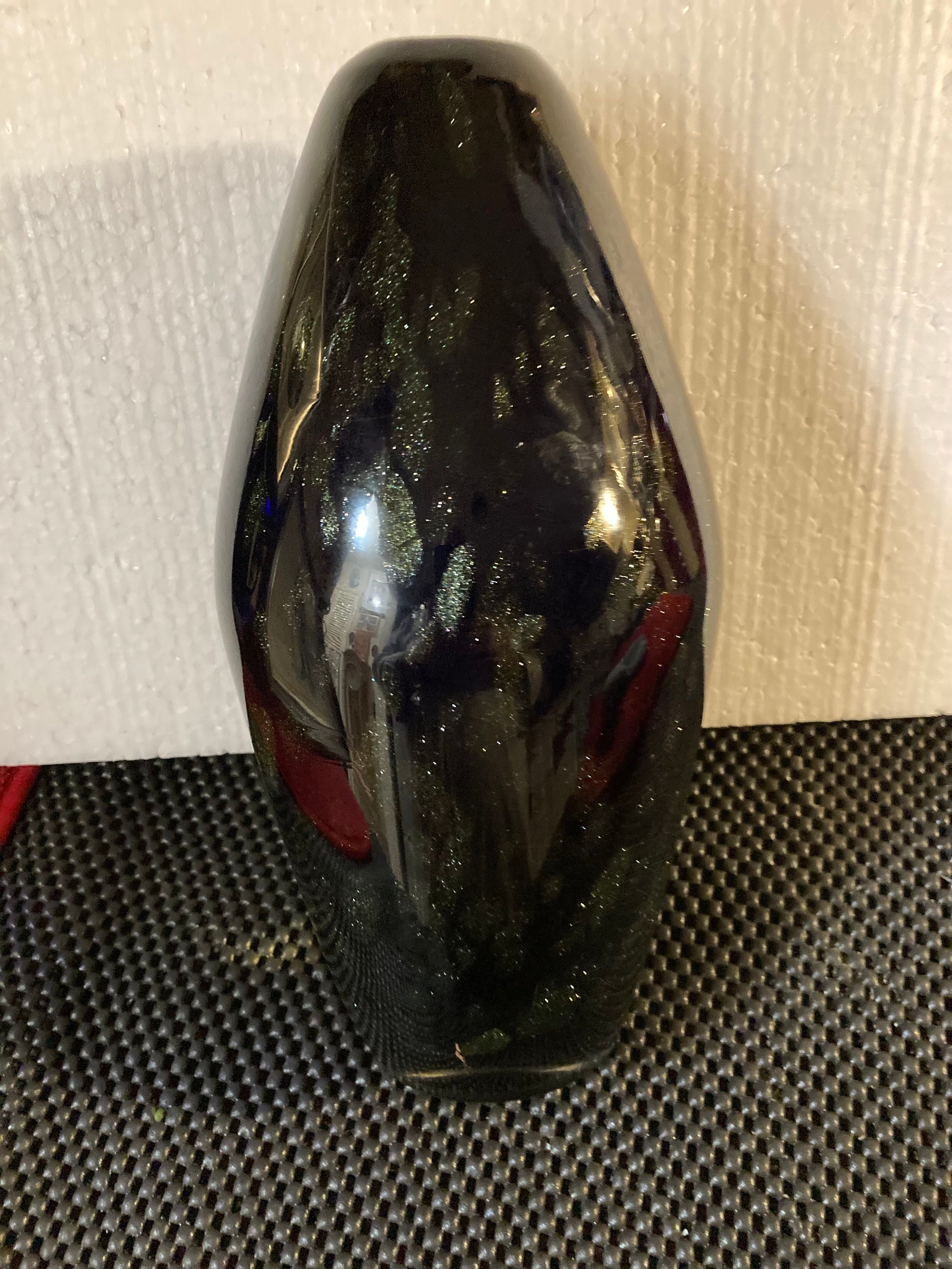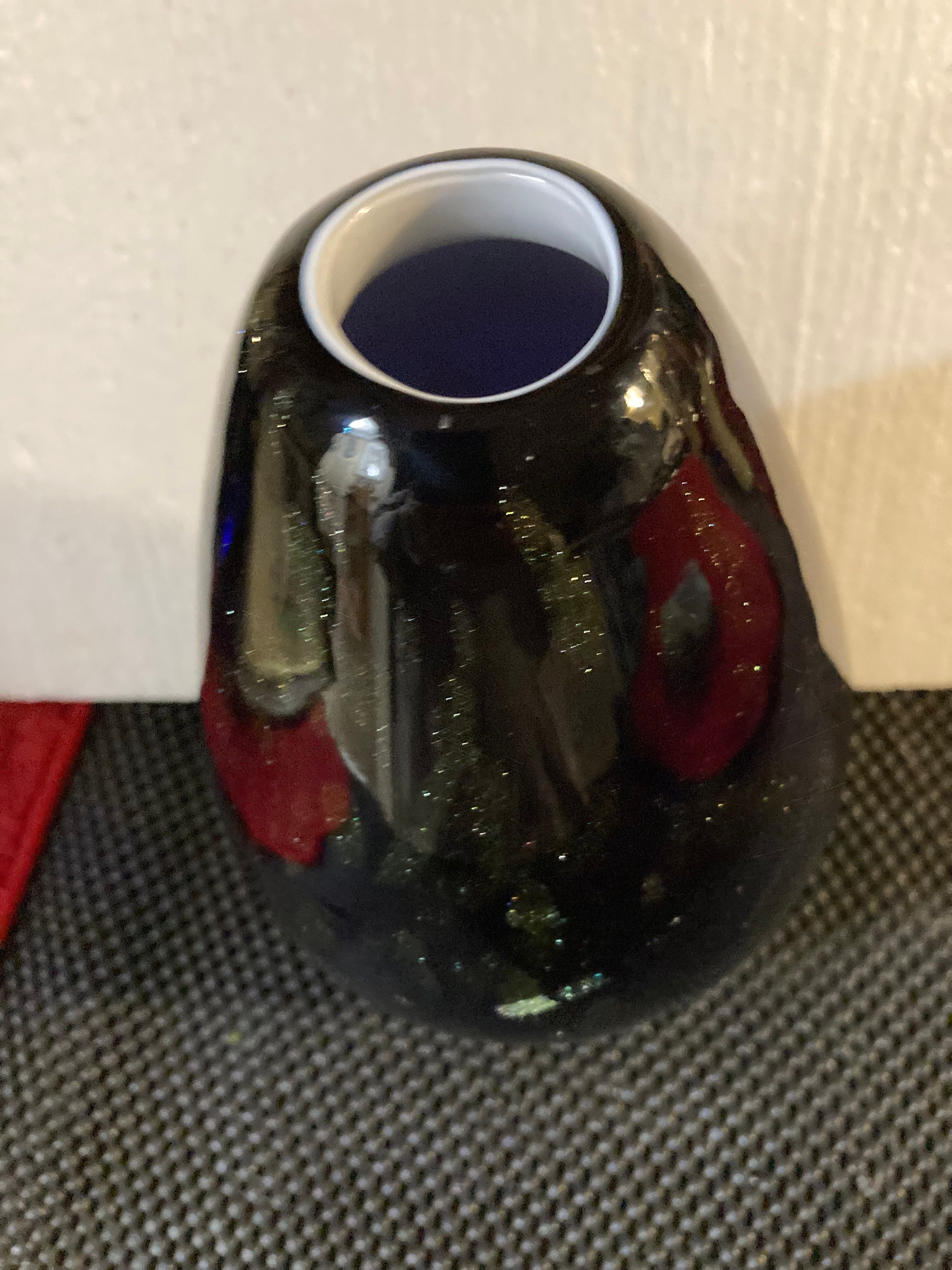 Glass Art Vase in Black with Streaks of SIlver Within/ White Coating insideStunning Artwork Find at Estate Sale9.5" tall x 5"wide x 5 " deepExcellent ConditionNo damages anywhere