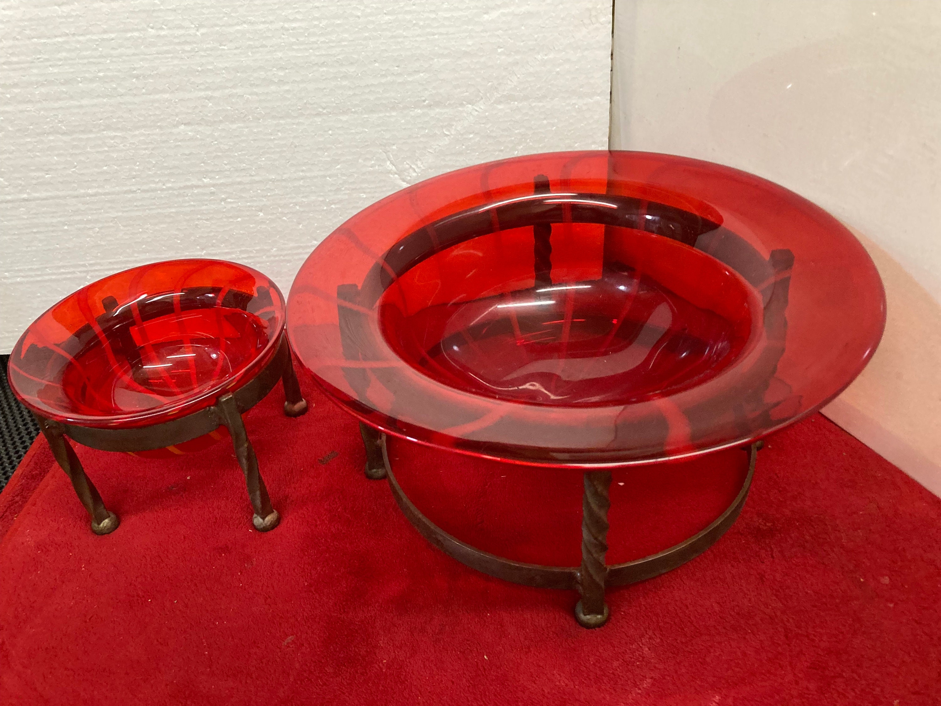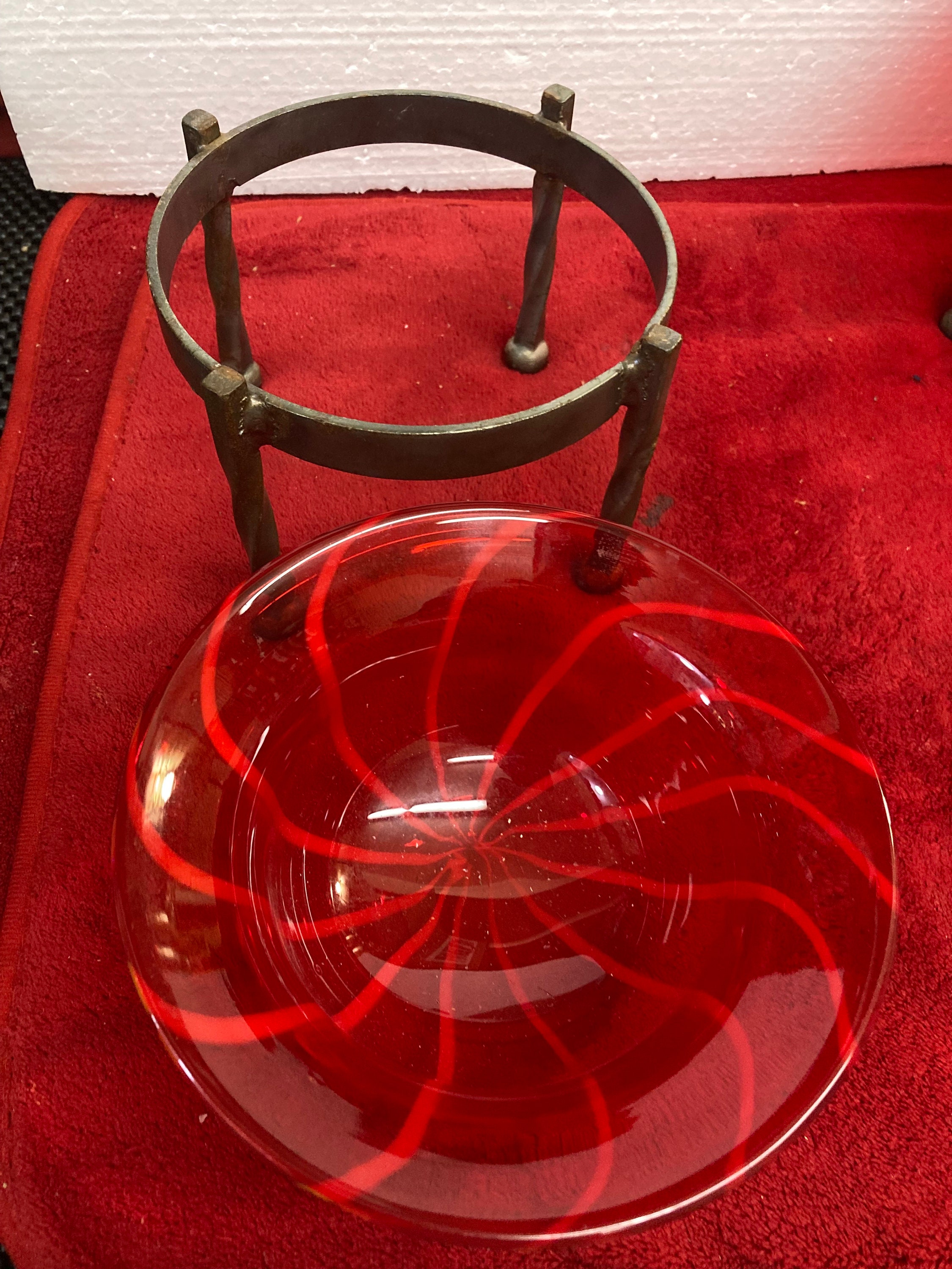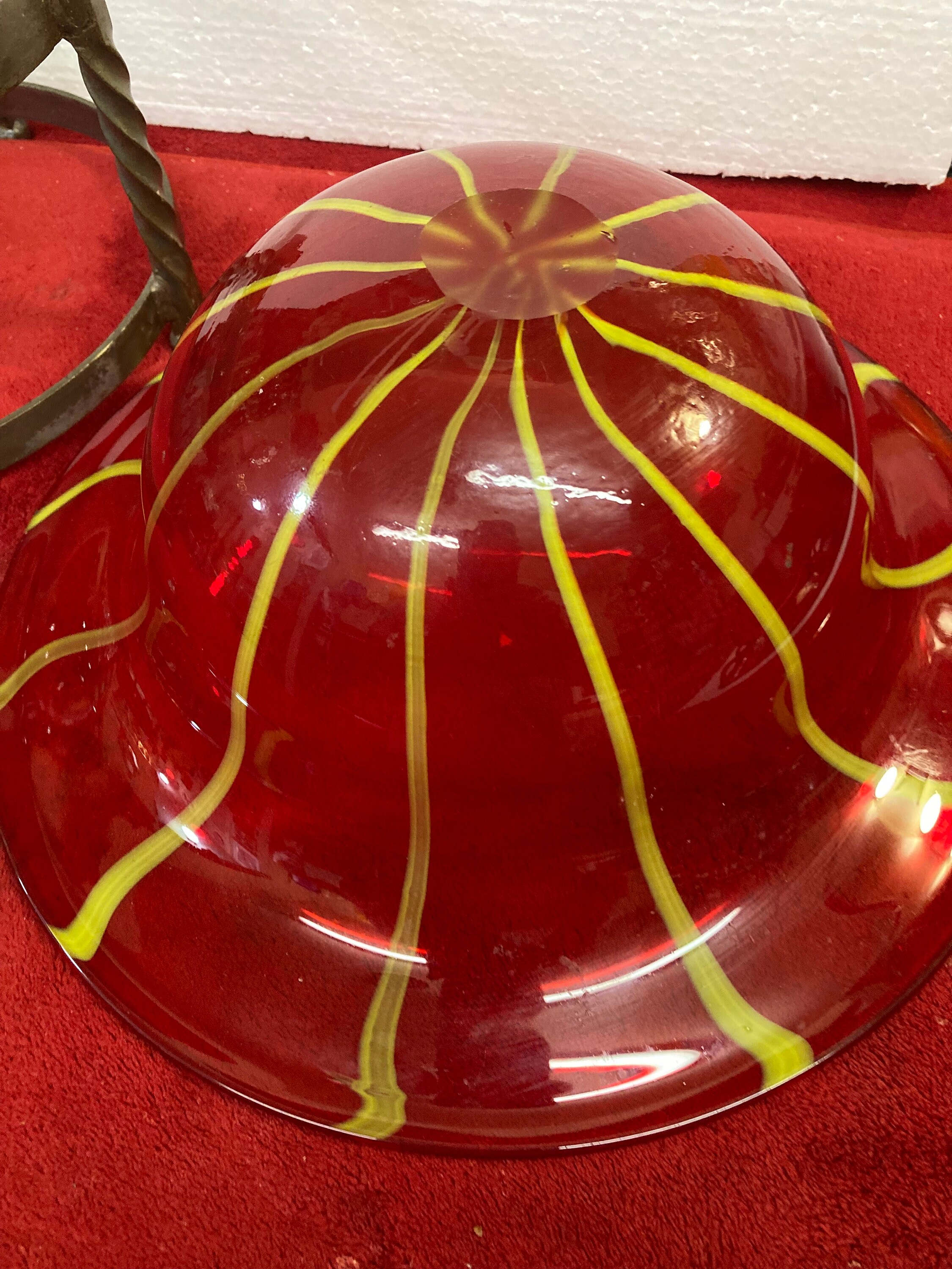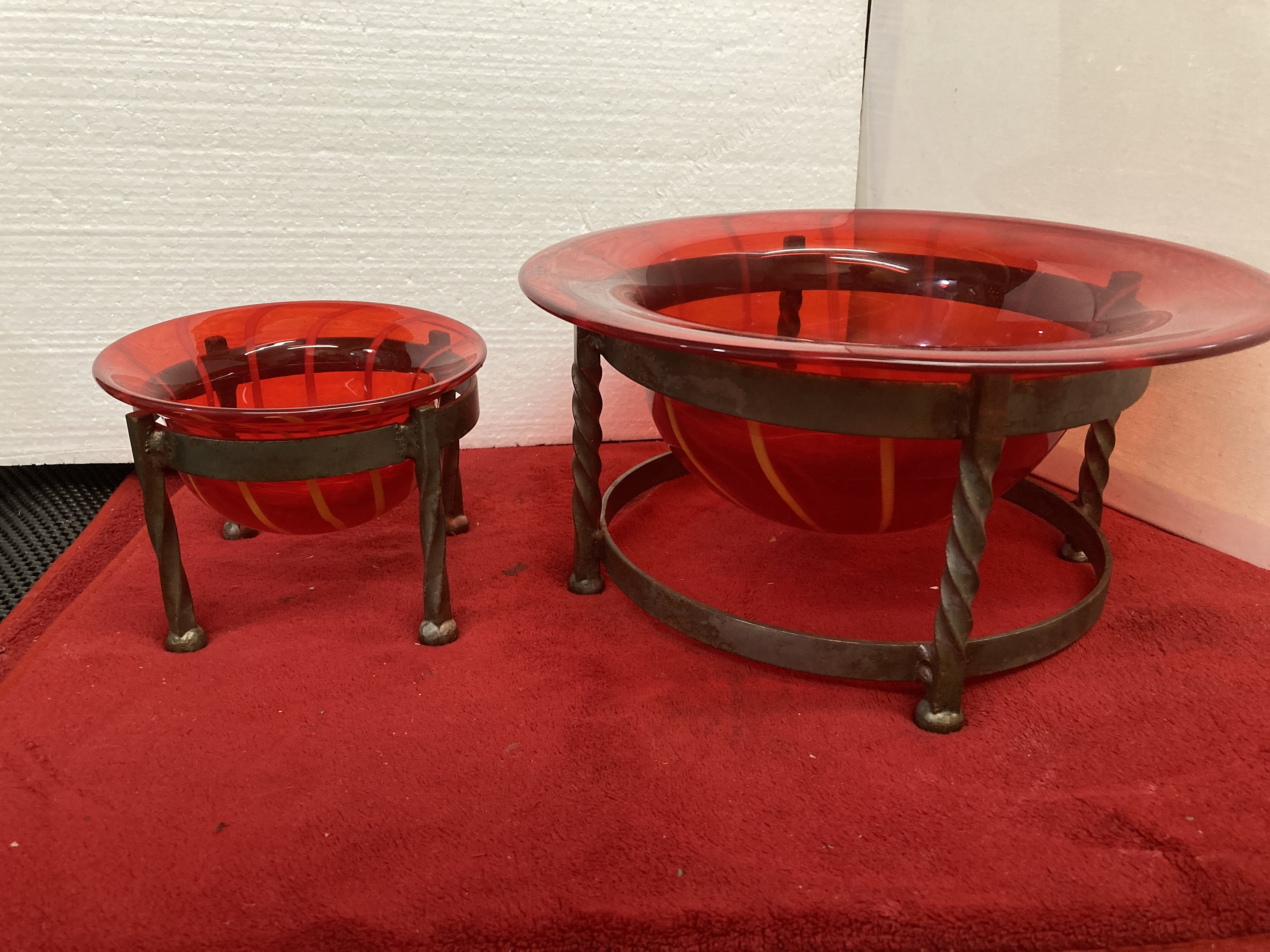 Pair of Ruby Red Glass Bowl with Yellow Stripes ,Twisted Metal Stand Murano Style 12 "and 6 "Rare