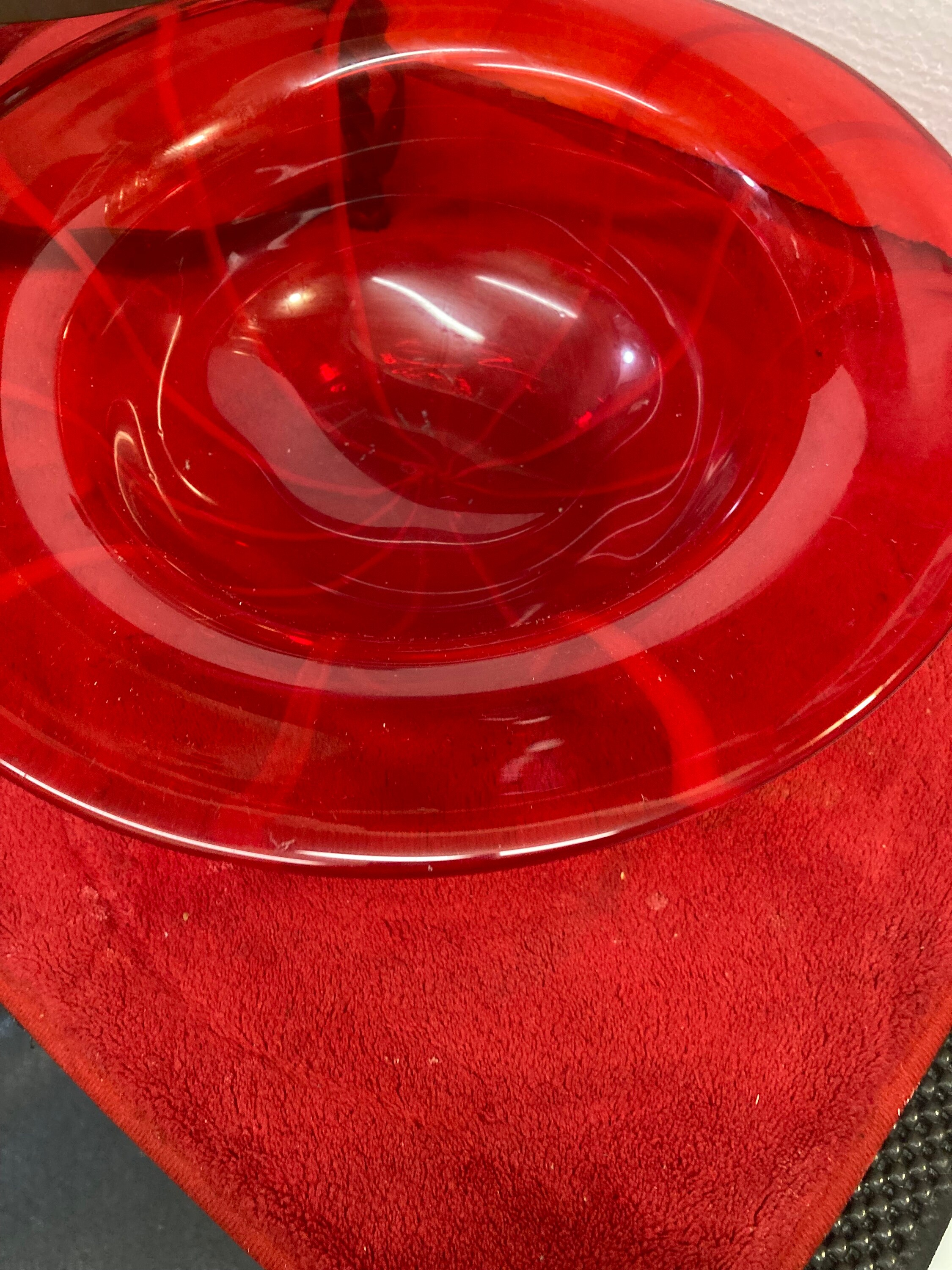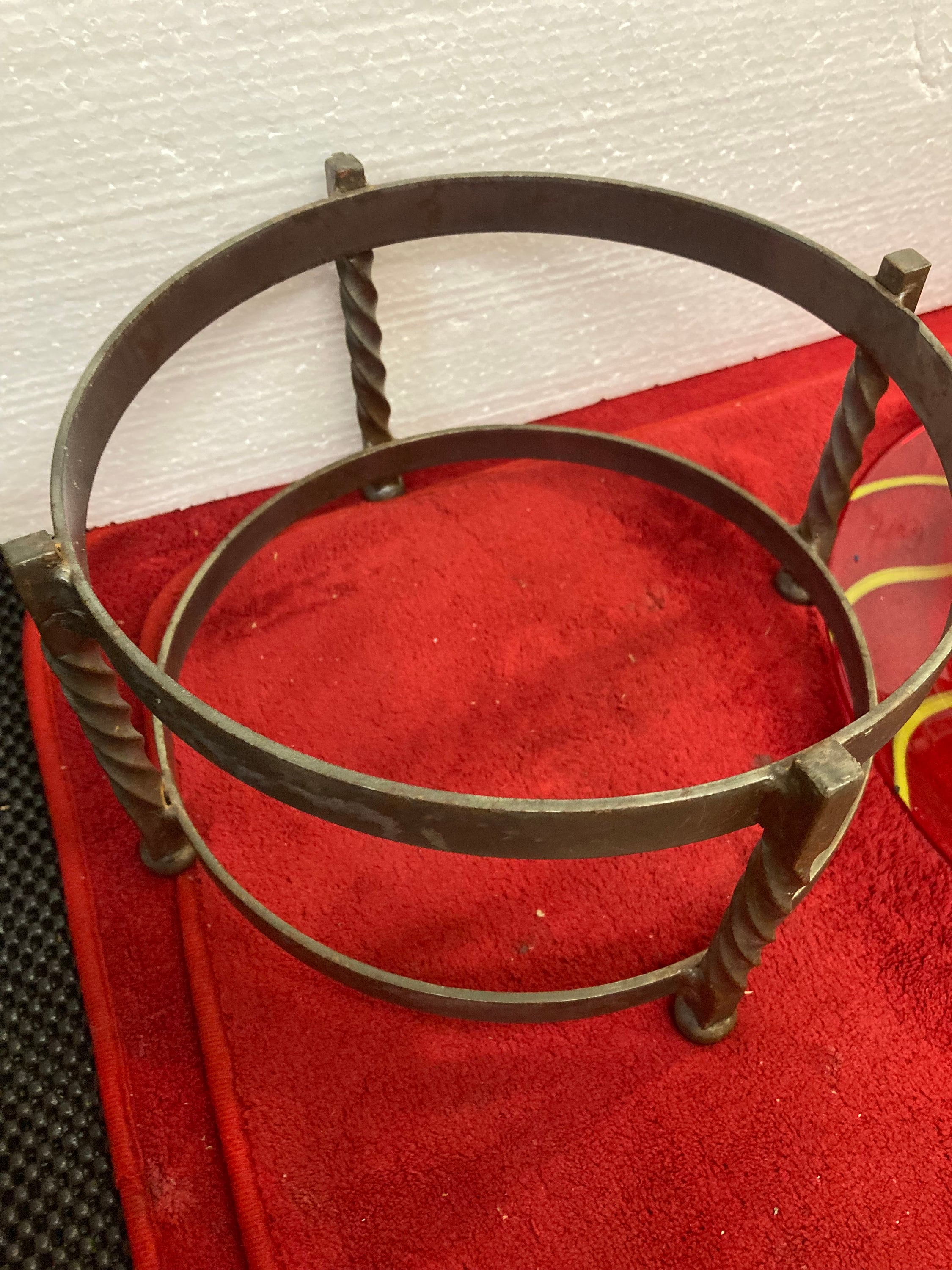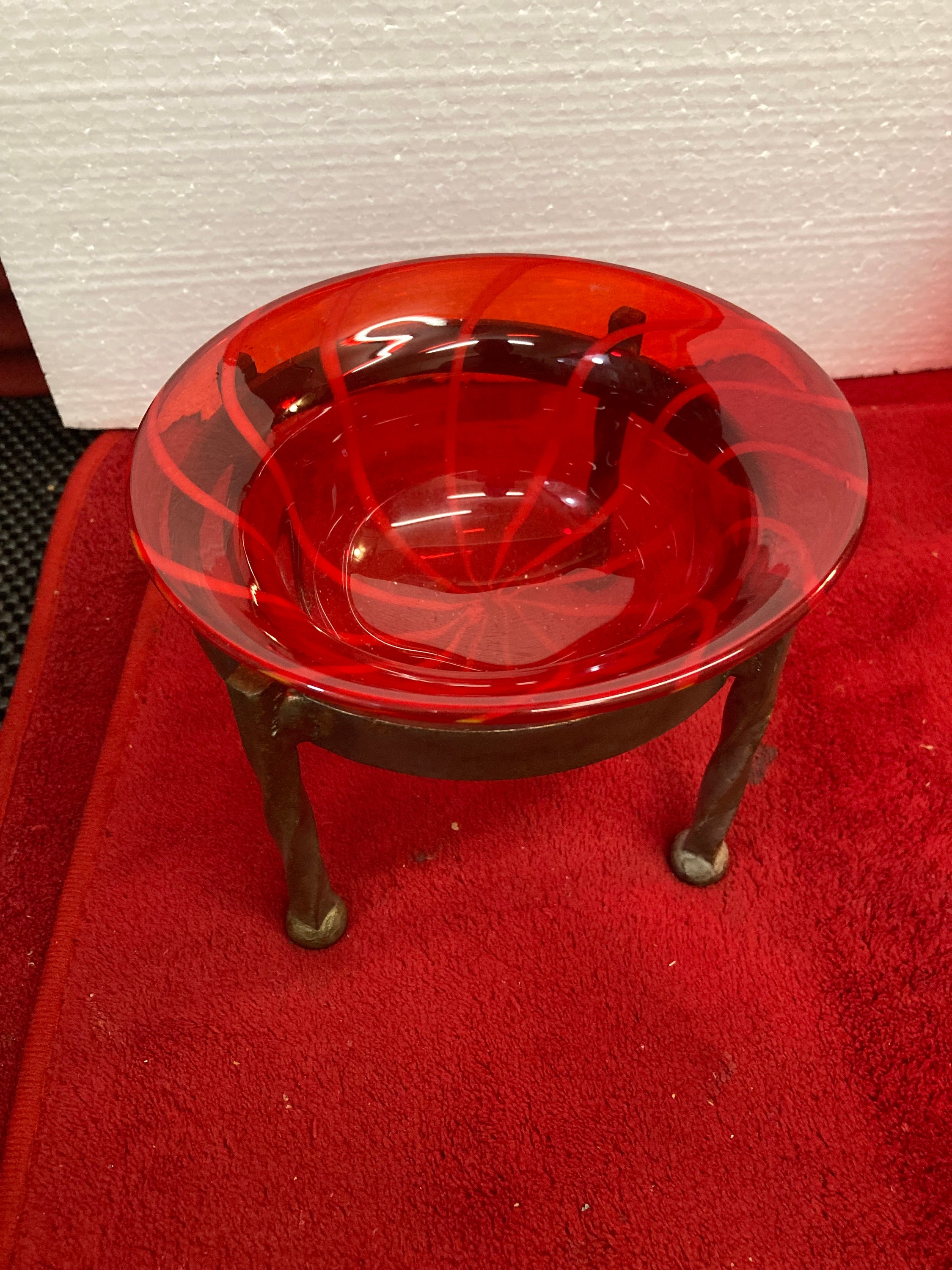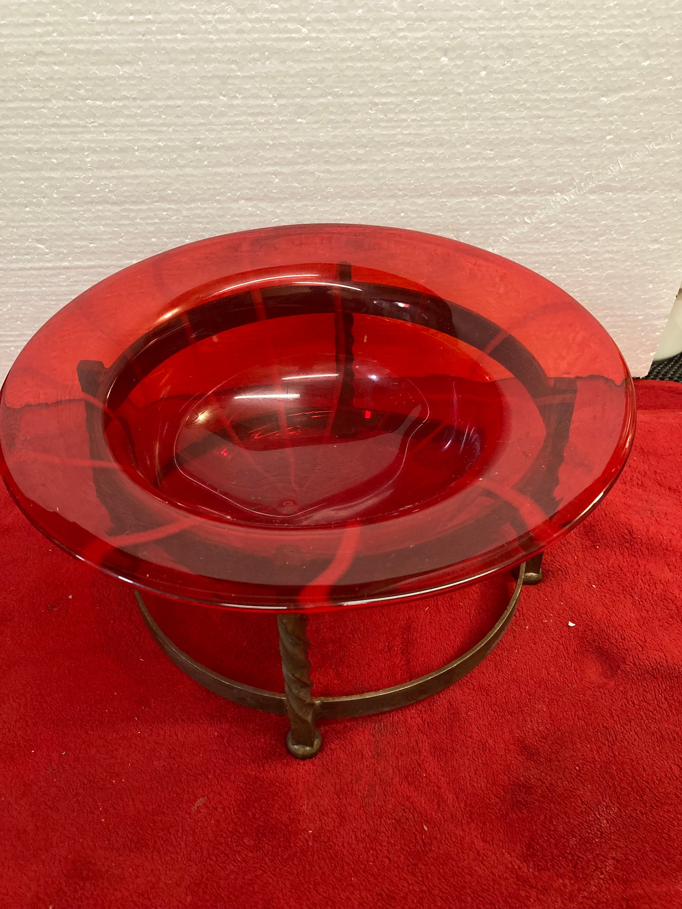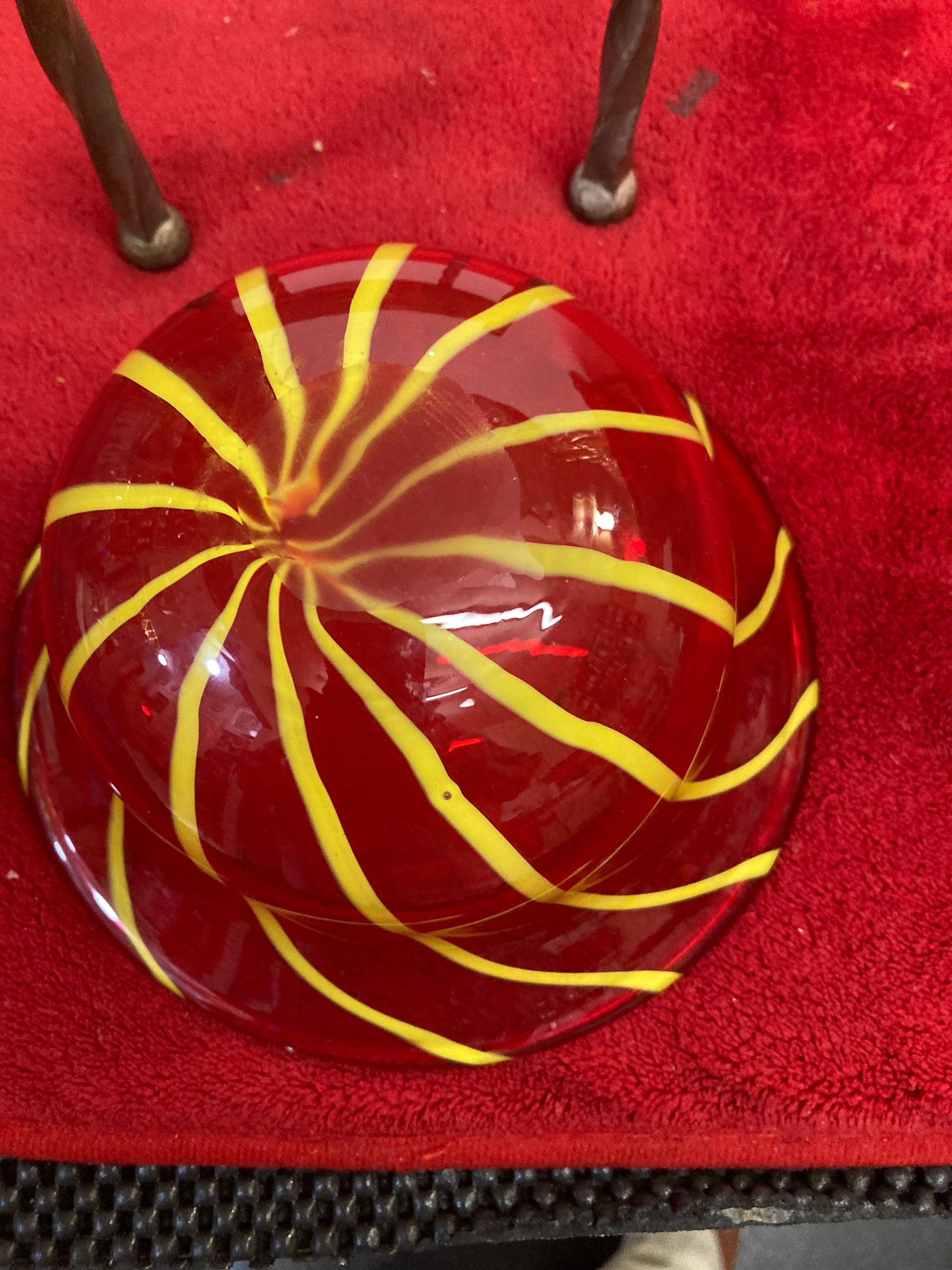 Pair of Ruby Red Glass Bowl with Yellow Stripes ,Twisted Metal Stand Murano Style 12 "and 6 "Rare