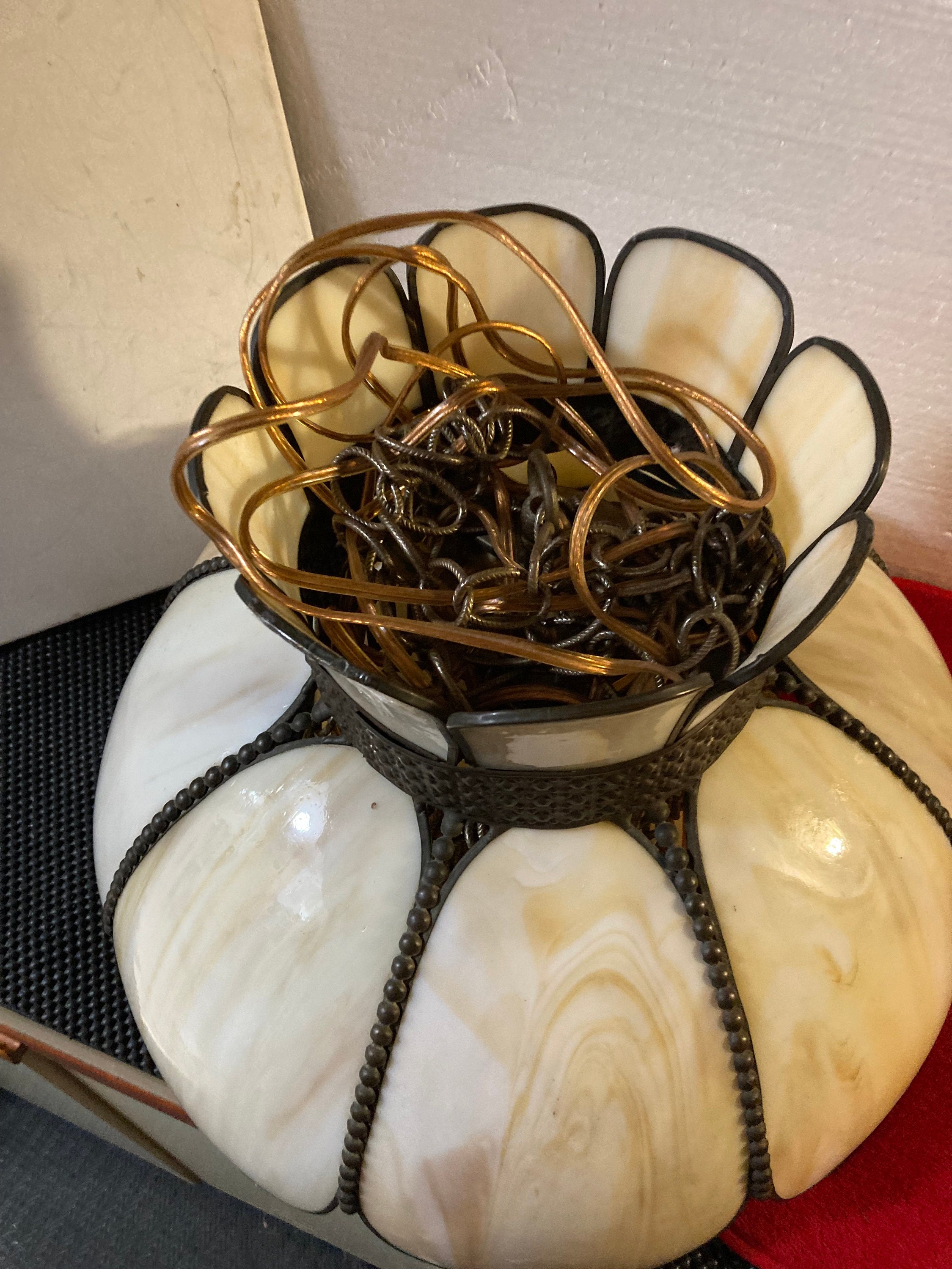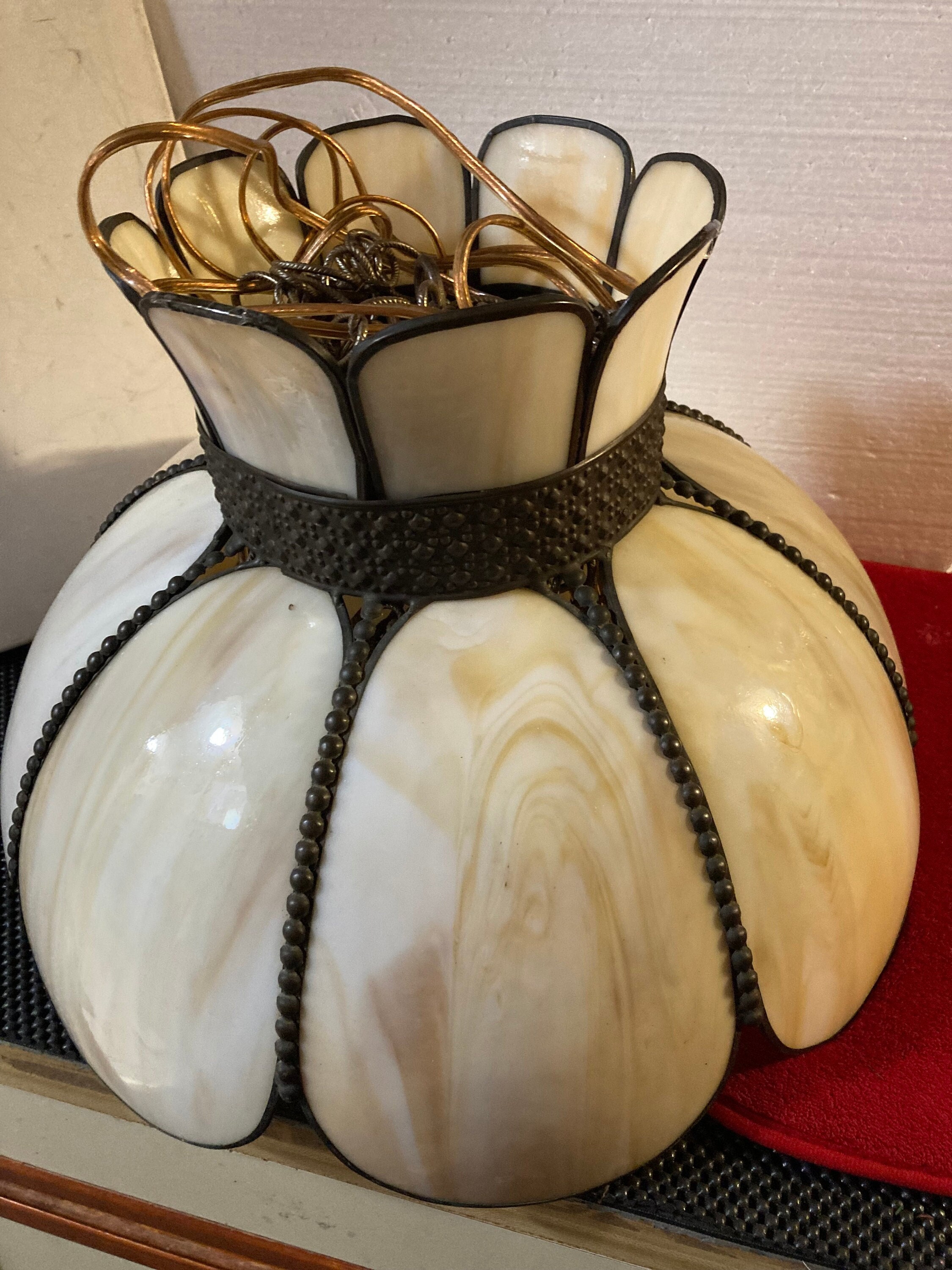 Hanging chandelier exterior frame made of slag glass in cream and tan. This piece is iconic, a throwback to everyone's favorite family dinners in the 1950's - 1970's, sitting around the table with family laughing at the day's events. Purchased from the original owner at Estate Sale, this chandelier is in good vintage condition. There are no imperfections and it is in excellent condition.The glass is in very good condition, no panels are broken or chipped. The trim is made of metal with little details and detailed band around the neck. This listing is for the chandelier ,bulb and The round milky Sphere are included.