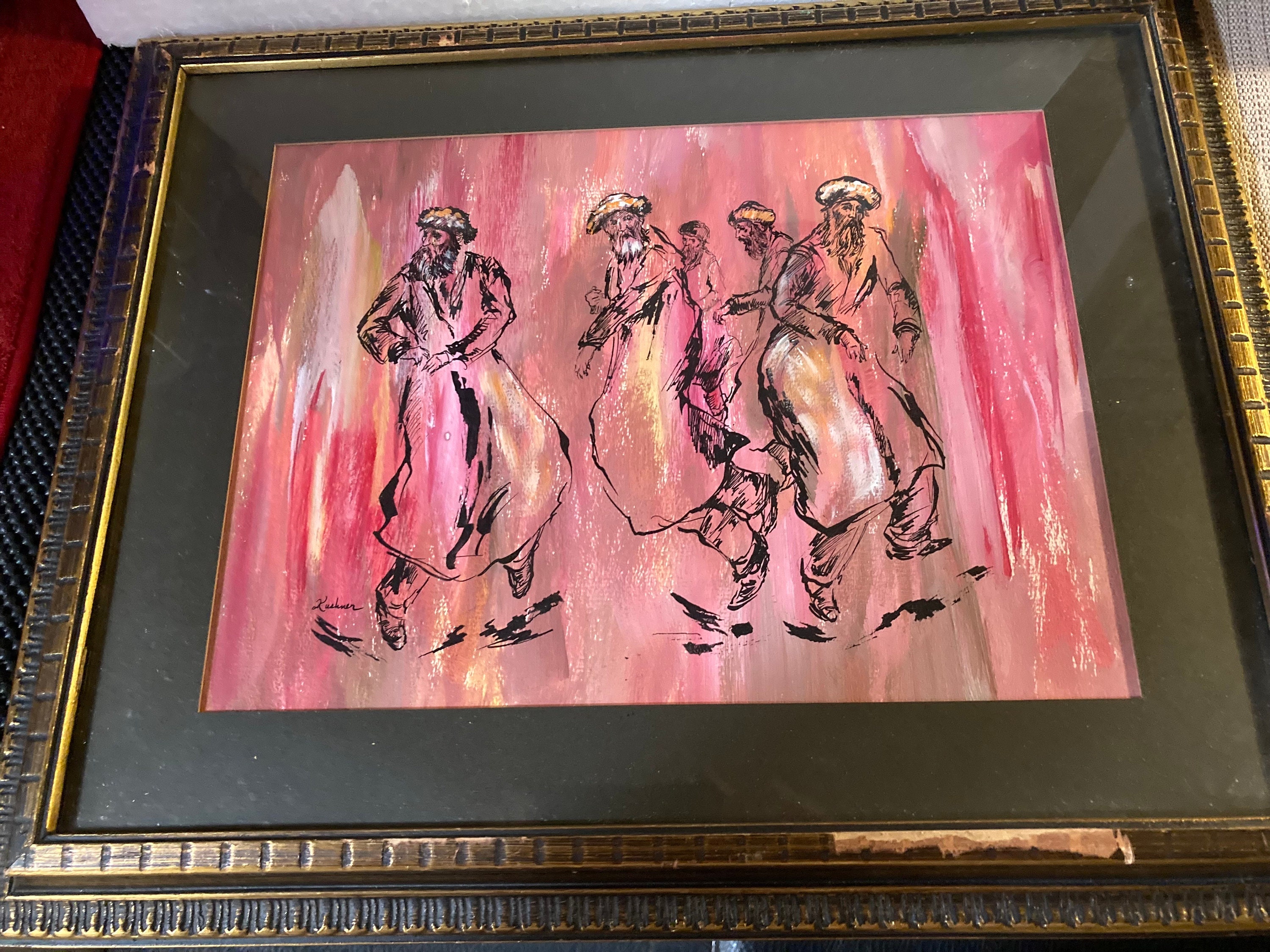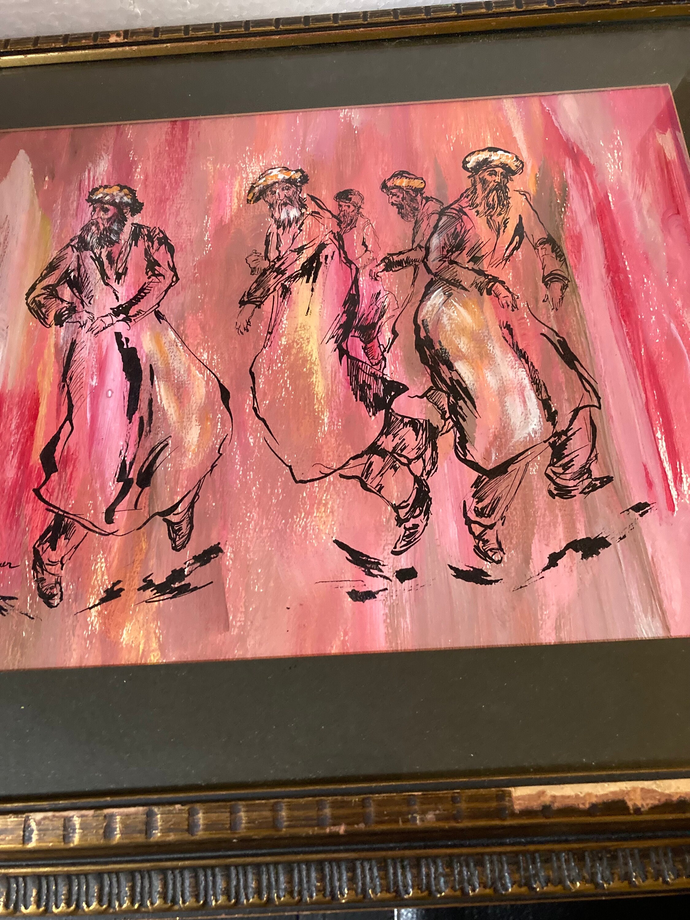 This beautiful painting depicts Hasidim in traditional clothing, happily dancing. It is an original watercolor piece created by artist Harold Kushner and comes professionally framed in a vintage all-wood carved frame with a high-quality mat. The painting is a combination of watercolor, gouache, and ink and is signed by the artist in the lower right corner.