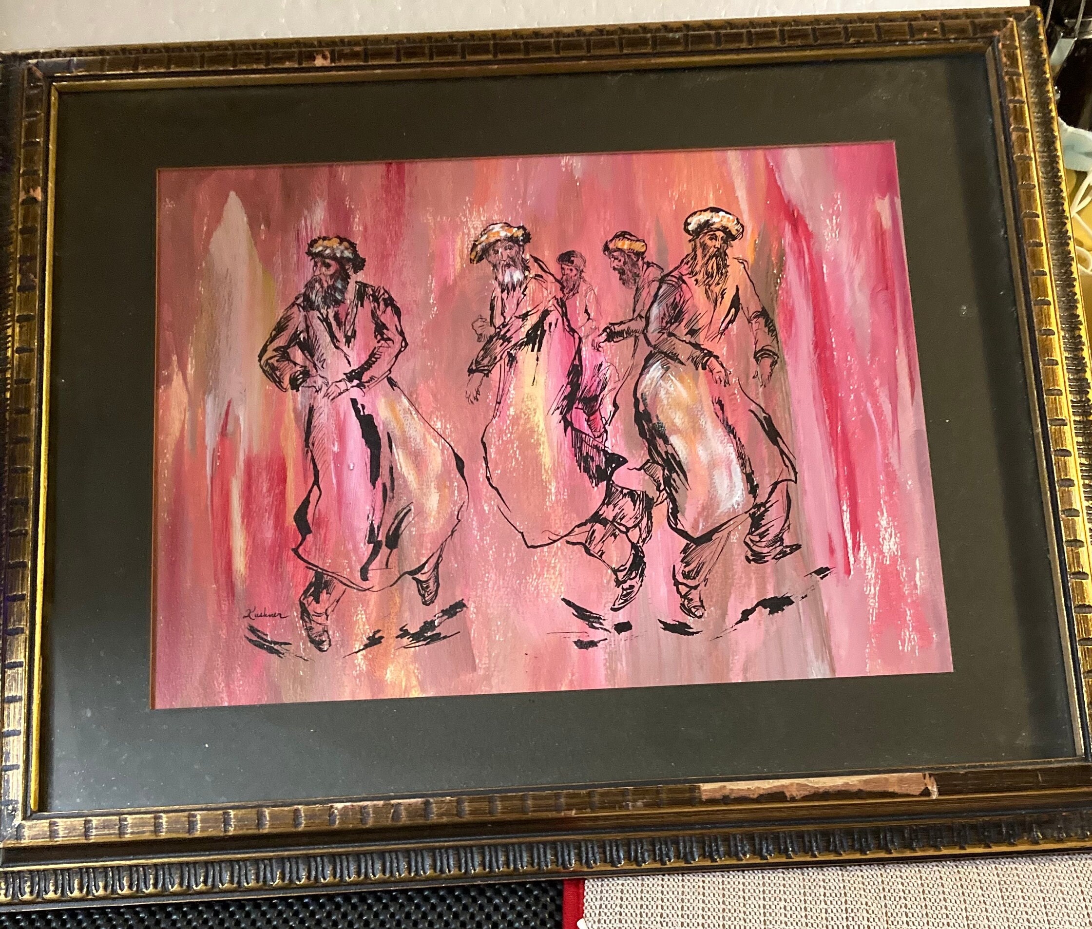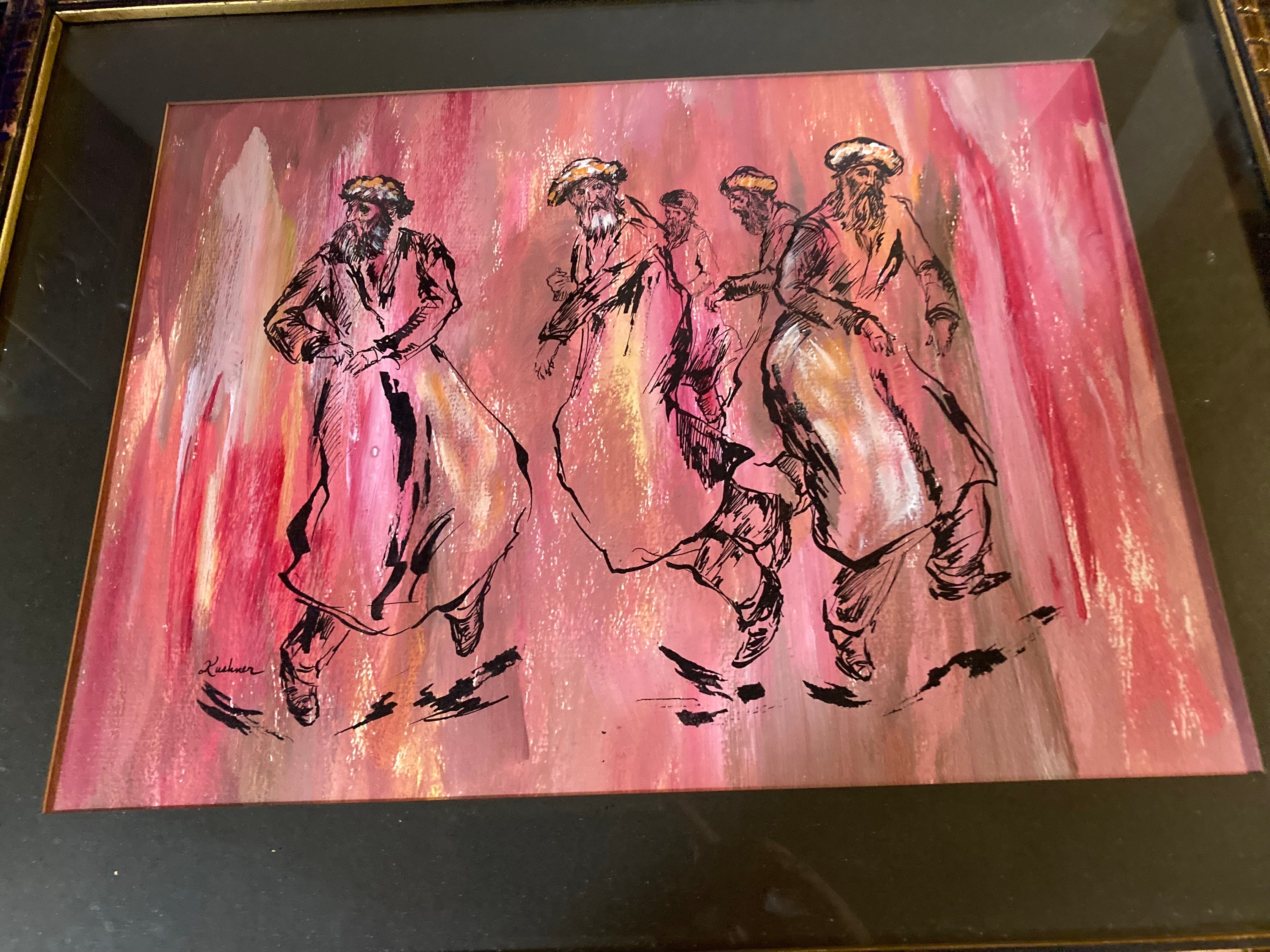 Joyful scene of Hasidim in traditional garb dancing by Harold Kushner. Watercolor, gouache and ink painting. Signed lower right: Kushner.