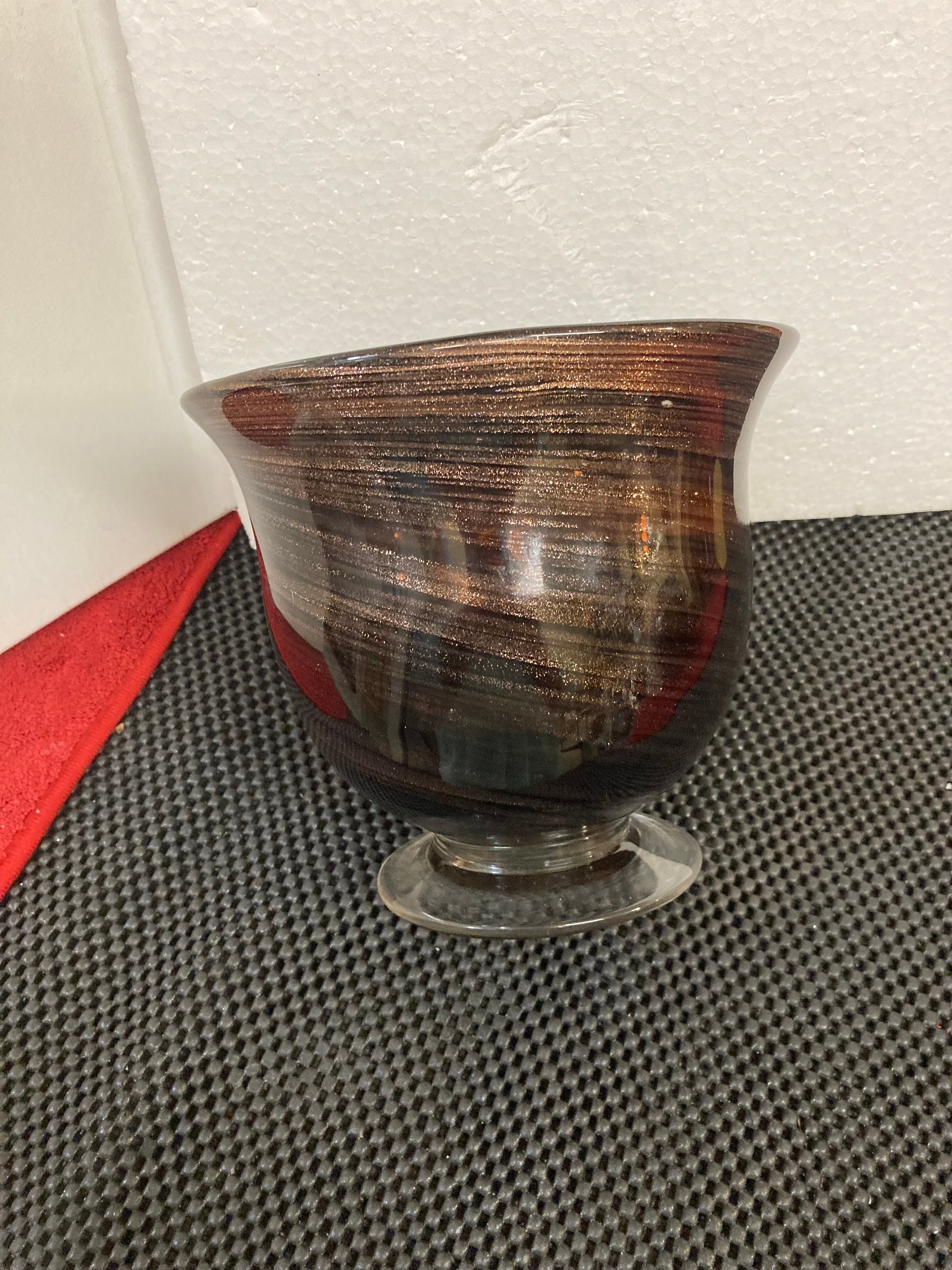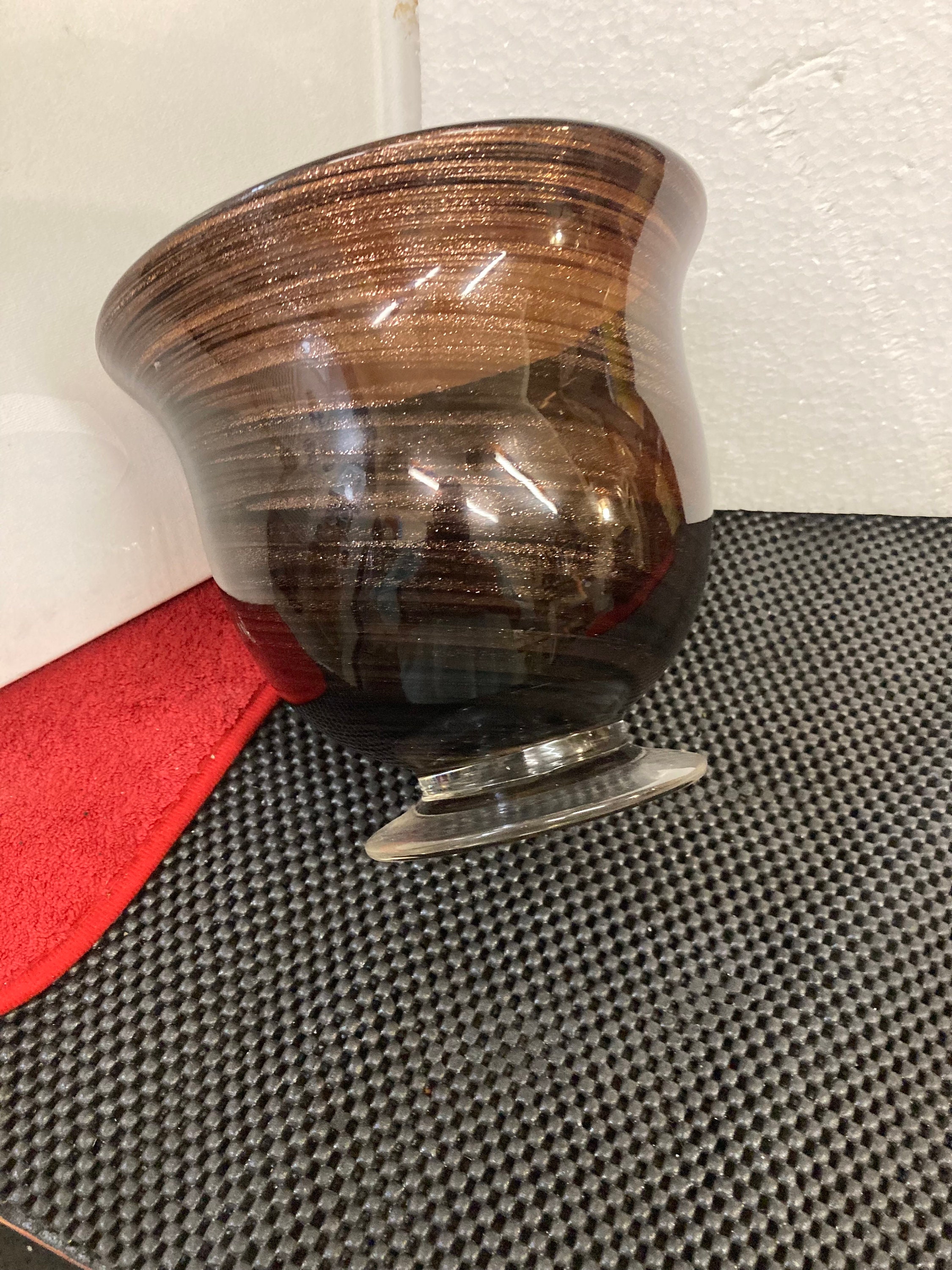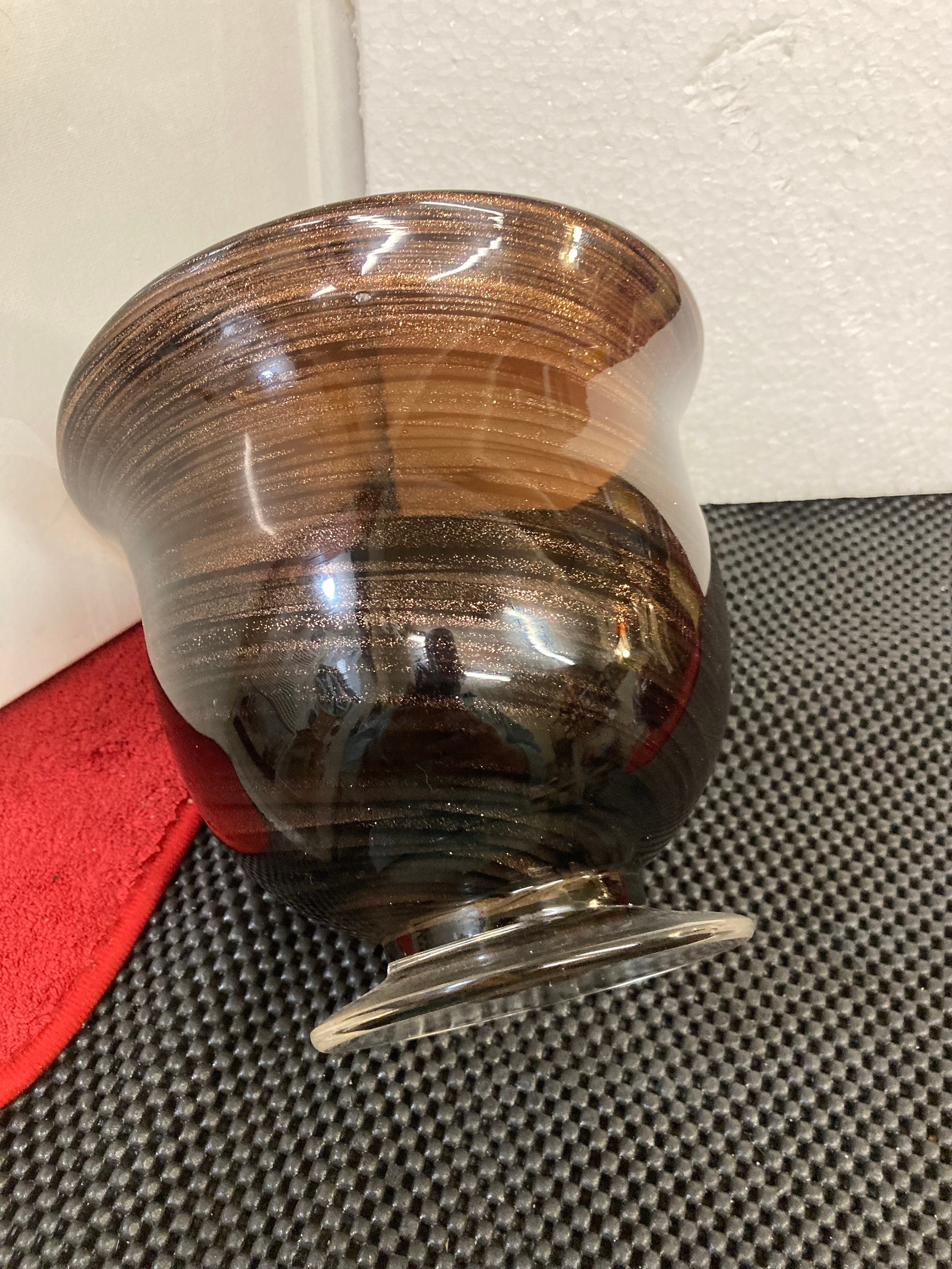 Beautiful, Footed, Wide Mouth Aventurine Vase Weight : 2.5 lbs6.5" tall x 7.25" wide( 9 top) x 4 " at baseExcellent vintage condition with no damages, chips or cracksHandmadeMade In ItalyMurano